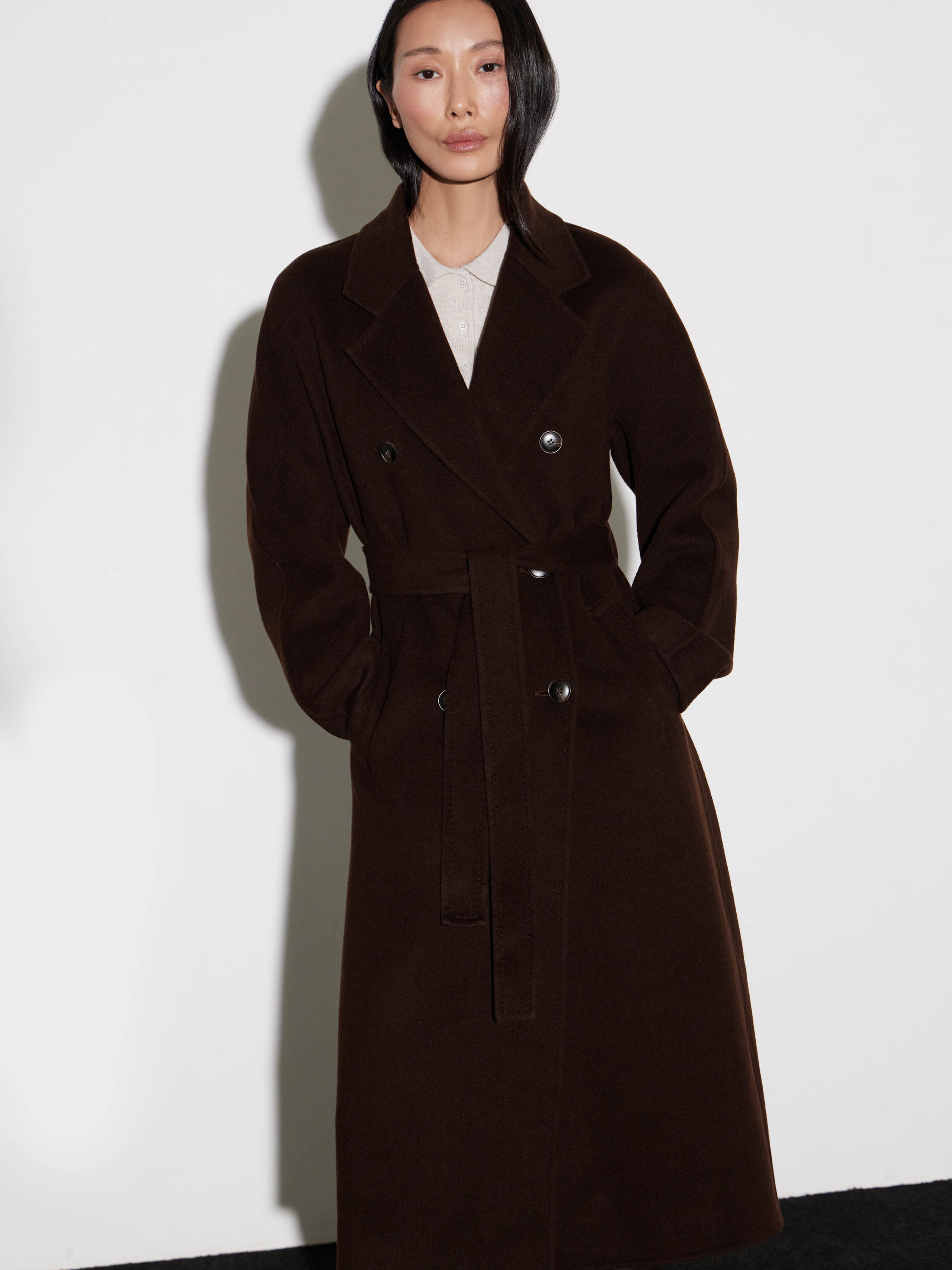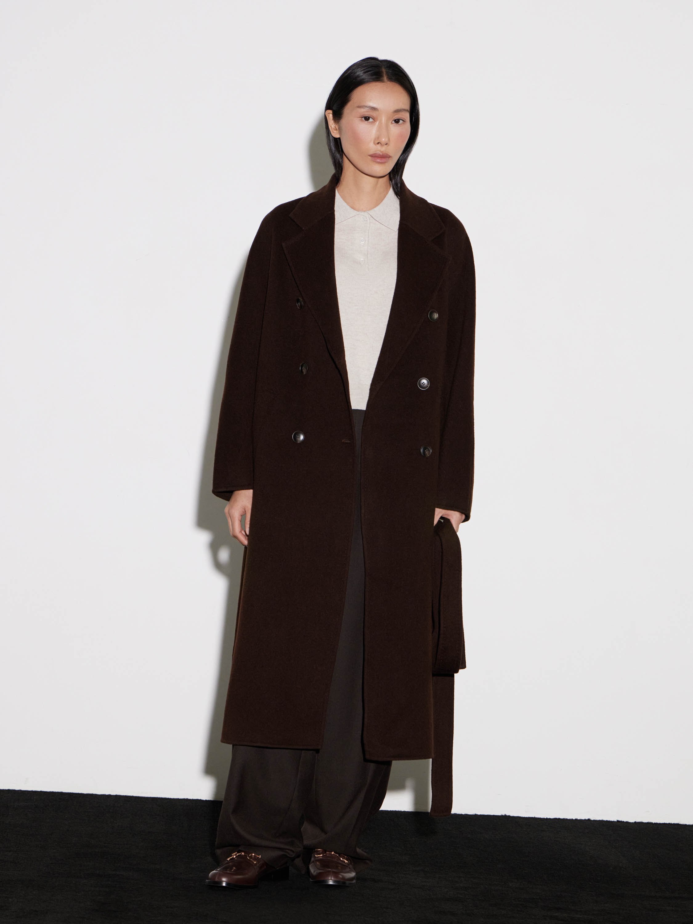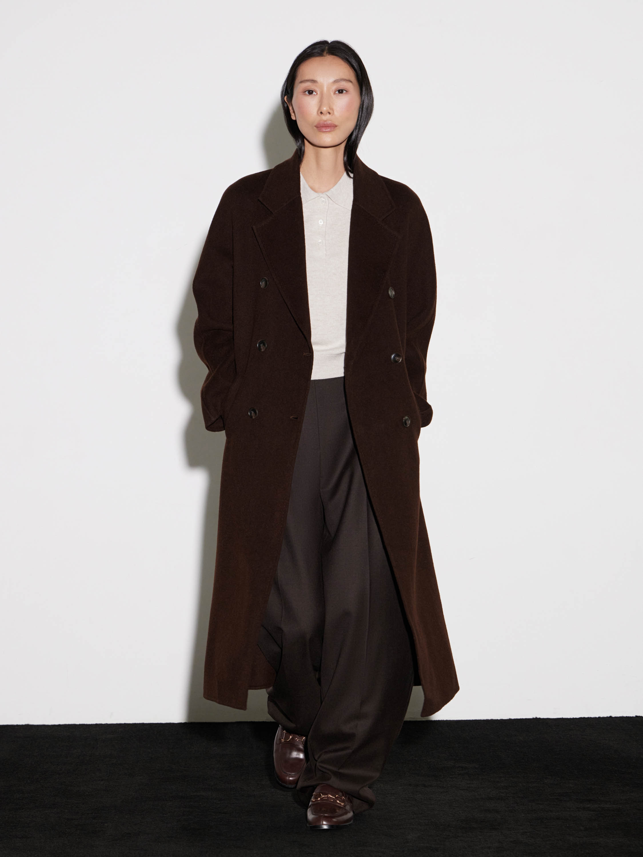 Это пальто выполнено из шерсти с добавлением тенсела — сочетание, которое делает ткань плотной, но в то же время пластичной и более мягкой в движении. Двубортный крой и прямой силуэт подчеркивают строгость линии, а пояс позволяет акцентировать талию и менять настроение образа — от расслабленного до собранного. Оптимальная длина закрывает бедро и голень, создавая пропорции, подходящие для разной обуви — от ботинок до каблука. Лаконичные детали вроде строгого лацкана и крупных пуговиц делают модель универсальной: это не просто базовое пальто, а вещь, которая выглядит актуально независимо от сезона и трендов.