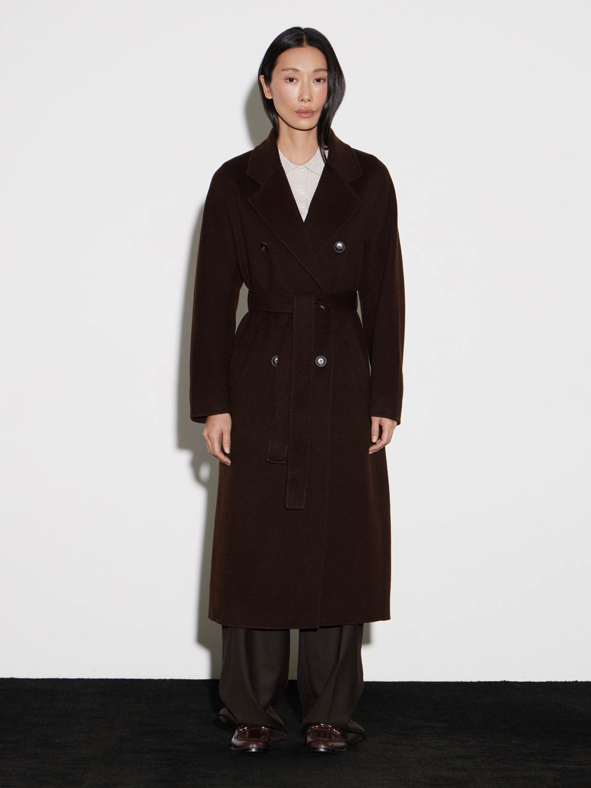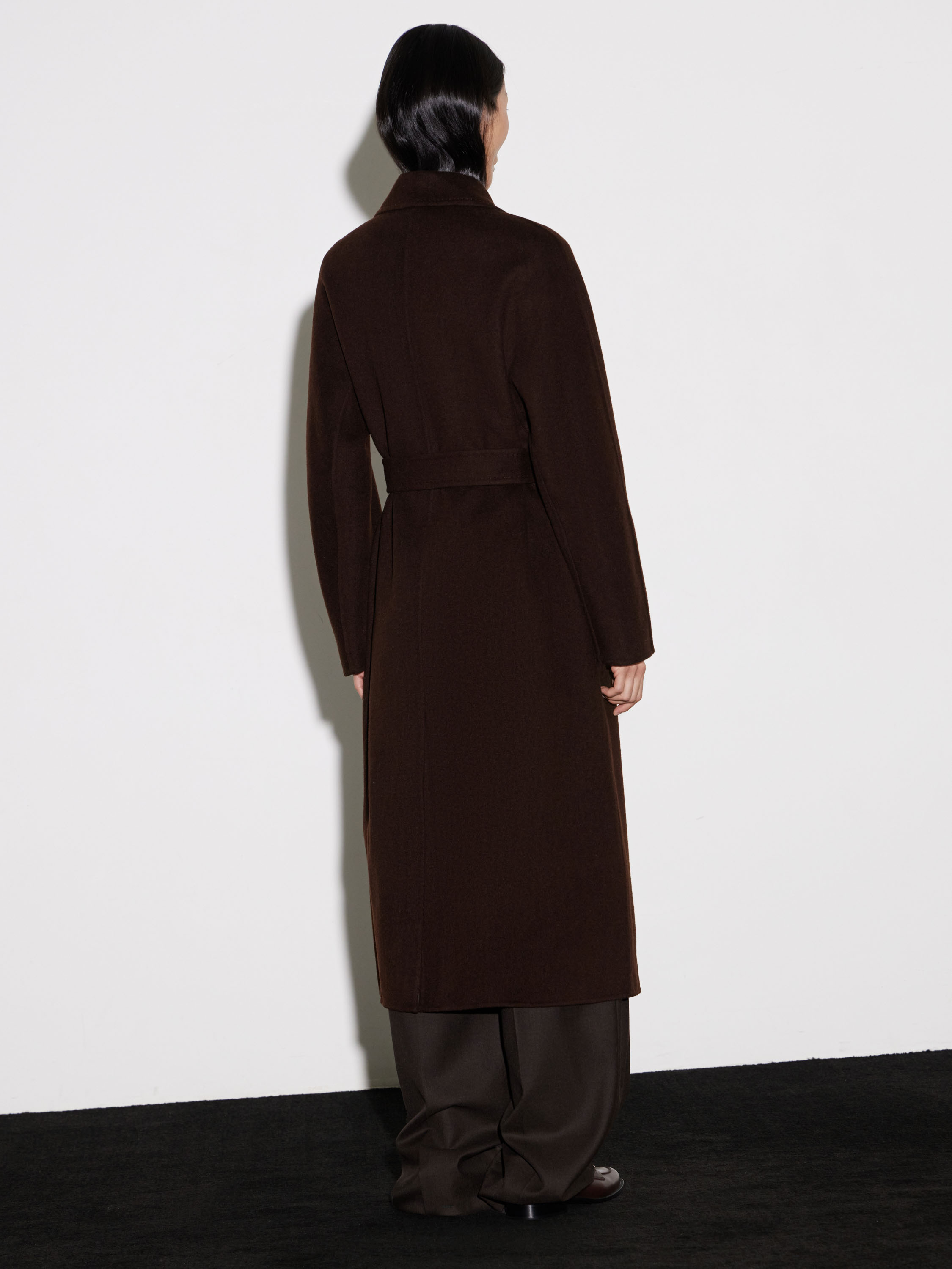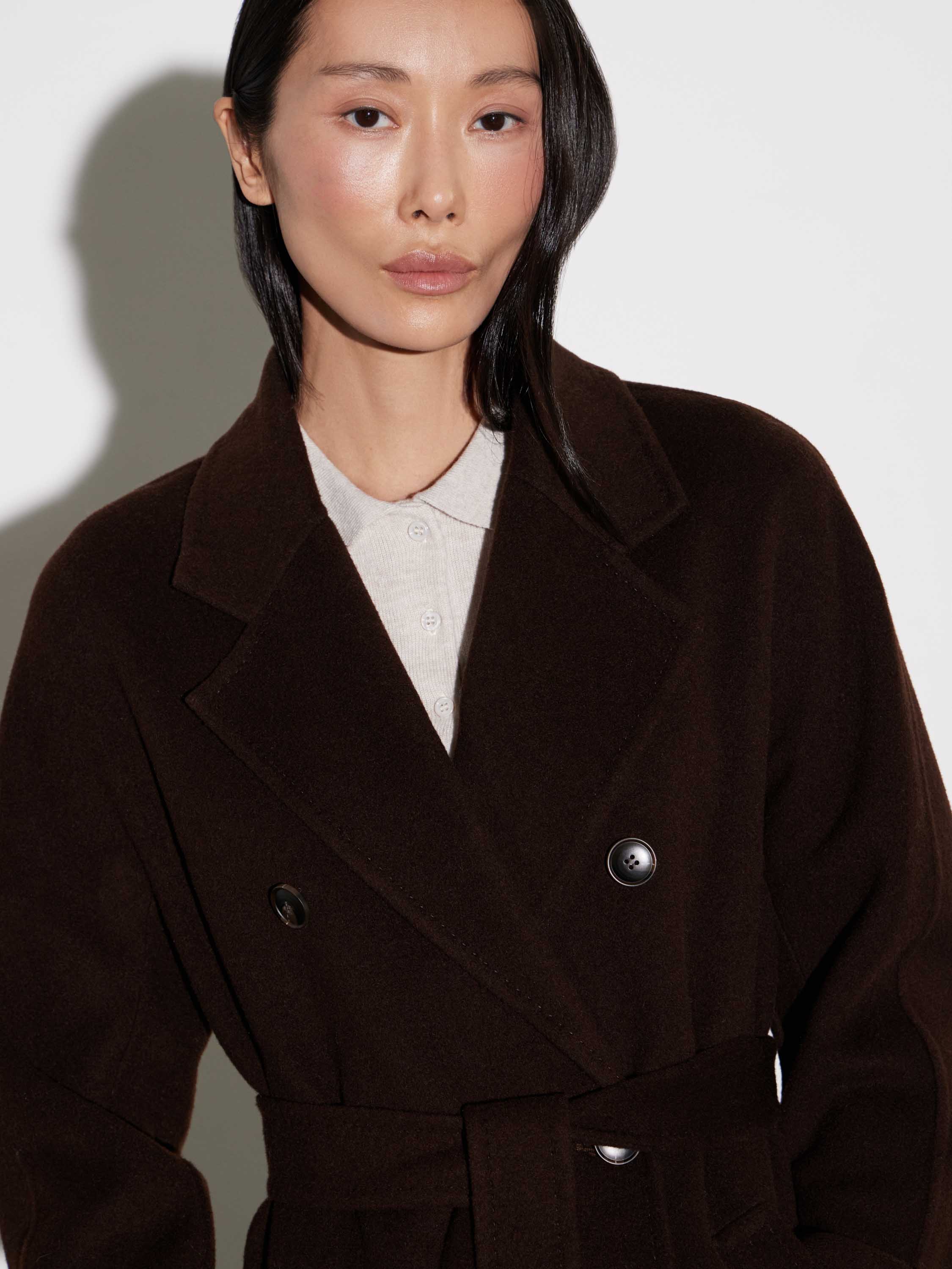 Это пальто выполнено из шерсти с добавлением тенсела — сочетание, которое делает ткань плотной, но в то же время пластичной и более мягкой в движении. Двубортный крой и прямой силуэт подчеркивают строгость линии, а пояс позволяет акцентировать талию и менять настроение образа — от расслабленного до собранного. Оптимальная длина закрывает бедро и голень, создавая пропорции, подходящие для разной обуви — от ботинок до каблука. Лаконичные детали вроде строгого лацкана и крупных пуговиц делают модель универсальной: это не просто базовое пальто, а вещь, которая выглядит актуально независимо от сезона и трендов.