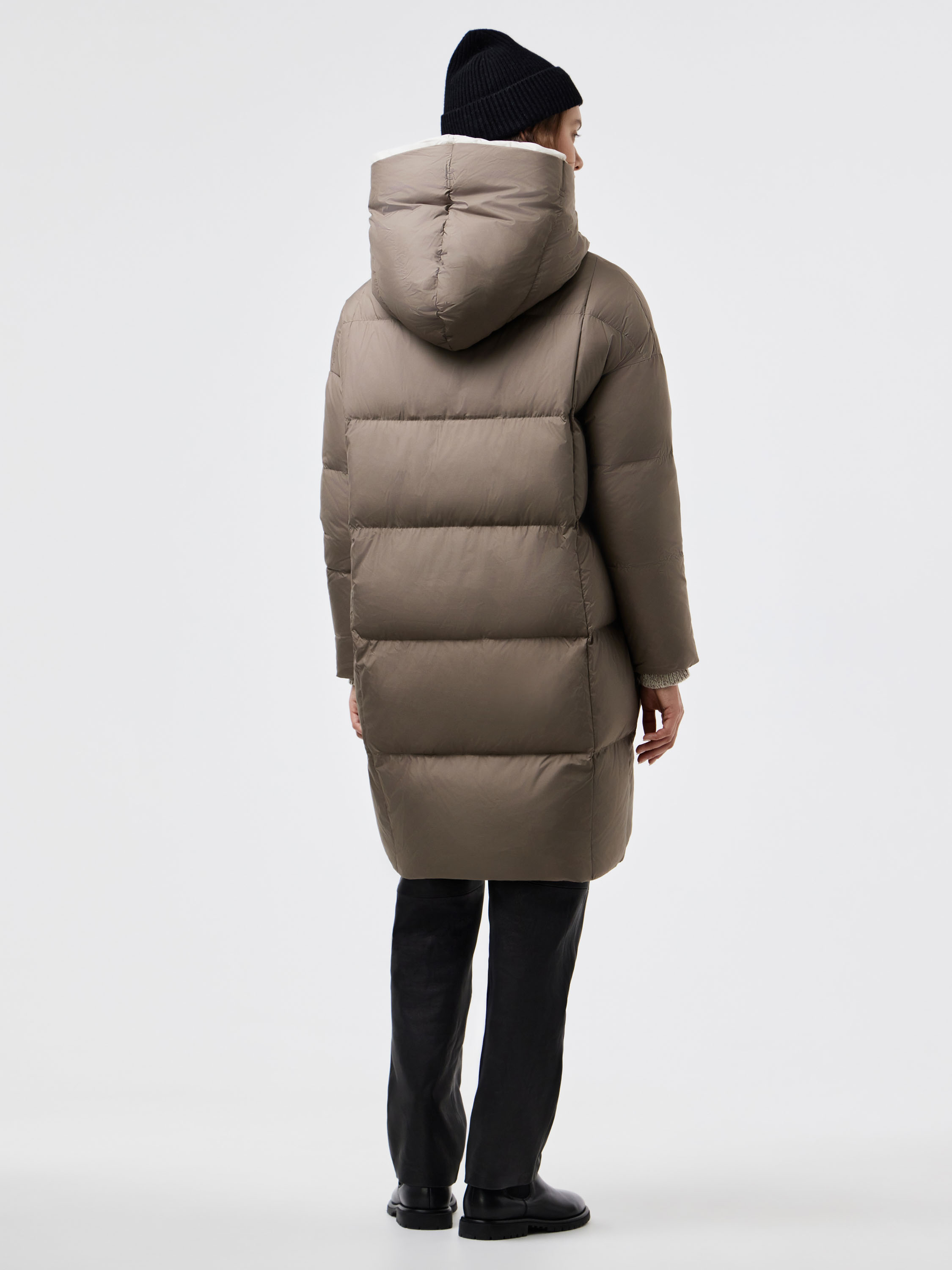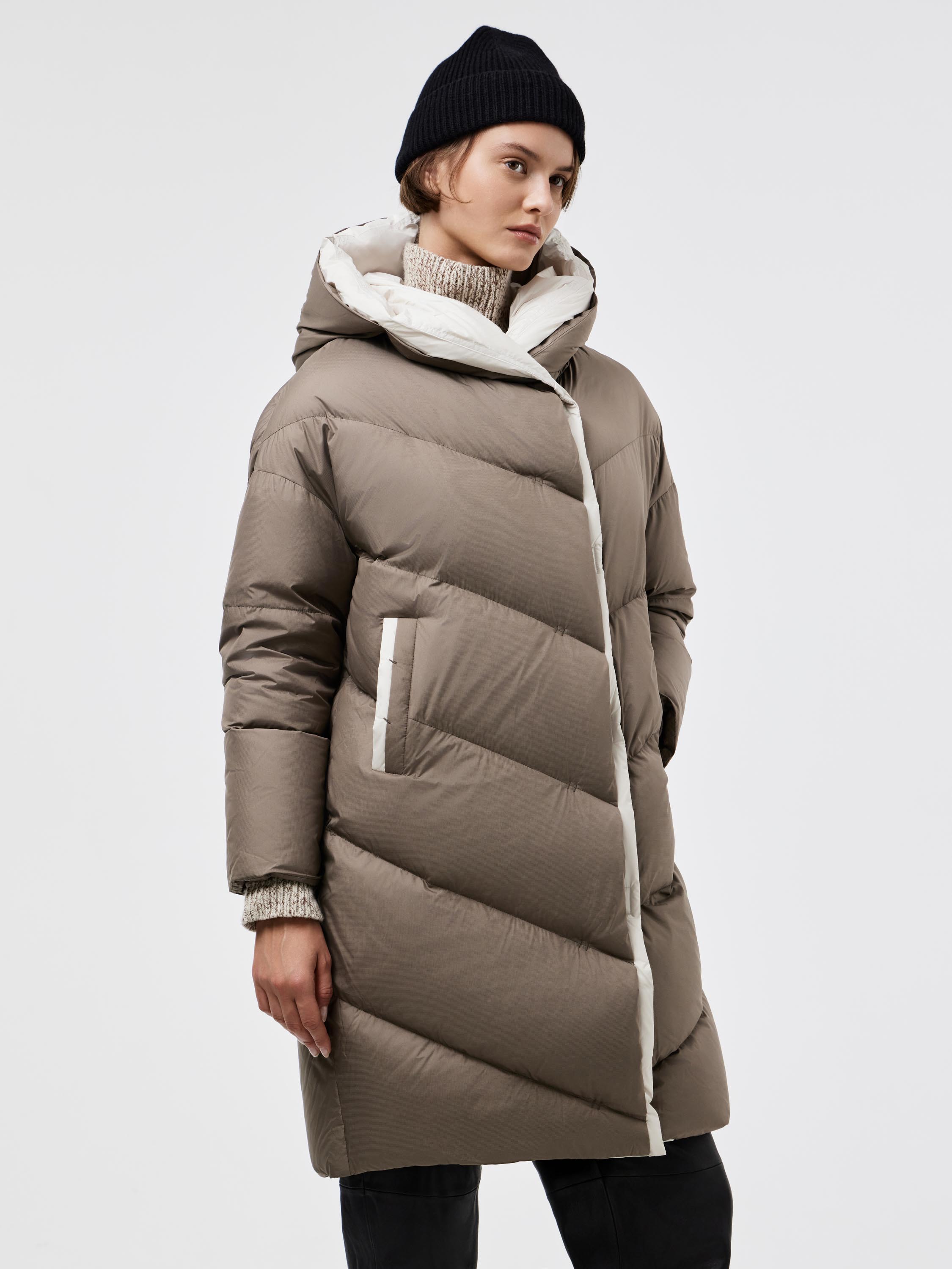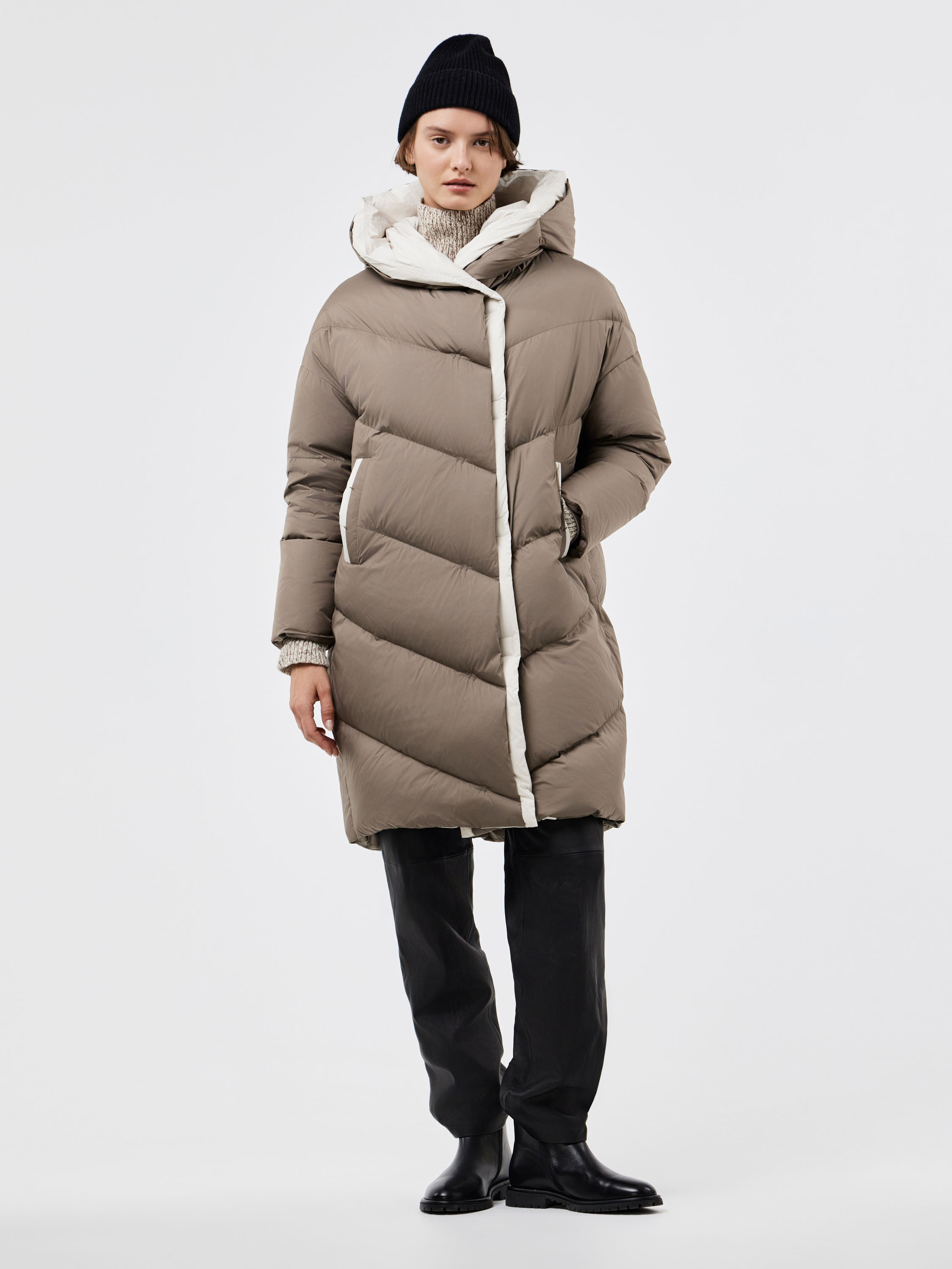 Удлиненный пуховик прямого силуэта, выполненный из гладкого текстиля с диагональной стежкой. В качестве наполнителя используется натуральный утиный пух с добавлением пера, что делает модель легкой и теплой. Объемный капюшон обеспечивает защиту от ветра и холода, а застежка на молнию дополнена планкой, создающей дополнительный барьер. Контрастная внутренняя отделка добавляет выразительности и подчеркивает современный характер модели. Универсальный крой и продуманные детали позволяют носить пуховик как с повседневными образами — джинсами, трикотажем, ботинками, так и с более строгими комплектами, где требуется надежная защита от холода.