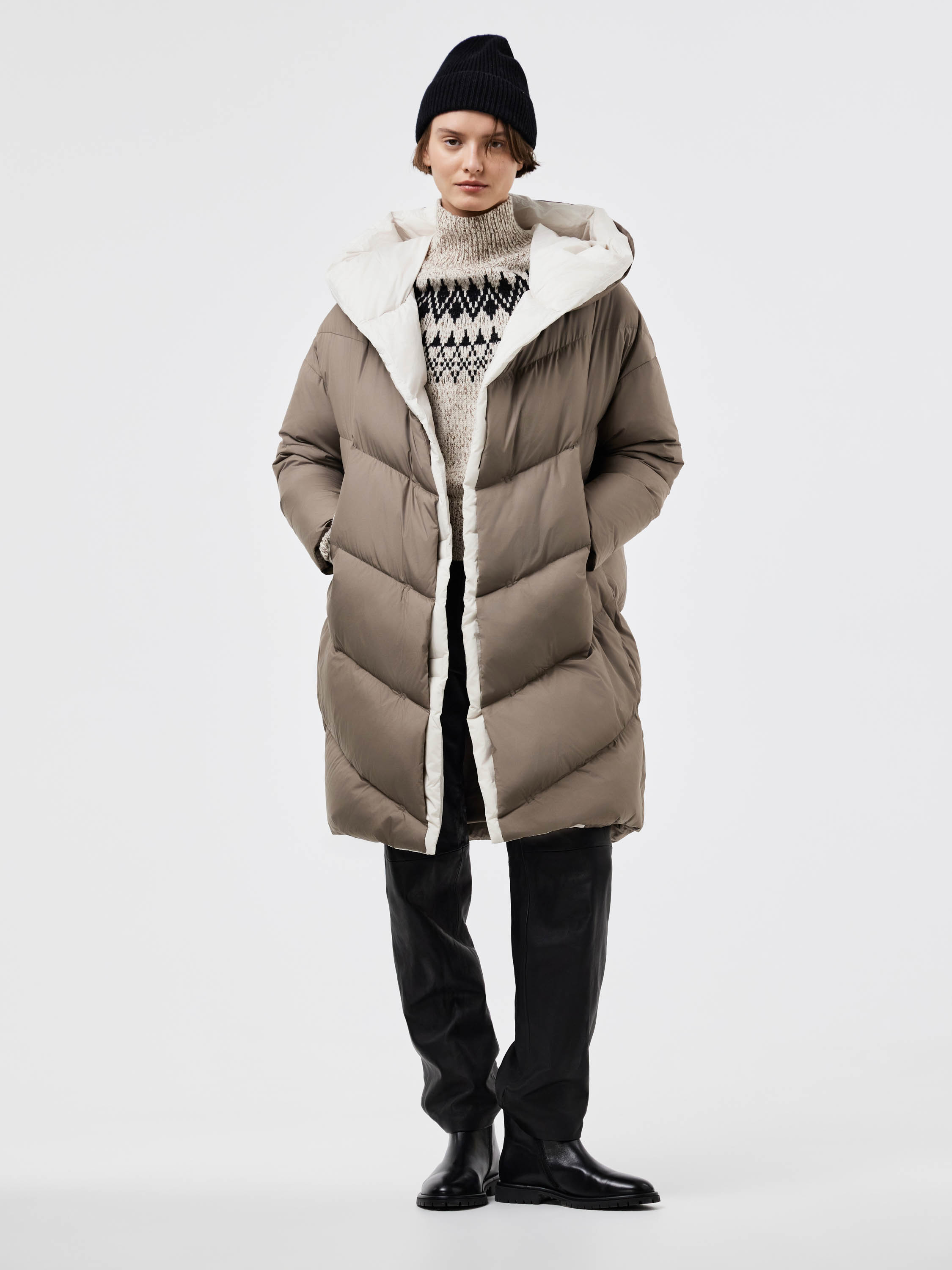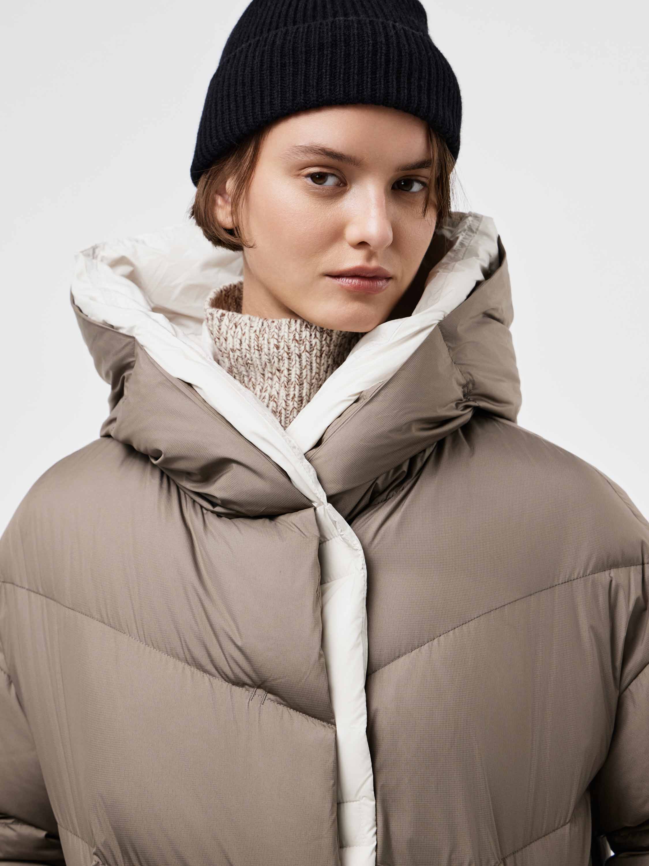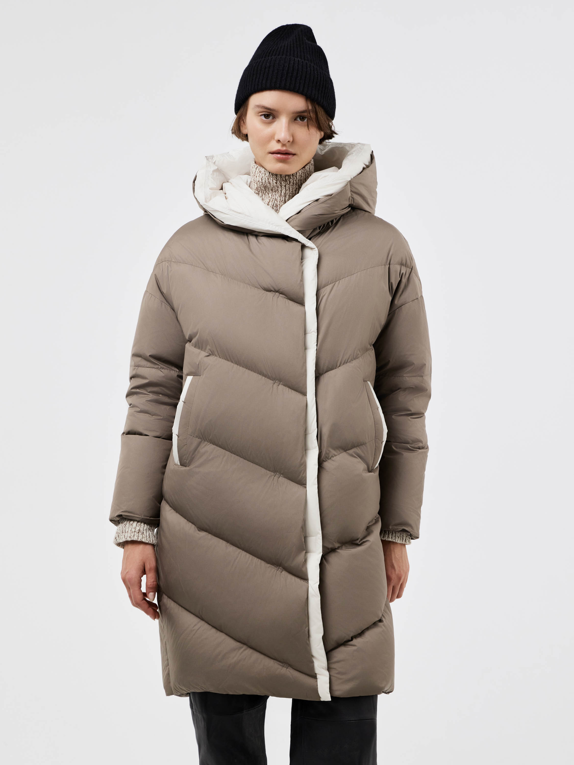 Удлиненный пуховик прямого силуэта, выполненный из гладкого текстиля с диагональной стежкой. В качестве наполнителя используется натуральный утиный пух с добавлением пера, что делает модель легкой и теплой. Объемный капюшон обеспечивает защиту от ветра и холода, а застежка на молнию дополнена планкой, создающей дополнительный барьер. Контрастная внутренняя отделка добавляет выразительности и подчеркивает современный характер модели. Универсальный крой и продуманные детали позволяют носить пуховик как с повседневными образами — джинсами, трикотажем, ботинками, так и с более строгими комплектами, где требуется надежная защита от холода.