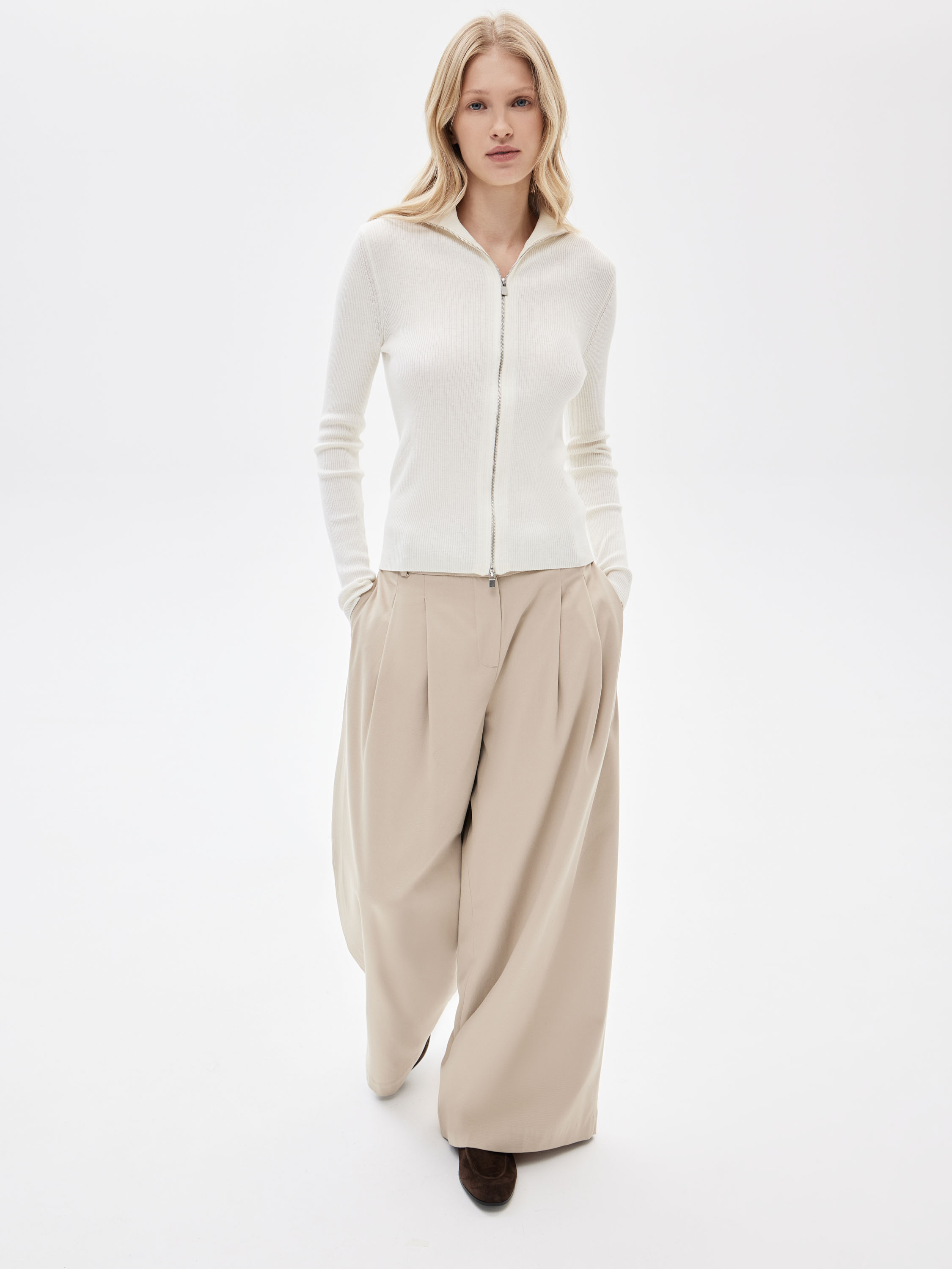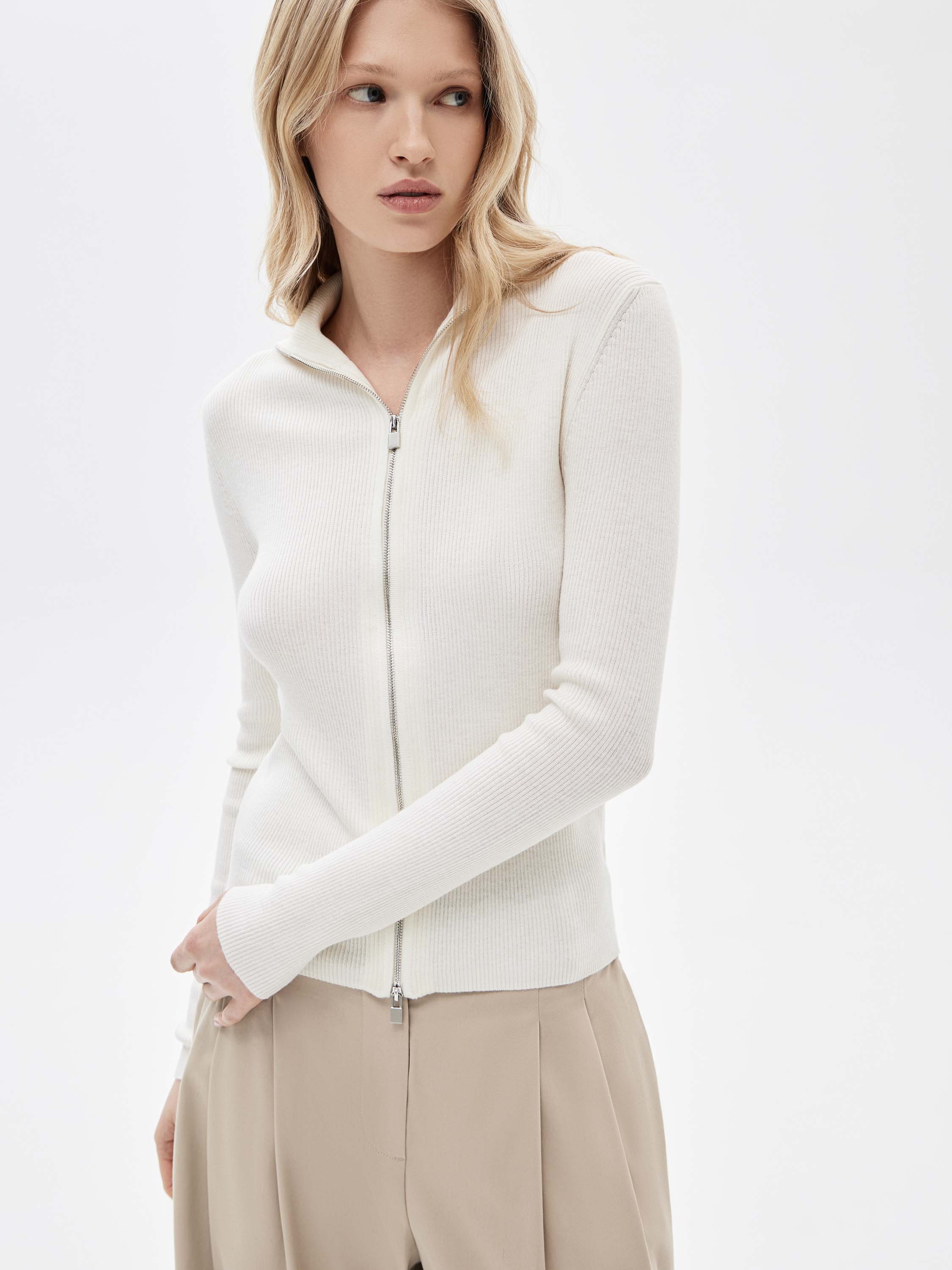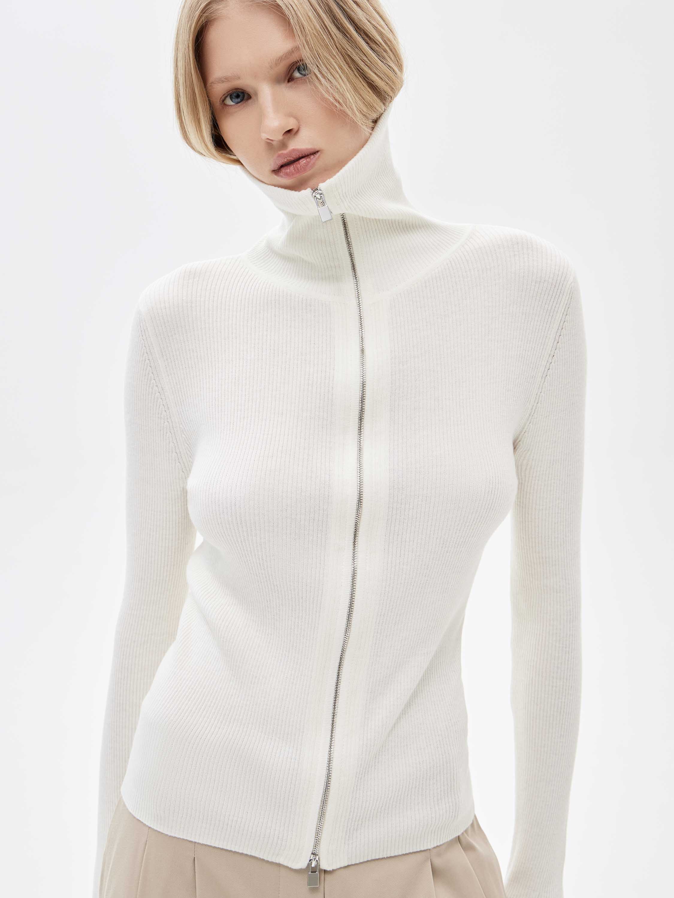 Кардиган выполнен из тонкого смесового трикотажа с добавлением шерсти мериноса. Материал мягкий, эластичный, комфортно прилегает к телу и подходит для повседневного ношения. Трикотаж хорошо сохраняет тепло, при этом остается легким и не перегружает образ. Фактура в мелкий рубчик подчеркивает вертикаль и аккуратно повторяет линии фигуры. Посадка прилегающая, без избыточного обьема. Воротник с мягкой стойкой и застежка на молнию задают четкую, лаконичную форму. Длинный рукав и аккуратная обработка низа завершают силуэт. Кардиган легко сочетается с юбками, брюками и базовыми слоями, подходит для повседневных и более собранных образов.