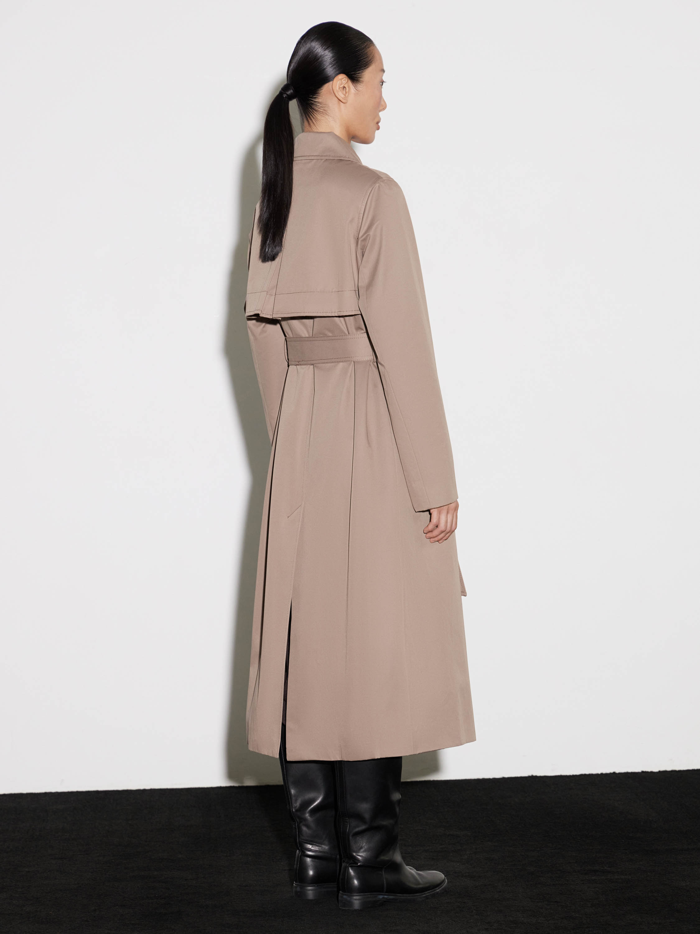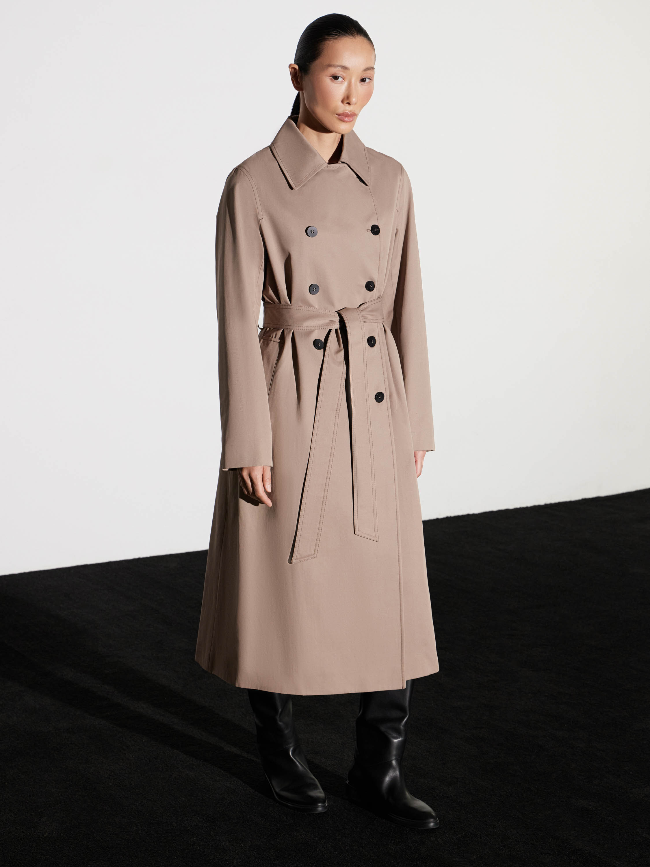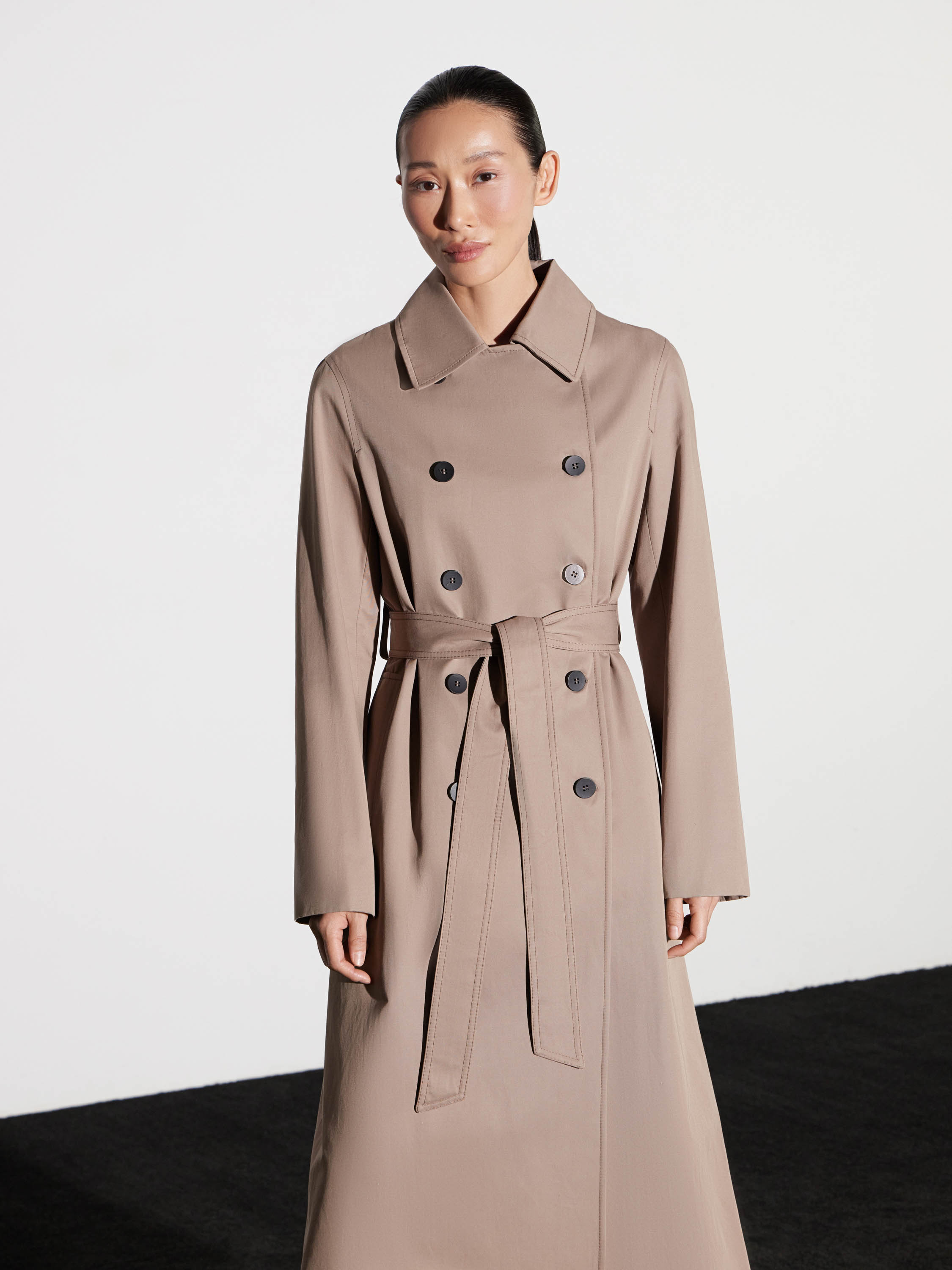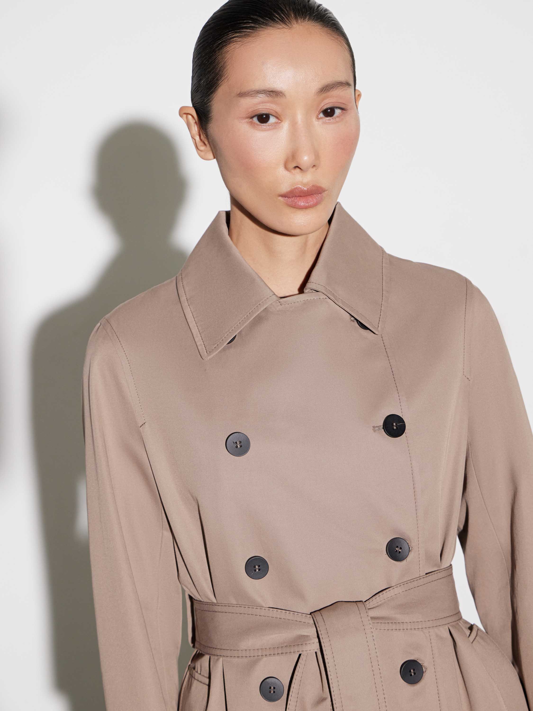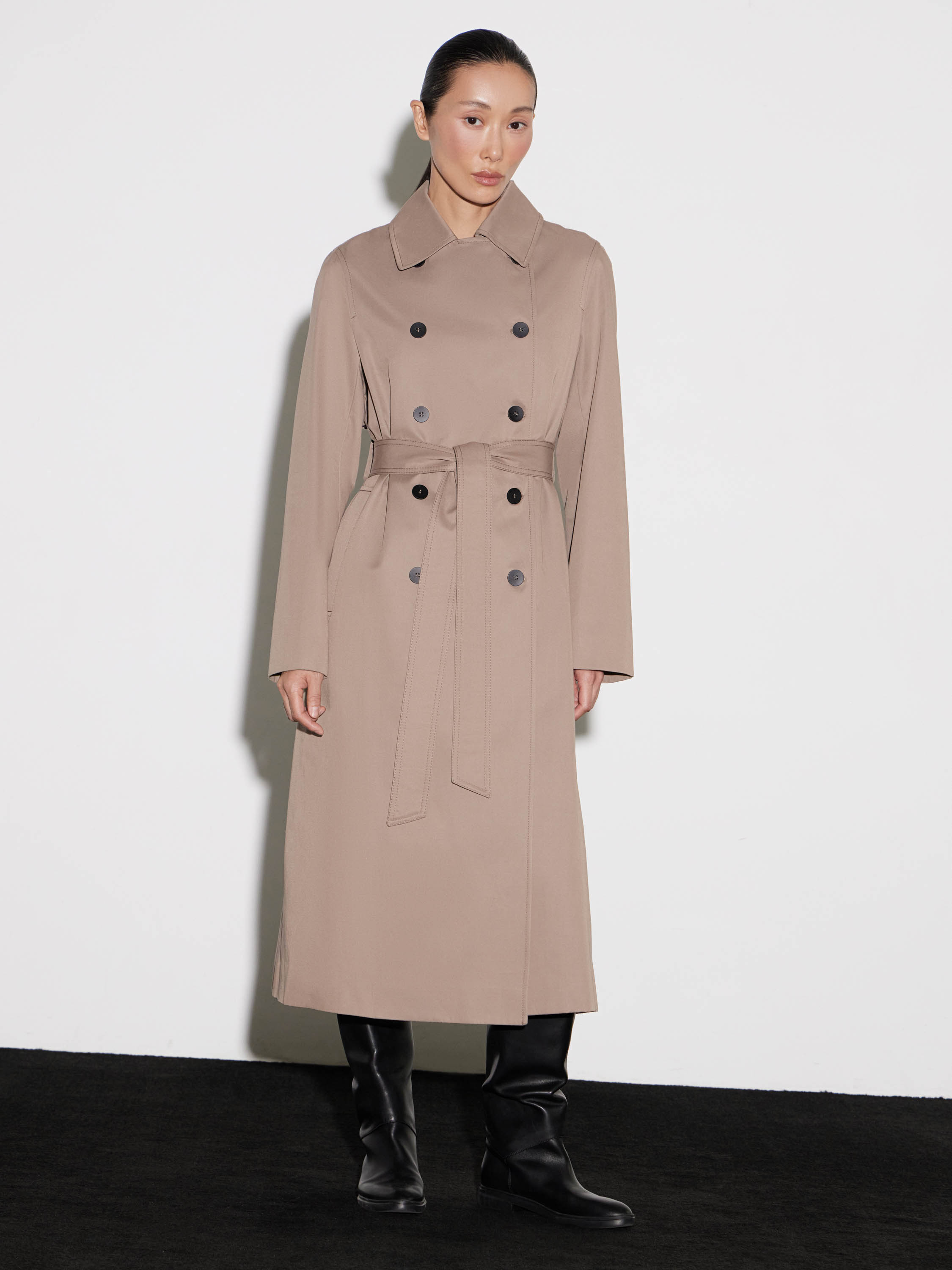 Тренч двубортного кроя с поясом на талии — минималистичный и архитектурный. Полотно из хлопка с полиэстером держит форму, не теряя пластичности и удобства в движении. Лаконичные линии, четкие плечи и чистый силуэт подчеркивают сдержанность модели. Детали — ряд контрастных пуговиц, английский воротник, регулируемые хлястики на рукавах. Тренч легко вписывается в капсулу межсезонья, собирая как расслабленные, так и собранные комплекты.