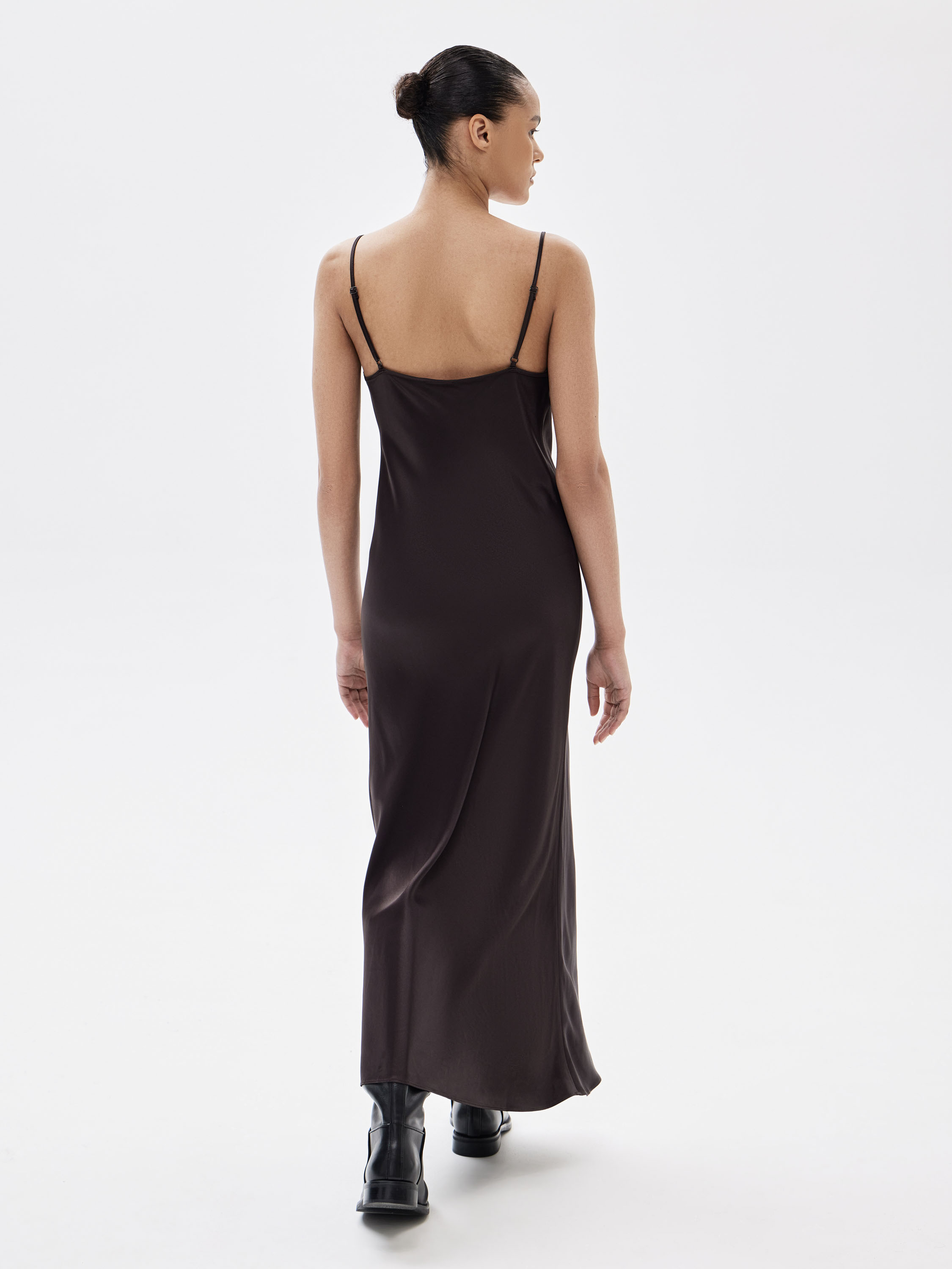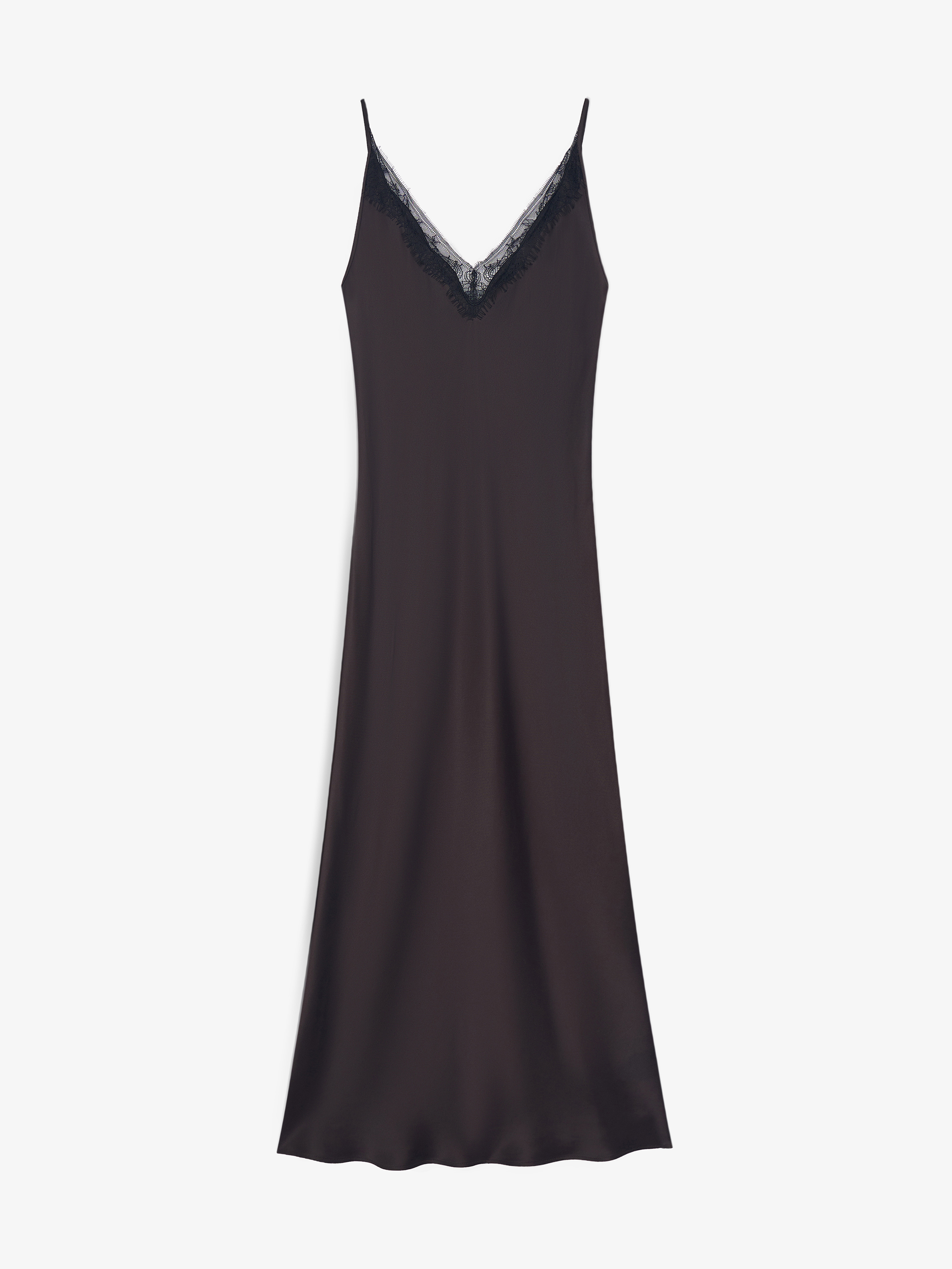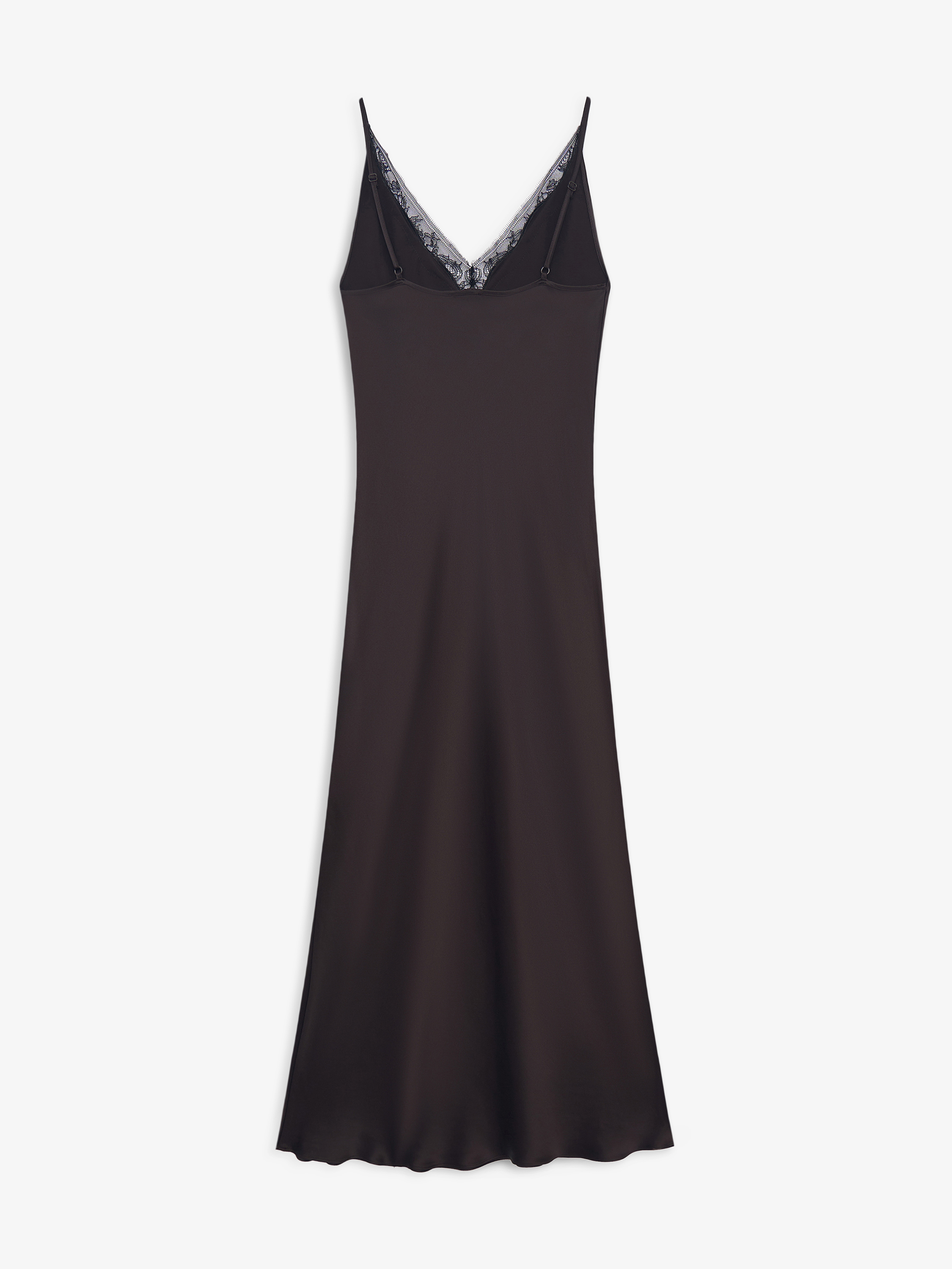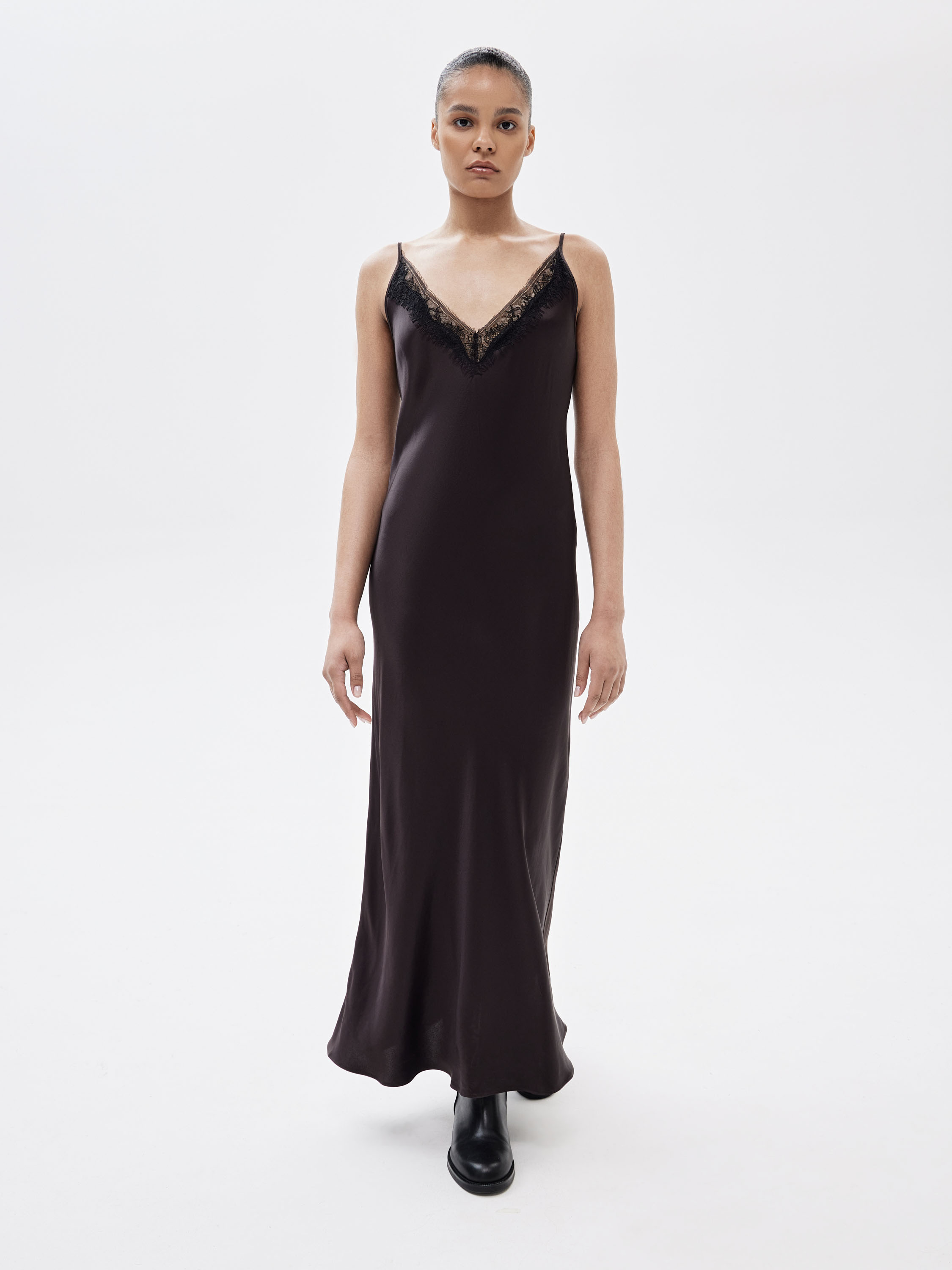 Платье в бельевом стиле из 100% района с гладкой, текучей текстурой. Материал тонкий и пластичный, мягко драпируется и дает ровное, естественное падение по фигуре. Прямой удлиненный крой подчеркивает вертикаль, не подчеркивая лишнего объема. Тонкие бретели и V-образный вырез формируют открытую линию плеч и декольте, а кружевная отделка добавляет деликатный акцент, сохраняя сдержанный характер модели. Платье подходит для носки как самостоятельная вещь и легко стилизуется с жакетами, пальто и трикотажными слоями, переходя из дневных образов в вечерние.
