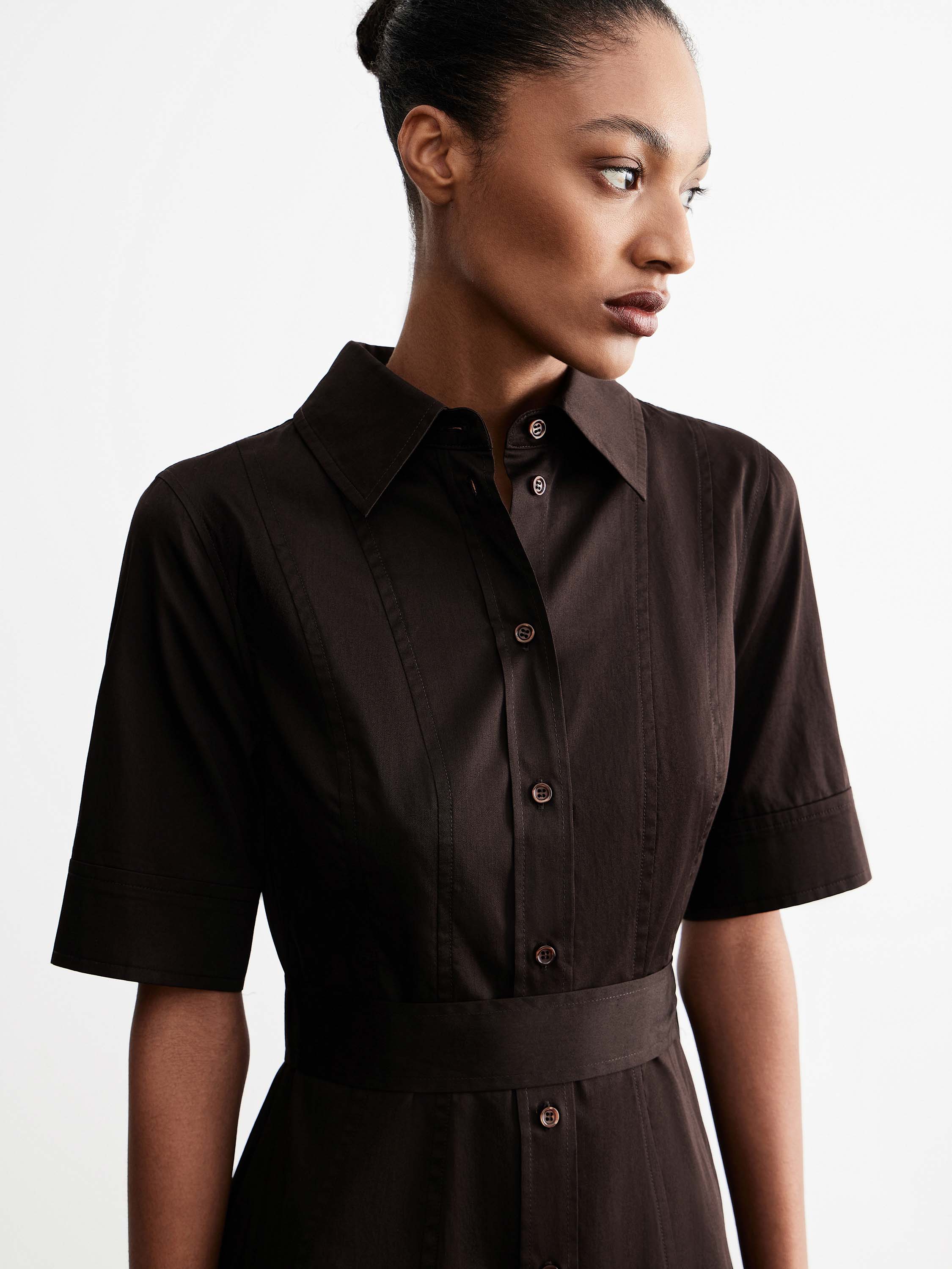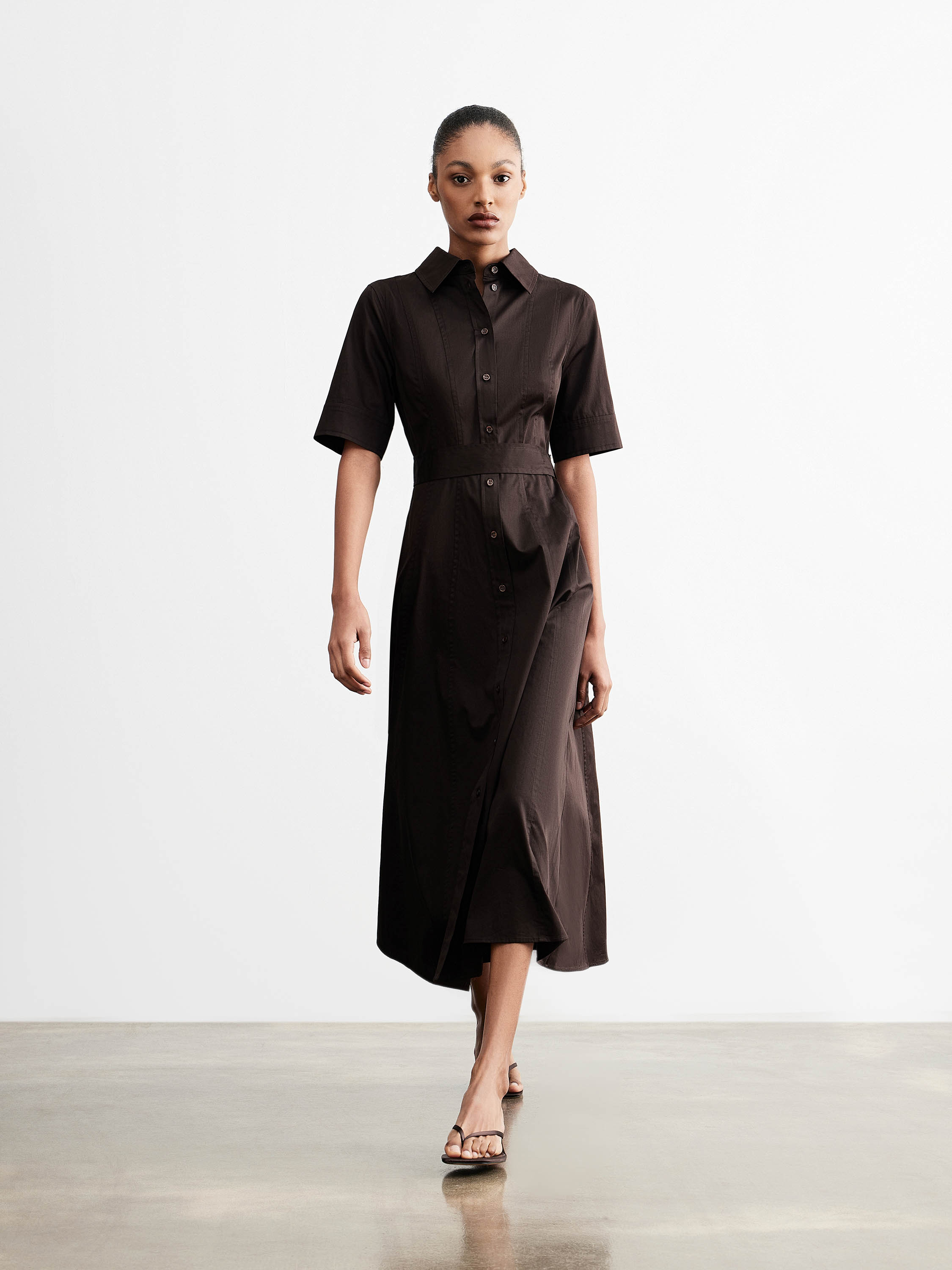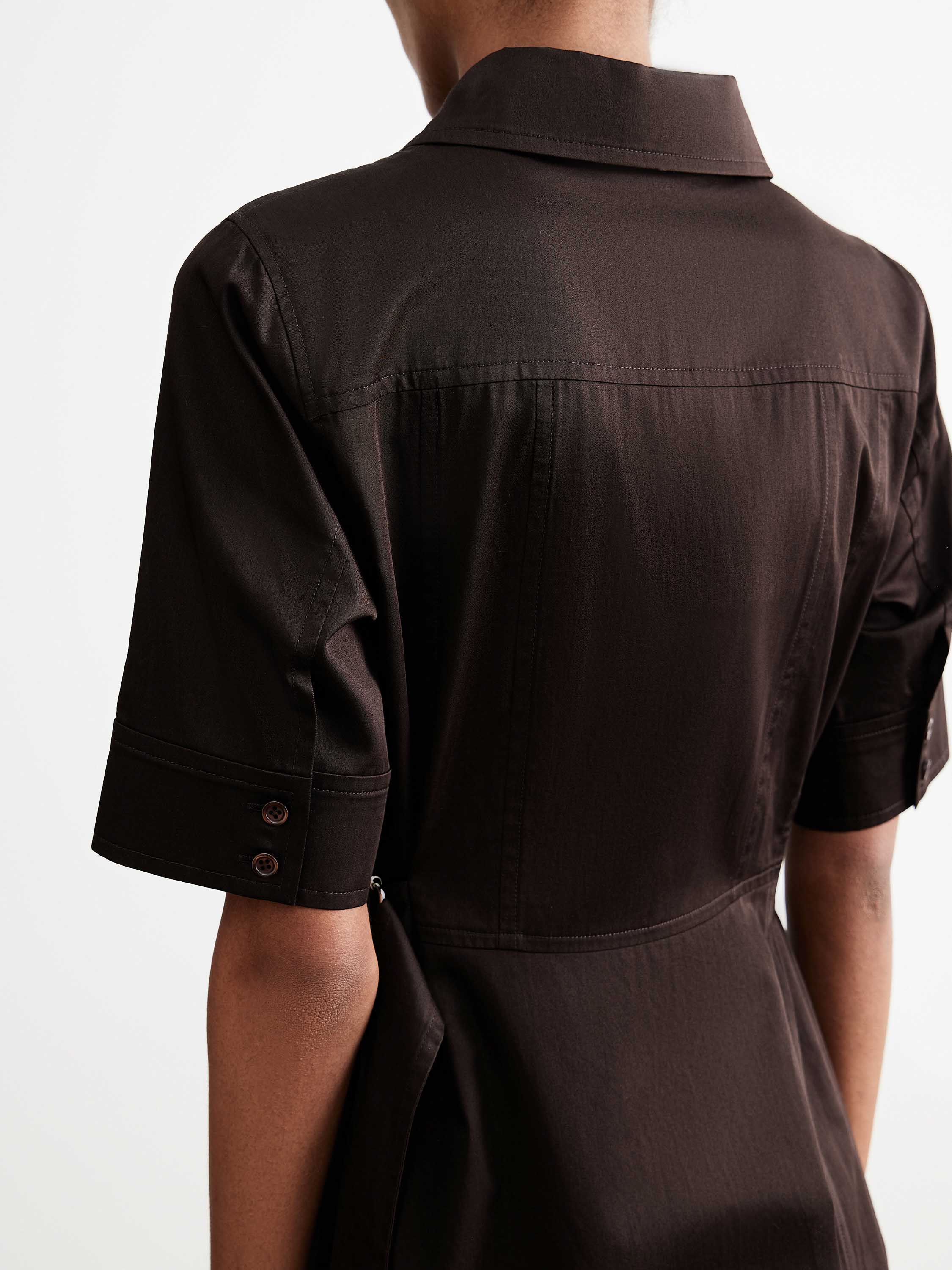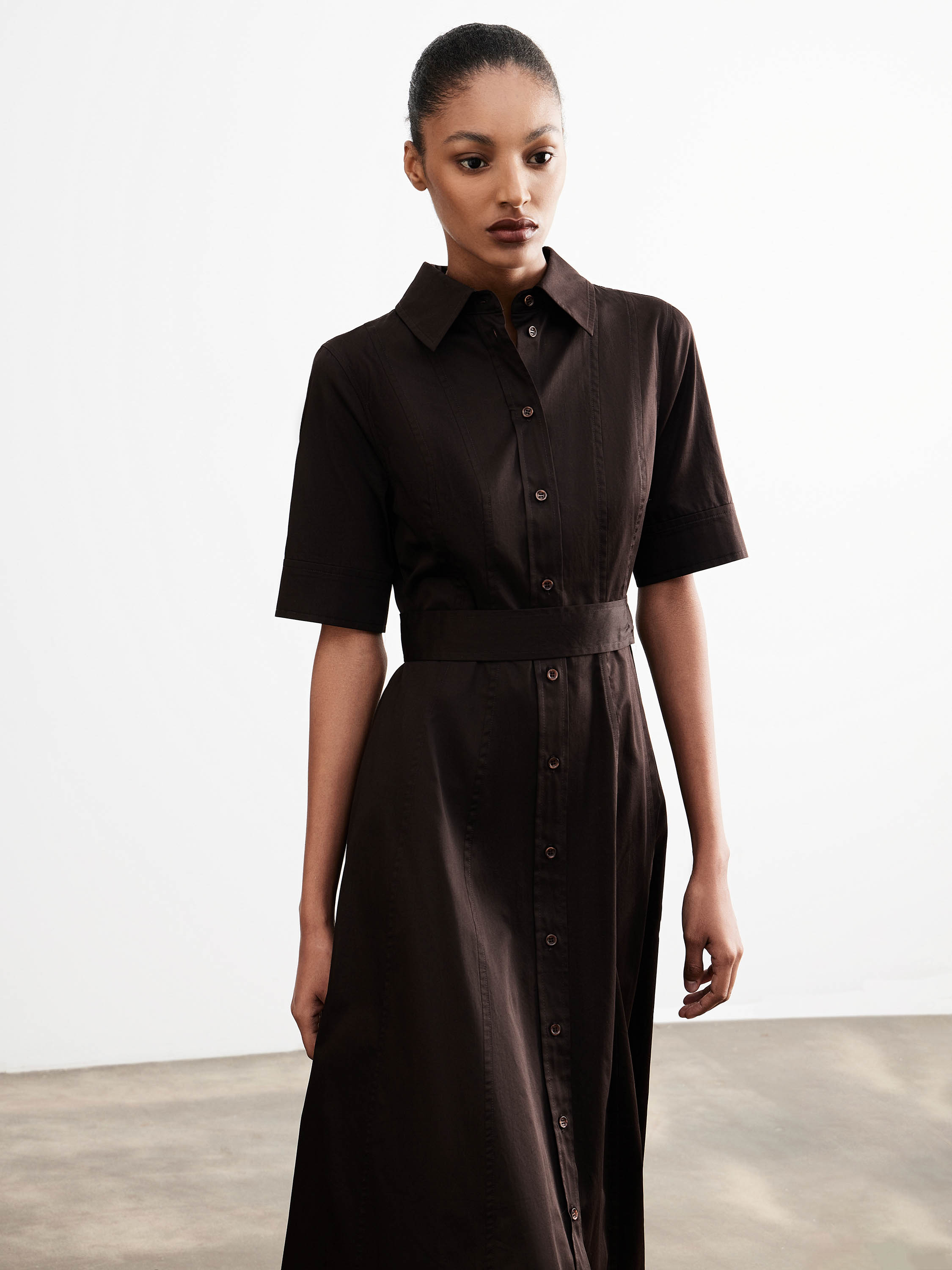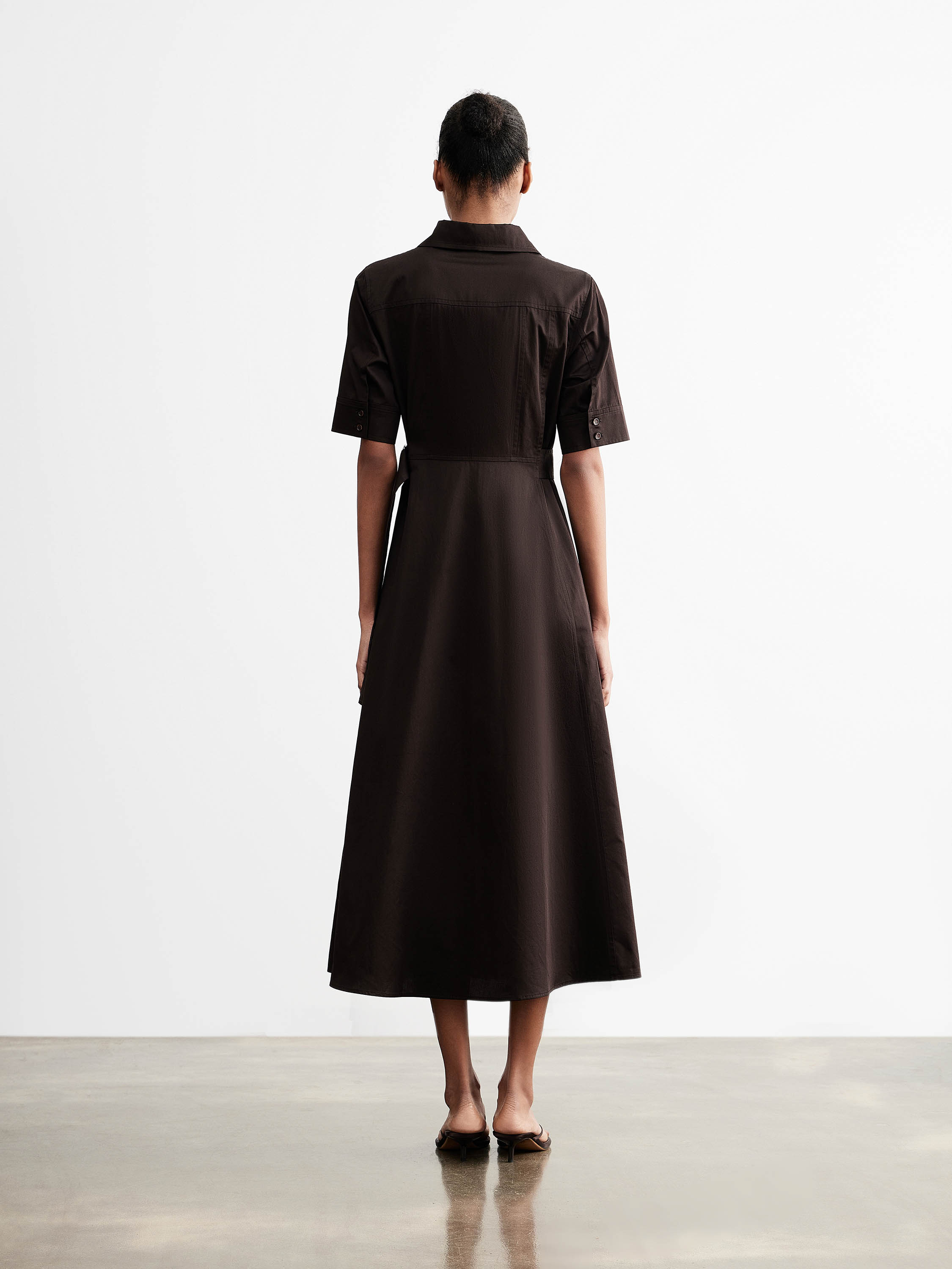 Платье из хлопка с приталенным силуэтом и мягко расклешенной юбкой, создающей плавное движение при ходьбе. Хлопок обеспечивает воздухопроницаемость, комфорт в течение дня и аккуратную, гладкую поверхность ткани, которая сохраняет форму. Модель выполнена с отложным воротником, короткими рукавами и центральной застежкой на пуговицы по всей длине, линия талии обозначена поясом, формирующим четкий силуэт без лишнего объема. Глубокий темный оттенок подчеркивает лаконичность конструкции и делает модель универсальной для повседневных и более собранных образов с минимальными дополнениями.