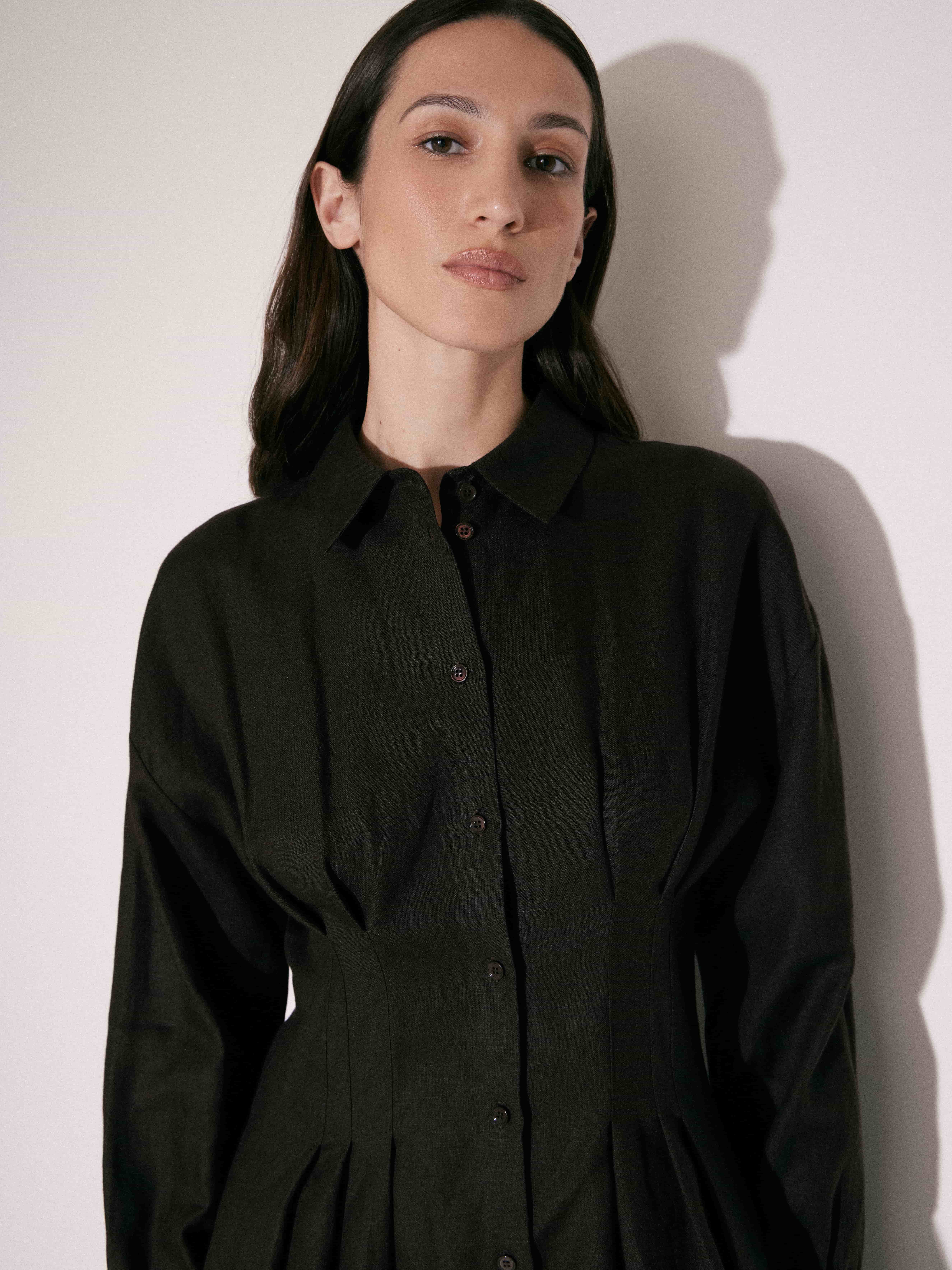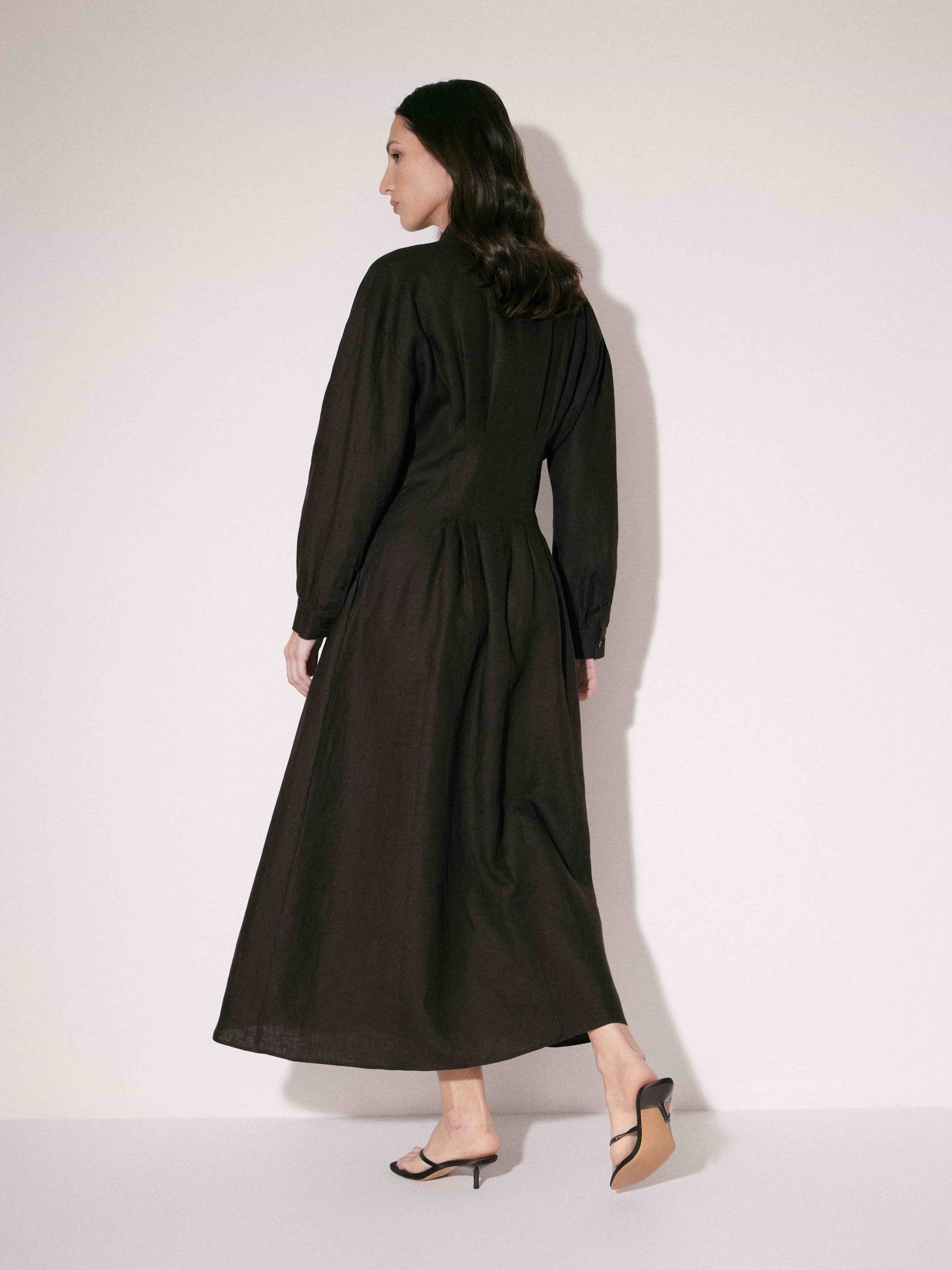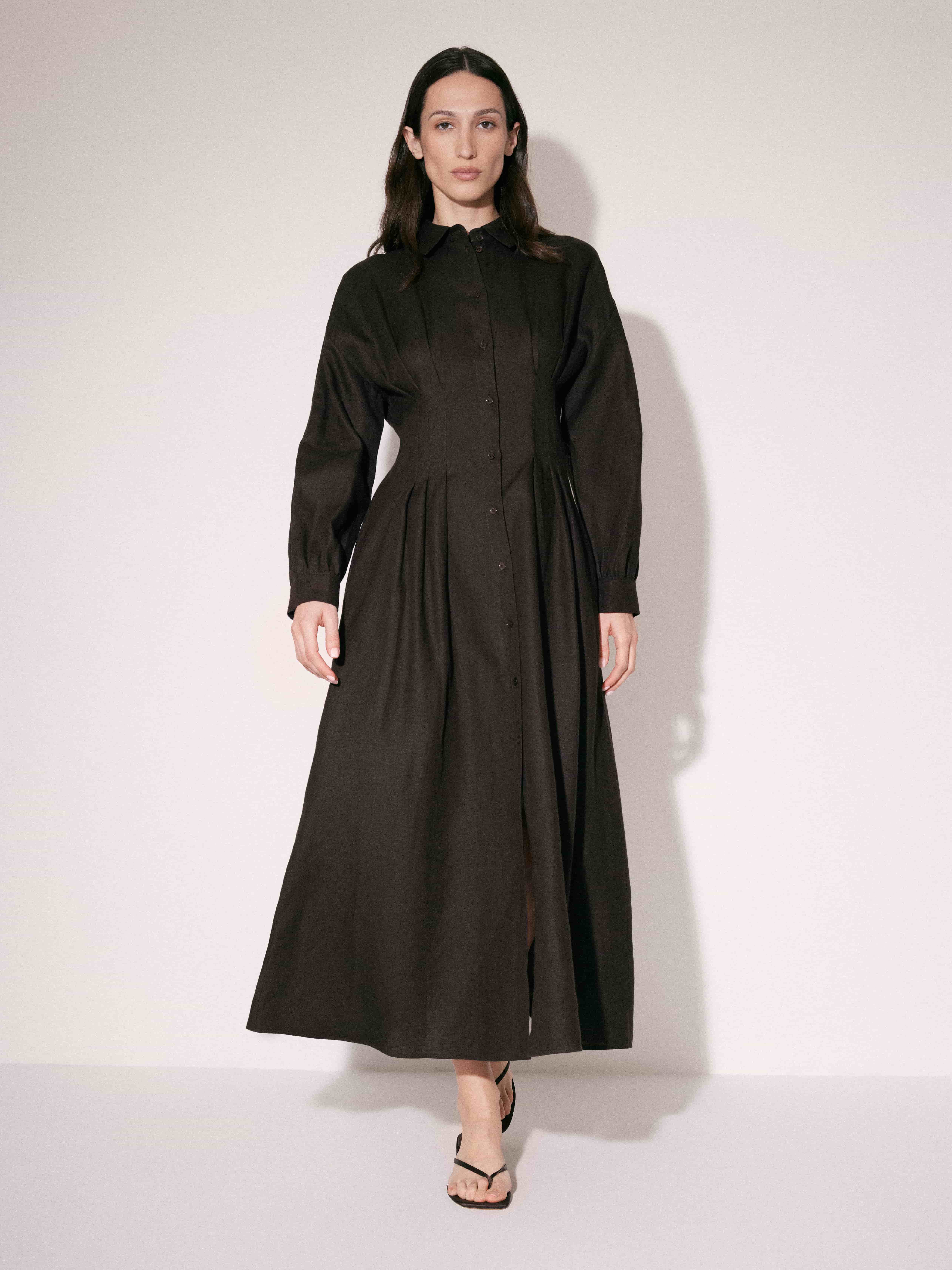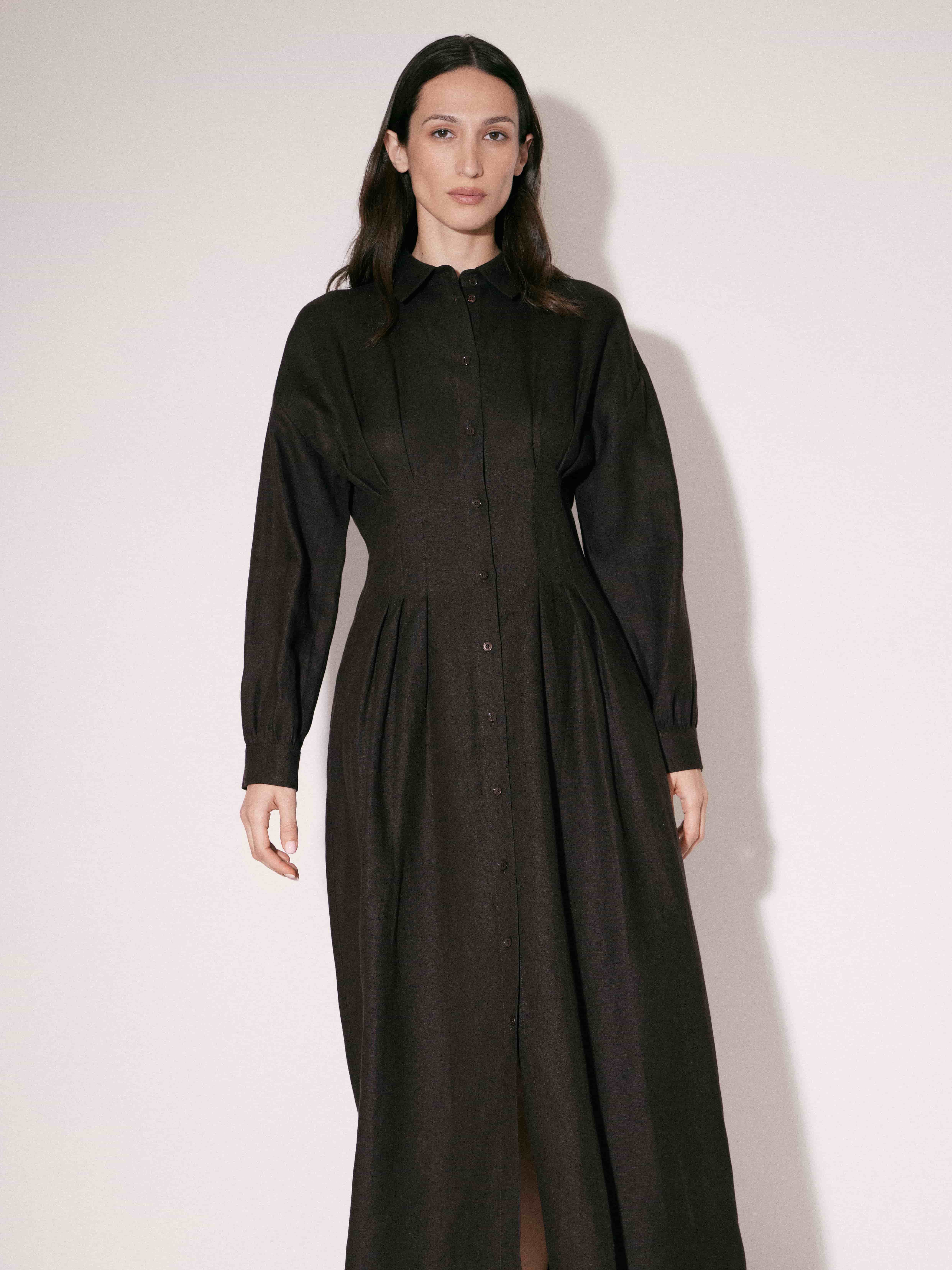 Платье миди с приталенной верхней частью и выраженным расширением к низу. Посадка аккуратная, с четкой линией плеча и оформленной талией, за счет чего силуэт выглядит собранно и вытянуто. Конструкция рубашечного типа: отложной воротник, центральная планка с пуговицами по всей длине. В области талии заложены мягкие складки, которые формируют объем юбки и добавляют пластичности движению. Рукава длинные, с легким объемом и манжетами. Материал плотный, держит форму, при этом сохраняет мягкость и комфорт в носке. Темный оттенок усиливает графичность силуэта и делает модель универсальной для повседневных и более собранных образов.