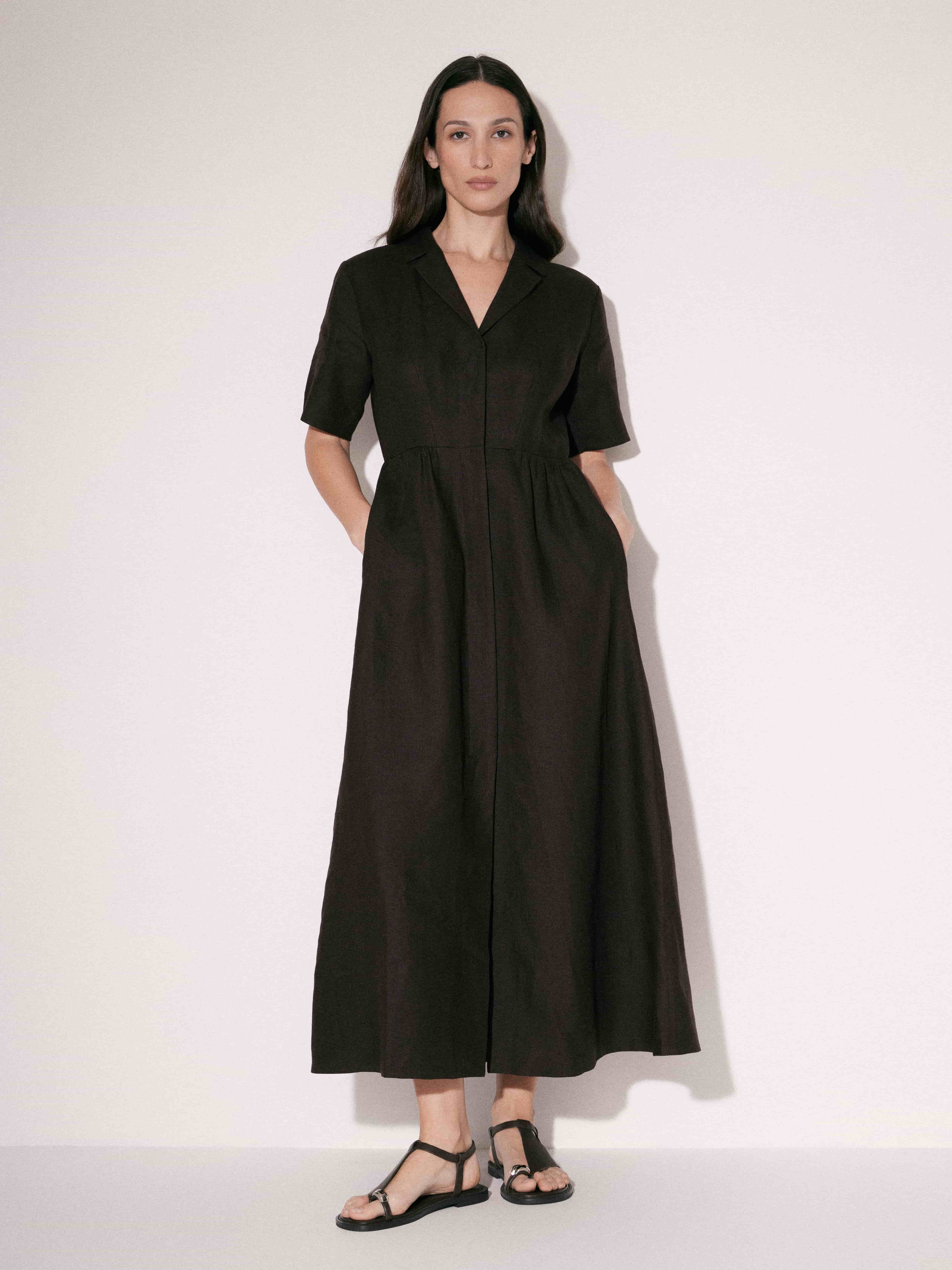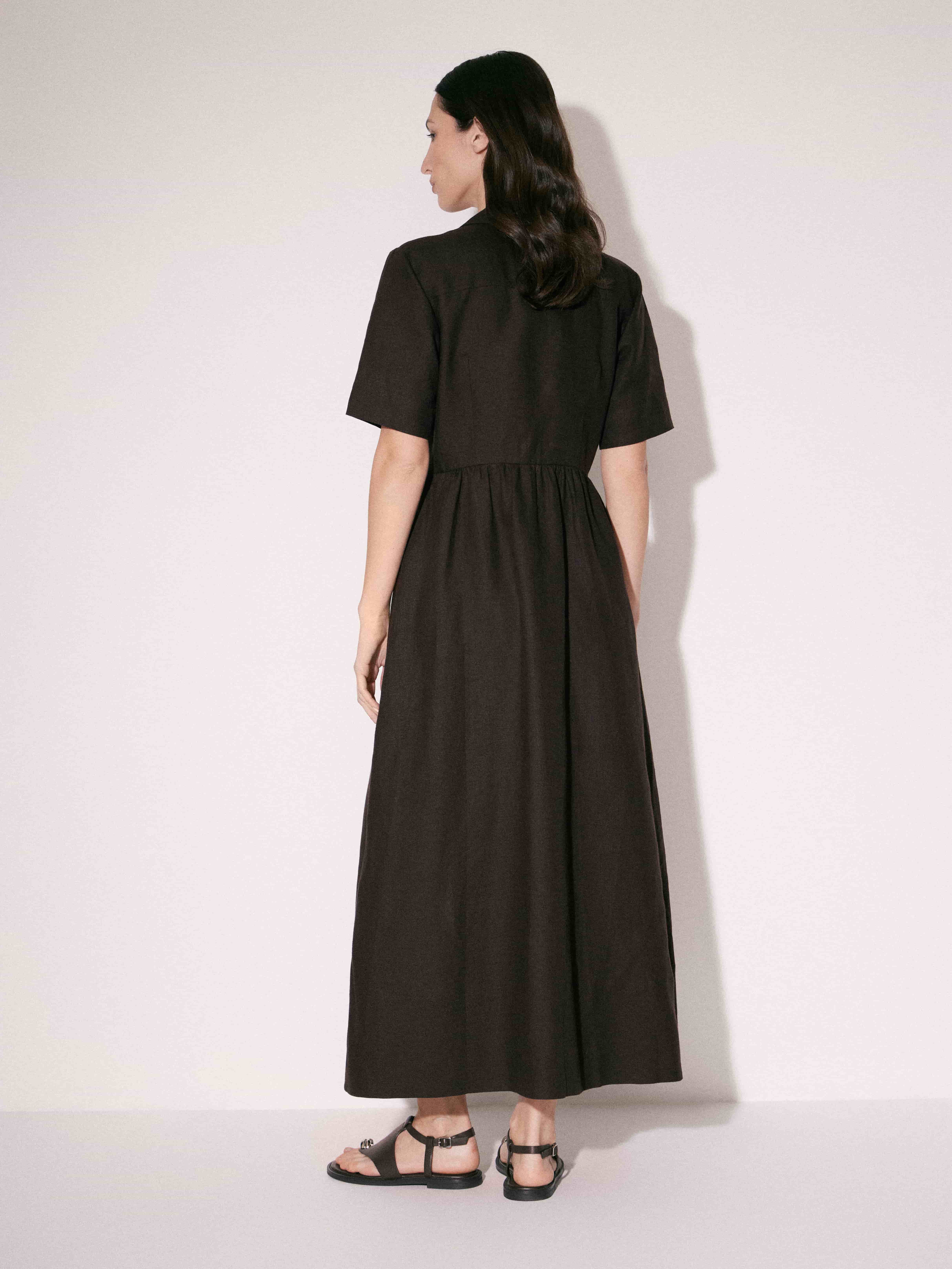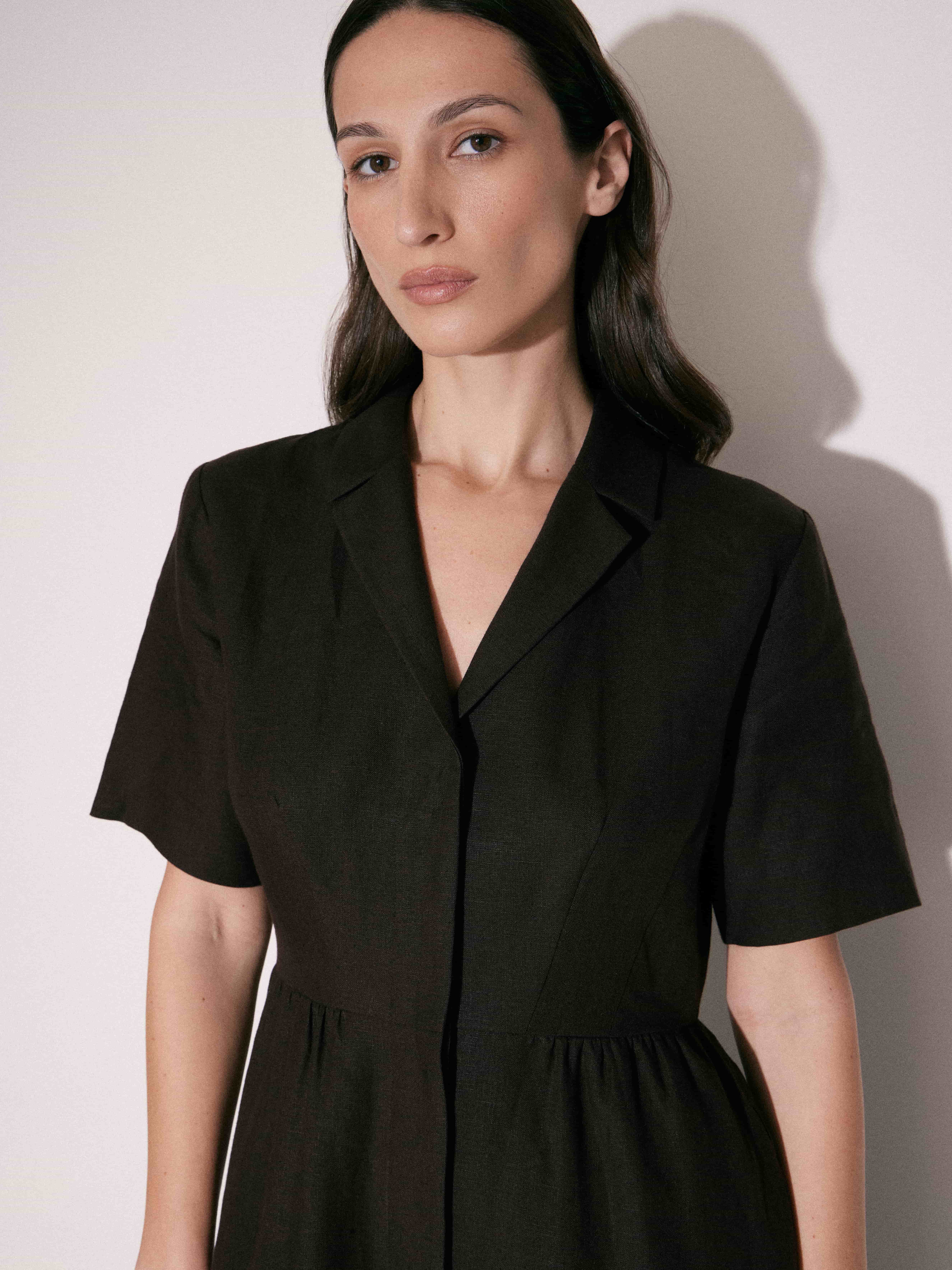 Платье миди с приталенным верхом и мягким расширением к низу. Посадка аккуратная в верхней части с четкой линией плеча, за счет чего силуэт выглядит собранно и вытянуто. Конструкция с отложным воротником и центральной планкой на пуговицах, линия талии обозначена и формирует объем юбки за счет мягких складок. Рукава короткие, прямые, без лишнего объема. В боковых швах предусмотрены карманы, которые не нарушают чистоту формы. Материал плотный, с гладкой поверхностью и легкой пластикой, хорошо держит форму и сохраняет структуру силуэта. Темный оттенок подчеркивает графичность модели и делает ее универсальной для разных сочетаний.