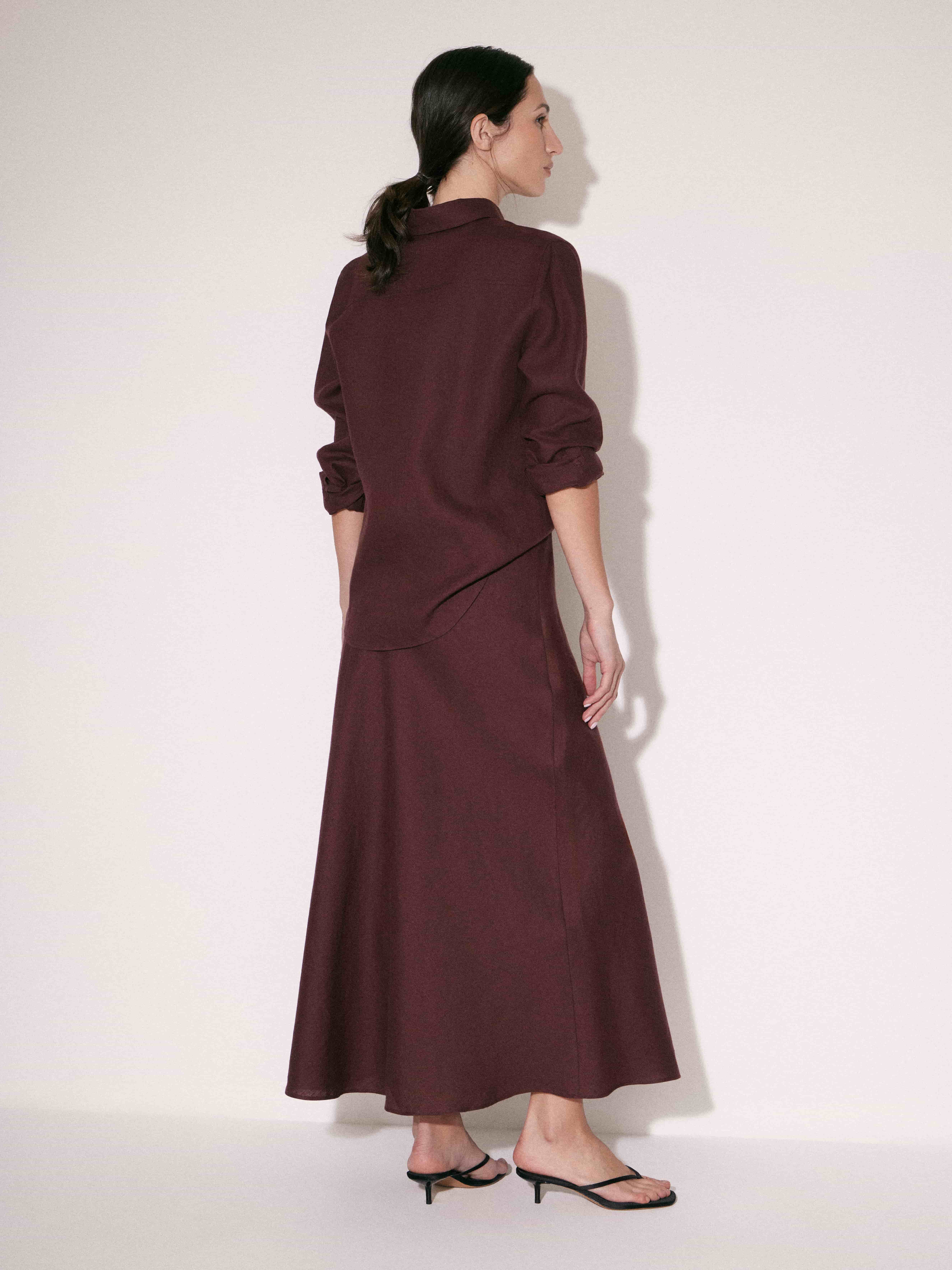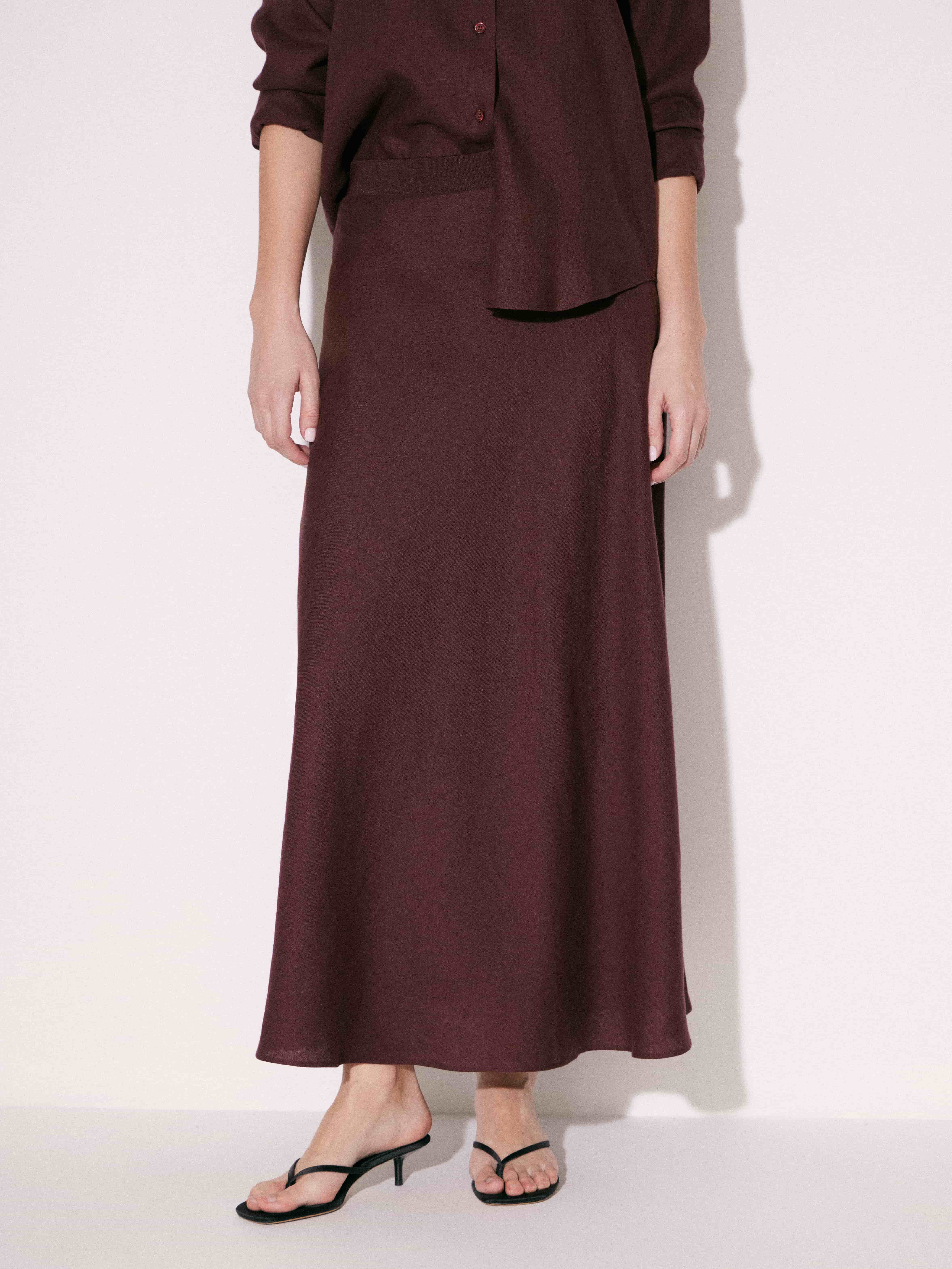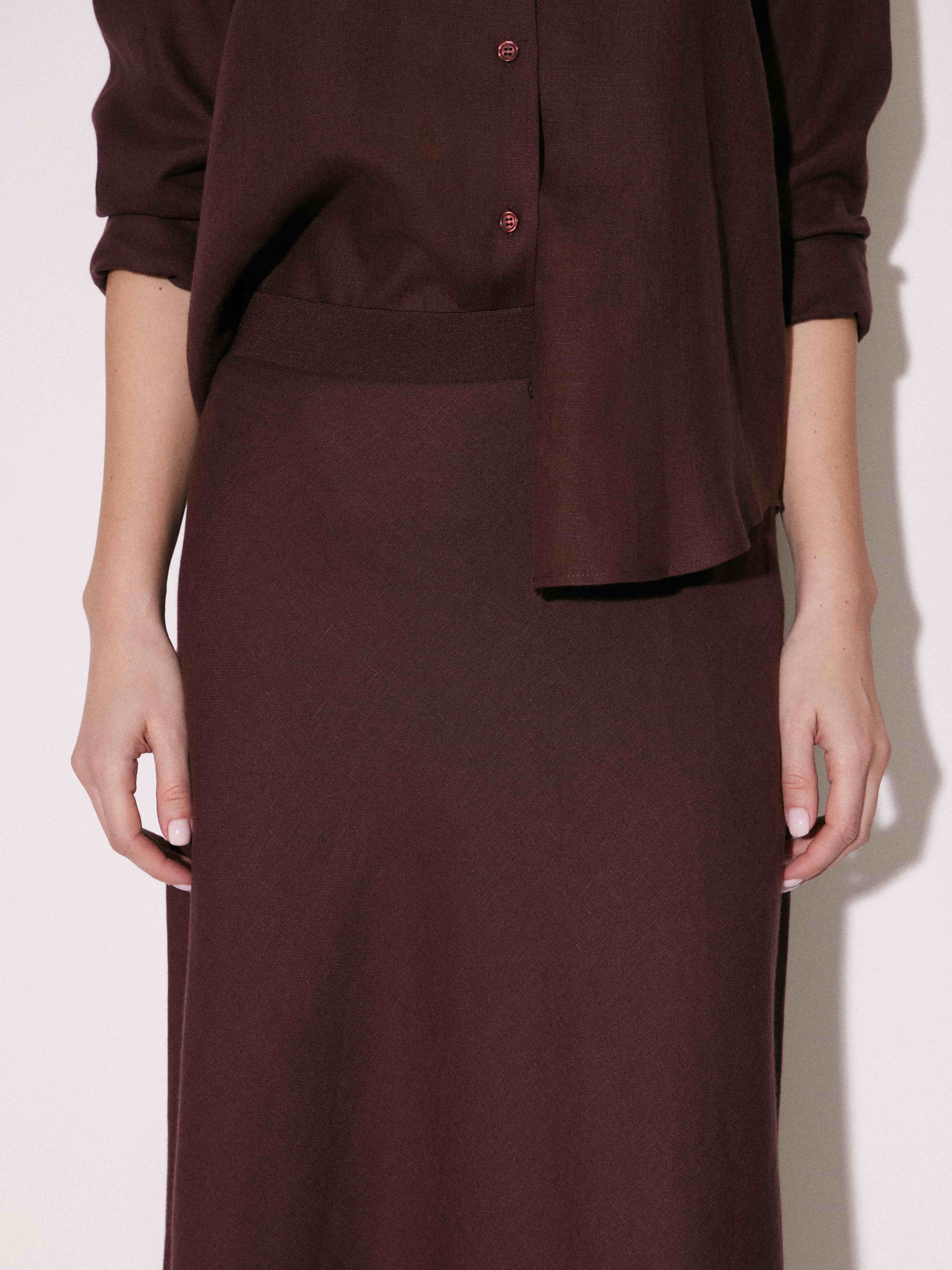 Юбка длины миди с мягкой посадкой по талии и плавным расширением к низу. Силуэт вытянутый, без лишнего объема, за счет чего линия выглядит аккуратно и собранно. Конструкция лаконичная, без декоративных элементов, с чистой линией низа. Материал гладкий, с легкой пластикой и деликатным матовым блеском, хорошо драпируется и формирует ровное движение по фигуре. Темный шоколадный оттенок добавляет глубины и легко сочетается как с базовыми, так и с более светлыми элементами гардероба.