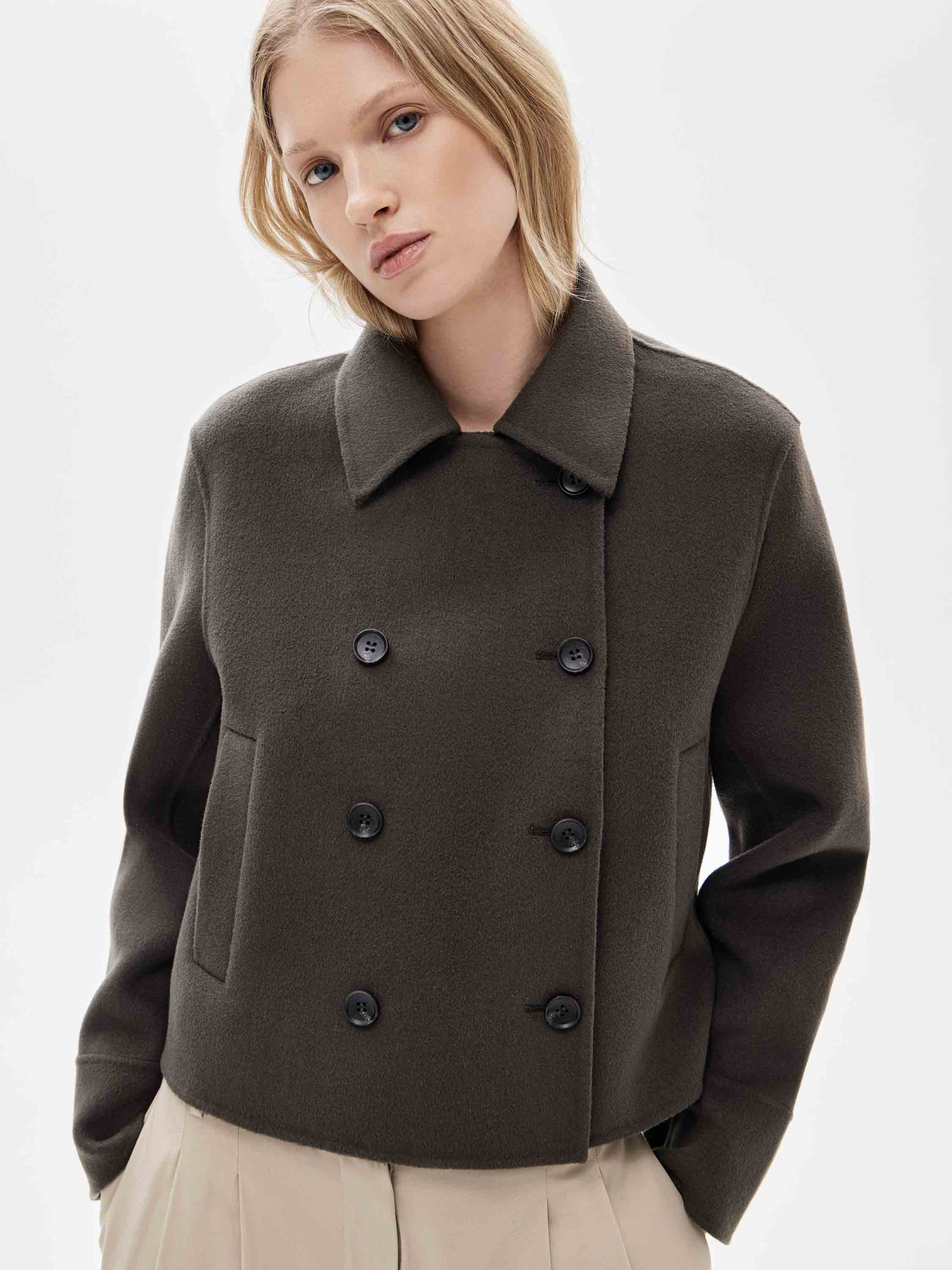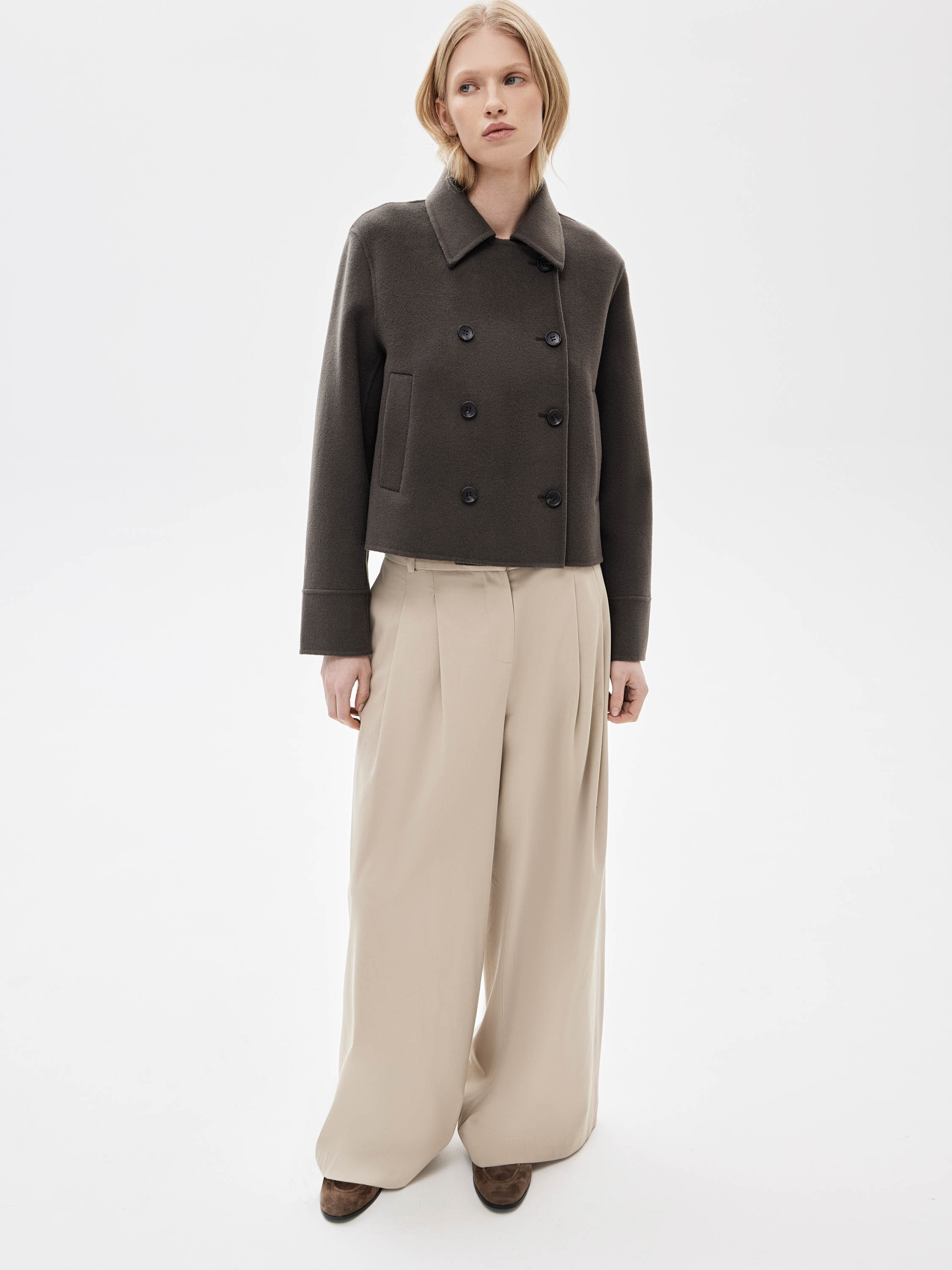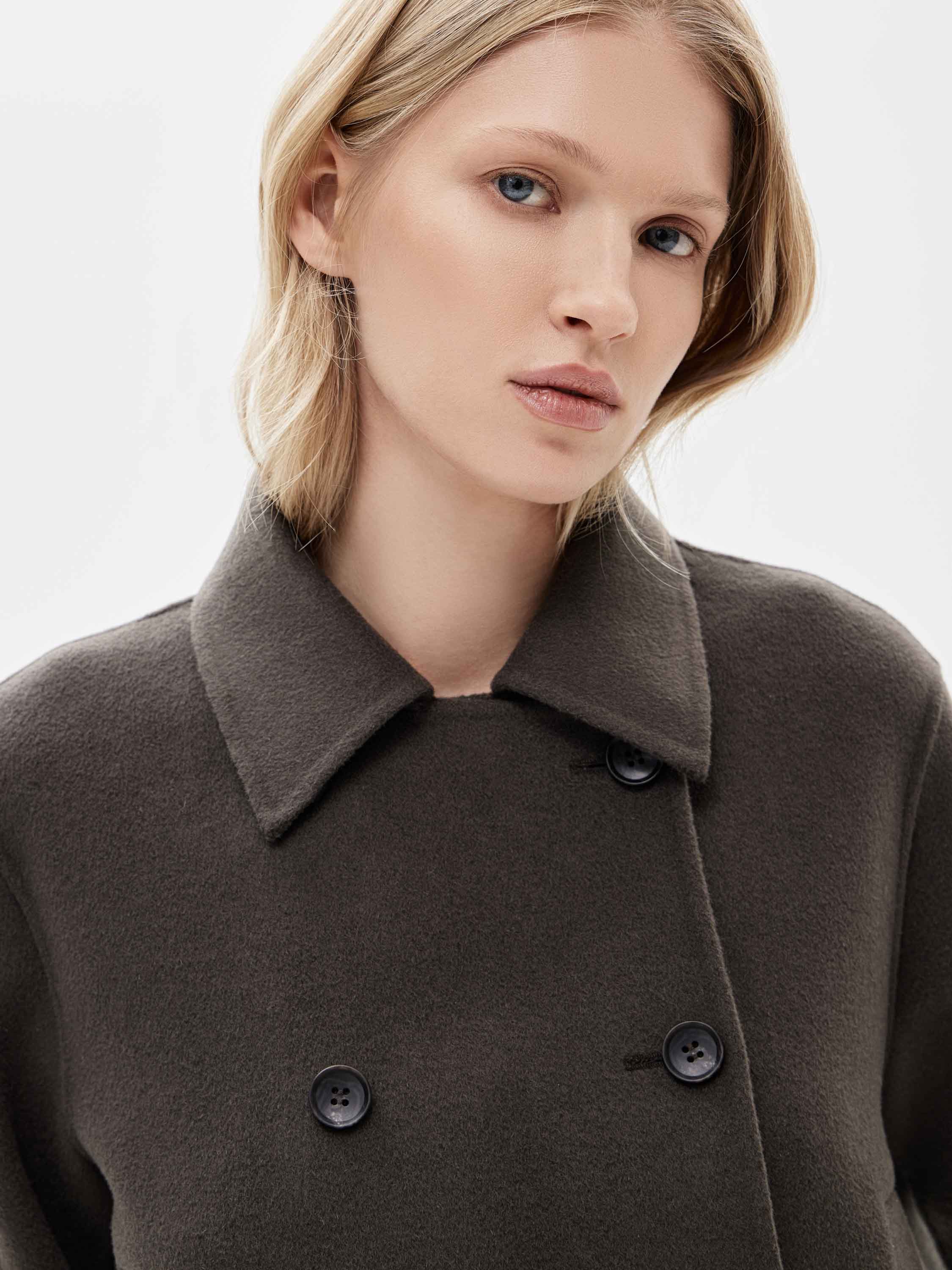 Укороченное пальто, выполненное из плотного смесового полотна на шерстяной основе. Прямой силуэт с мягко выстроенной линиеи плеча создает современную, спокойную геометрию. Двубортная застежка и отложнои воротник не перегружают образ, сохраняя баланс между классикои и актуальной подачей. Функциональные боковые карманы не отвлекают от общего силуэта. Пальто комфортно для межсезонья и прохладных днеи, легко встраивается в городскои ритм. Сложныи темно-оливковый оттенок выглядит глубоко, хорошо сочетается с молочной, бежевой, серой и темной базовои палитрой. Модель одинаково органично смотрится с классическими брюками и юбками, а также в более расслабленных сочетаниях с денимом и трикотажем.