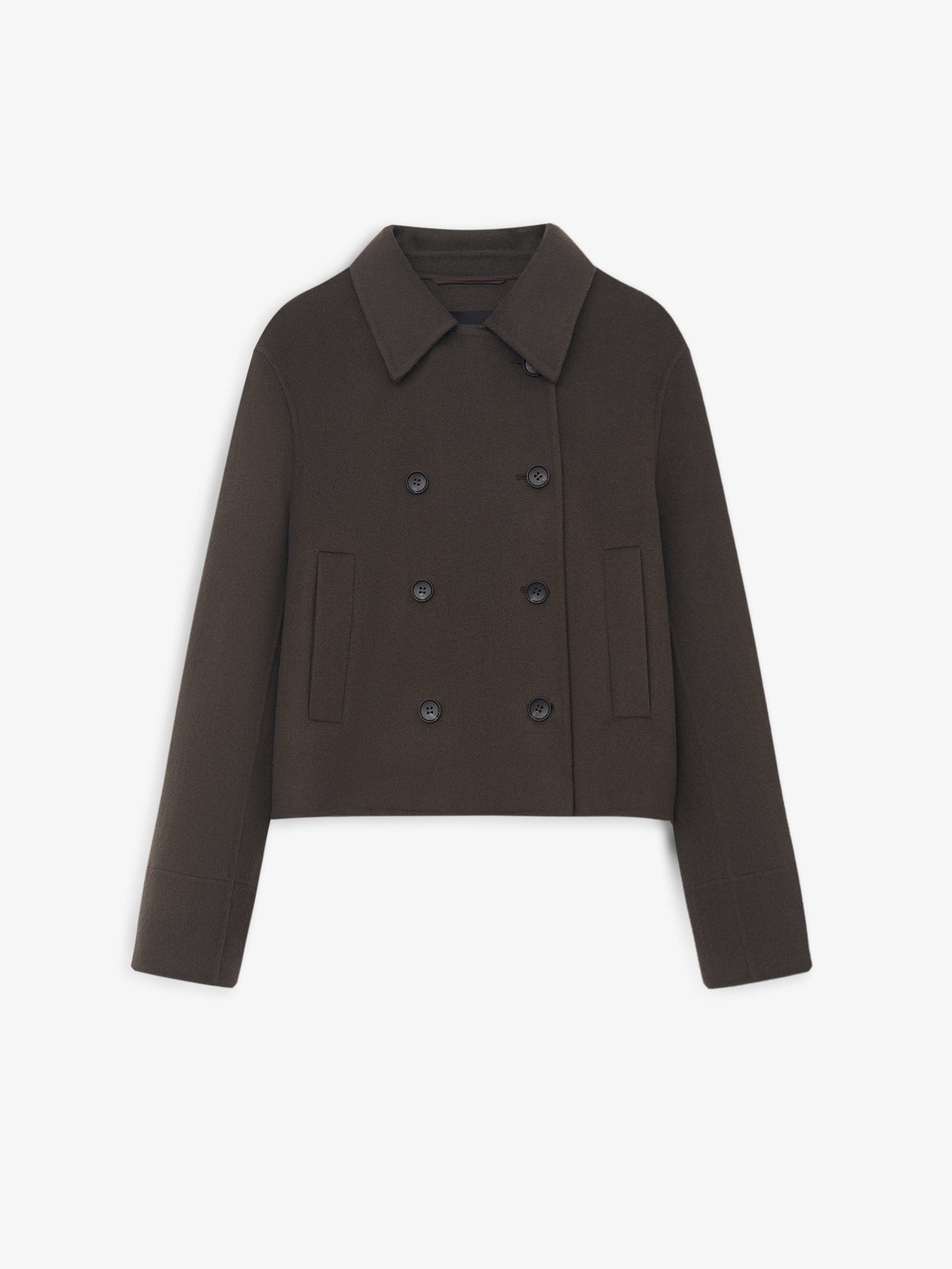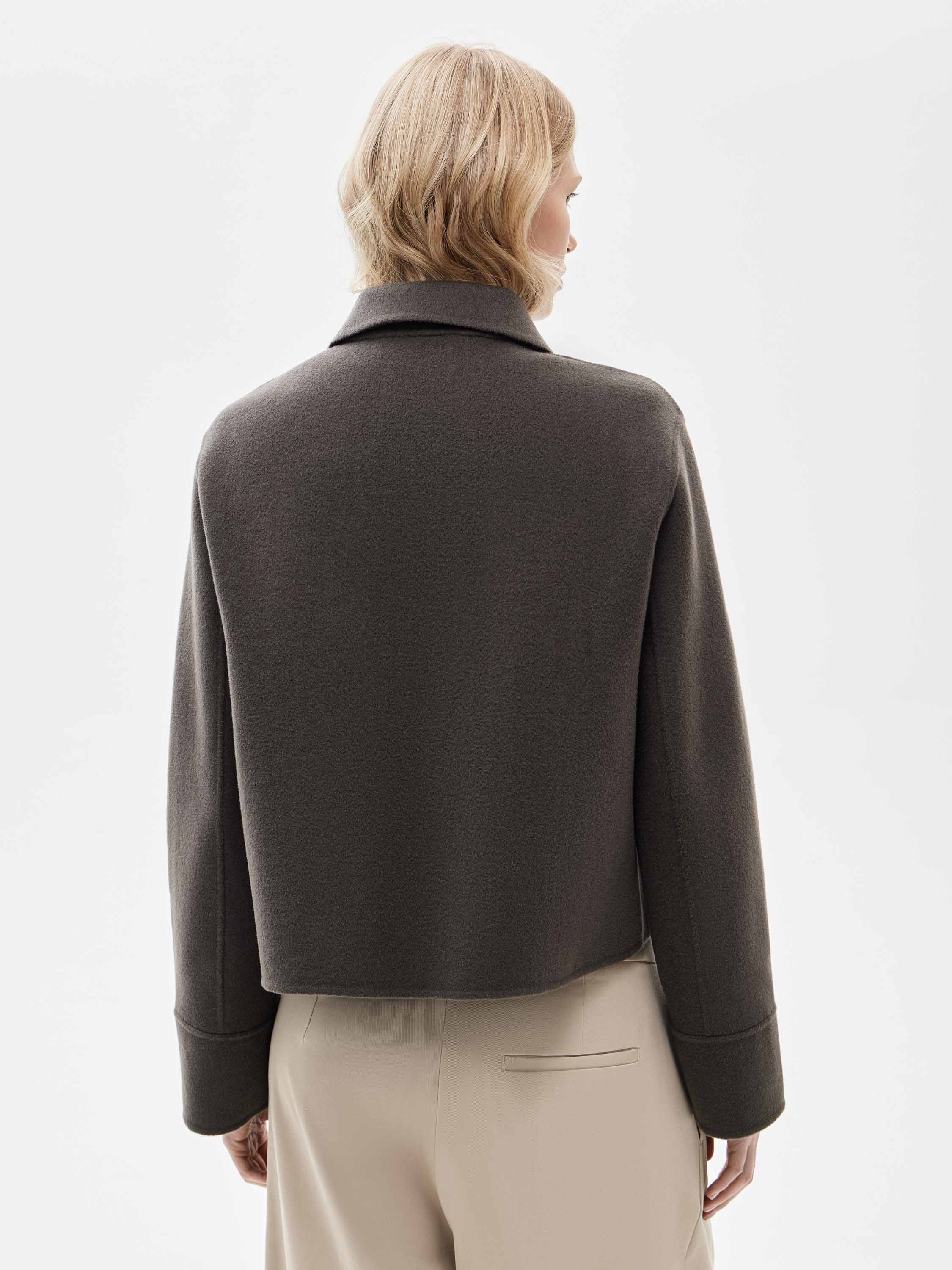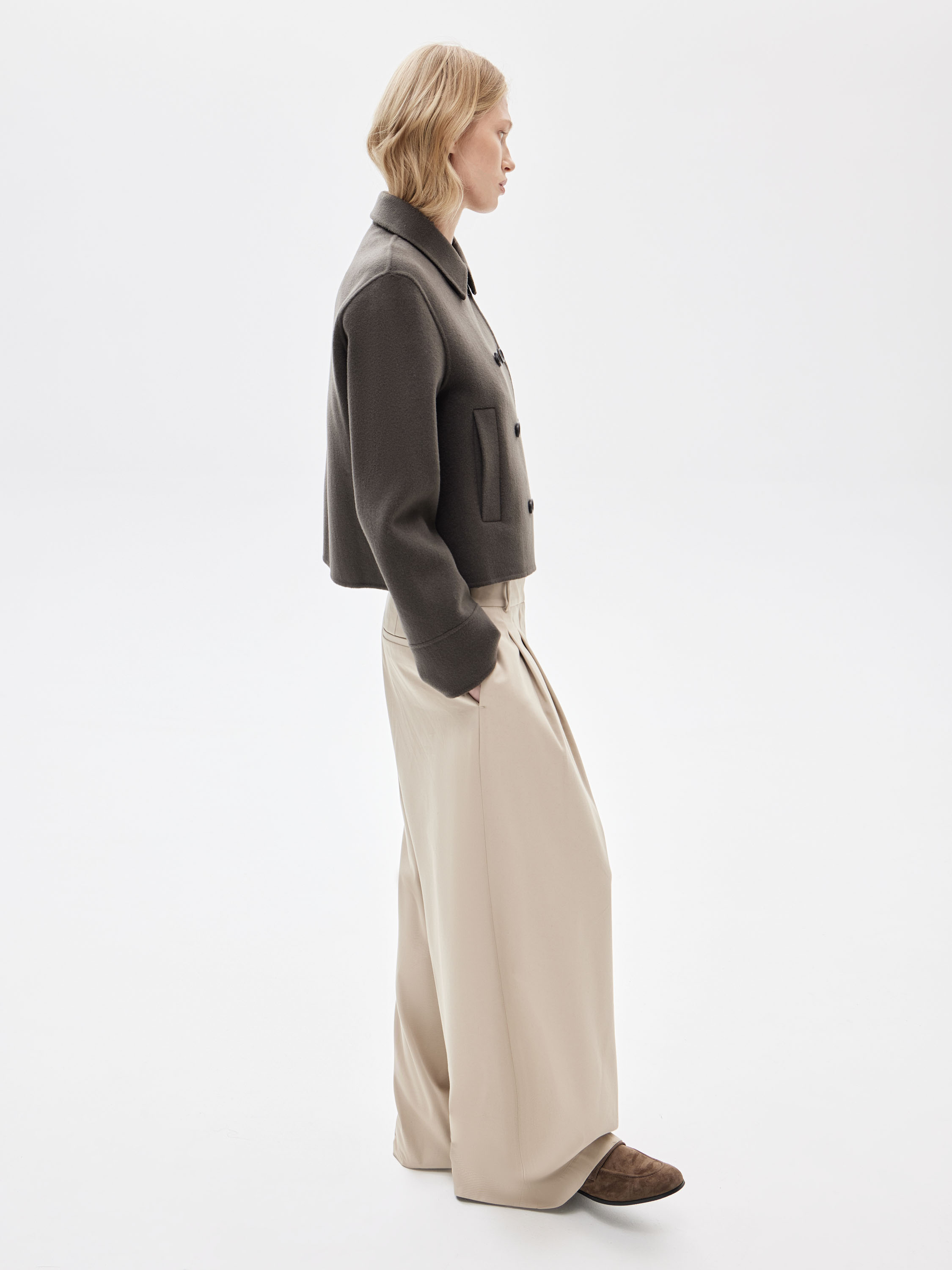 Укороченное пальто, выполненное из плотного смесового полотна на шерстяной основе. Прямой силуэт с мягко выстроенной линиеи плеча создает современную, спокойную геометрию. Двубортная застежка и отложнои воротник не перегружают образ, сохраняя баланс между классикои и актуальной подачей. Функциональные боковые карманы не отвлекают от общего силуэта. Пальто комфортно для межсезонья и прохладных днеи, легко встраивается в городскои ритм. Сложныи темно-оливковый оттенок выглядит глубоко, хорошо сочетается с молочной, бежевой, серой и темной базовои палитрой. Модель одинаково органично смотрится с классическими брюками и юбками, а также в более расслабленных сочетаниях с денимом и трикотажем.
