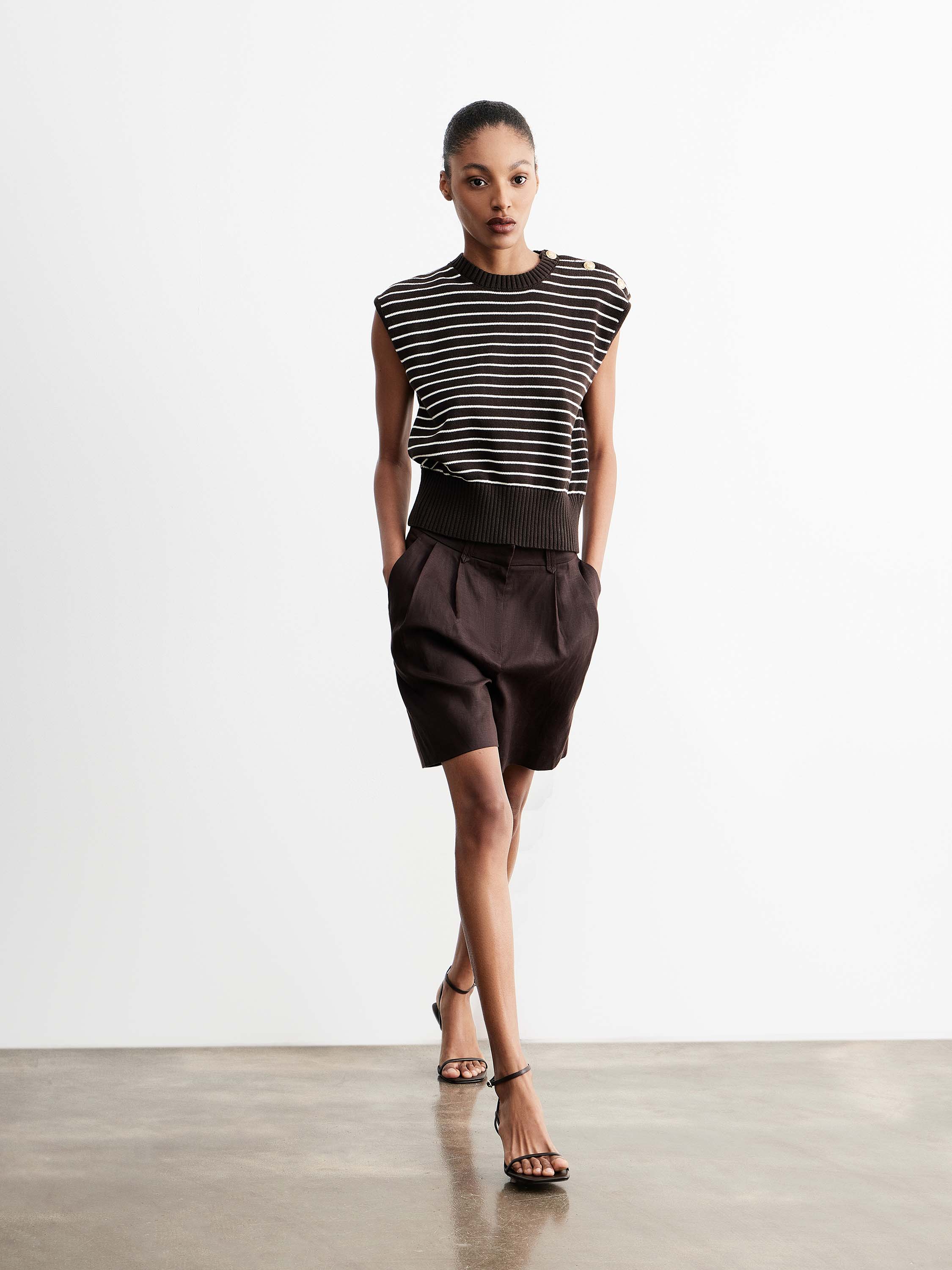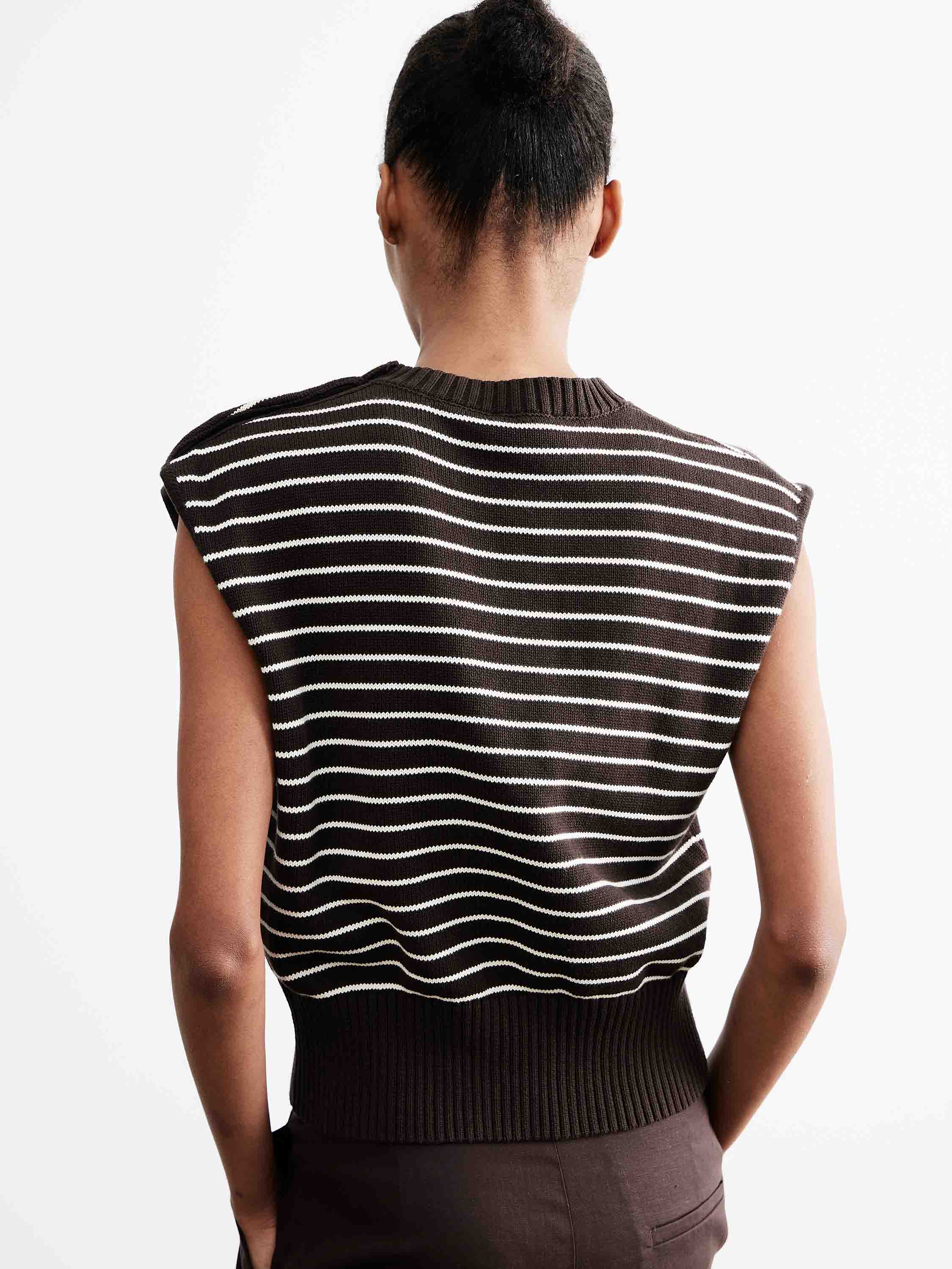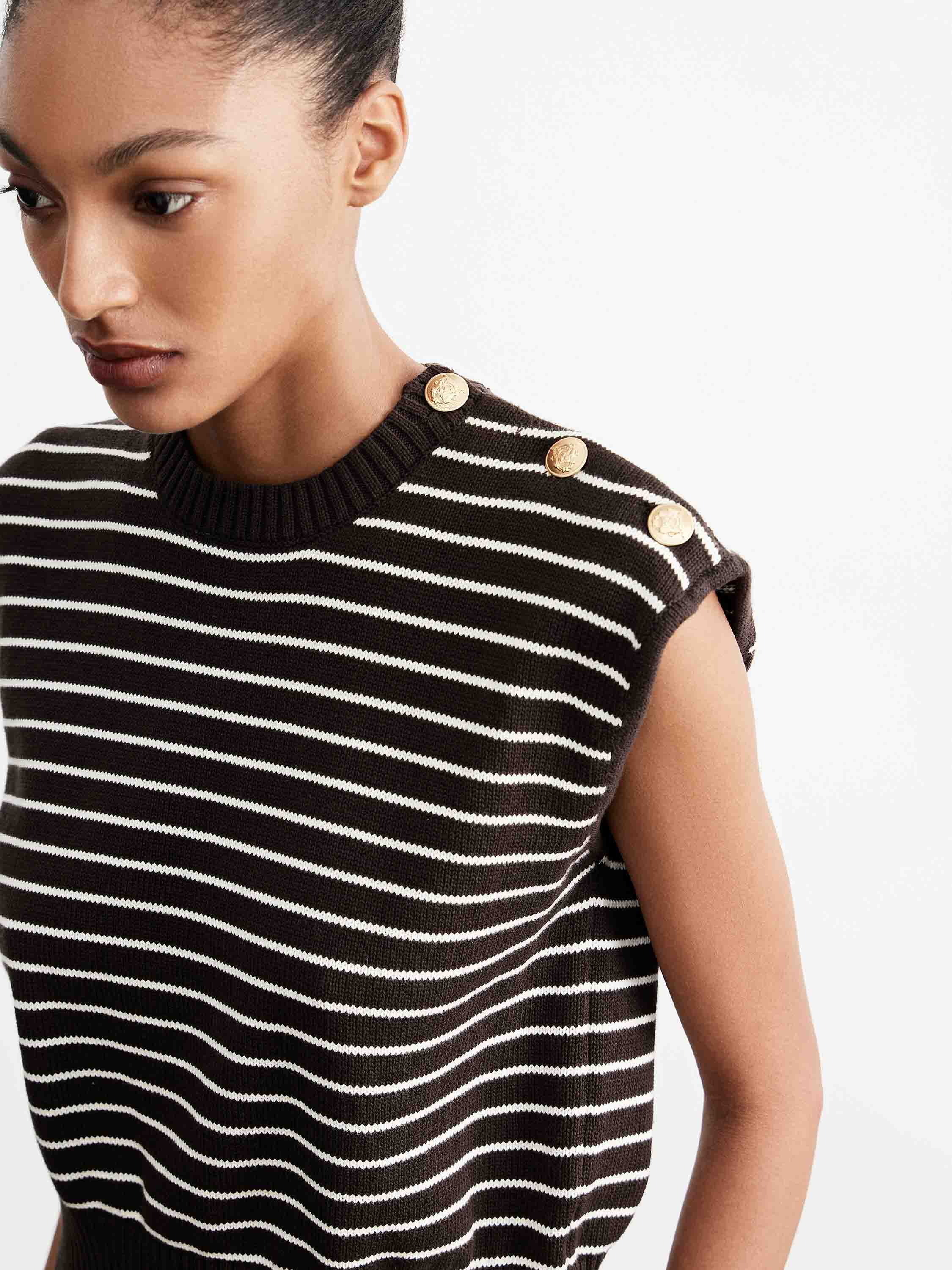 Трикотажный топ без рукавов с прямым силуэтом и четкой линией плеча, выполненный из хлопкового полотна в полоску. Хлопок обеспечивает воздухопроницаемость, комфорт в носке и приятные тактильные ощущения, позволяя коже дышать в течение дня. Модель с округлой горловиной и широкой эластичной планкой по низу формирует аккуратную посадку, а декоративные пуговицы на плече добавляют графичный акцент. Контрастная полоска подчеркивает ритм силуэта и делает изделие выразительным, при этом топ легко сочетается с шортами, брюками или юбками в базовой палитре.