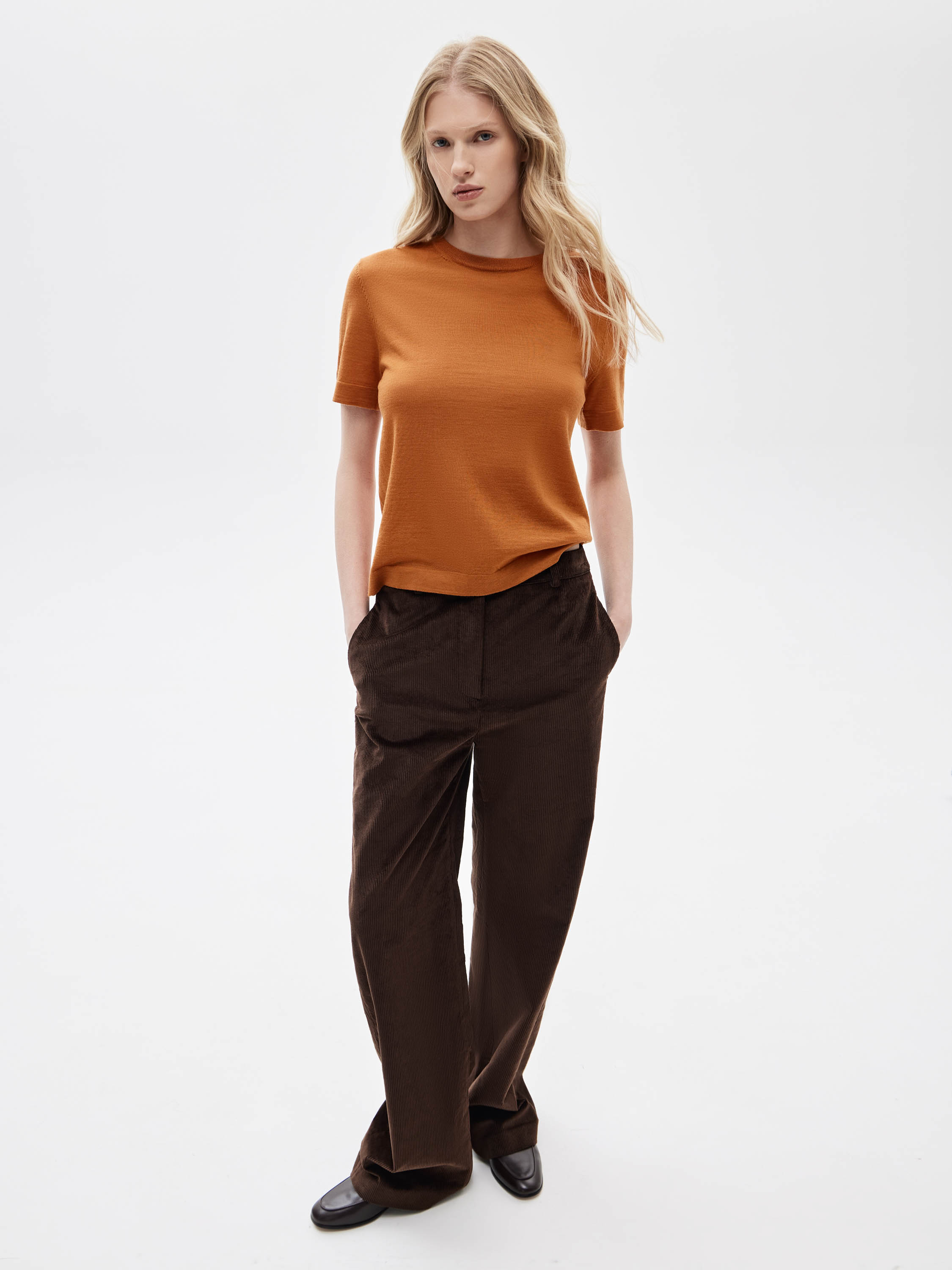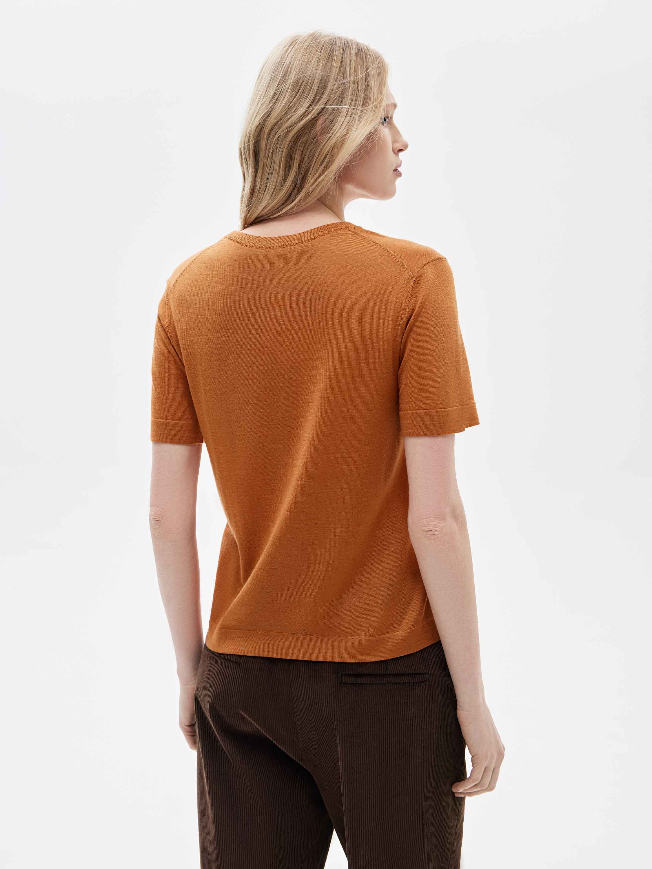 Трикотажный топ выполнен из смесового полотна на основе шерсти с ровной, гладкой поверхностью и мягким ощущением при контакте с кожей. Материал пластичный, комфортный в носке, хорошо держит форму и подходит для межсезонного гардероба. Прямой силуэт без избыточного объема создает сбалансированную посадку и сохраняет четкость линий изделия. Короткий рукав и лаконичный круглый вырез подчеркивают минималистичный характер модели. Оттенок раскрыт в теплой терракотовой гамме, которая выглядит глубоко и выразительно и легко сочетается с коричневой, молочной и айвори палитрой, а также с темными базовыми оттенками. Топ органично вписывается в повседневный гардероб и подходит для носки соло и для многослойных сочетаний с жакетами и верхним трикотажем.