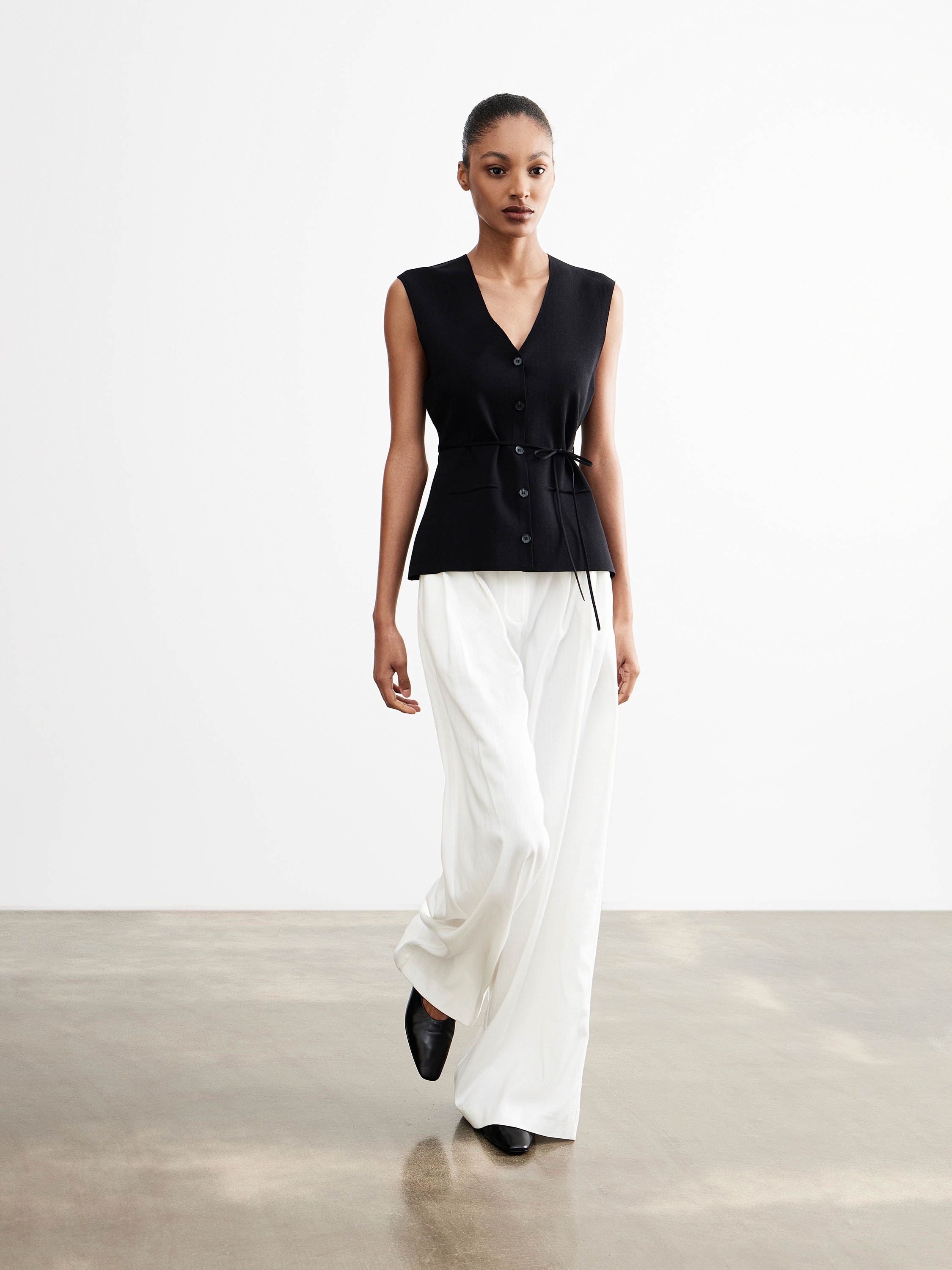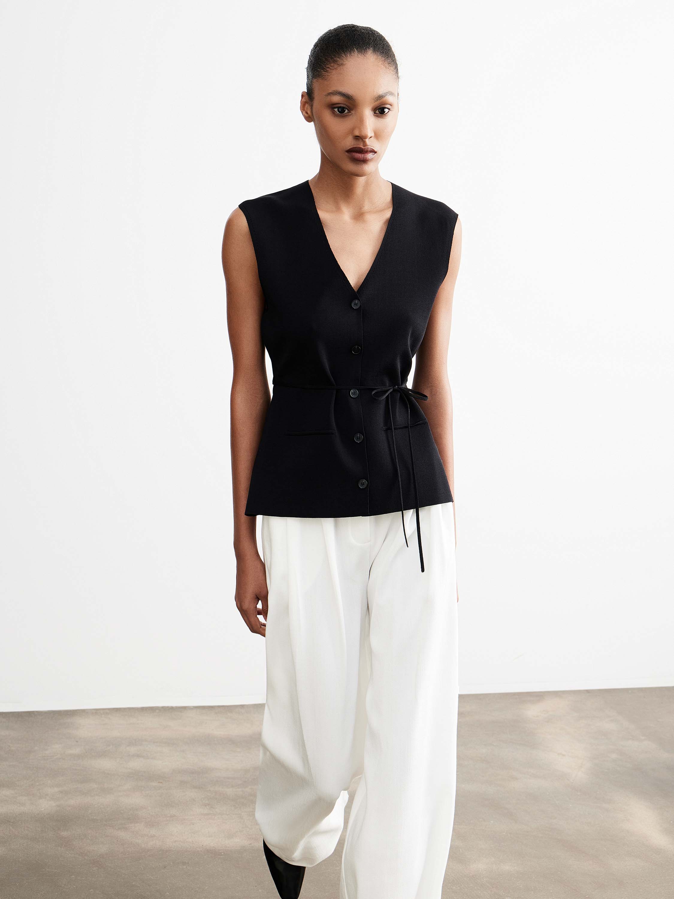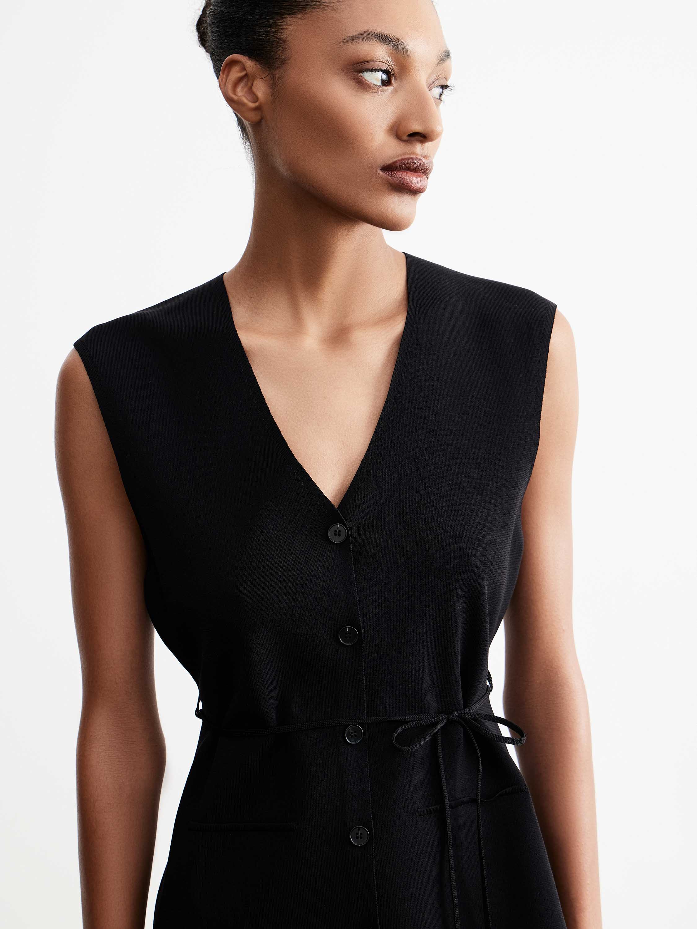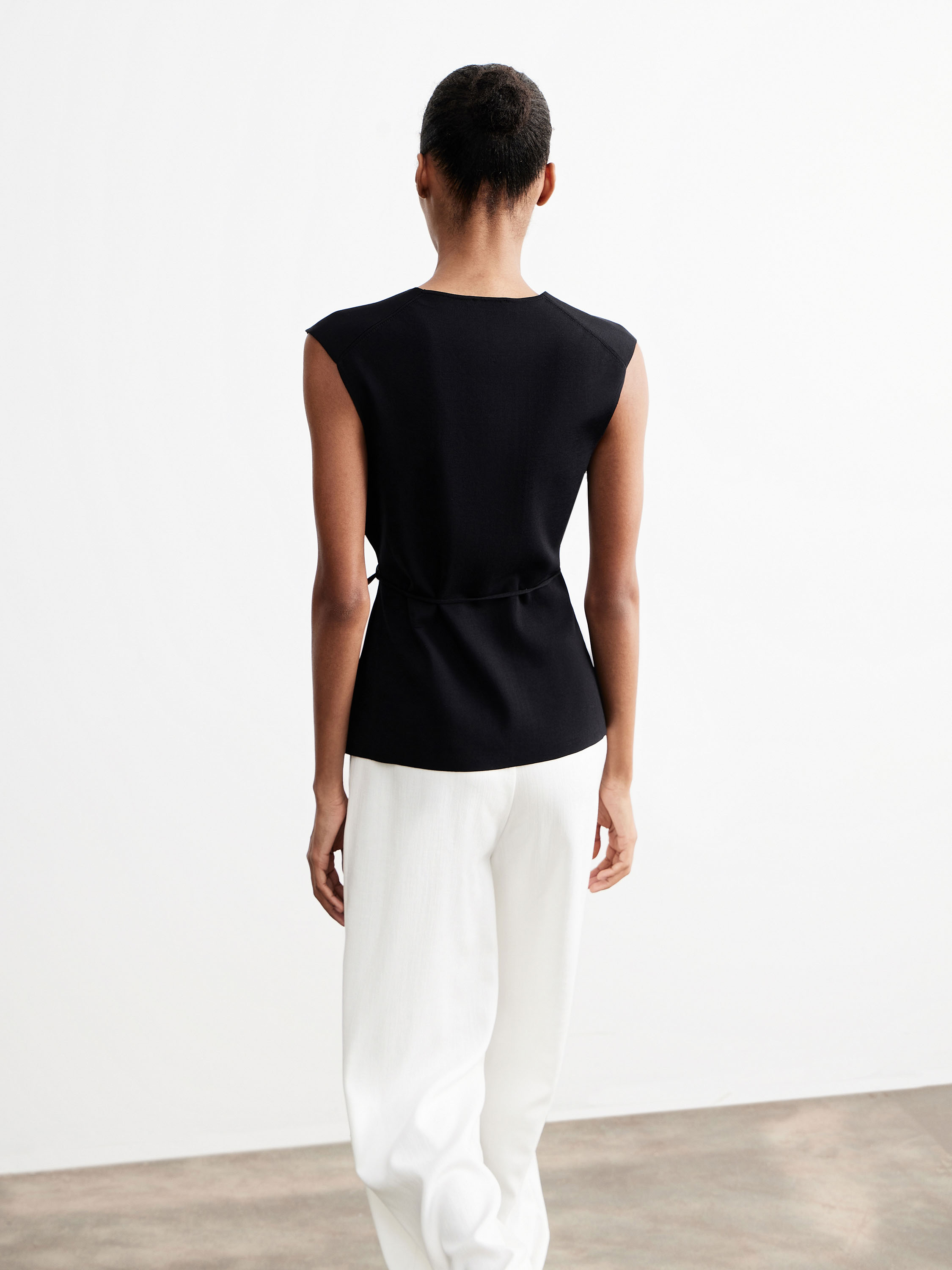 Трикотажный топ без рукавов с приталенным силуэтом и четкой линией плеча, выполненный из смесового трикотажа на основе вискозы. Материал мягкий, пластичный и комфортный к телу, хорошо пропускает воздух и держит форму за счет добавления синтетического волокна. Модель с V-образным вырезом и застежкой на пуговицы формирует аккуратную линию декольте, а тонкий пояс подчеркивает талию и позволяет варьировать посадку. Лаконичные карманы и выверенная длина усиливают пропорции, делая силуэт собранным. Глубокий черный оттенок делает топ универсальным: он сочетается как с брюками и юбками, так и с более строгими элементами гардероба.