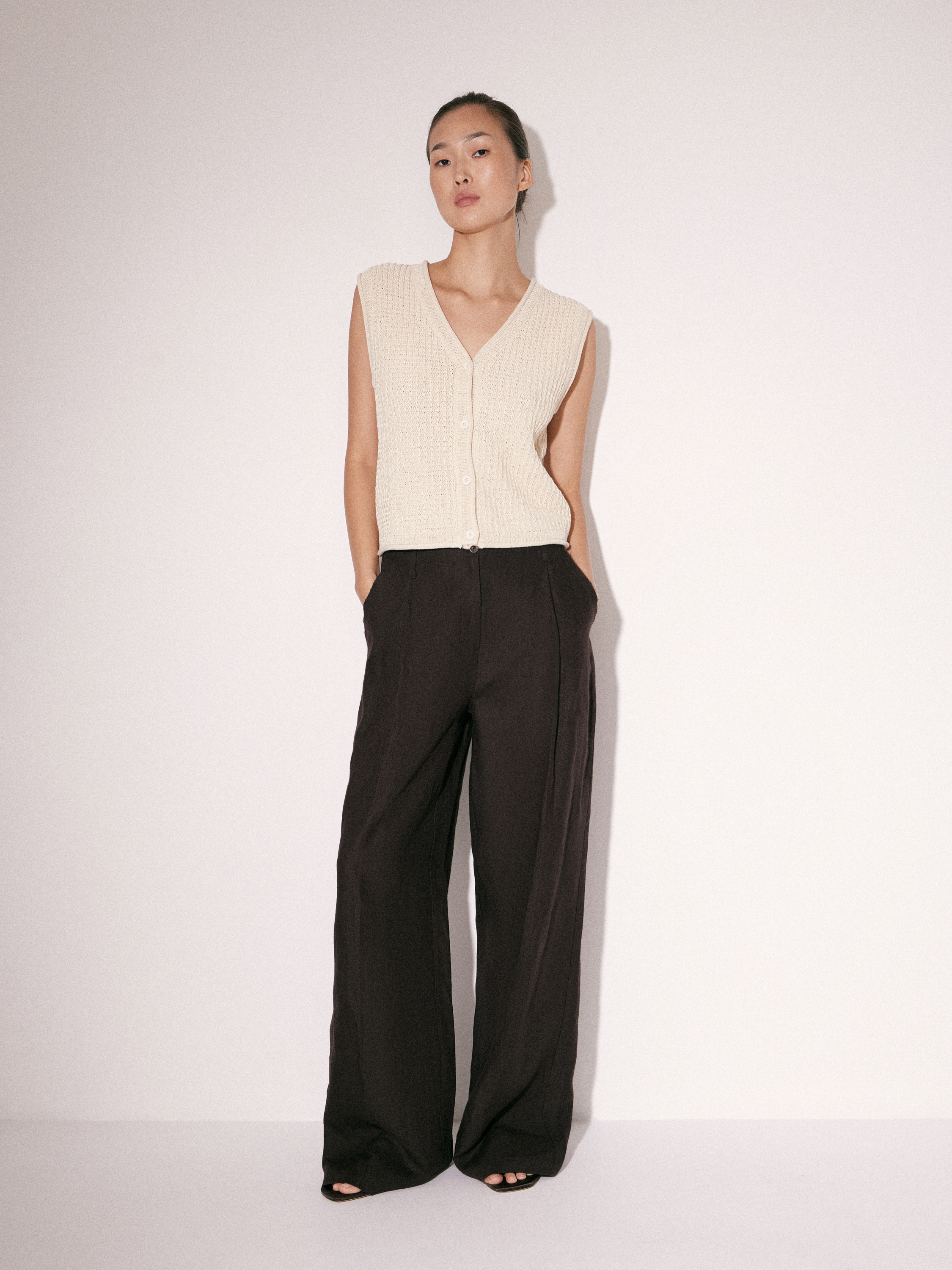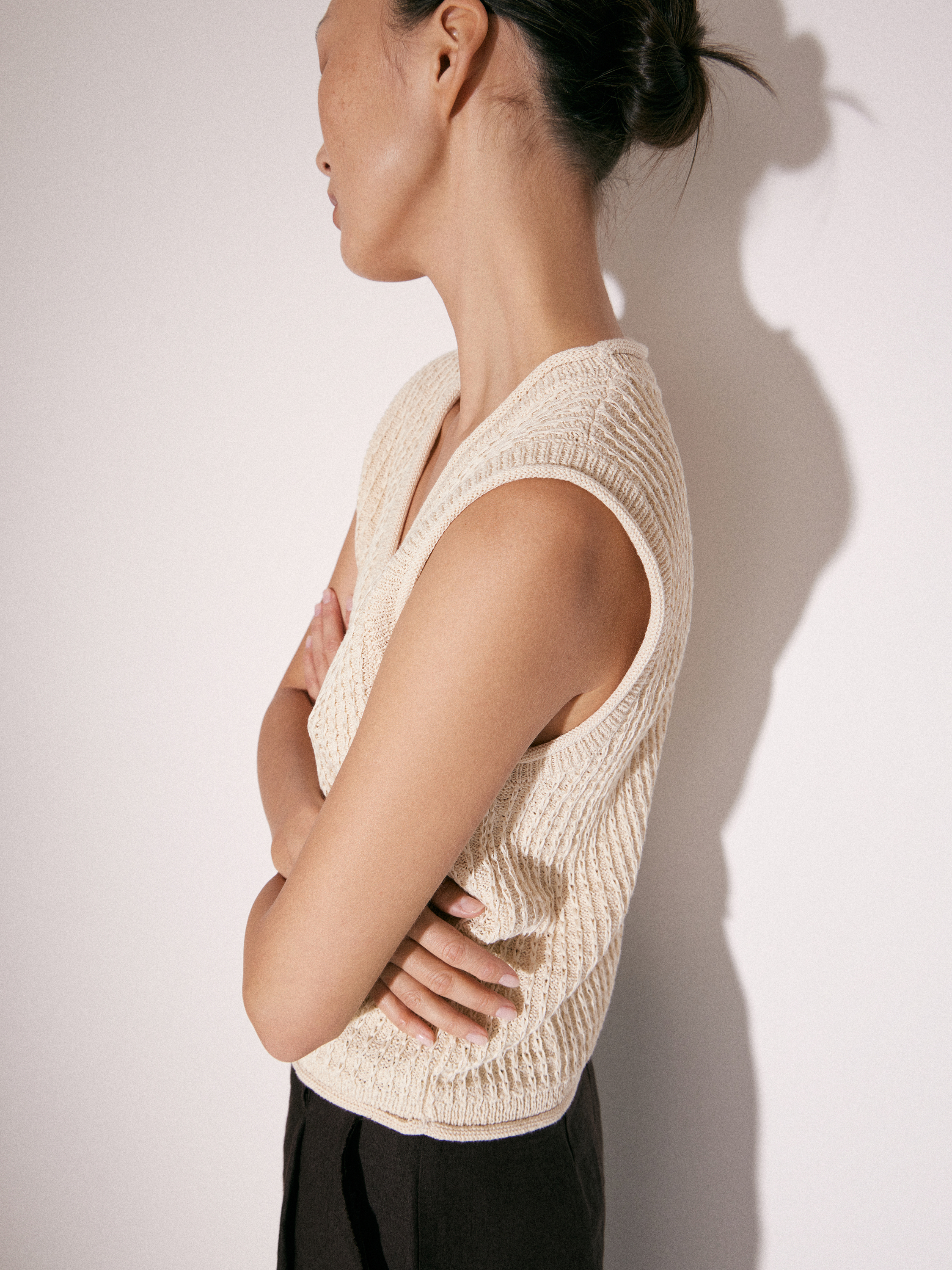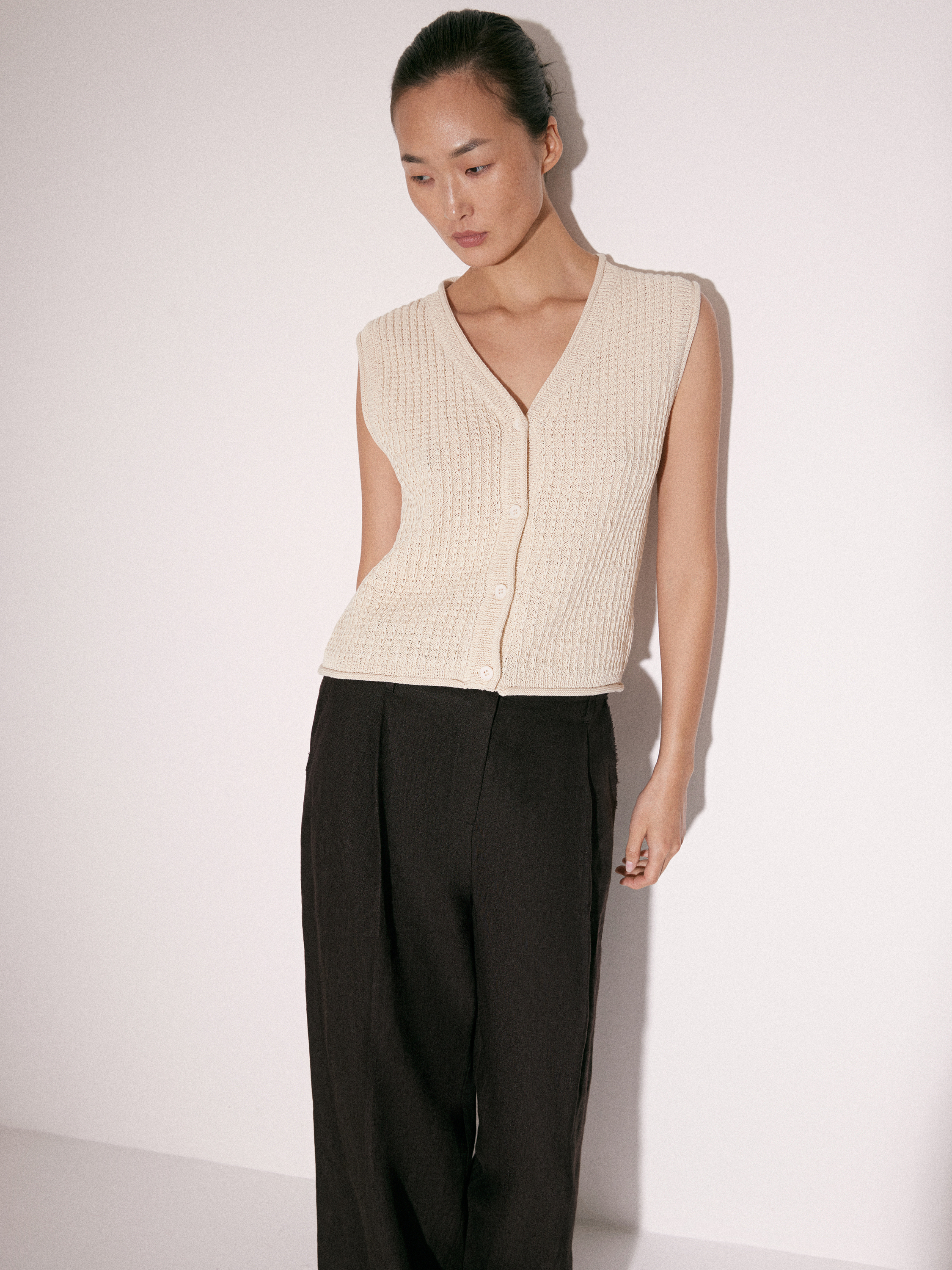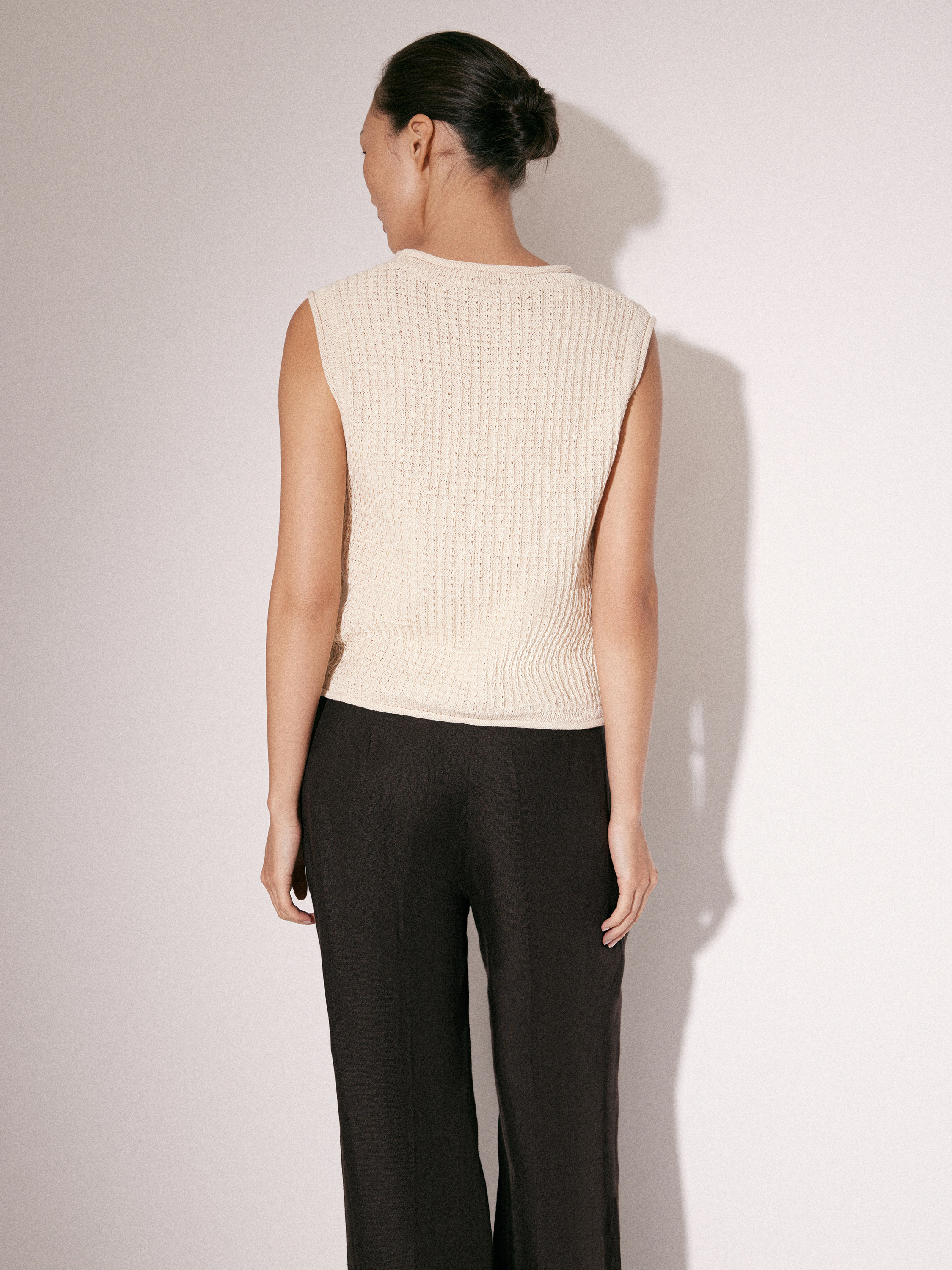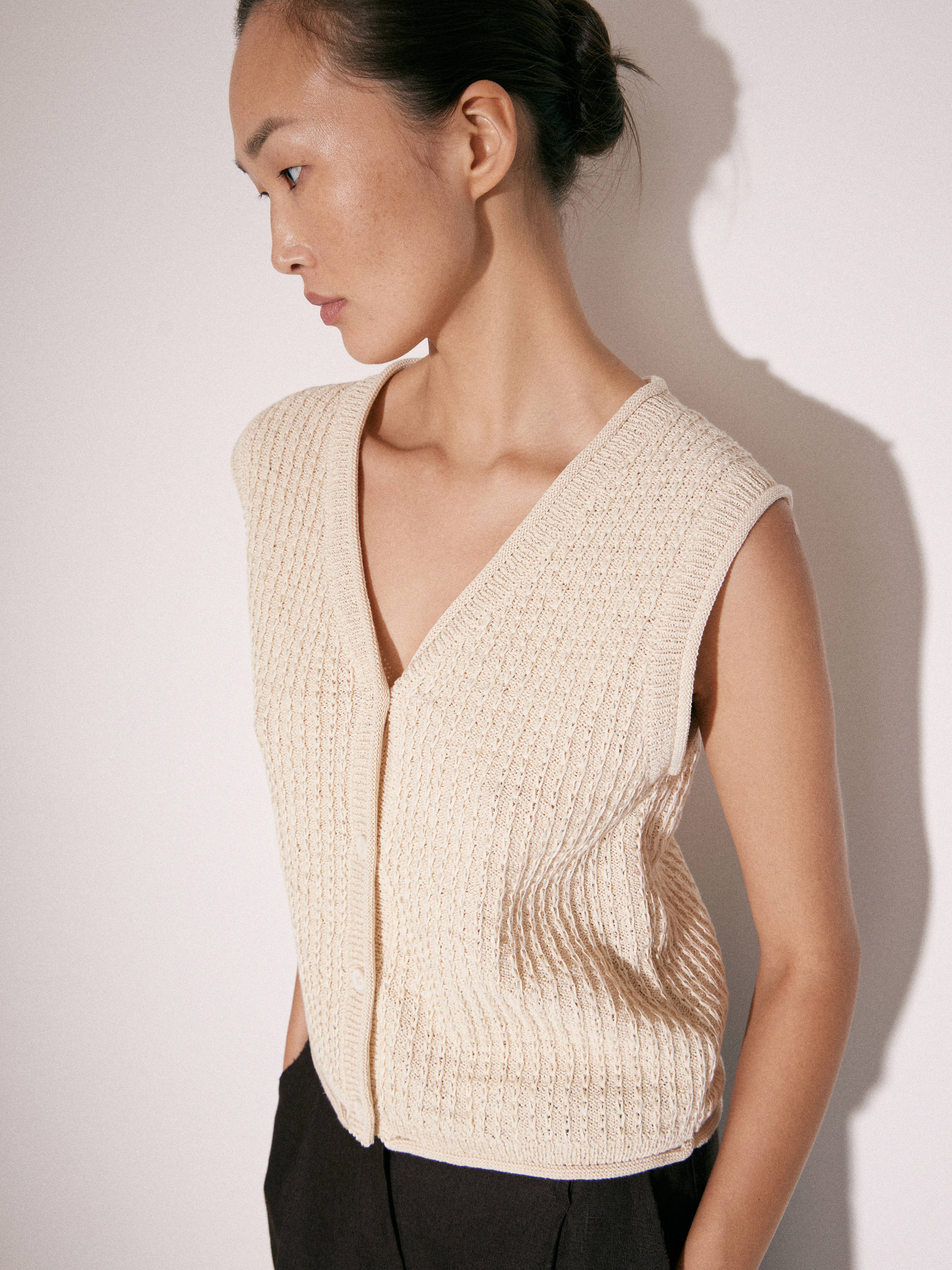 Трикотажный топ без рукавов в светлом молочном оттенке с V-образным вырезом. Выполнен из смесового трикотажа на основе хлопка с выраженной фактурной вязкой, за счет которой поверхность выглядит рельефной и структурной. Силуэт аккуратно прилегающий, с мягкой посадкой по фигуре. Центральная застежка на небольшие пуговицы формирует вертикаль и визуально вытягивает линию корпуса. Проймы и линия горловины обработаны тонко, без утолщений, что сохраняет чистоту формы. Топ сочетается с классическими брюками, денимом и юбками, вписывается в повседневный гардероб.