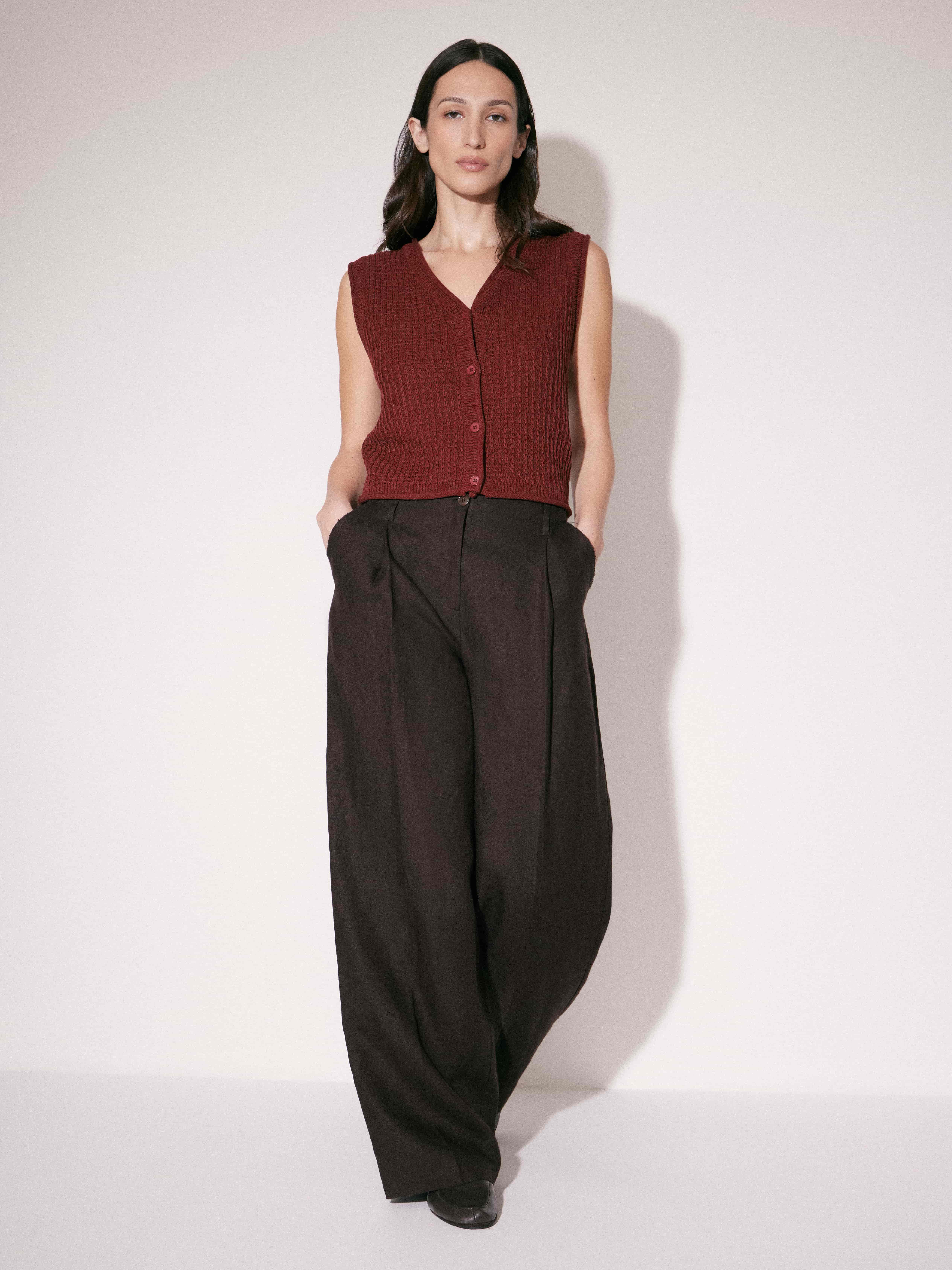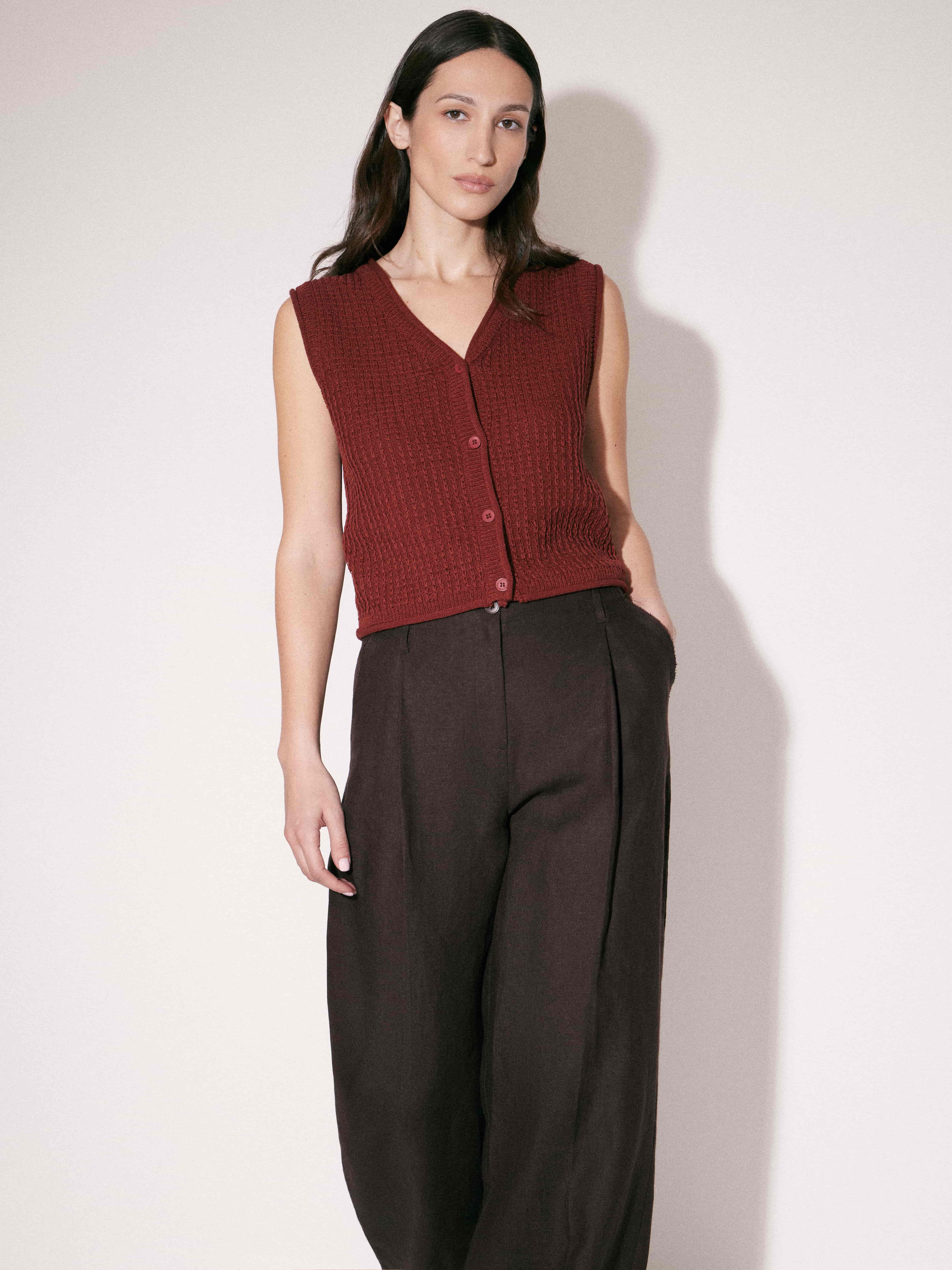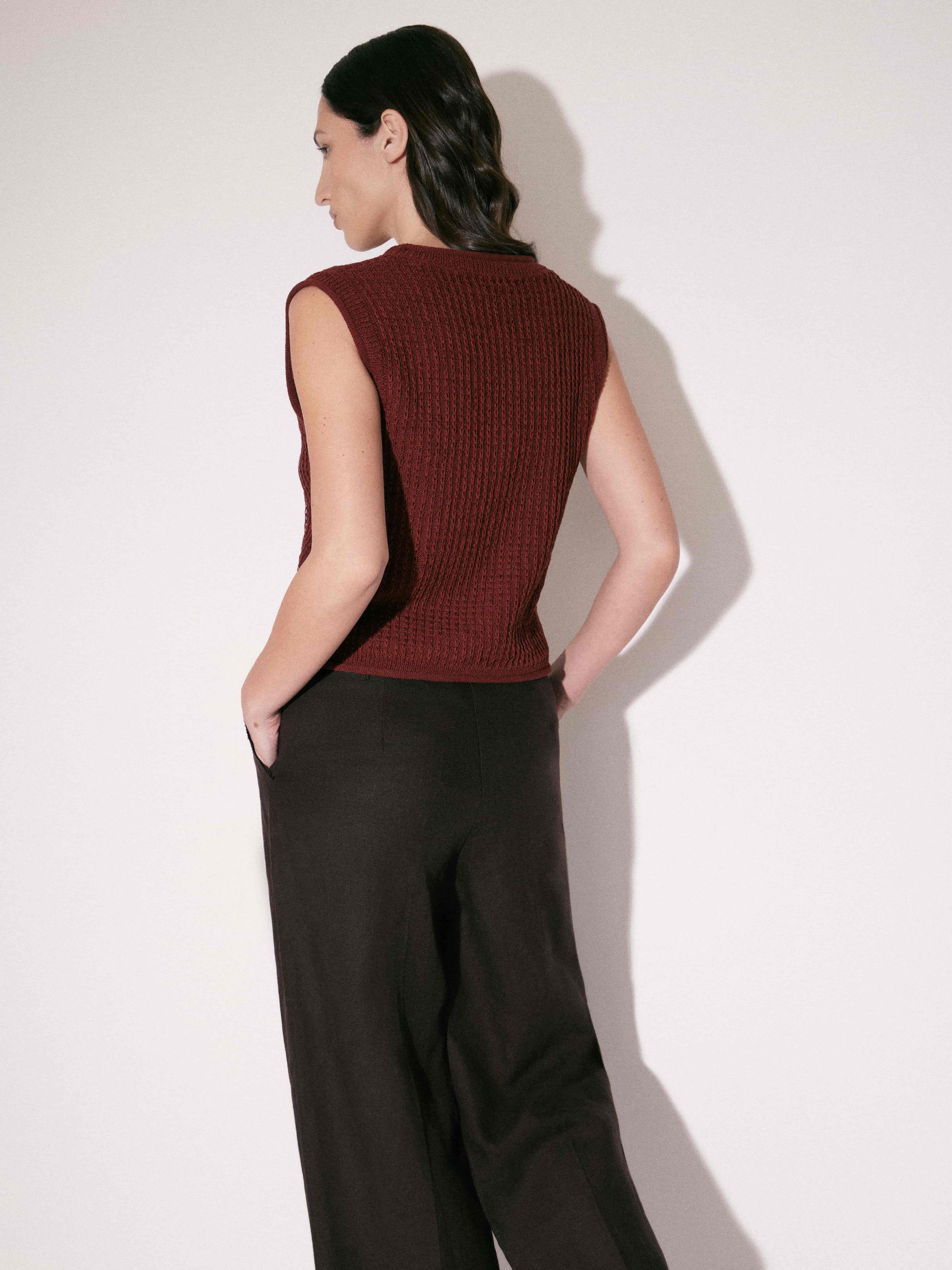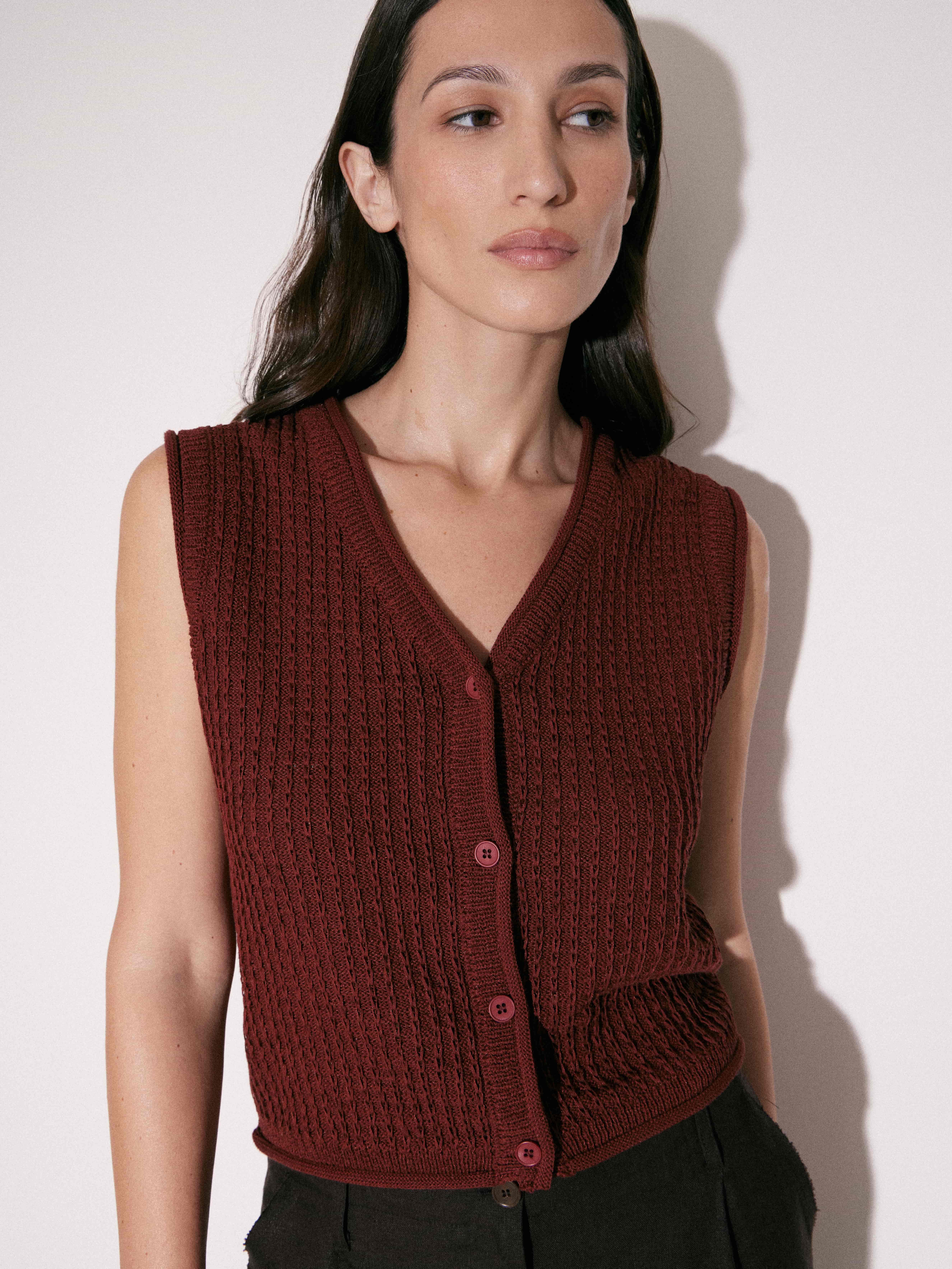 Трикотажный топ без рукавов в светлом молочном оттенке с V-образным вырезом. Выполнен из смесового трикотажа на основе хлопка с выраженной фактурной вязкой, за счет которой поверхность выглядит рельефной и структурной. Силуэт аккуратно прилегающий, с мягкой посадкой по фигуре. Центральная застежка на небольшие пуговицы формирует вертикаль и визуально вытягивает линию корпуса. Проймы и линия горловины обработаны тонко, без утолщений, что сохраняет чистоту формы. Топ сочетается с классическими брюками, денимом и юбками, вписывается в повседневный гардероб.