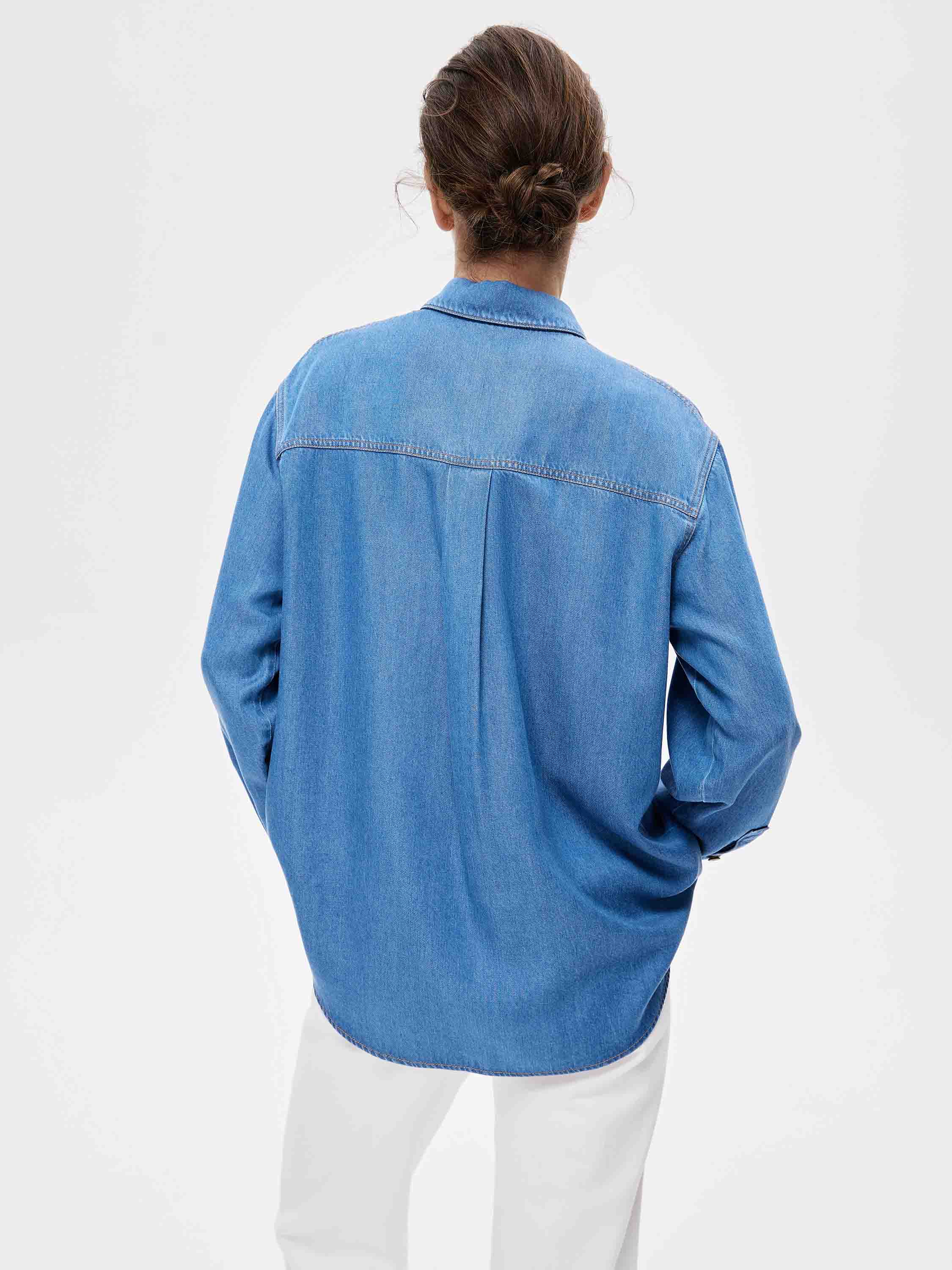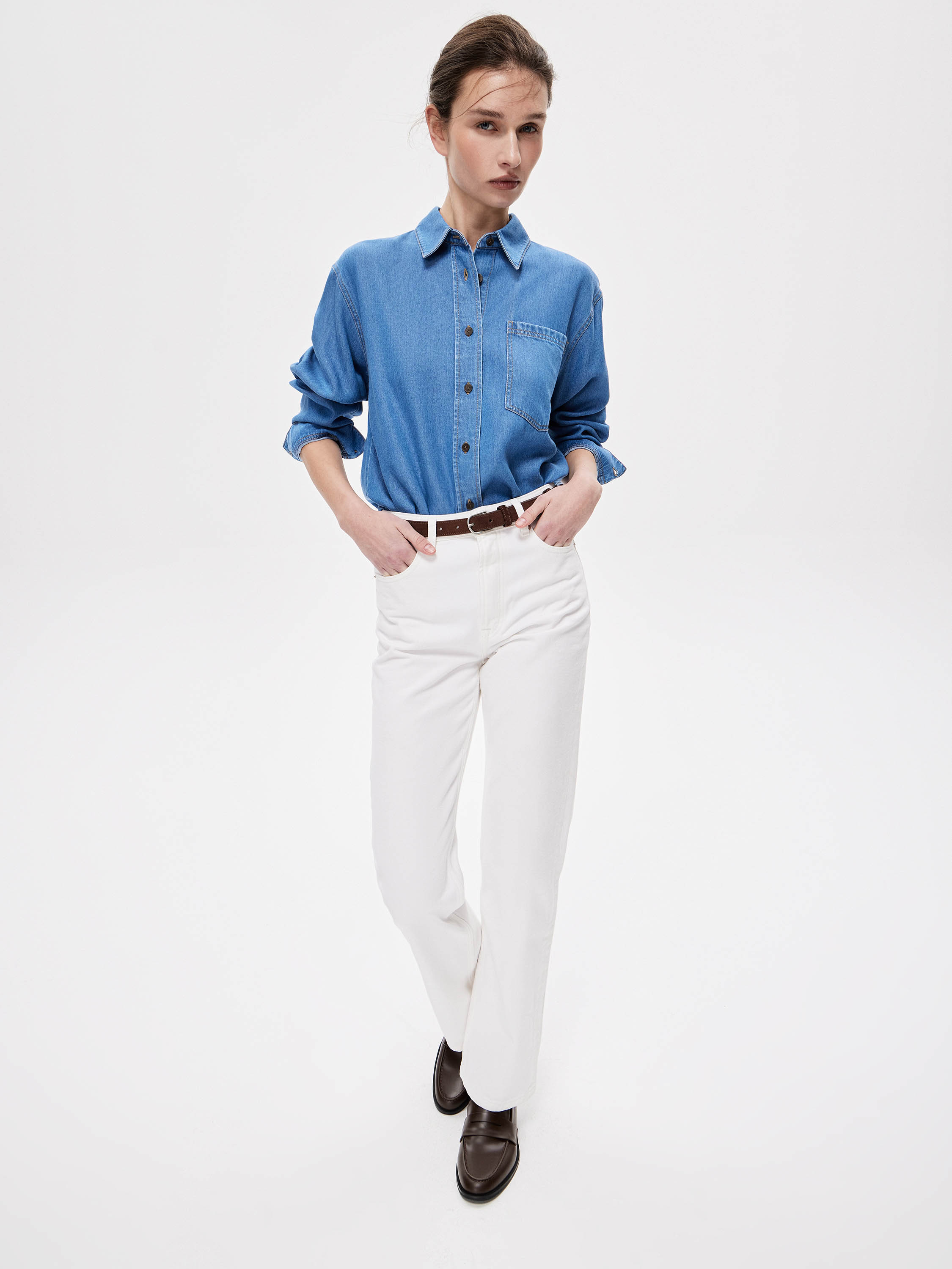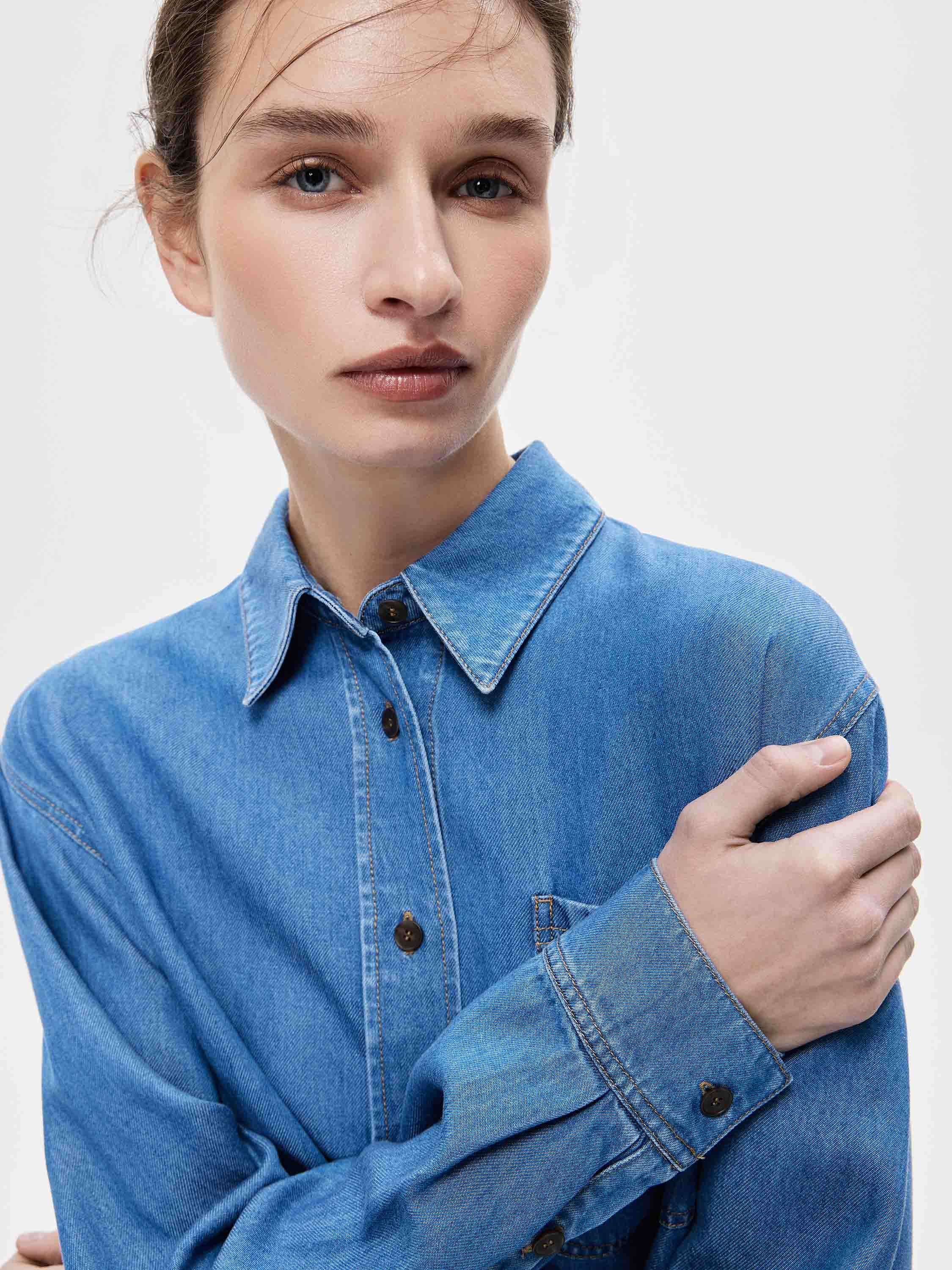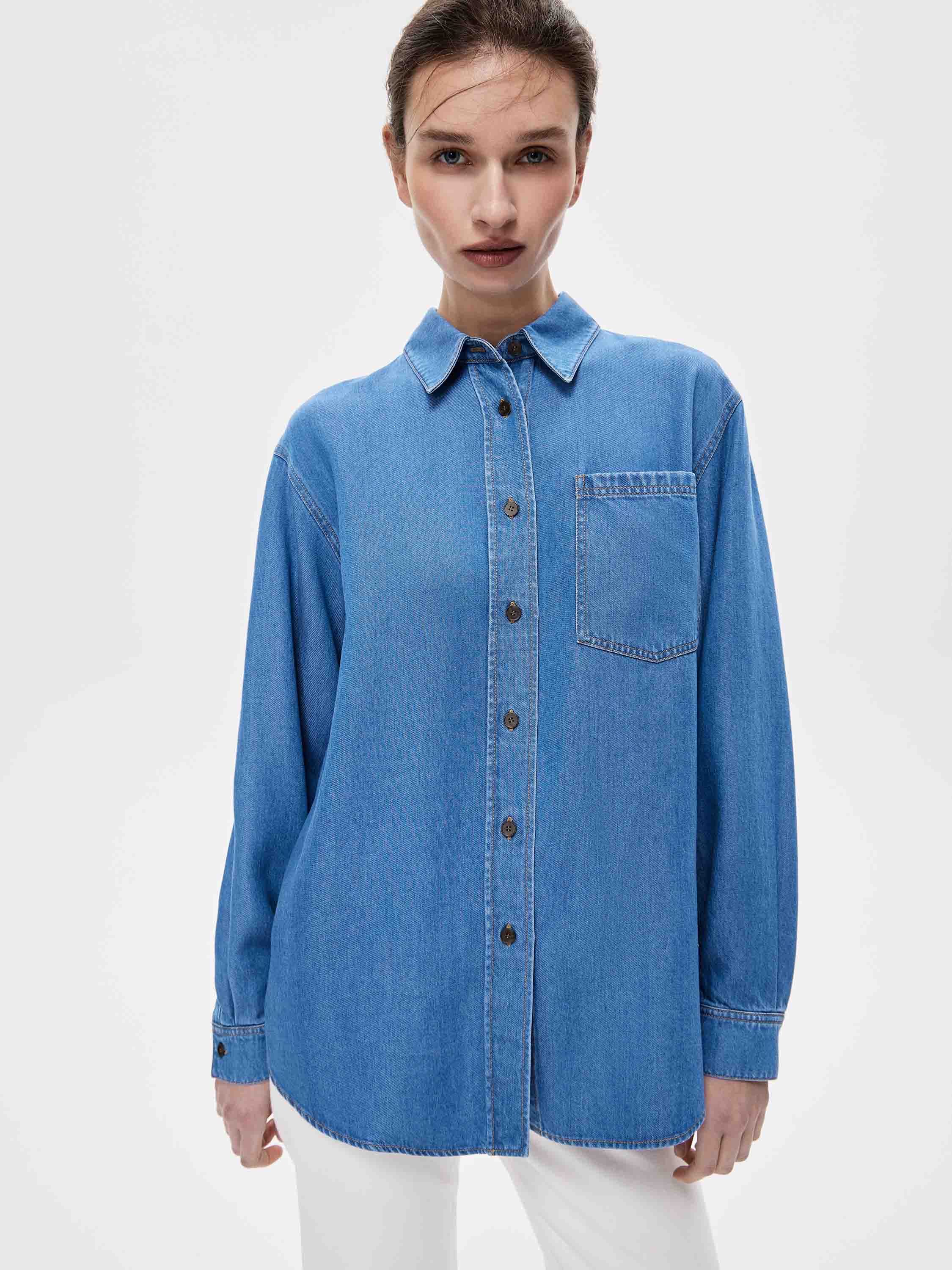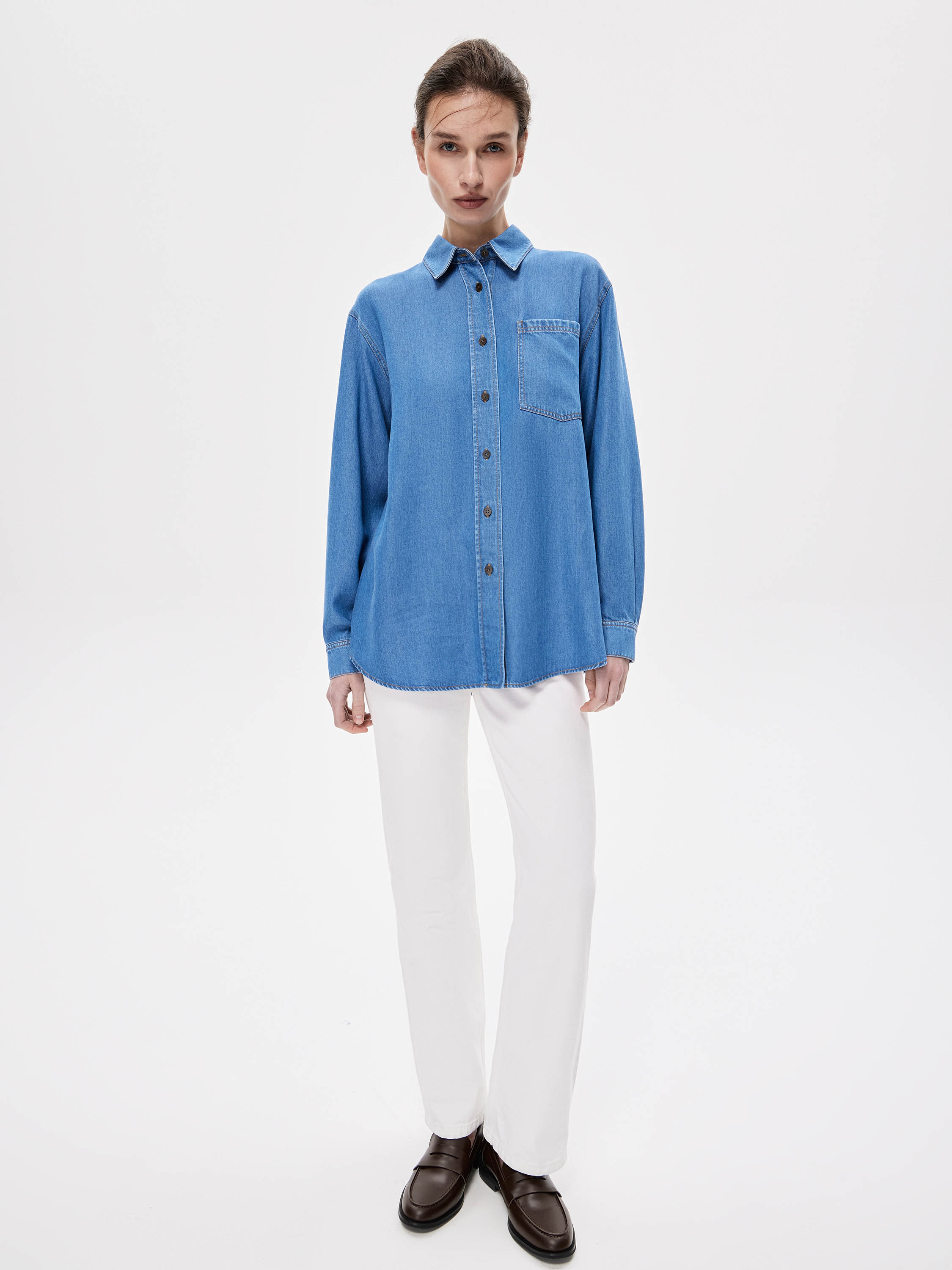 Рубашка свободного силуэта выполнена из мягкого денима на основе хлопка. Материал пластичный и комфортный в носке, благодаря чему модель выглядит расслабленно и хорошо держит форму. Классический отложной воротник, центральная застежка на пуговицы и накладной нагрудный карман подчеркивают лаконичный характер модели. Линия плеча слегка спущена, а удлиненный крой формирует более свободную посадку. Светло-голубой оттенок денима делает рубашку универсальной и позволяет сочетать ее с базовыми элементами гардероба.