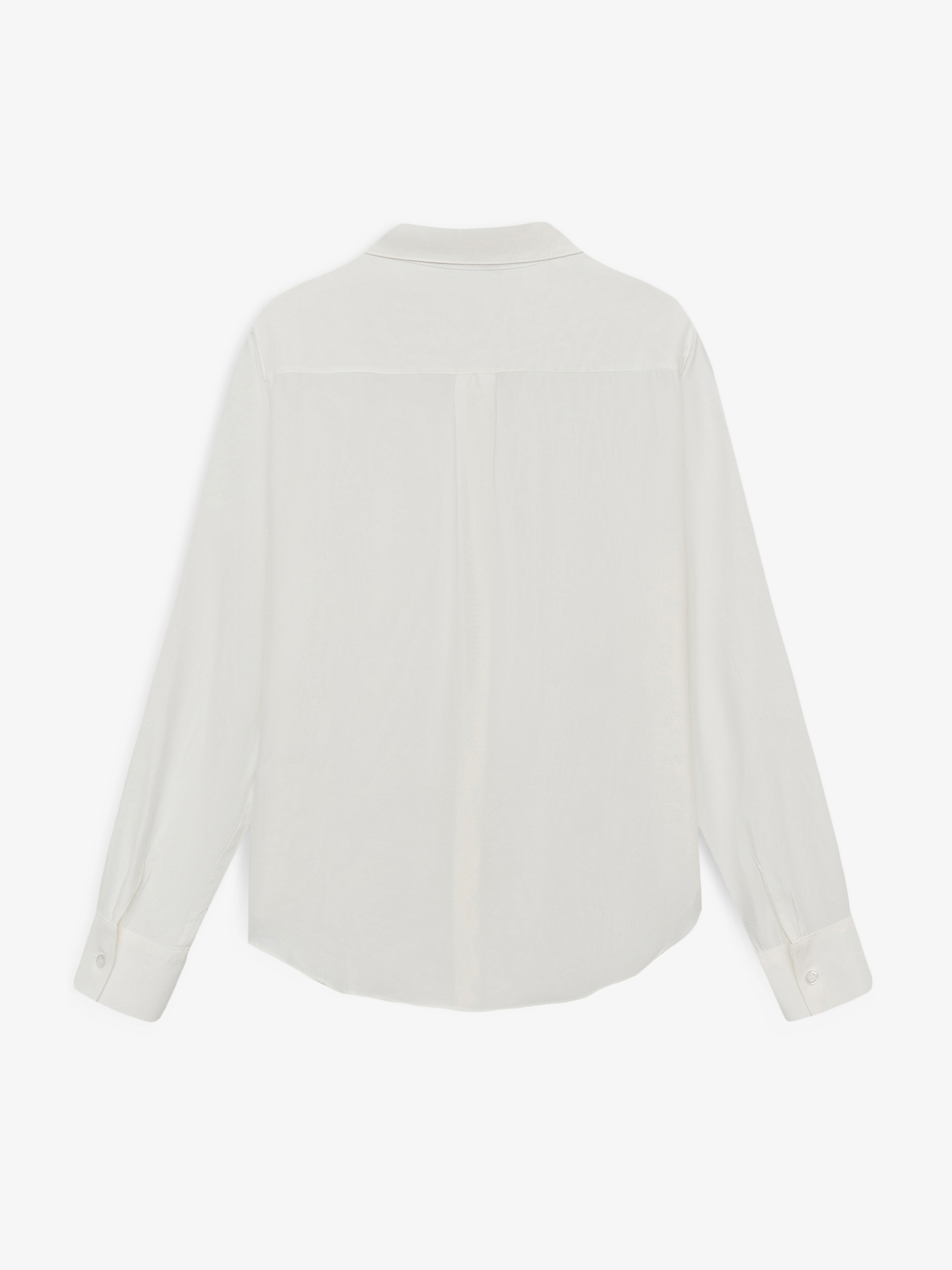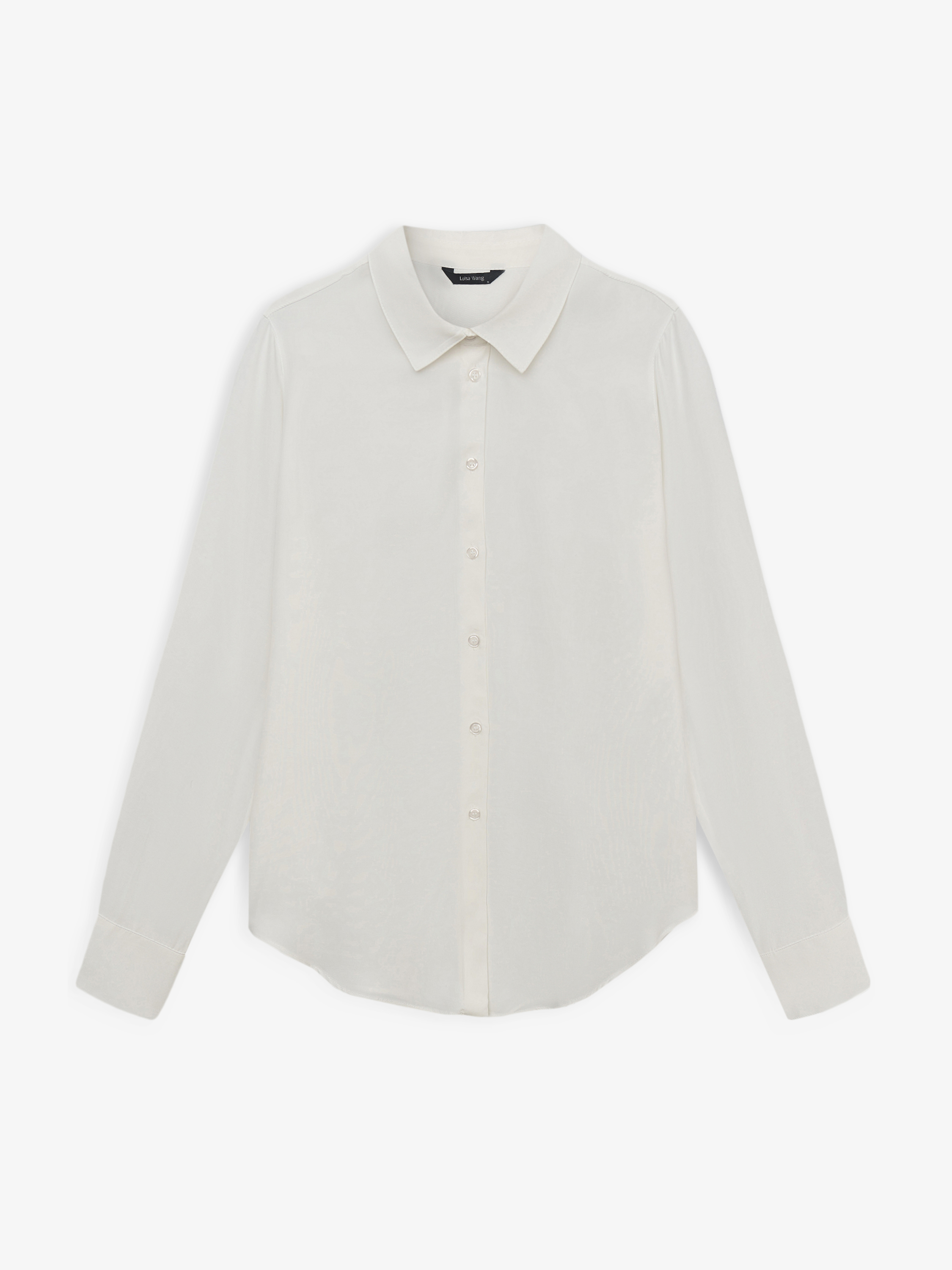 Рубашка выполнена из полотна с гладкой, текучей поверхностью и мягкой пластикой. Материал хорошо пропускает воздух, приятно ощущается на коже и дает ткани плавное движение, за счет чего изделие выглядит легким и выразительным в носке. Силуэт прямой, без избыточного объема, с аккуратной линией плеч и классическим отложным воротником. Центральная застежка на пуговицы поддерживает лаконичную геометрию модели, манжеты оформлены сдержанно и не утяжеляют общий контур. Оттенок — светло-голубой, свежий и деликатный, гармонично сочетающийся с коричневой, молочной, айвори и темной базовой палитрой. Рубашка подходит для стилизации с брюками, юбками и трикотажем, органично вписываясь в повседневный и рабочий гардероб.