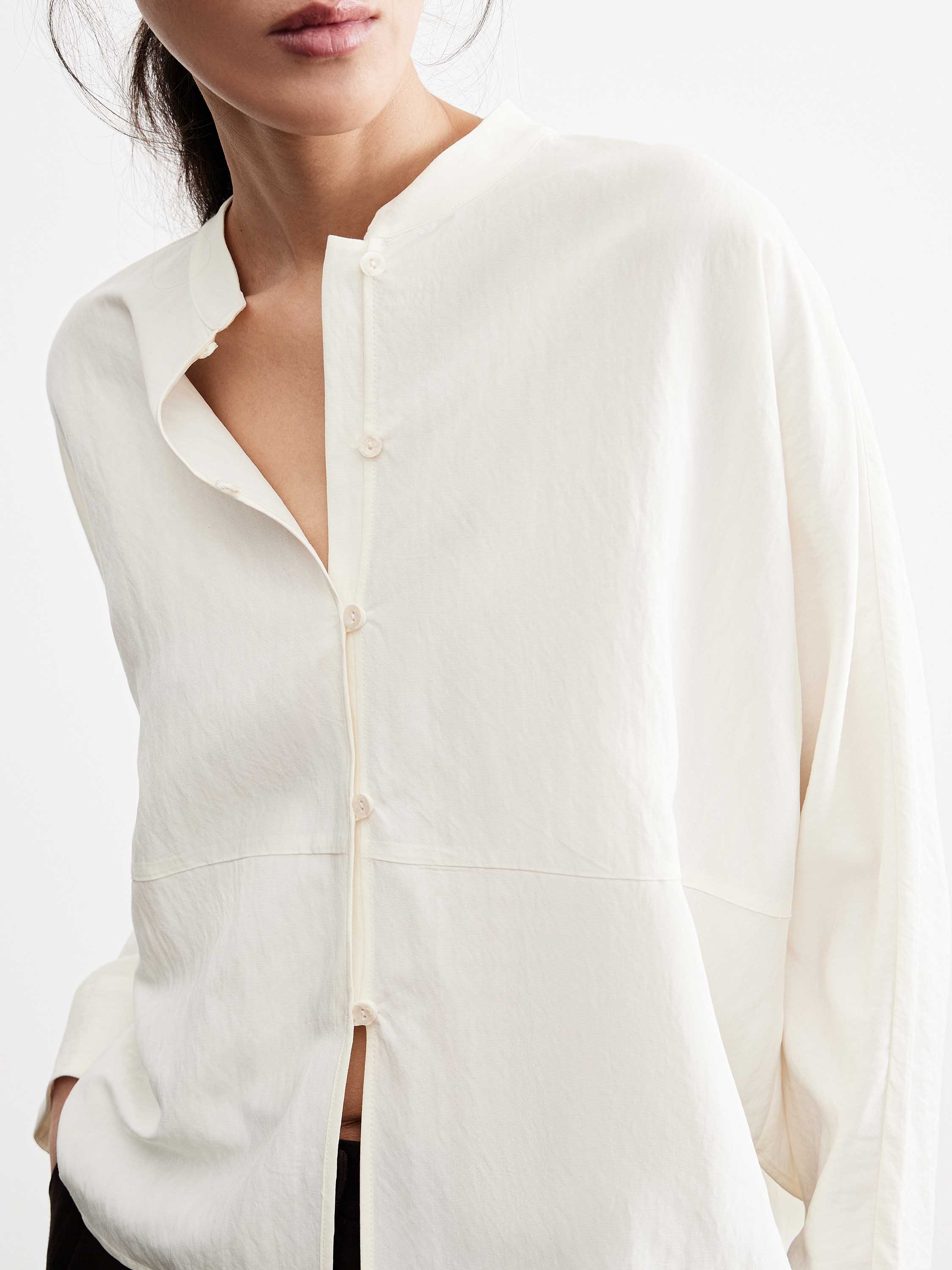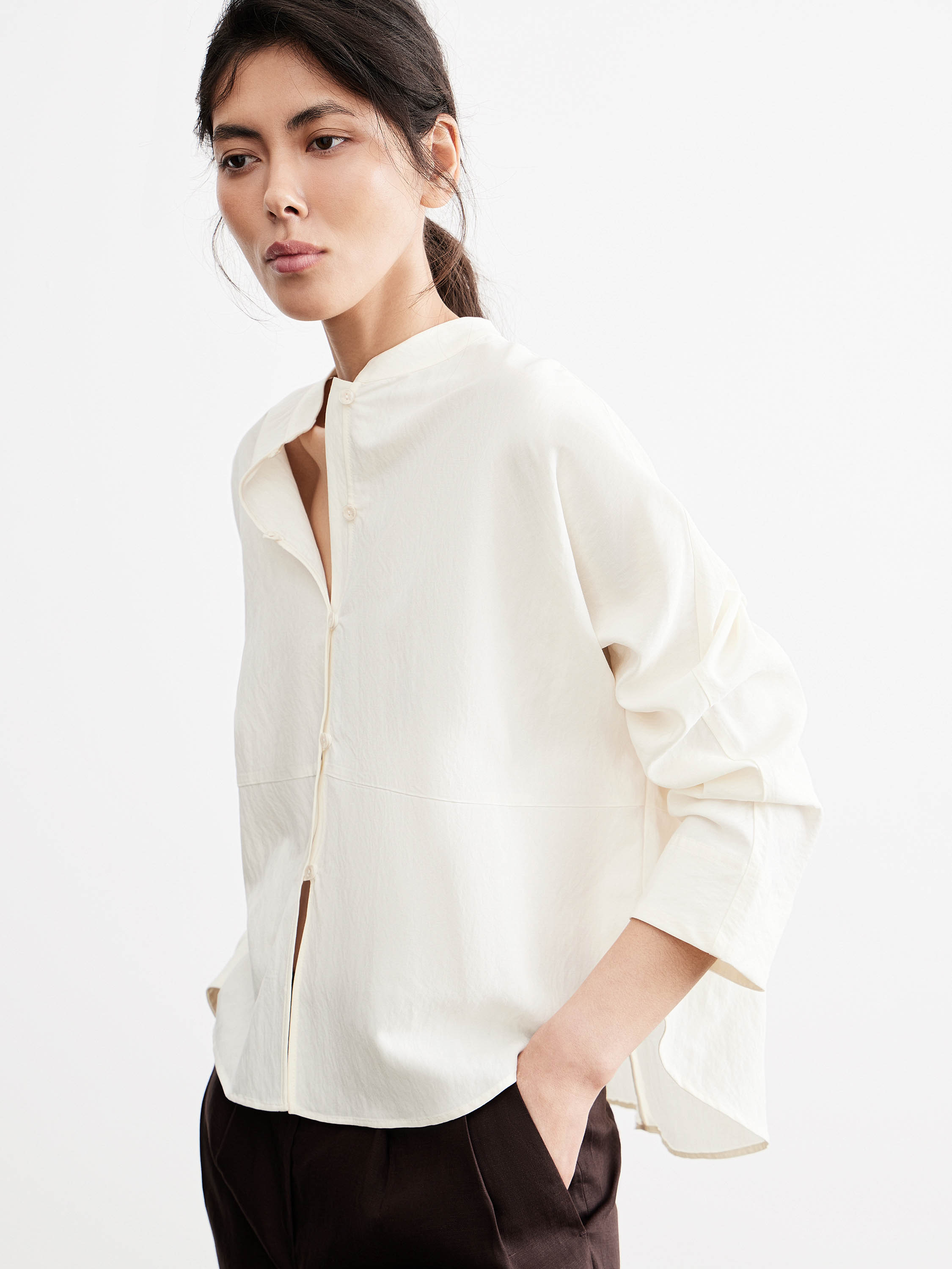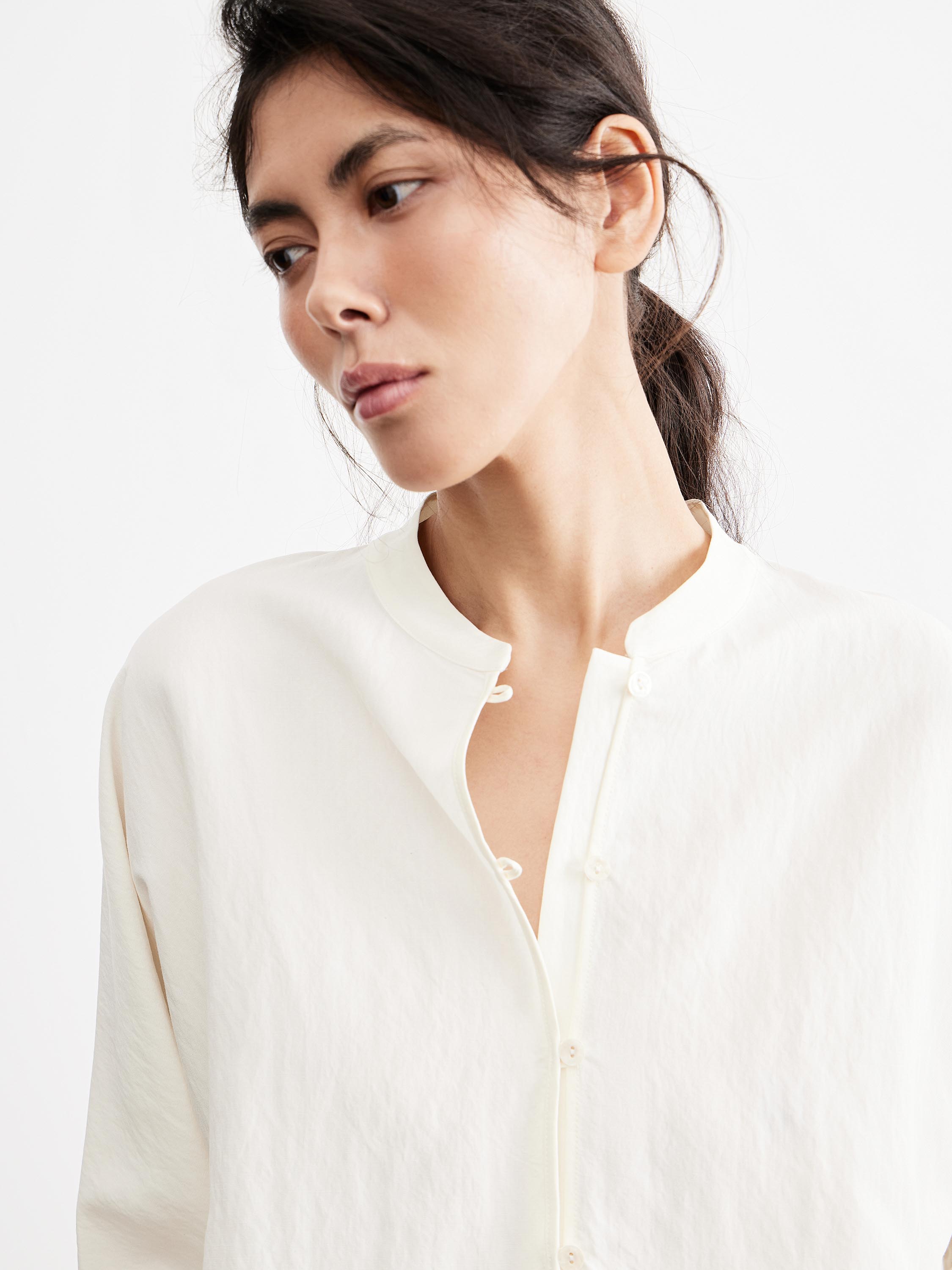 Рубашка прямого кроя с умеренно свободной посадкой и слегка укороченной длиной. Линия плеча мягко спущена, широкий рукав с прямым срезом сохраняет расслабленную форму. Небольшой воротник-стойка с открытой горловиной задает чистую линию верха, центральная планка без лишних деталей поддерживает лаконичную конструкцию. Легкое расширение к низу выравнивает пропорции и позволяет носить модель навыпуск или в сочетании с высокой посадкой. Смесовое полотно на основе хлопка с добавлением льна и нейлона отличается матовой фактурой и умеренной плотностью: хлопок обеспечивает воздухопроницаемость и комфорт, лен добавляет естественную текстуру, нейлон повышает износостойкость и помогает держать форму. Светлый молочный оттенок вписывается в нейтральную палитру. Модель сочетается с брюками, шортами и юбками, дополняется денимом и легким трикотажем.