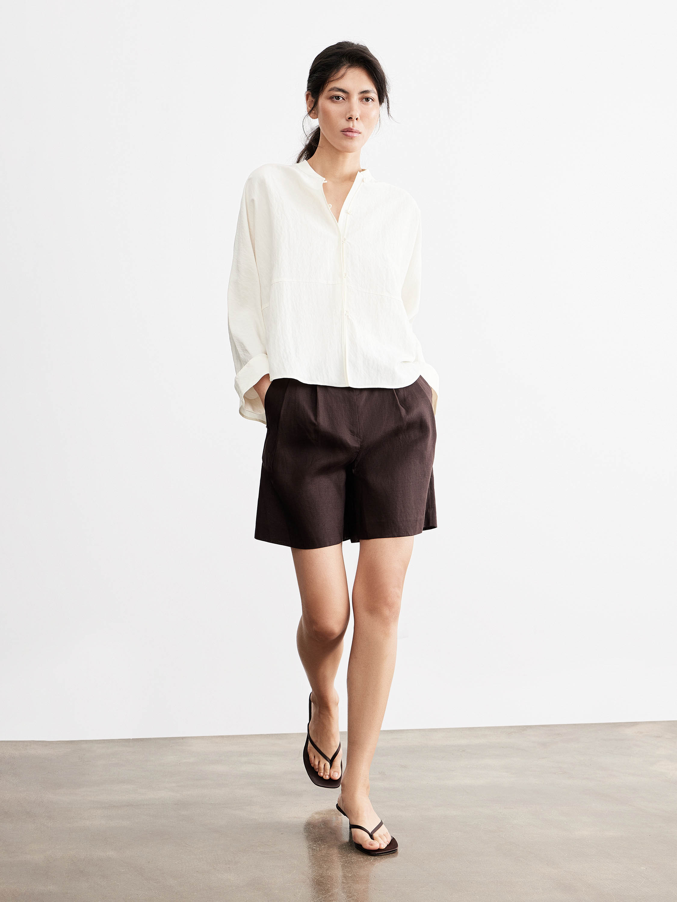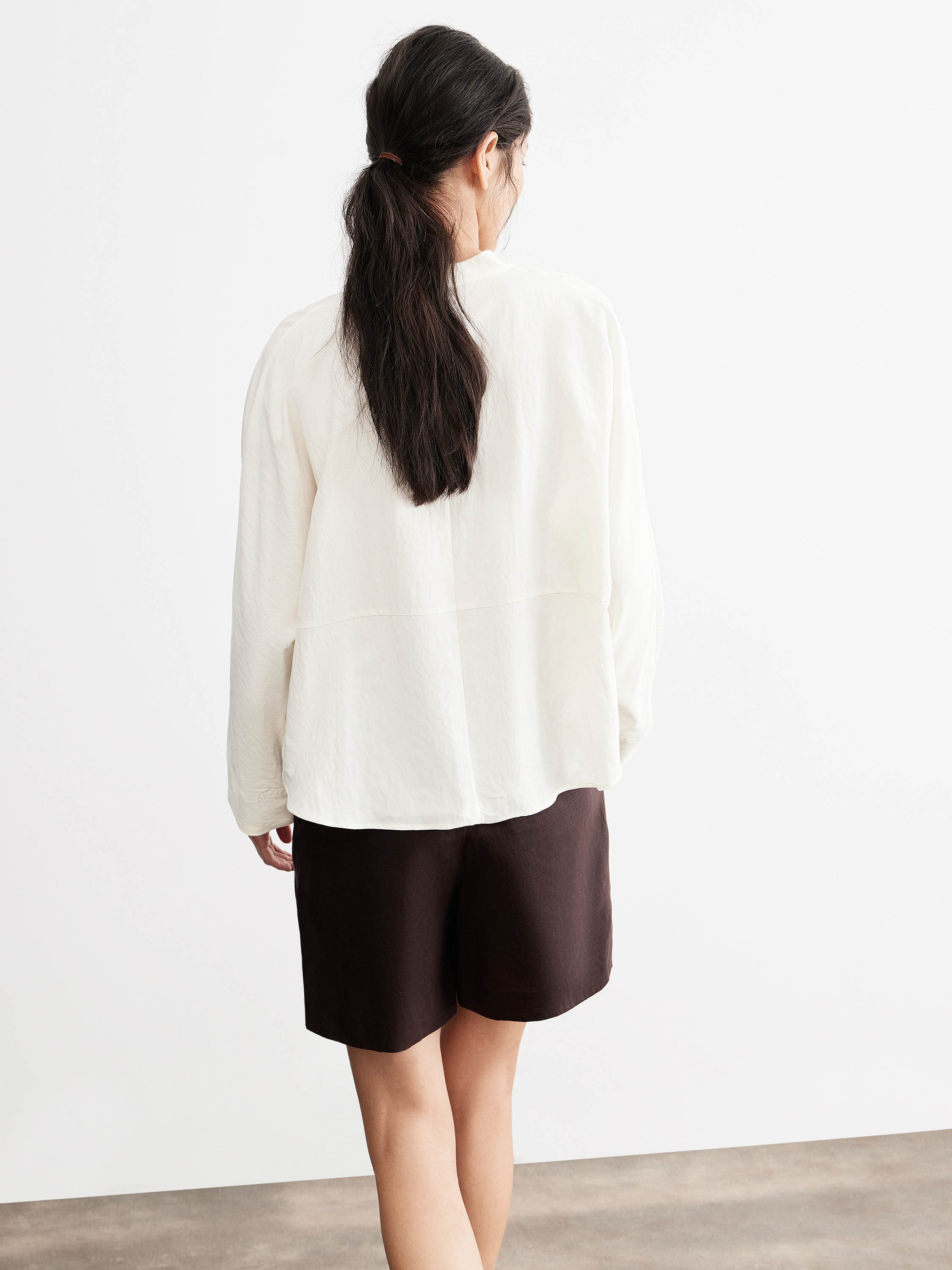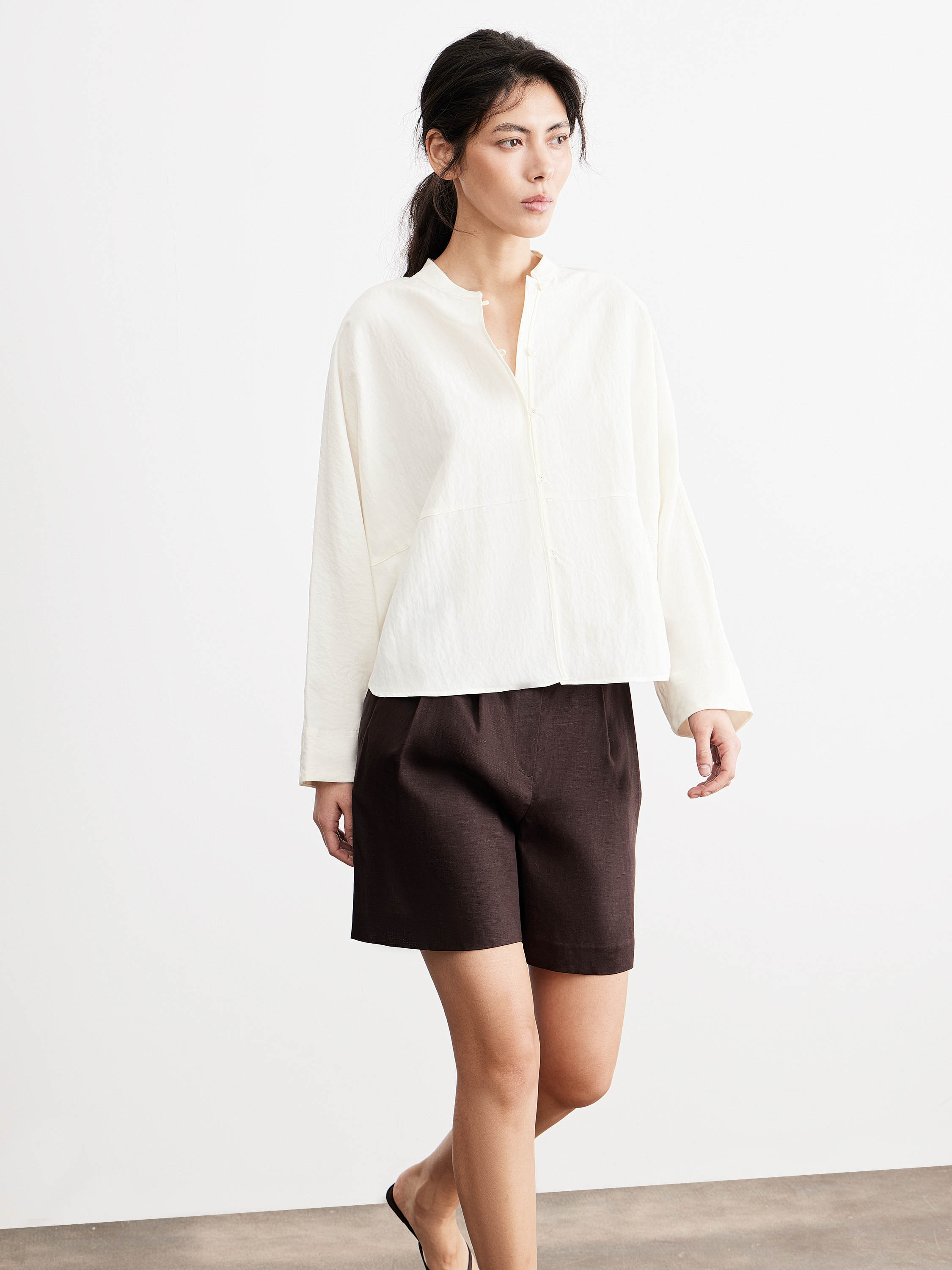 Рубашка прямого кроя с умеренно свободной посадкой и слегка укороченной длиной. Линия плеча мягко спущена, широкий рукав с прямым срезом сохраняет расслабленную форму. Небольшой воротник-стойка с открытой горловиной задает чистую линию верха, центральная планка без лишних деталей поддерживает лаконичную конструкцию. Легкое расширение к низу выравнивает пропорции и позволяет носить модель навыпуск или в сочетании с высокой посадкой. Смесовое полотно на основе хлопка с добавлением льна и нейлона отличается матовой фактурой и умеренной плотностью: хлопок обеспечивает воздухопроницаемость и комфорт, лен добавляет естественную текстуру, нейлон повышает износостойкость и помогает держать форму. Светлый молочный оттенок вписывается в нейтральную палитру. Модель сочетается с брюками, шортами и юбками, дополняется денимом и легким трикотажем.