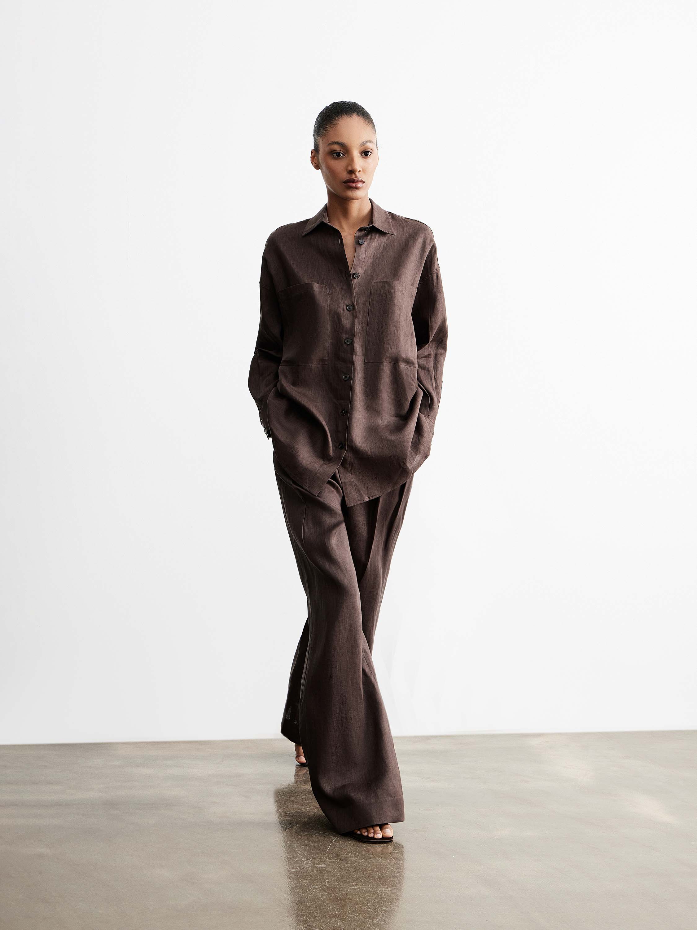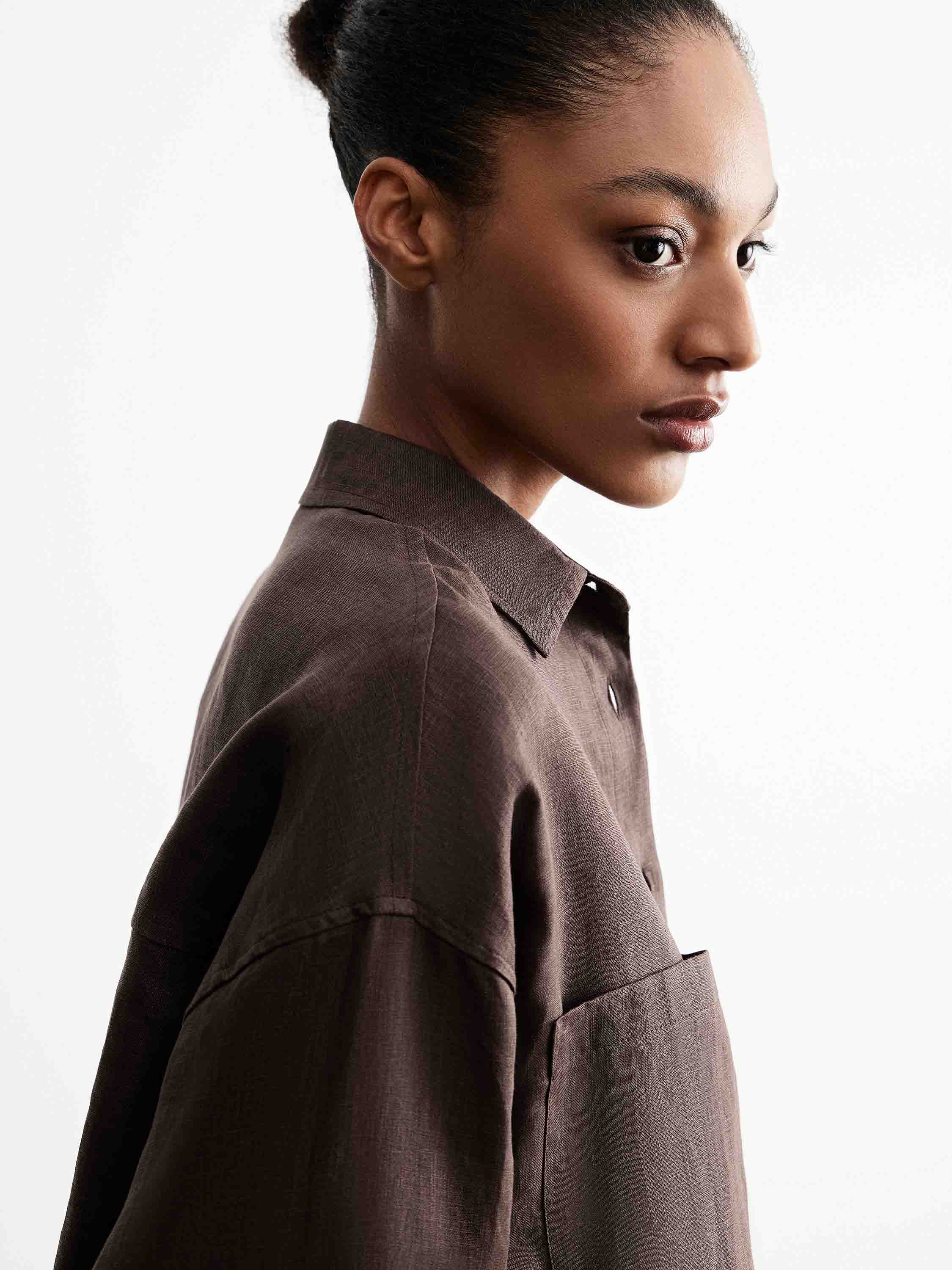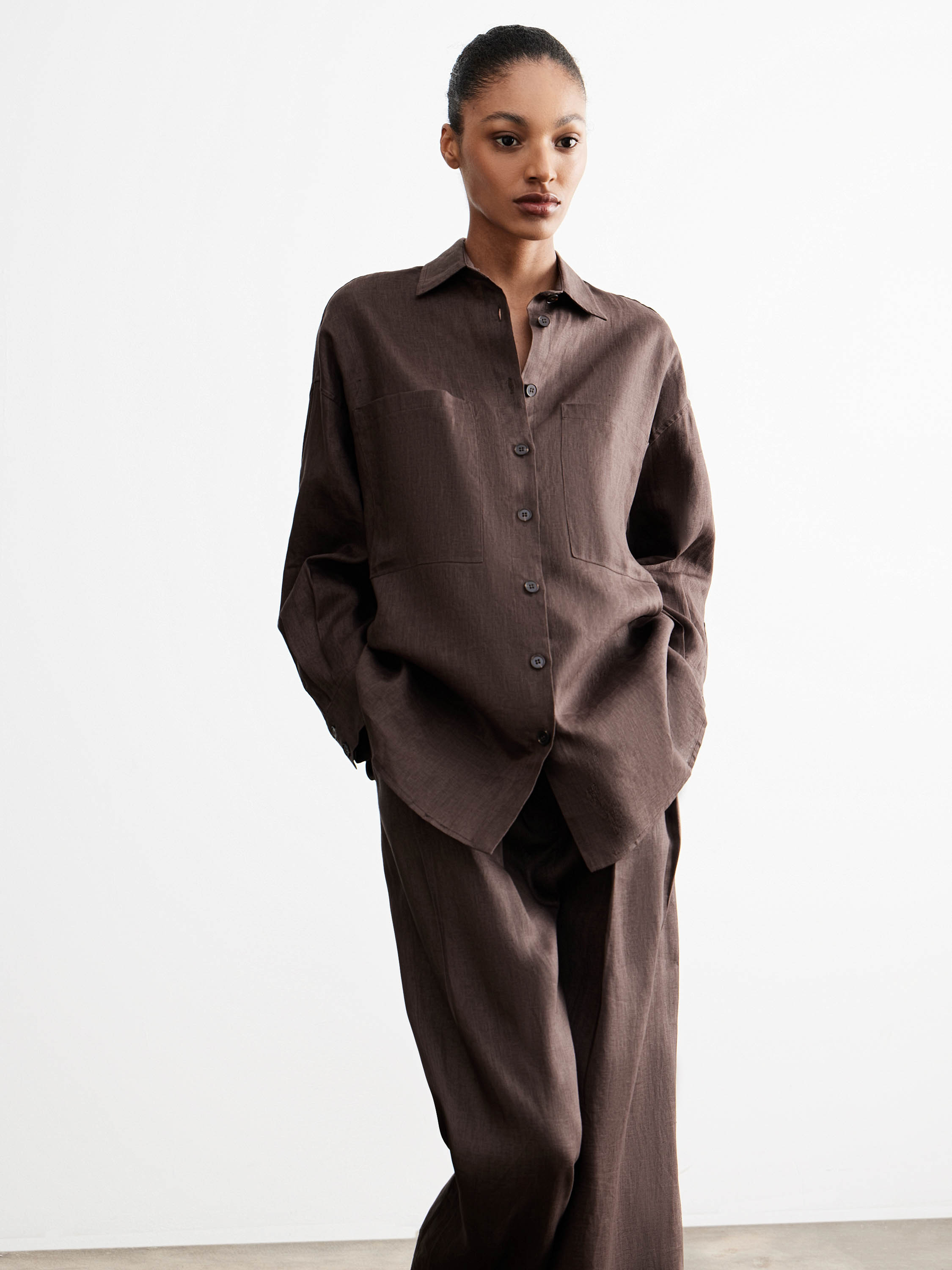 Рубашка прямого кроя с умеренно свободной посадкой формирует мягкий силуэт без лишнего объема. Линия плеча слегка спущена, классический отложной воротник и застежка на пуговицы задают аккуратную вертикаль. Накладные карманы на уровне груди встроены в конструкцию и подчеркивают горизонталь, смягчая общую форму. Удлиненная линия низа с округлением позволяет носить модель как навыпуск, так и частично заправленной. Ткань с матовой фактурой и легкой пластикой обеспечивает комфорт в движении и спокойную посадку. Глубокий коричневый оттенок вписывается в теплую и нейтральную палитру. Модель сочетается с брюками и юбками с высокой посадкой, а также с денимом и тонким трикотажем.