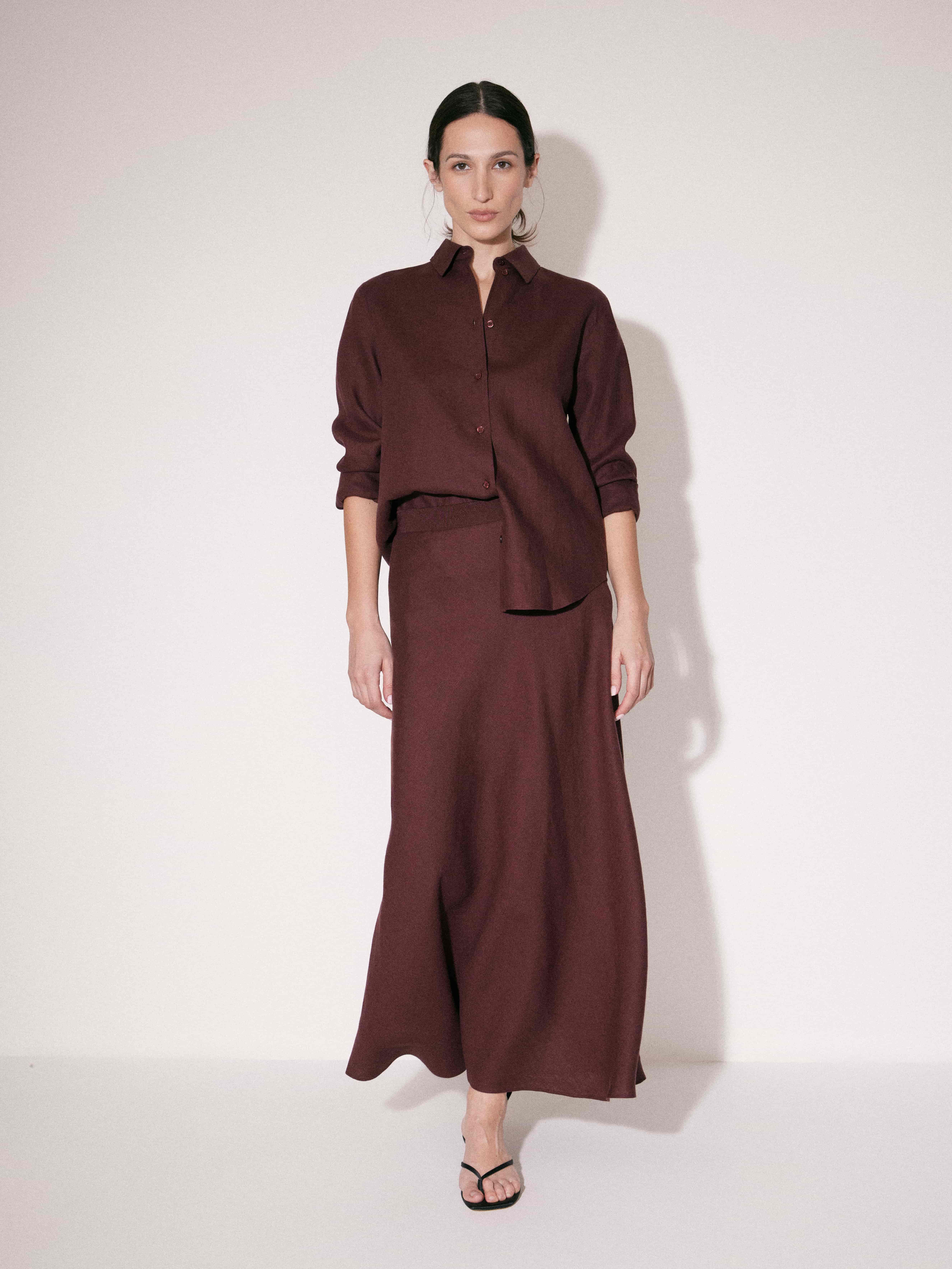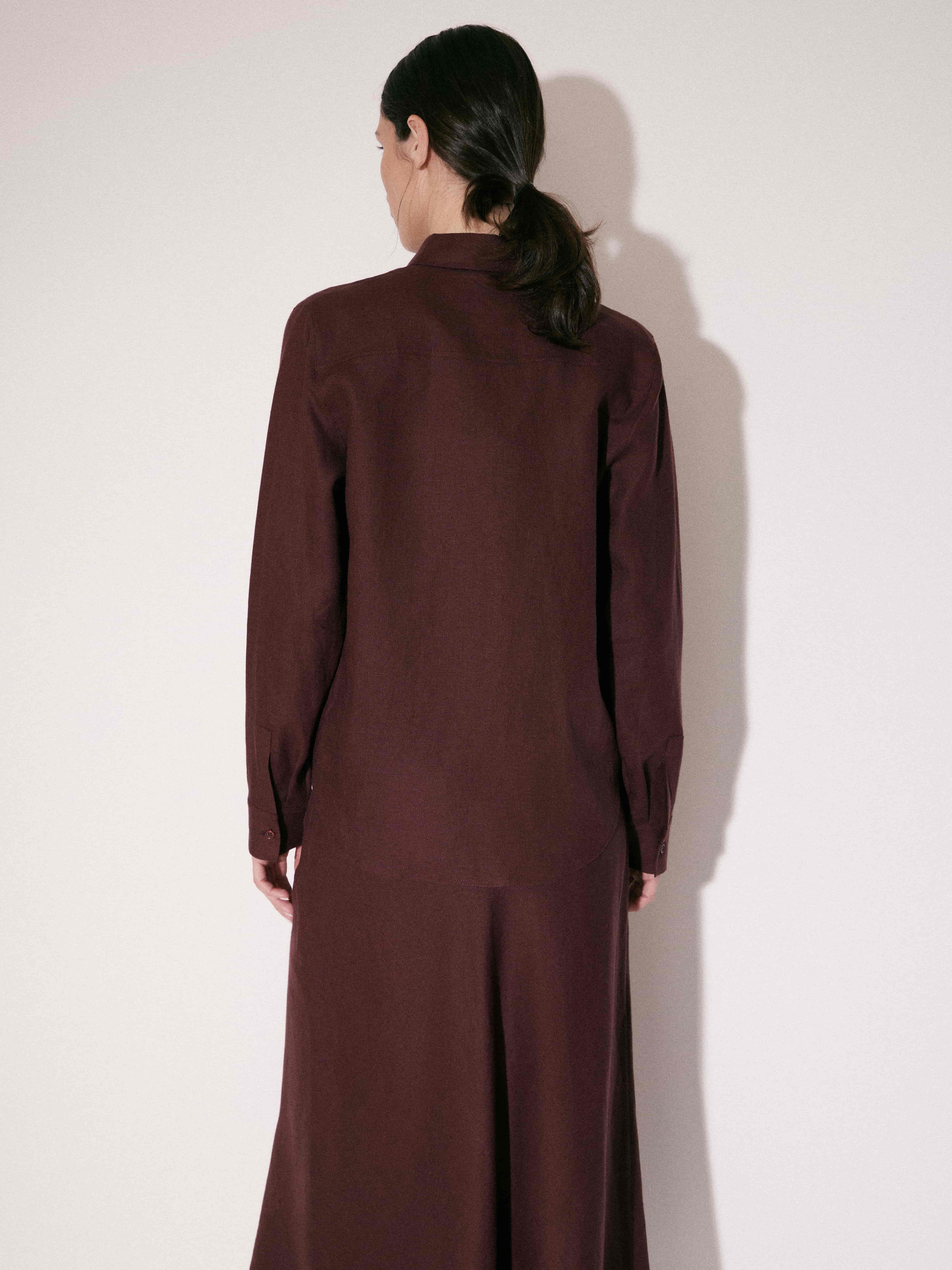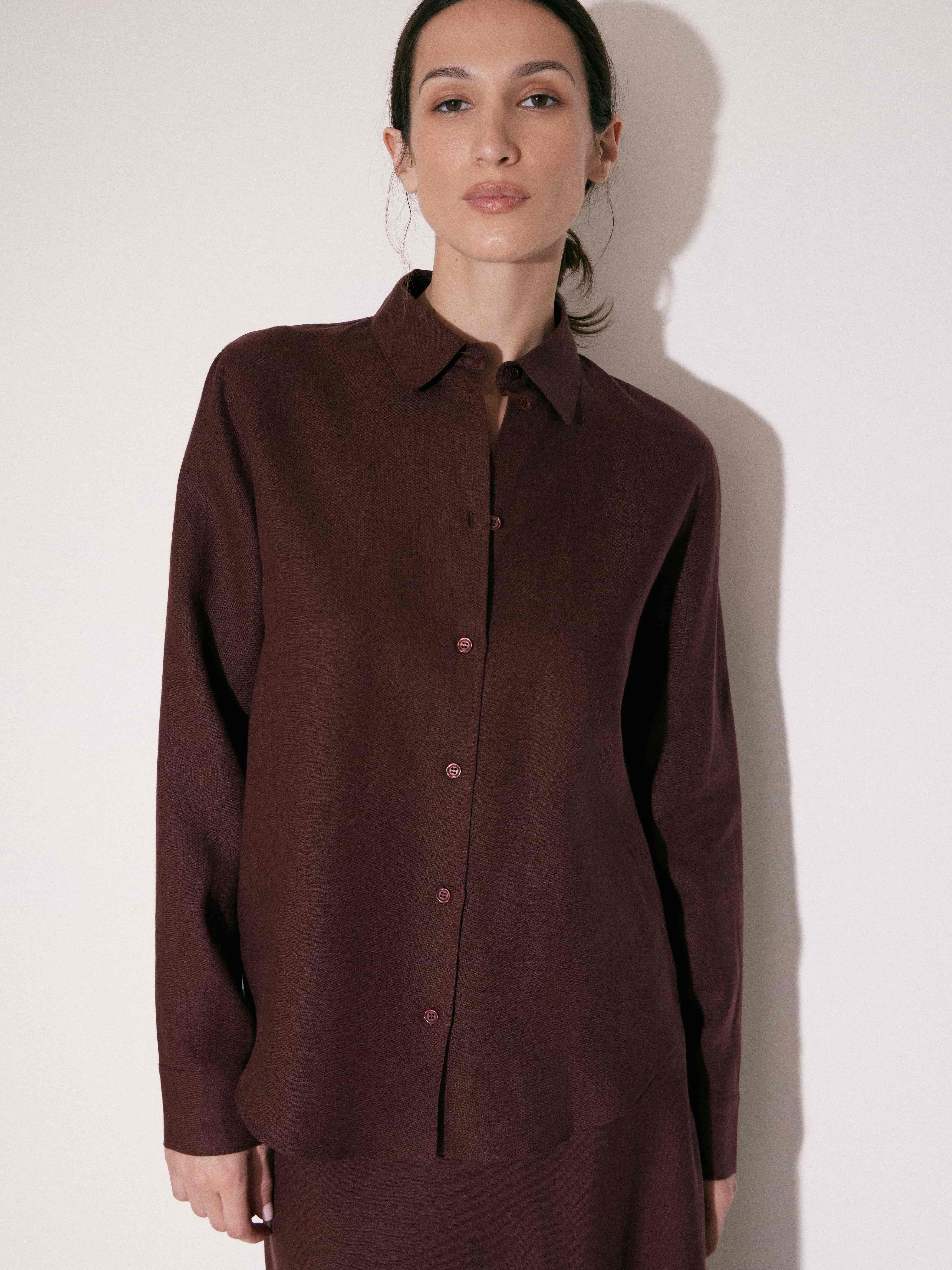 Рубашка прямого силуэта с мягкой посадкой и аккуратно оформленной линией плеча. Конструкция классическая: отложной воротник, центральная планка с пуговицами, длинные рукава с манжетами. Линия низа слегка закруглена, за счет чего модель выглядит аккуратно и удобно садится в сочетаниях с разными типами низа. Посадка свободная, без прилегания, формирует сдержанный, собранный силуэт. Материал гладкий, с легкой пластикой и деликатной фактурой, хорошо драпируется и не утяжеляет форму. Глубокий оттенок бургунди добавляет выразительности и легко сочетается как со светлой, так и с темной палитрой гардероба.