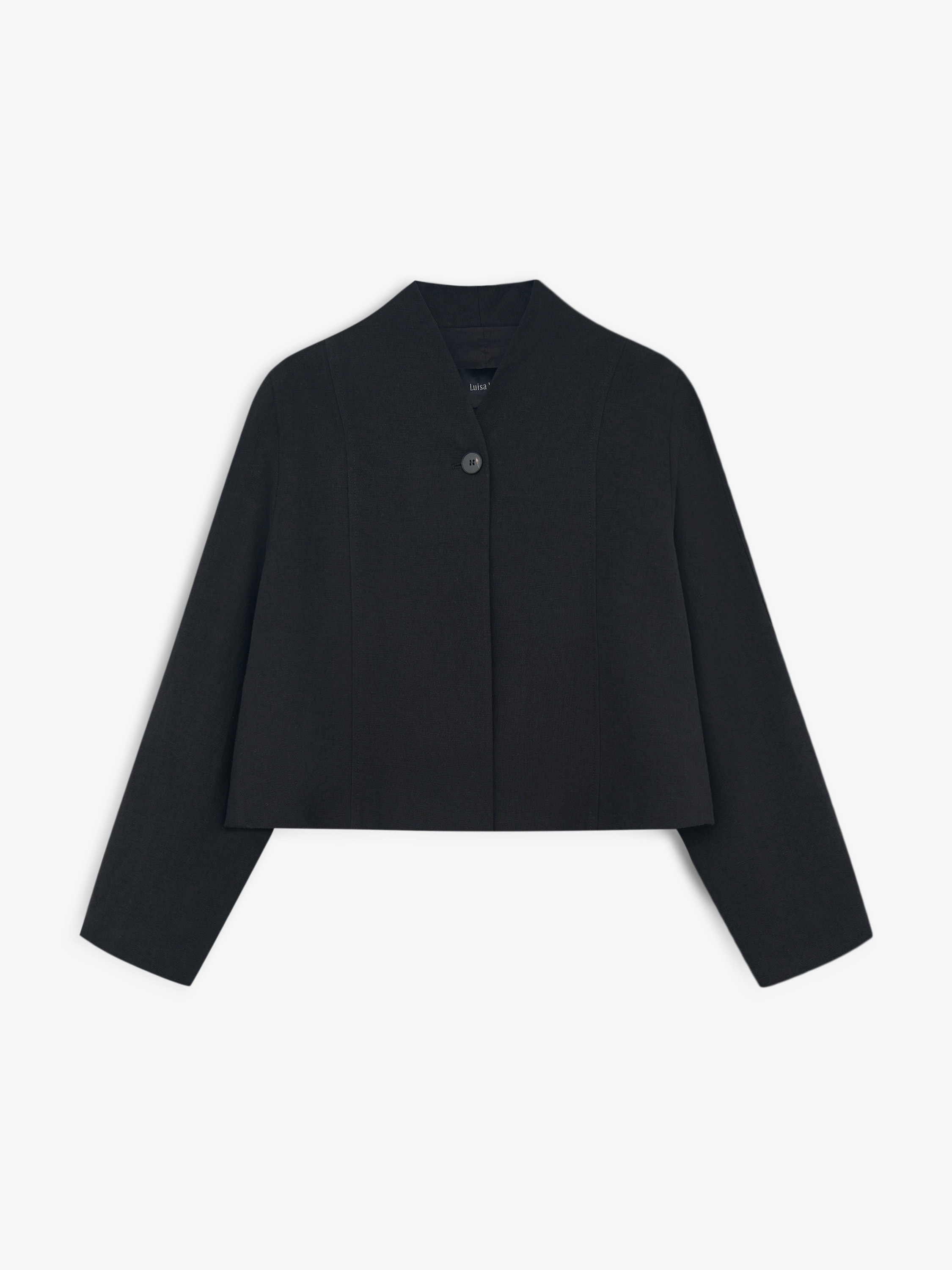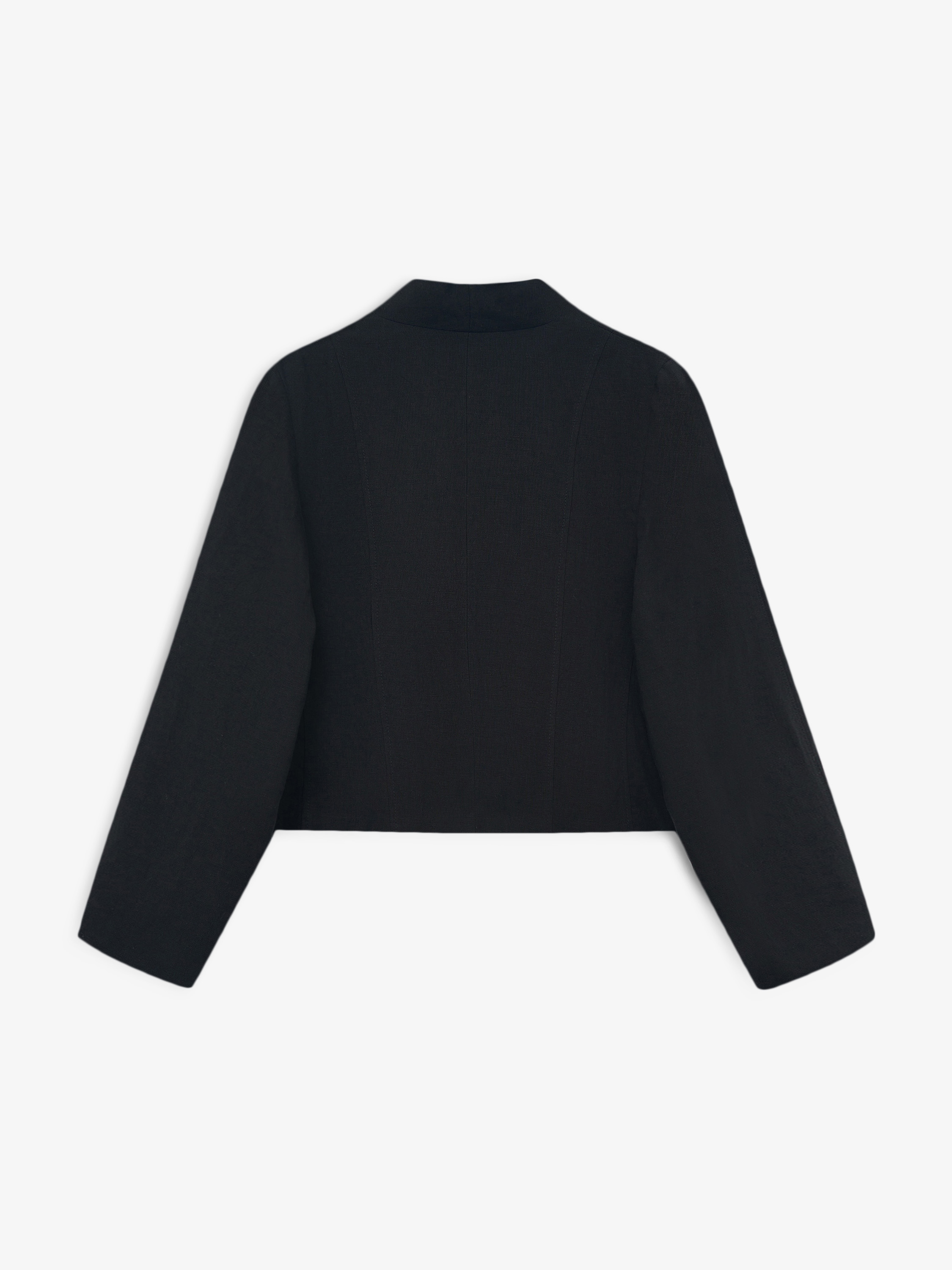 Жакет укороченного силуэта с четкой геометрией и лаконичной посадкой. Линия плеча оформлена аккуратно, рукав прямой, полной длины, без излишнего объема. Конструкция минималистичная: V-образный вырез без воротника, центральная застежка на одну пуговицу, вертикальные рельефы, которые формируют силуэт и добавляют конструкции точность. Длина укороченная, за счет чего модель визуально выстраивает пропорции и хорошо сочетается с изделиями с высокой посадкой. Ткань плотная, с ровной поверхностью и стабильной структурой, держит форму и сохраняет четкость линий. Темный оттенок делает жакет универсальным и уместным как в сдержанных, так и в более выразительных сочетаниях.