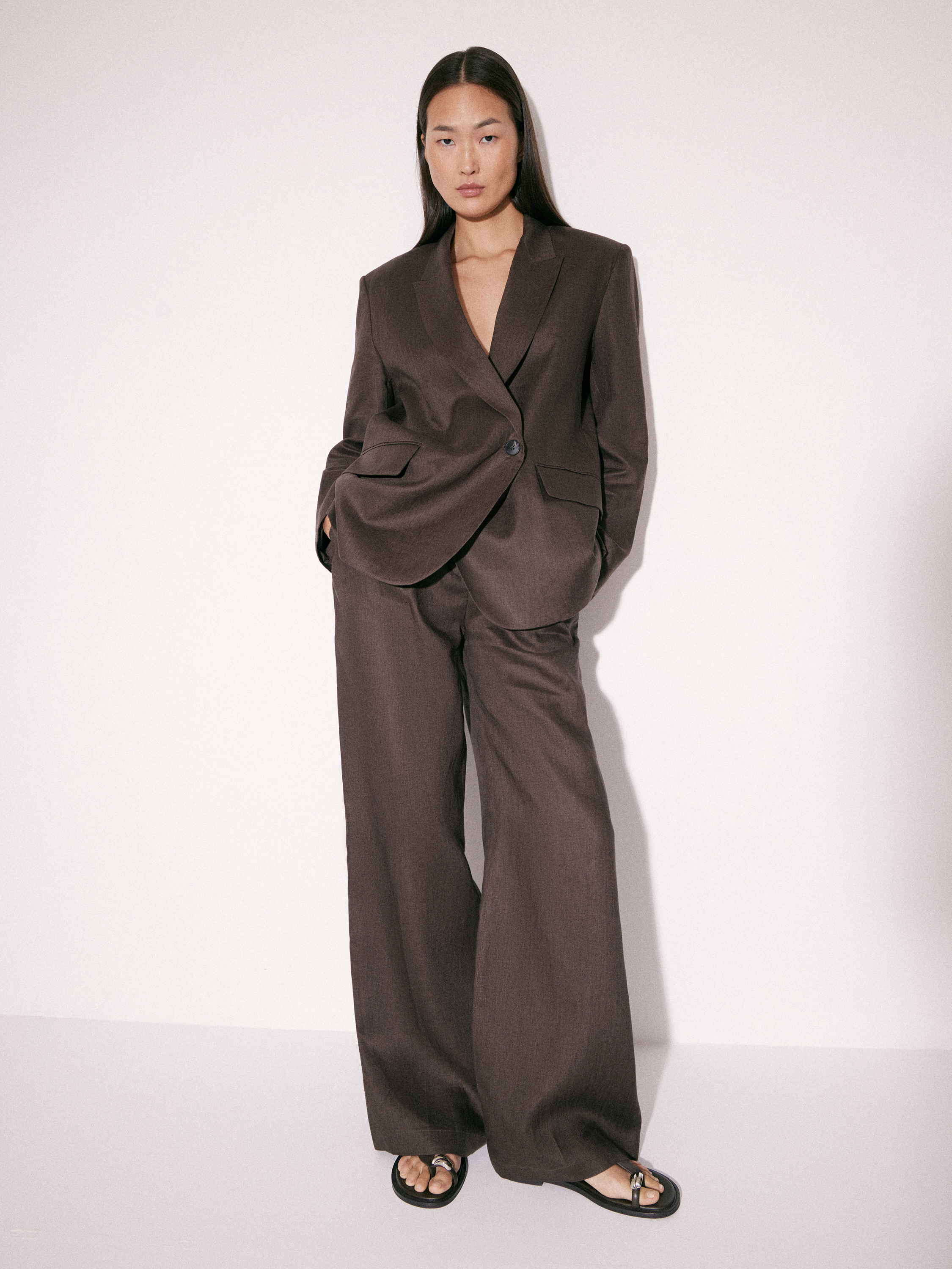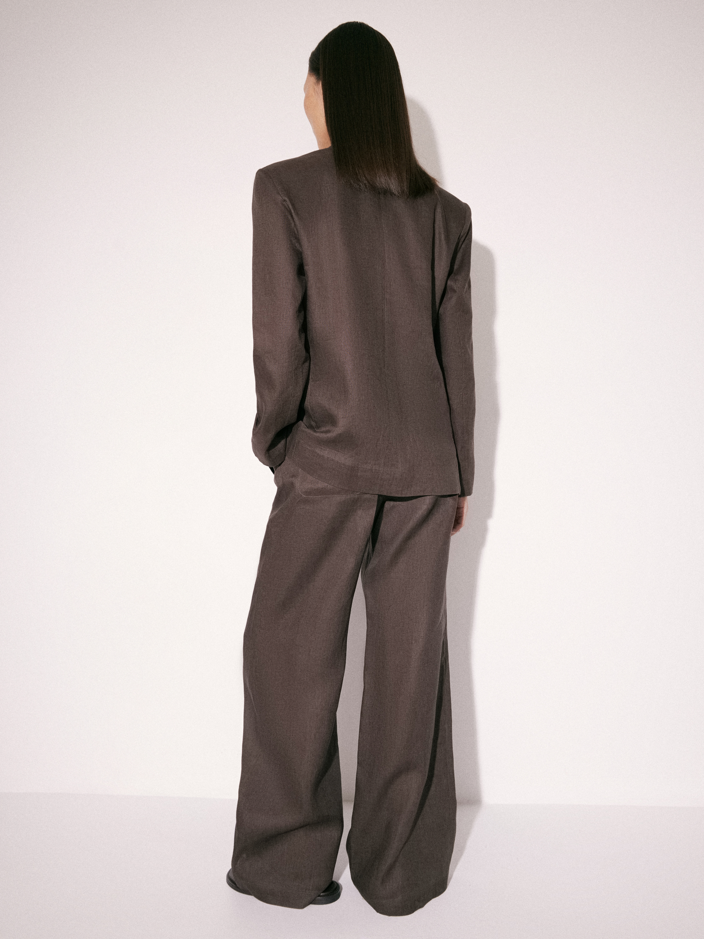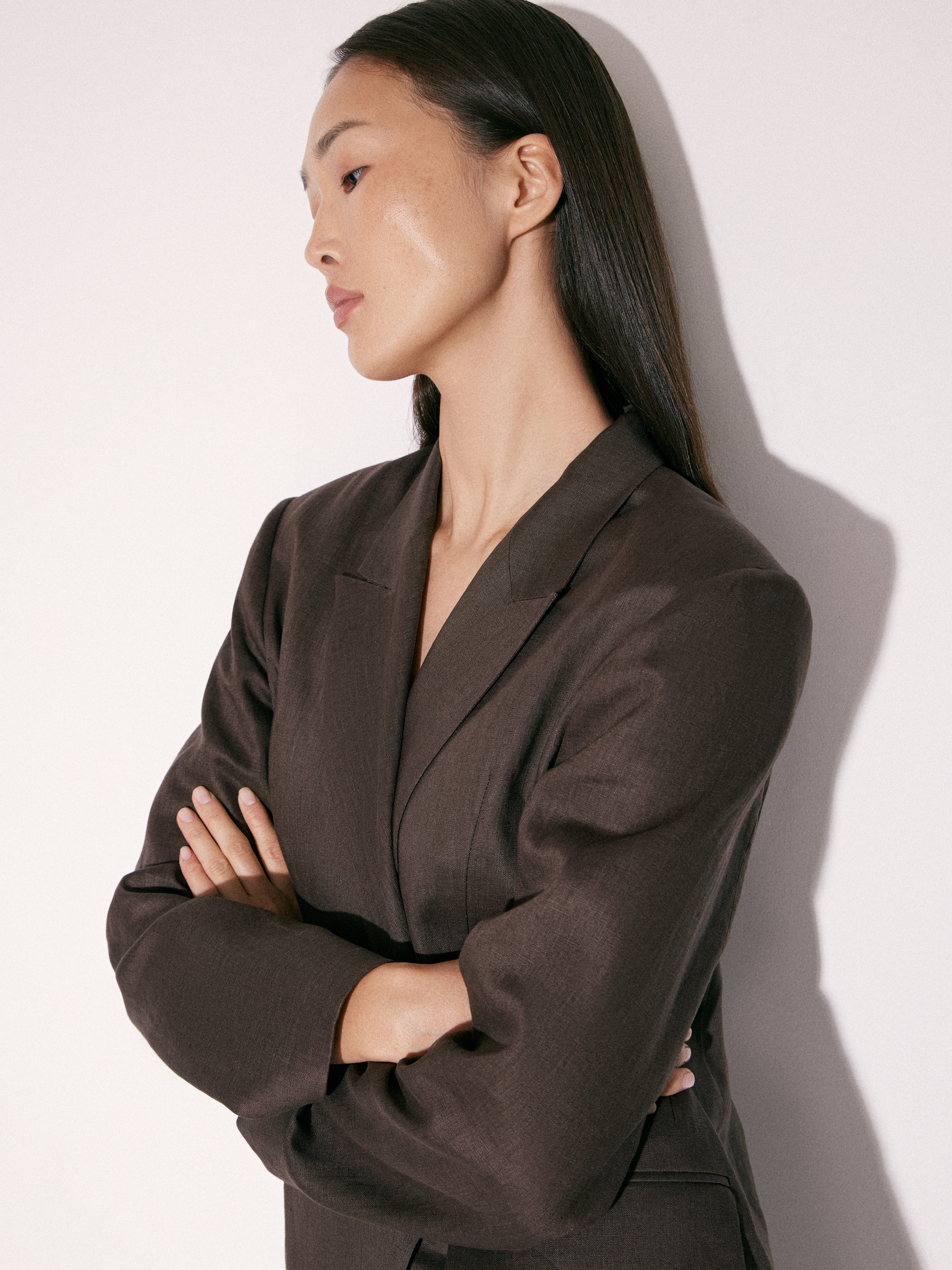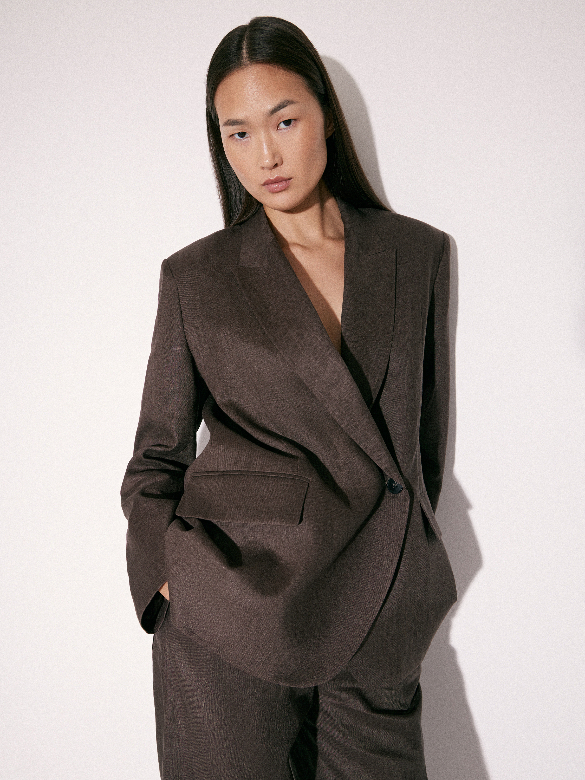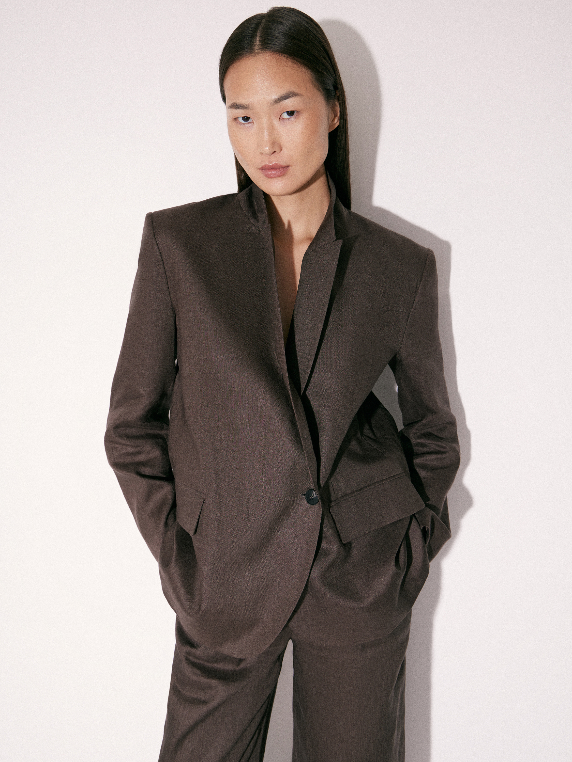 Жакет приталенного силуэта с четко обозначенной линией плеч и аккуратной посадкой по фигуре. Двубортная конструкция с запахом формирует мягкую диагональную линию борта и деликатно подчеркивает талию без жесткой фиксации. Лацканы средней ширины, линия кроя остается чистой и собранной. Рукава полной длины, без избыточного объема. По бокам — прорезные карманы с клапанами. Выполнен изо льна, подкладка — из хлопка, что обеспечивает комфорт в носке и позволяет материалу оставаться воздухопроницаемым. Оттенок — глубокий коричневый с холодным подтоном, легко сочетается как с комплектными брюками, так и с более легкими по фактуре вещами.