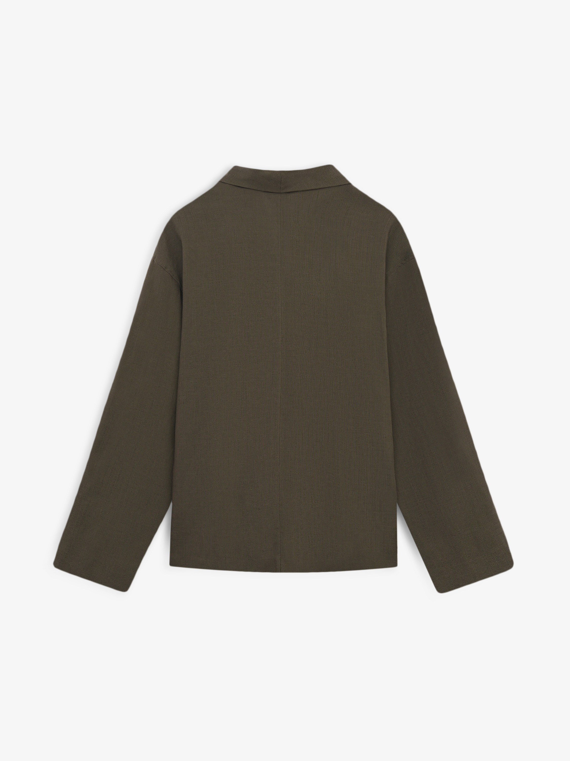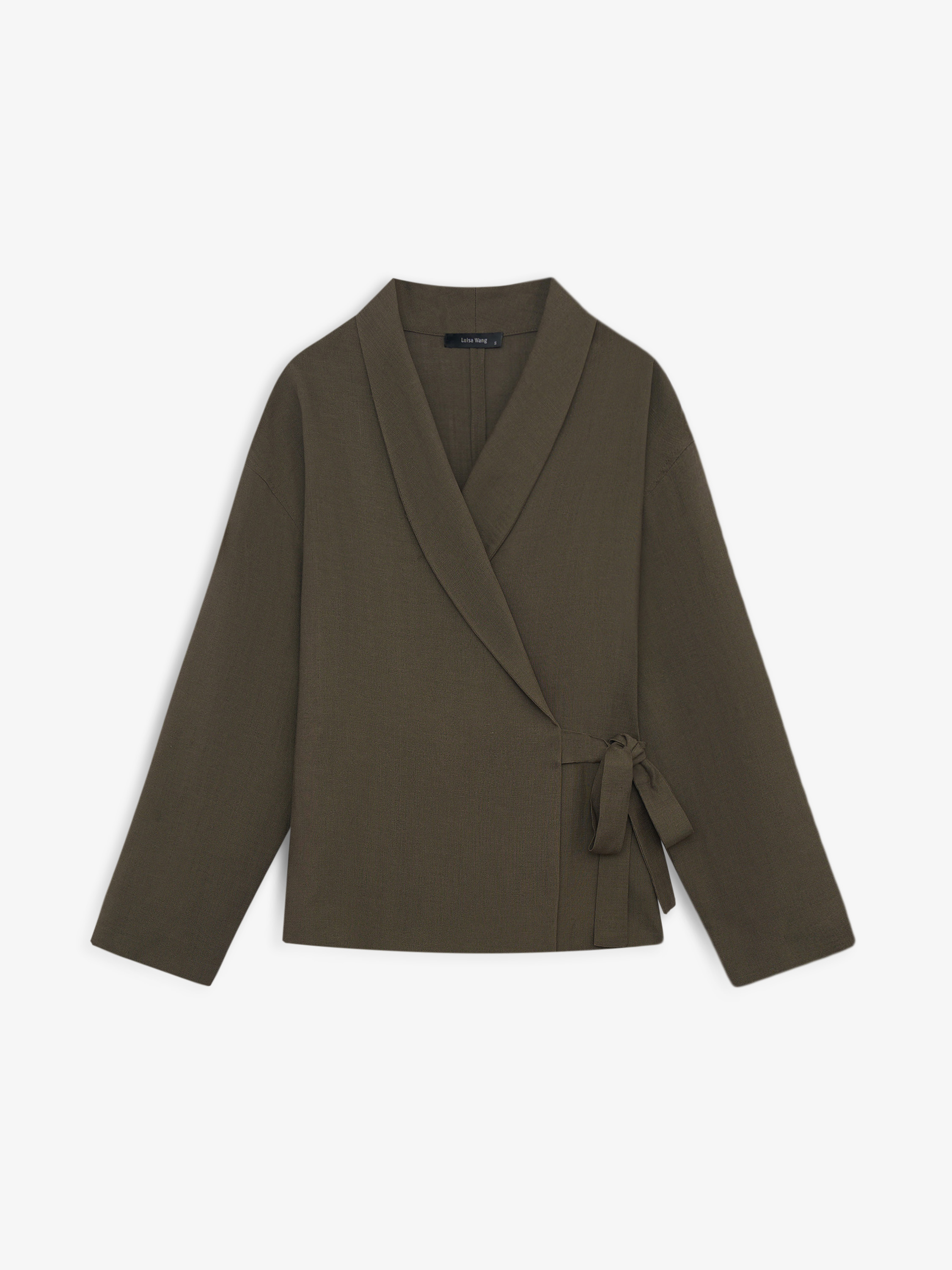 Жакет с запахом из плотного смесового полотна на основе натуральных волокон. Материал держит форму, при этом остается пластичным и комфортным в носке. Силуэт прямой, с мягкой линией плеча. Конструкция с запахом фиксируется завязками по линии талии, формируя аккуратный объем и регулируемую посадку. Линия воротника оформлена широкими лацканами. Рукав длинный, прямой. Жакет легко вписывается в повседневный гардероб и сочетается с брюками, юбками и джинсами, а также подходит для многослойных образов.