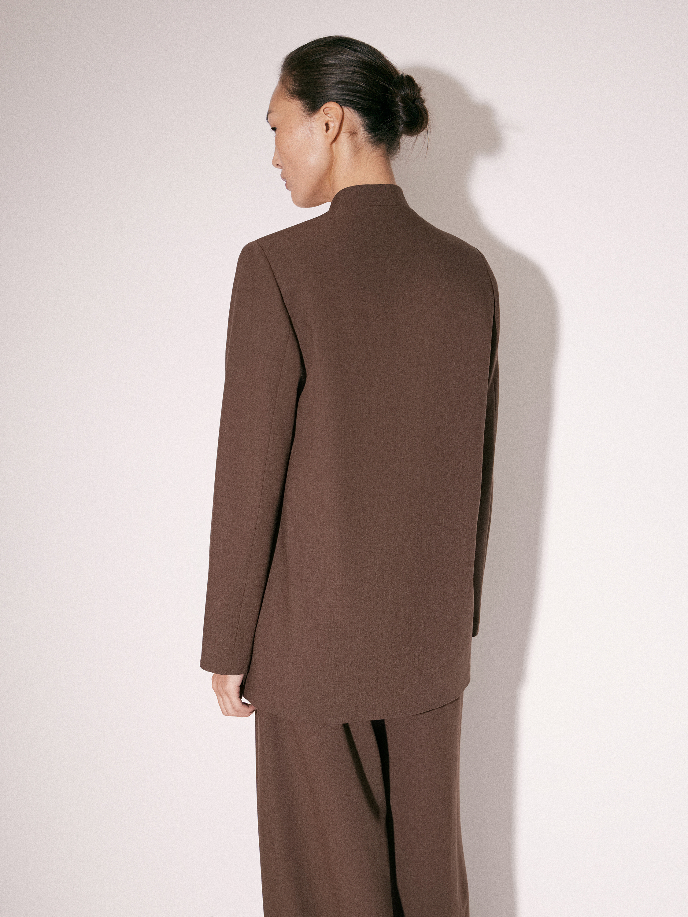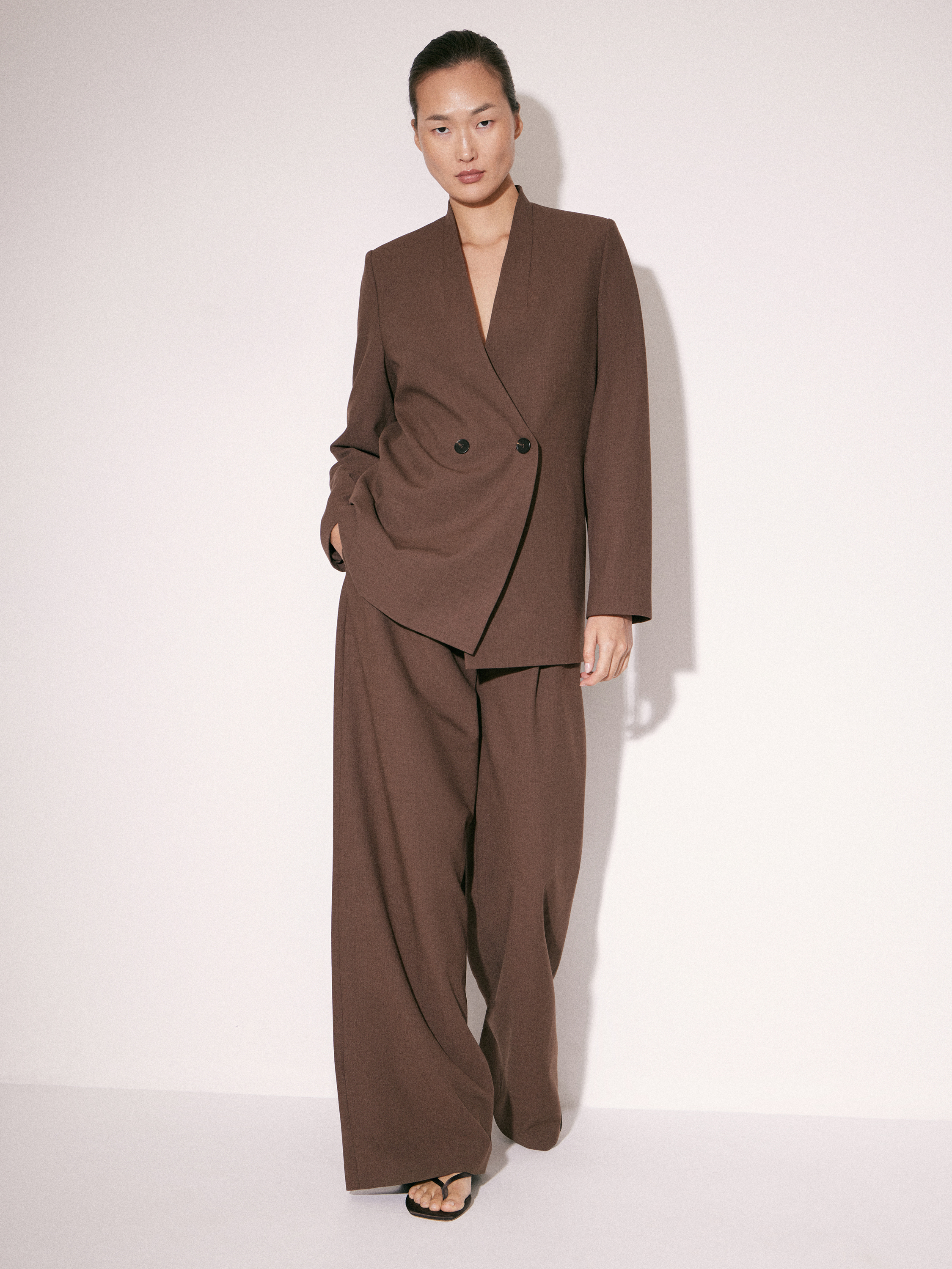 Жакет прямого силуэта с мягкой линией плеч и умеренно свободной посадкой. Двубортная конструкция с глубоким V-образным вырезом формирует вытянутую вертикаль и делает силуэт более собранным. Лацканы с четкой геометрией, аккуратная линия борта, два ряда пуговиц в тон усиливают ощущение строгости без избыточной формальности. Рукава полной длины, посадка не перегружена объемом, за счет чего модель сохраняет лаконичность. Цвет — приглушенный коричневый с теплым подтоном, легко интегрируется в базовый гардероб. Сочетается с брюками в тон, а также с более легкими по фактуре вещами для контраста.