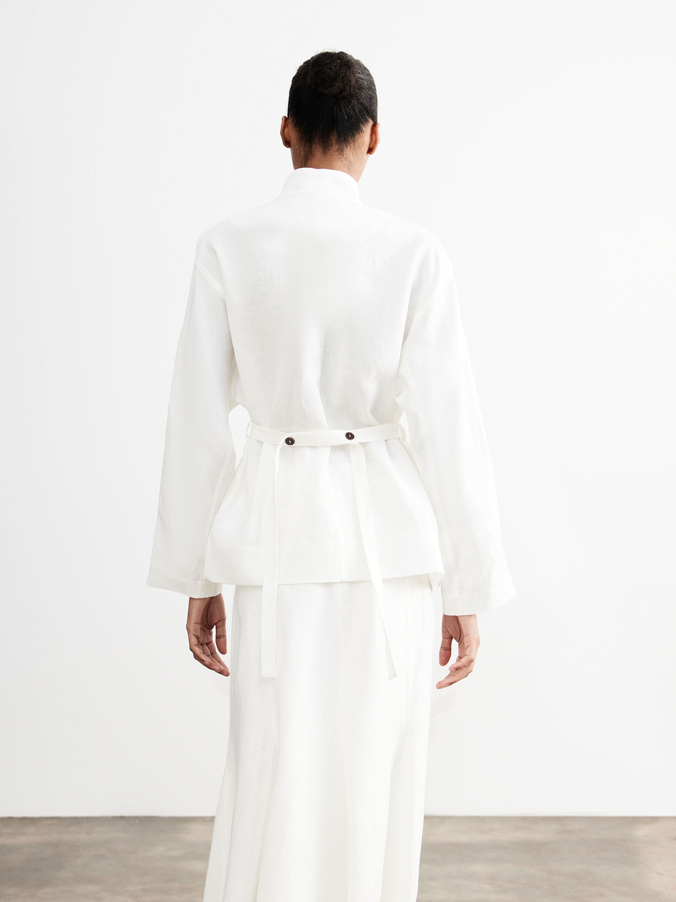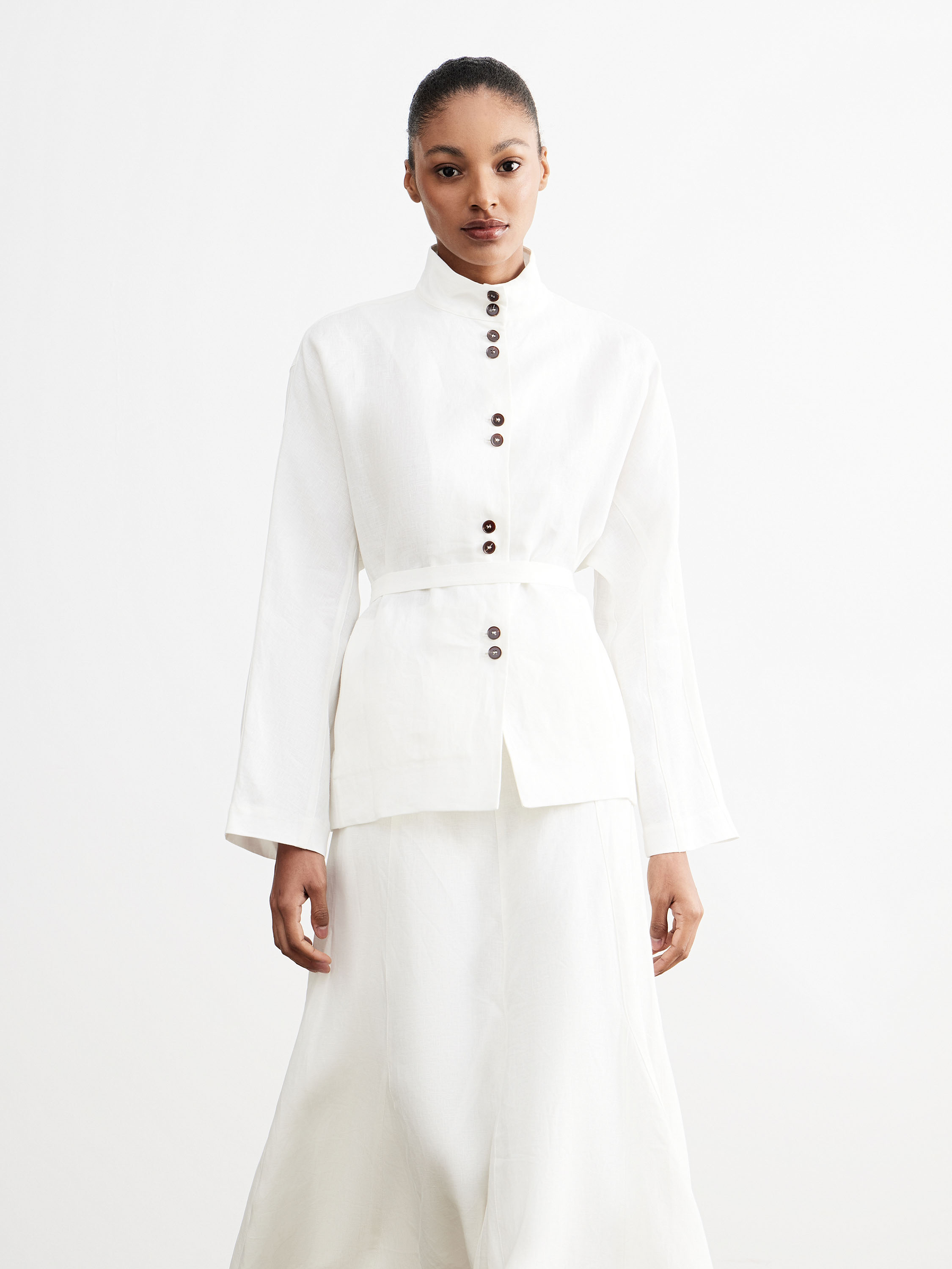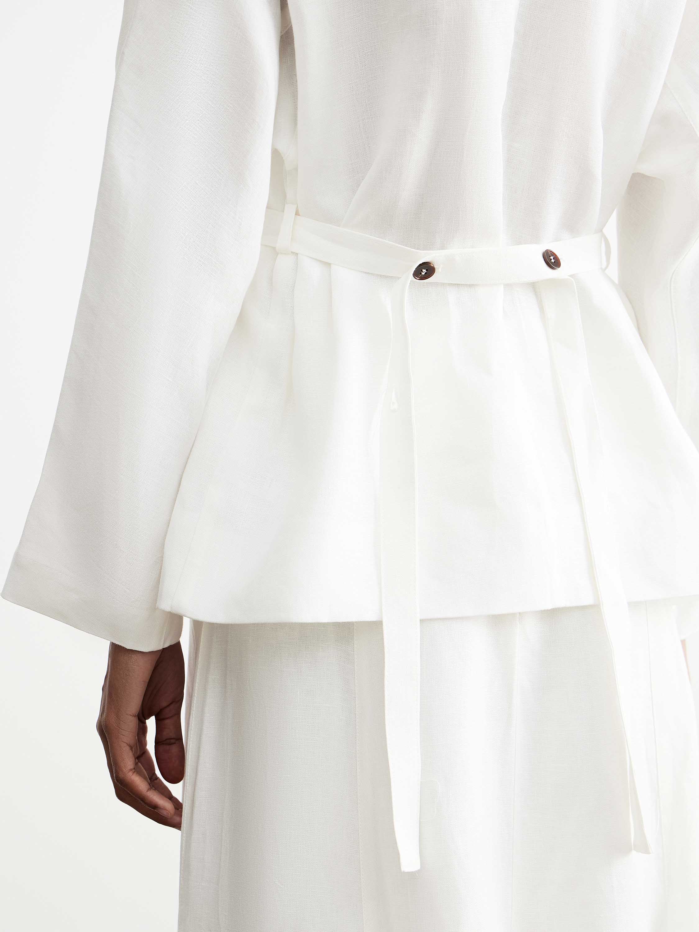 Жакет прямого кроя с полуприлегающим силуэтом и акцентом на линию талии формирует собранную конструкцию без лишнего объема. Высокая стойка задает четкую линию верха, застежка на ряд контрастных пуговиц выстраивает вертикаль, втачной пояс подчеркивает силуэт и фиксирует посадку. Удлиненная линия низа с легким асимметричным заходом добавляет пластики и визуально облегчает форму. Полотно изо льна отличается матовой фактурой и воздухопроницаемостью, сохраняет комфорт в носке; хлопковая подкладка делает посадку более мягкой. Светлый молочный оттенок вписывается в нейтральную палитру. Модель сочетается с юбками и брюками с высокой посадкой, а также с тонким трикотажем и базовыми слоями.