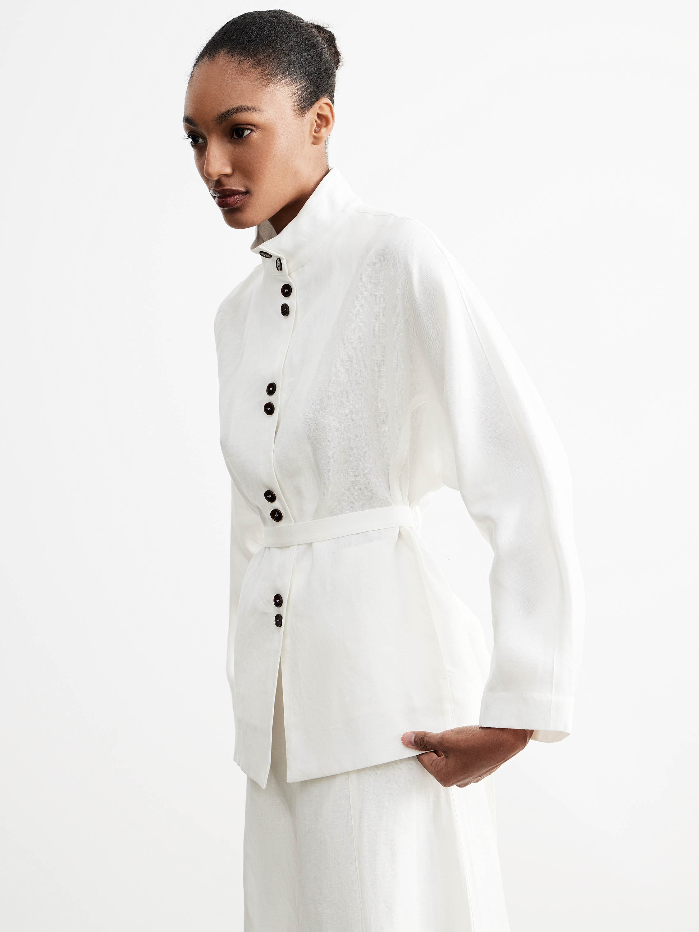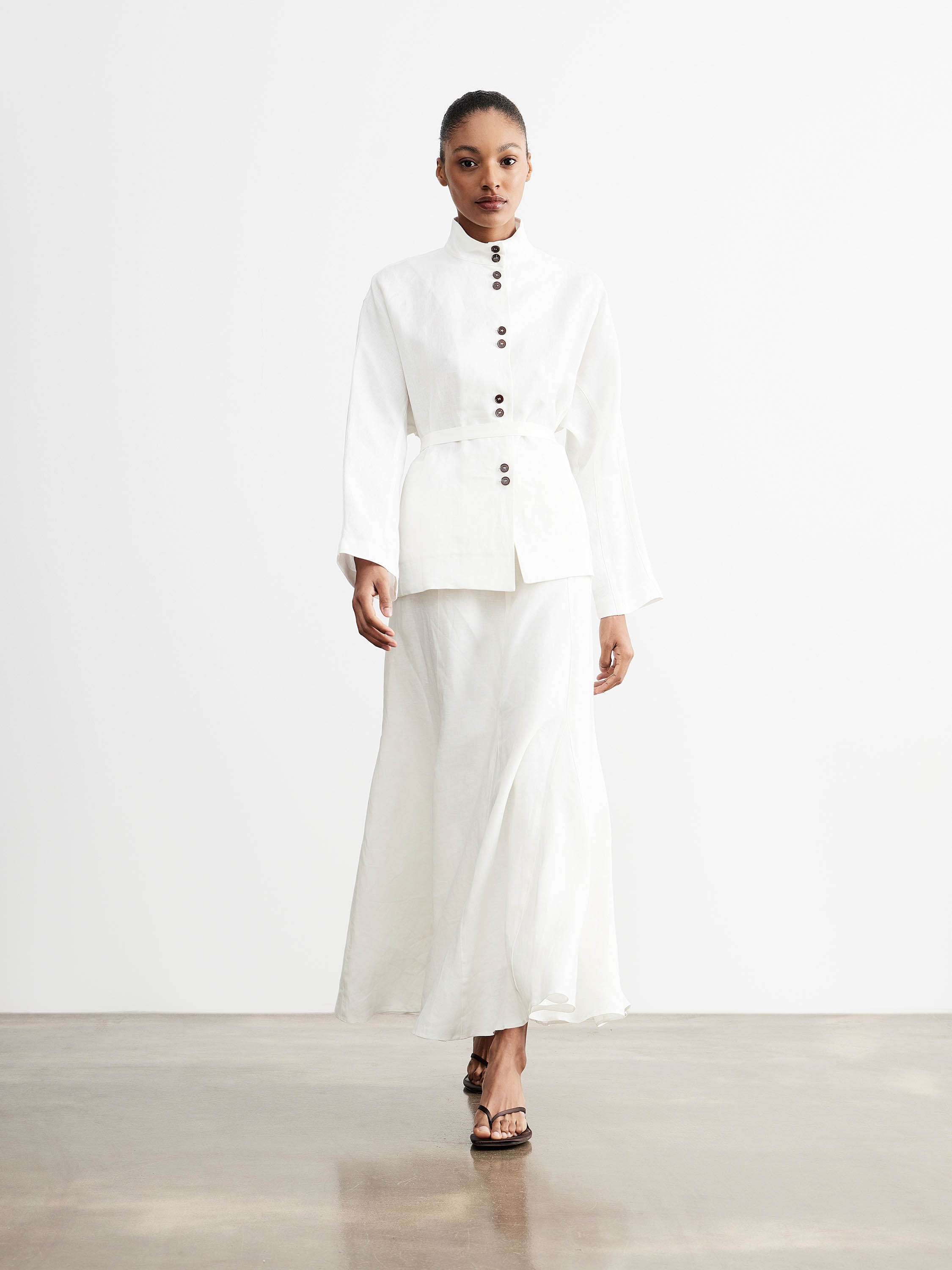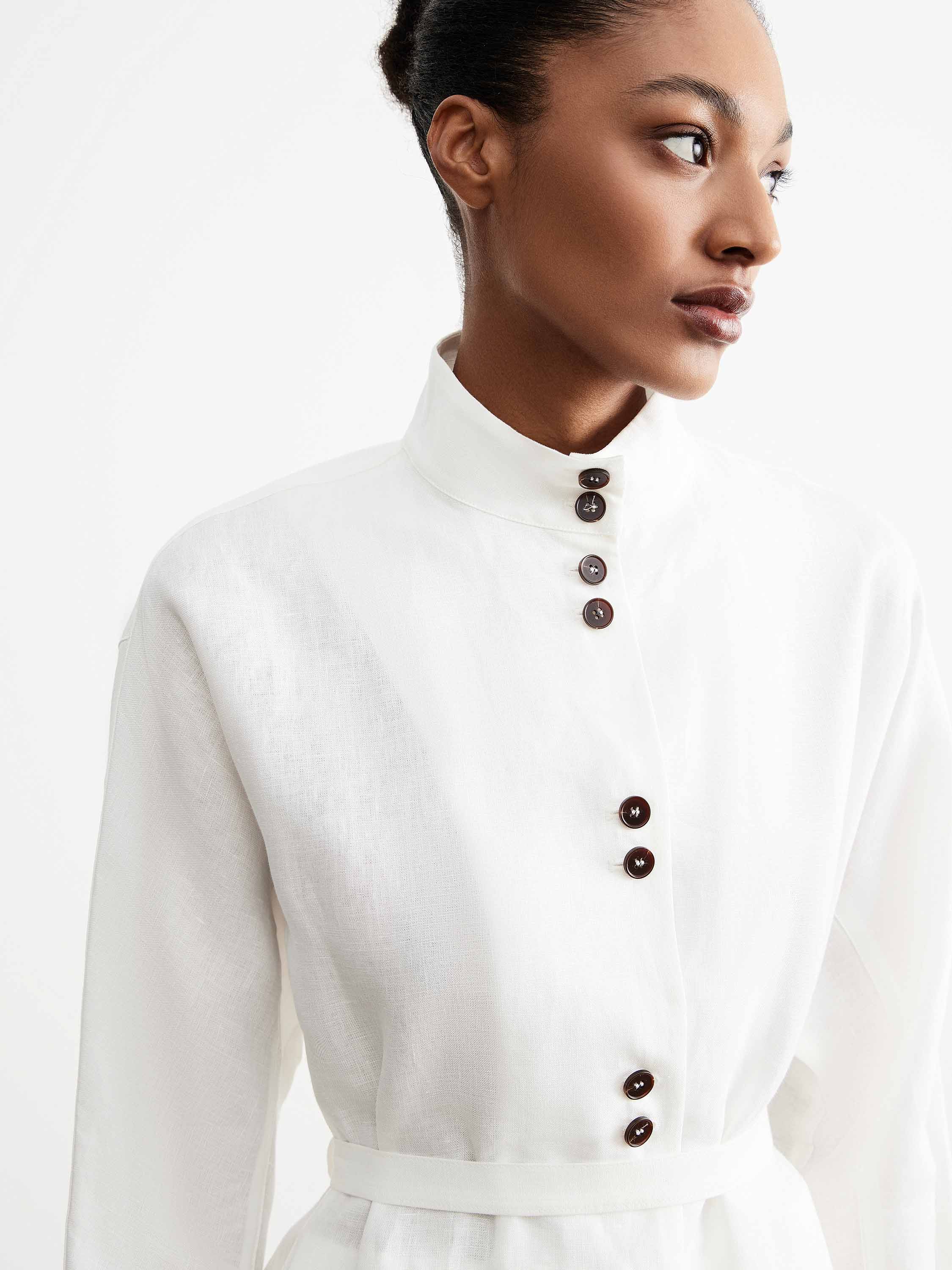 Жакет прямого кроя с полуприлегающим силуэтом и акцентом на линию талии формирует собранную конструкцию без лишнего объема. Высокая стойка задает четкую линию верха, застежка на ряд контрастных пуговиц выстраивает вертикаль, втачной пояс подчеркивает силуэт и фиксирует посадку. Удлиненная линия низа с легким асимметричным заходом добавляет пластики и визуально облегчает форму. Полотно изо льна отличается матовой фактурой и воздухопроницаемостью, сохраняет комфорт в носке; хлопковая подкладка делает посадку более мягкой. Светлый молочный оттенок вписывается в нейтральную палитру. Модель сочетается с юбками и брюками с высокой посадкой, а также с тонким трикотажем и базовыми слоями.