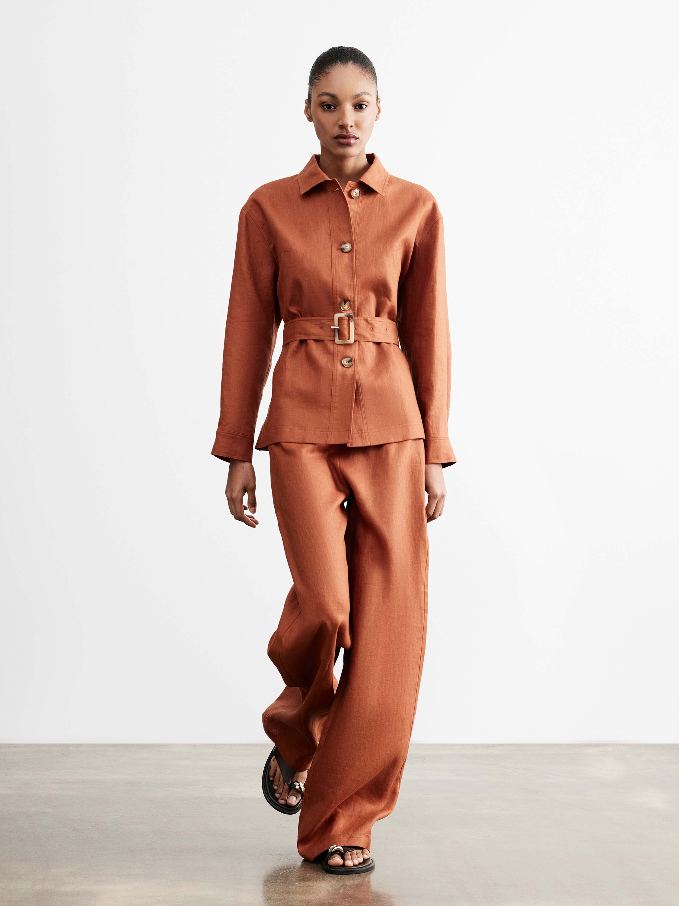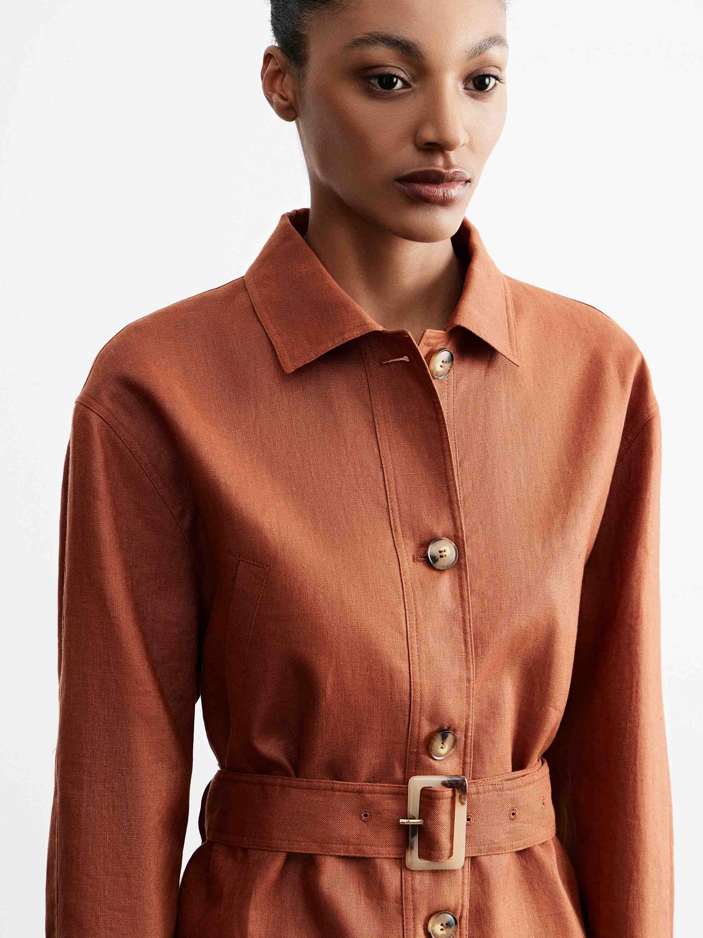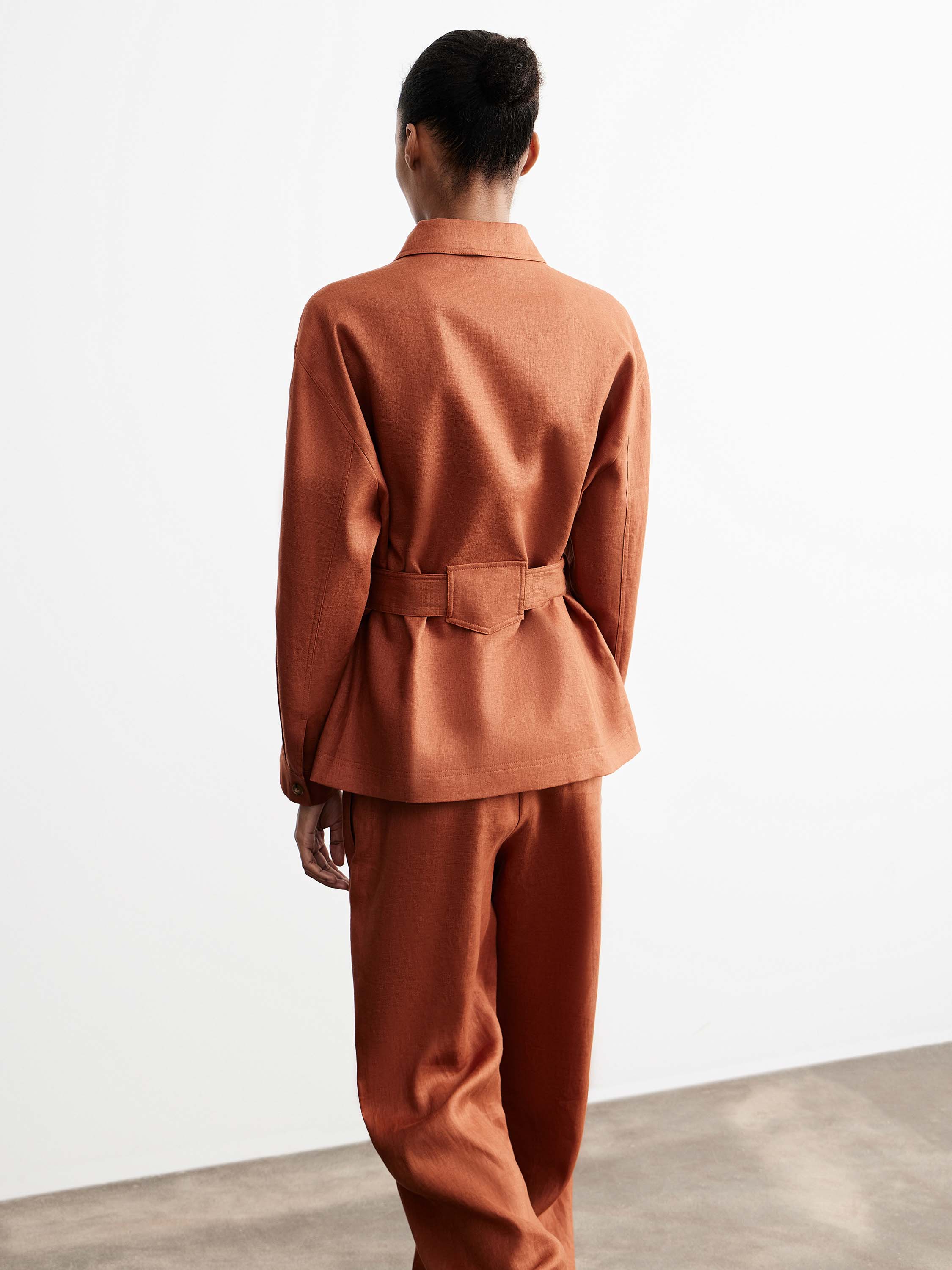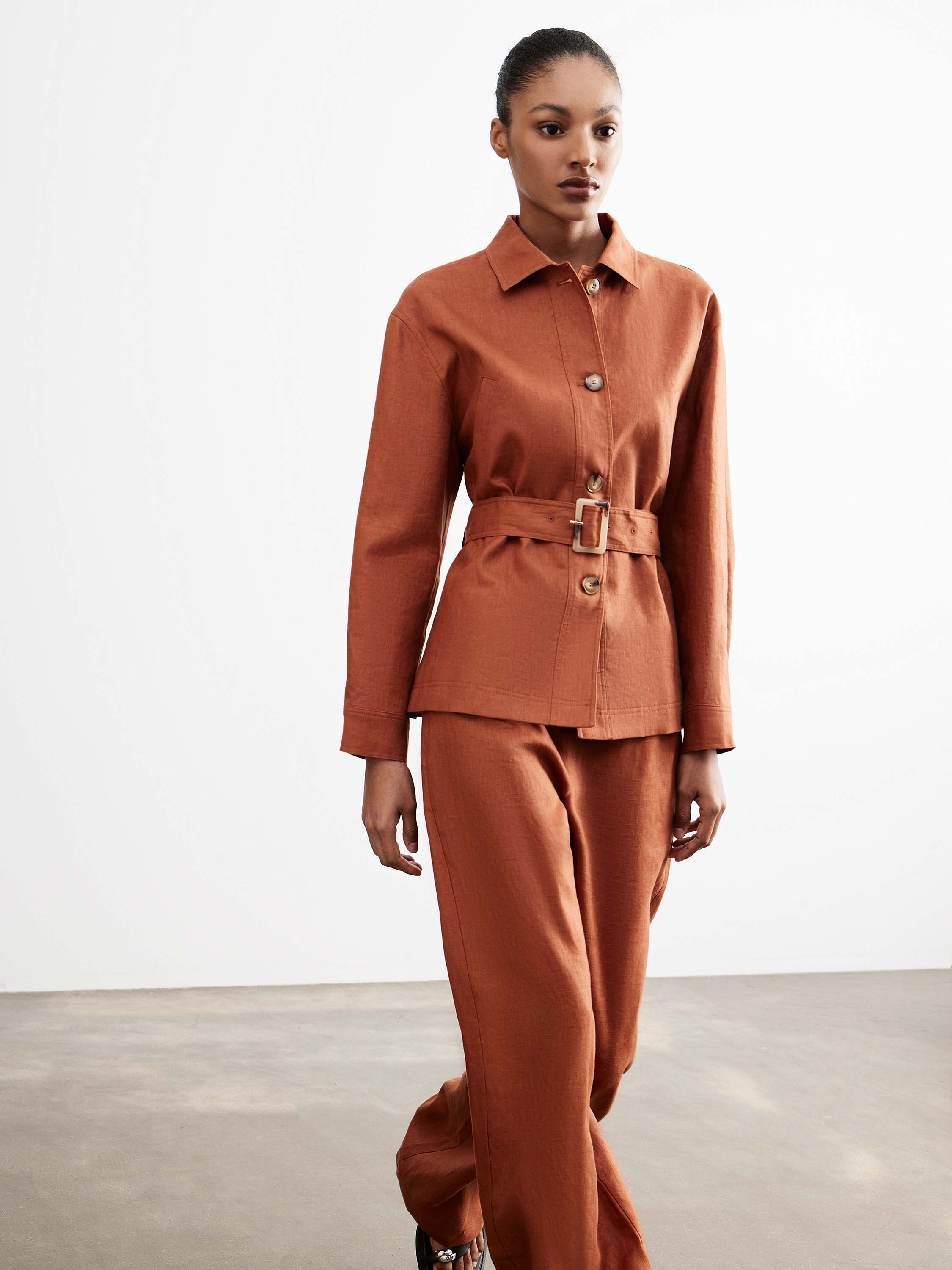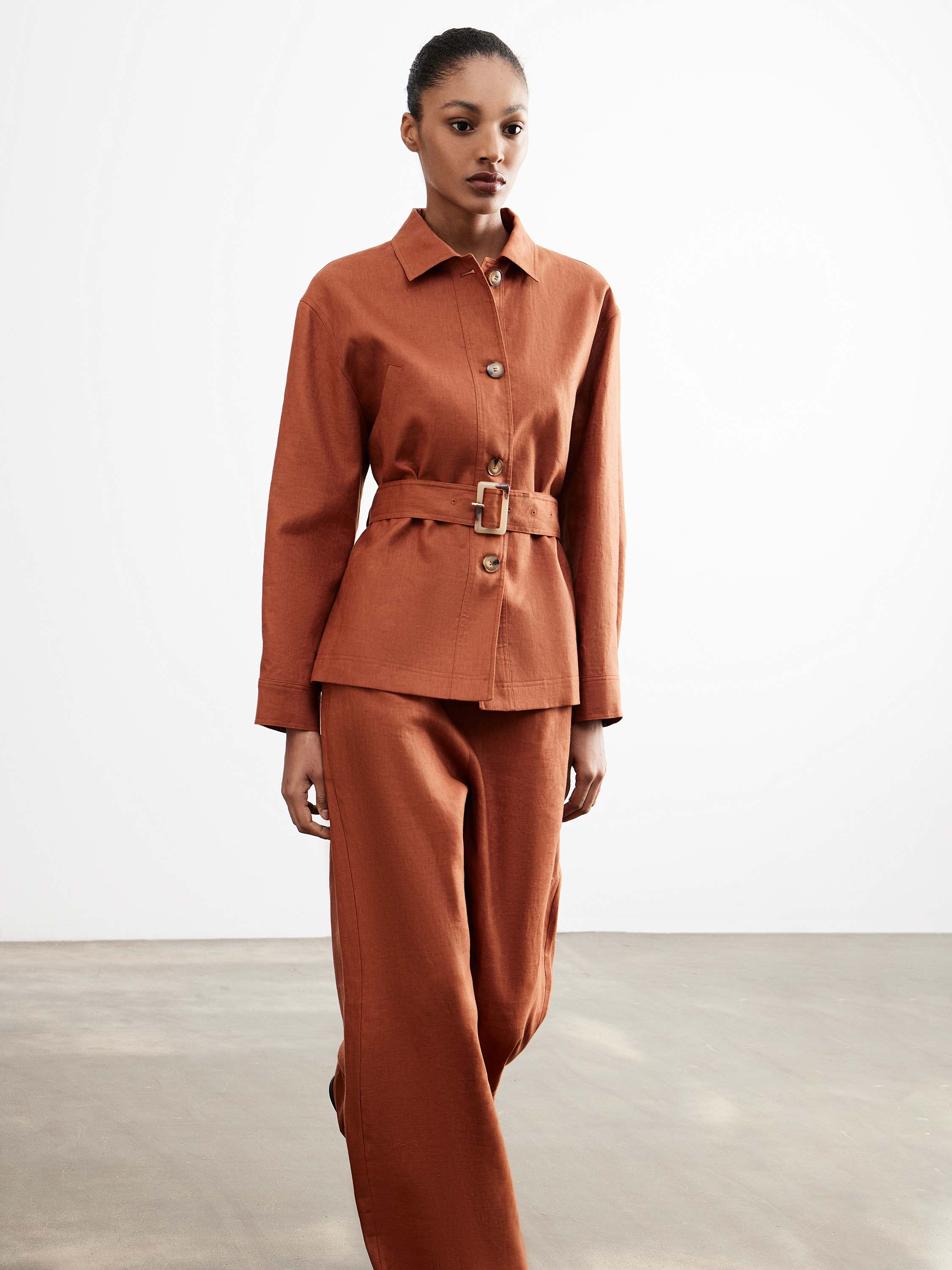 Жакет из плотного полотна с гладкой поверхностью, сохраняющего форму и аккуратный внешний вид. Силуэт приталенный, с акцентом на линию талии за счет широкого пояса с пряжкой. Застежка центральная на крупные пуговицы. Воротник отложной, с четкой линией. По бокам — врезные карманы, аккуратно интегрированные в конструкцию. Линия плеч мягкая, рукав длинный, с прямым кроем. Оттенок — светлый бежево-кремовый. Сочетается с брюками и джинсами, а также с юбками и базовым трикотажем, дополняется обувью на каблуке или плоском ходу.