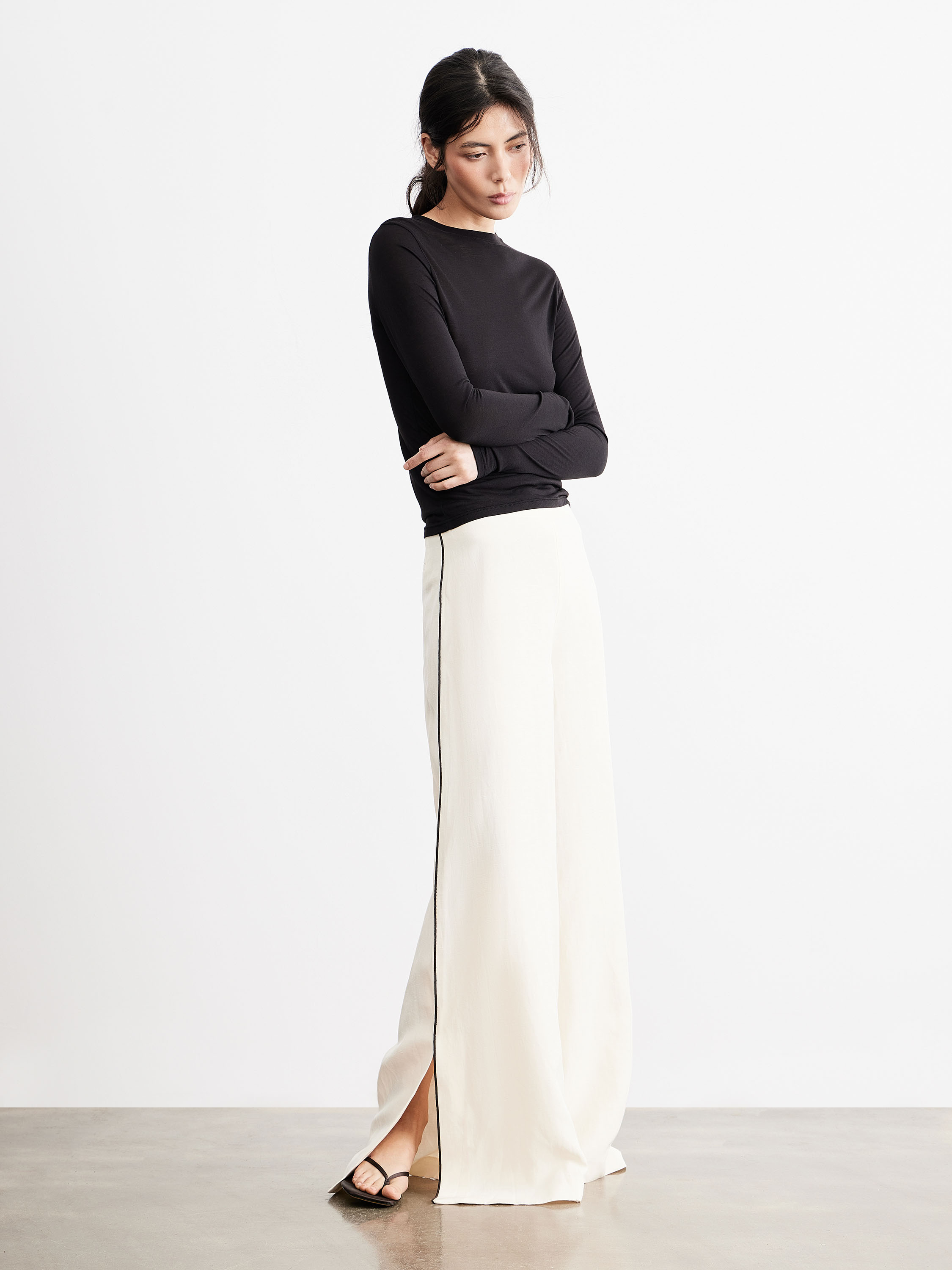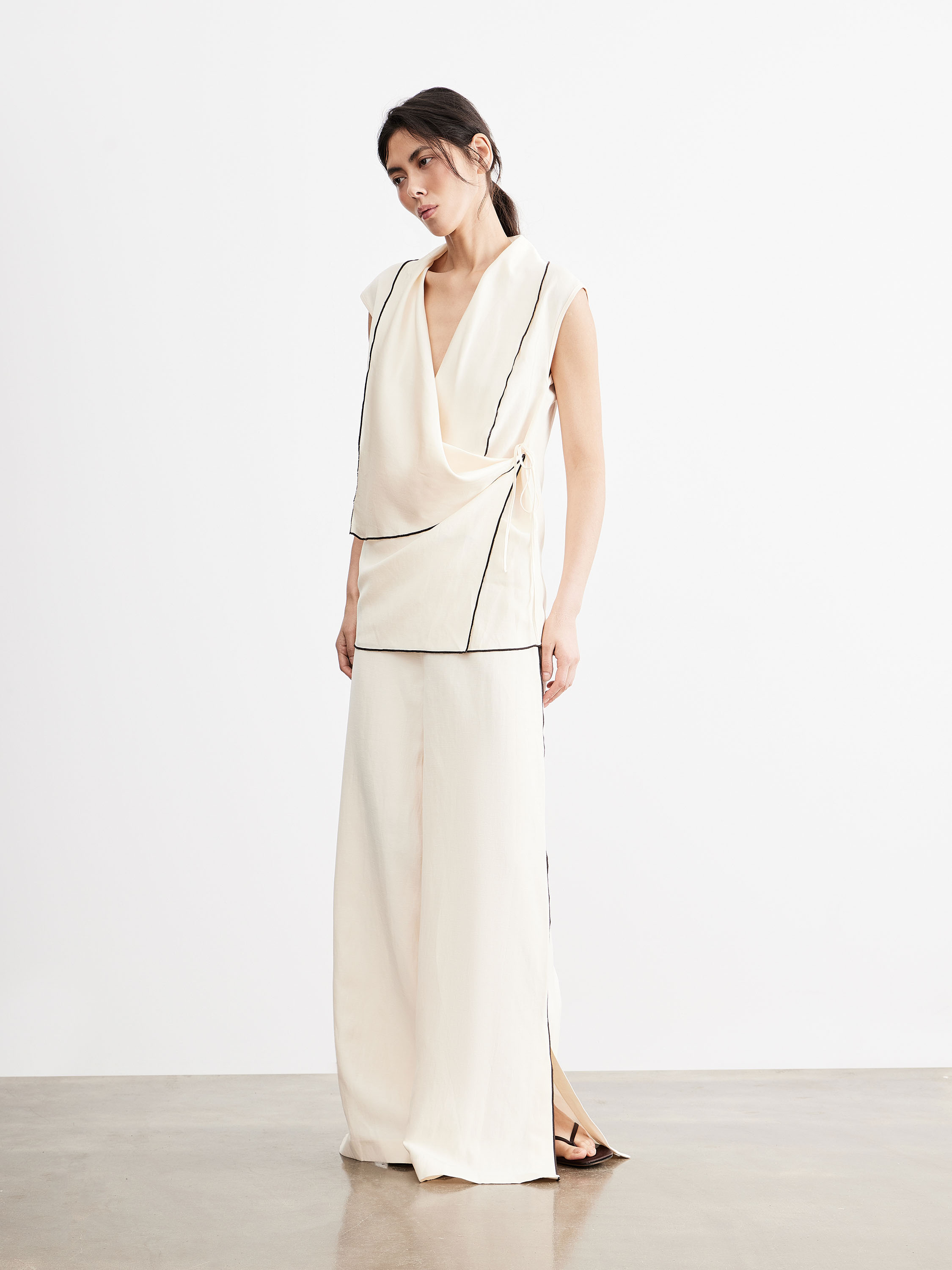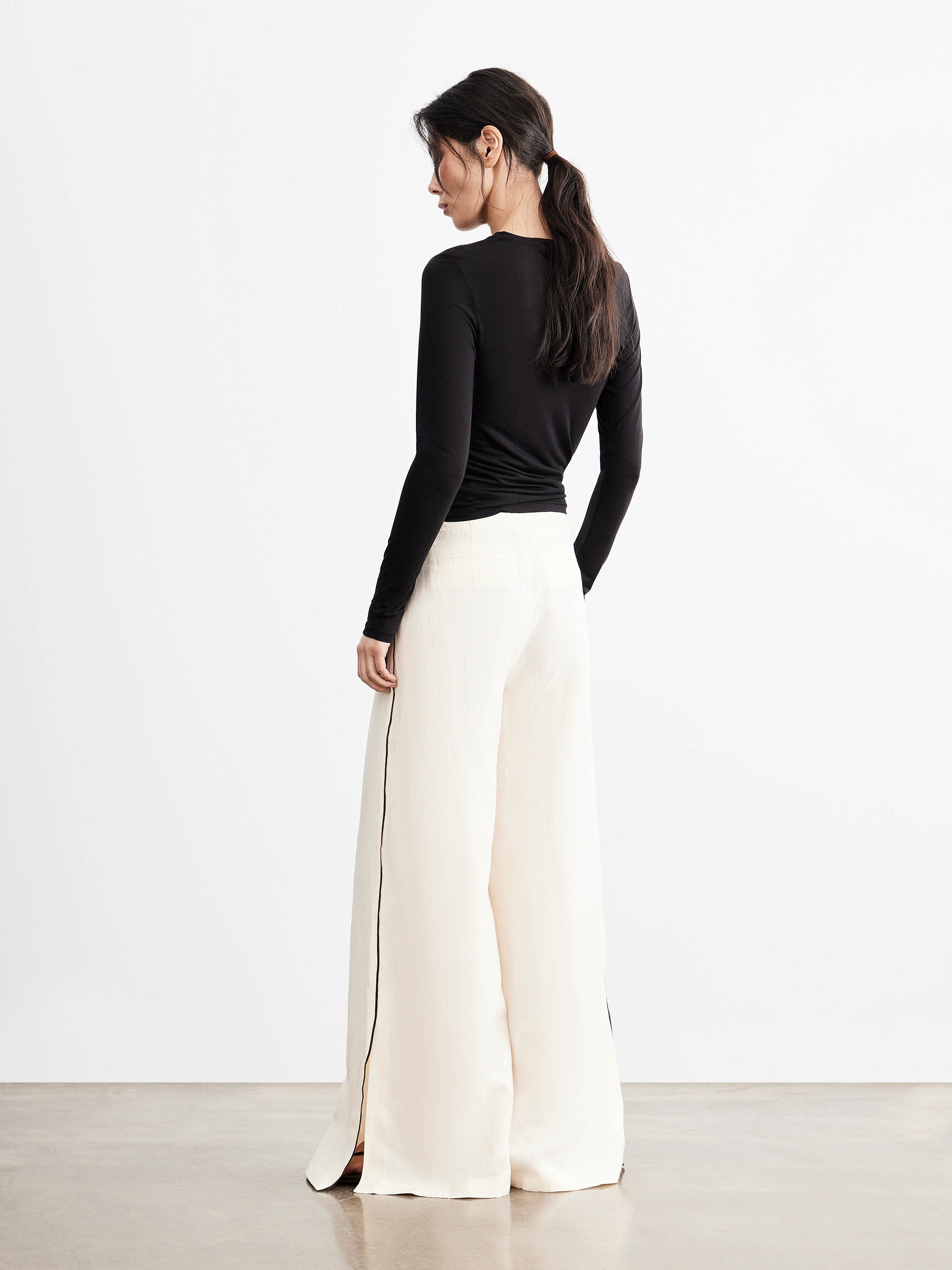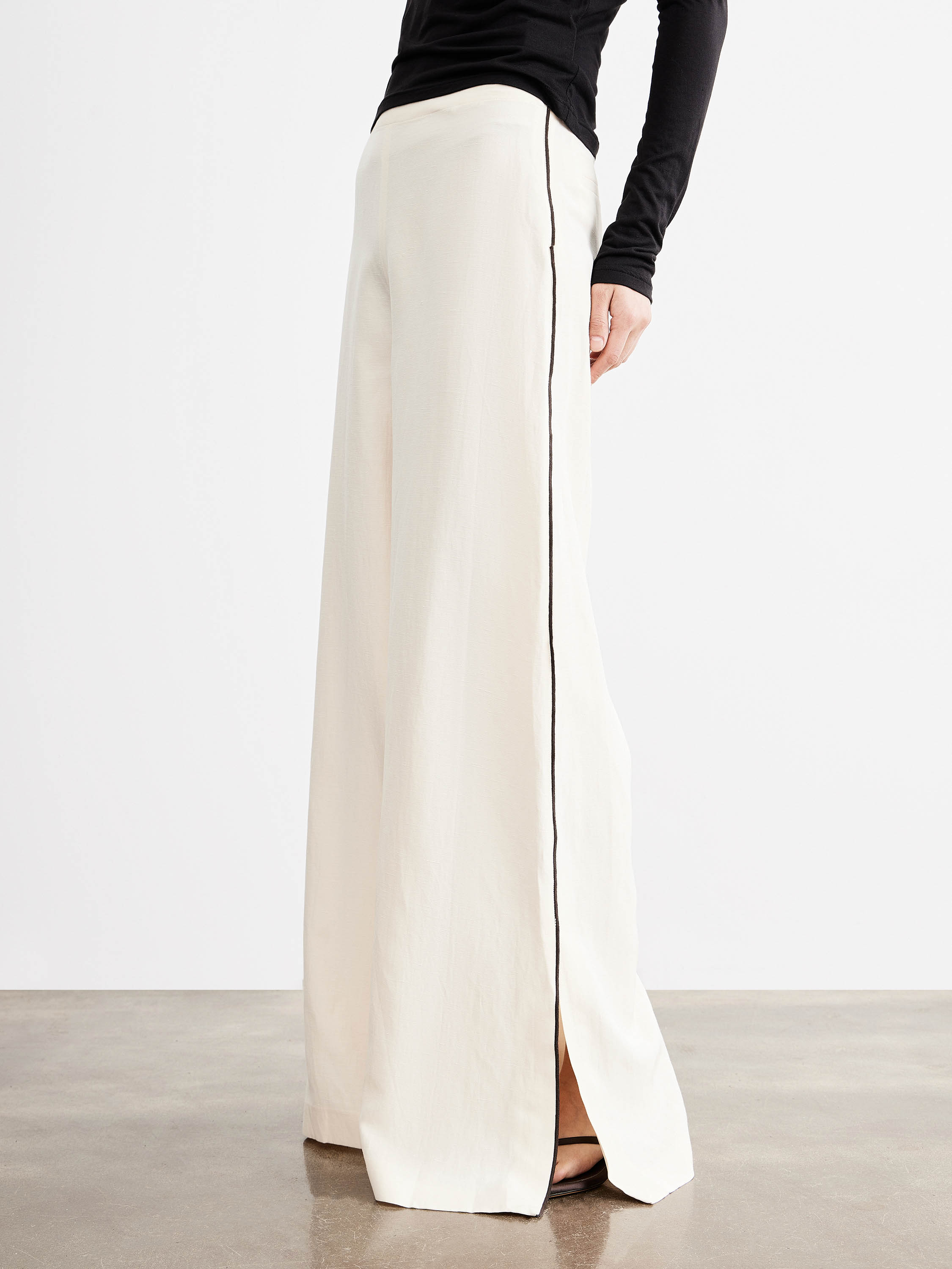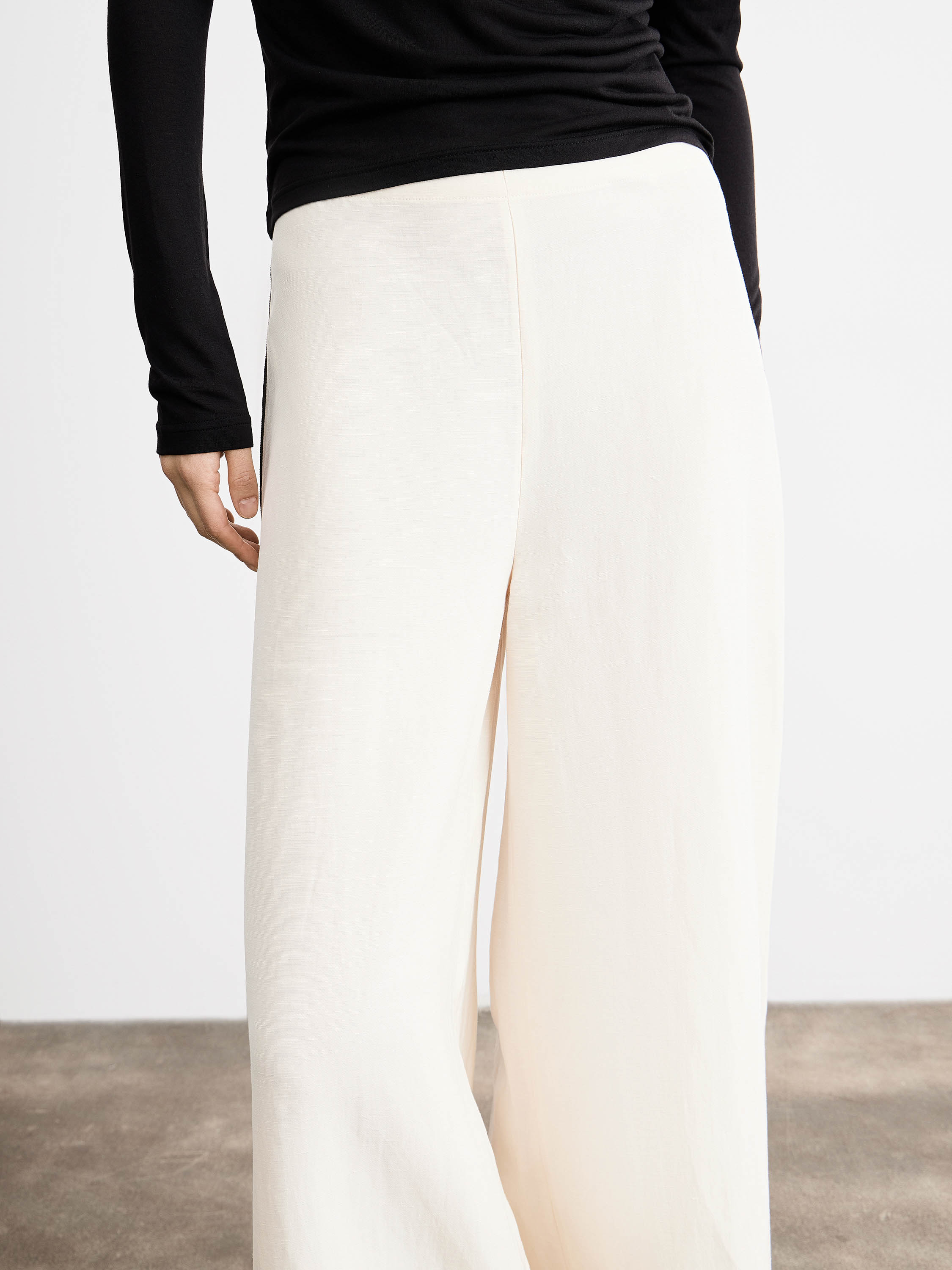 Брюки прямого кроя с посадкой по линии талии формируют вытянутый силуэт без лишнего объема. Линия пояса выполнена минималистично, без акцентных деталей, боковые швы дополнены контрастной вставкой, которая выстраивает четкую вертикаль и визуально удлиняет пропорции. Разрезы по низу добавляют свободу движения и делают форму легче. Смесовое полотно на основе района с добавлением льна и хлопка отличается гладкой поверхностью и мягкой пластикой; район делает материал более текучим и комфортным в носке, лен добавляет воздухопроницаемость и характерную текстуру, хлопок стабилизирует структуру. Хлопковая подкладка делает посадку более мягкой и комфортной к телу. Светлый молочный оттенок с контрастной линией вписывается в нейтральную палитру. Модель сочетается с лаконичными топами, рубашками и тонким трикотажем, дополняется жакетами и легкими слоями.