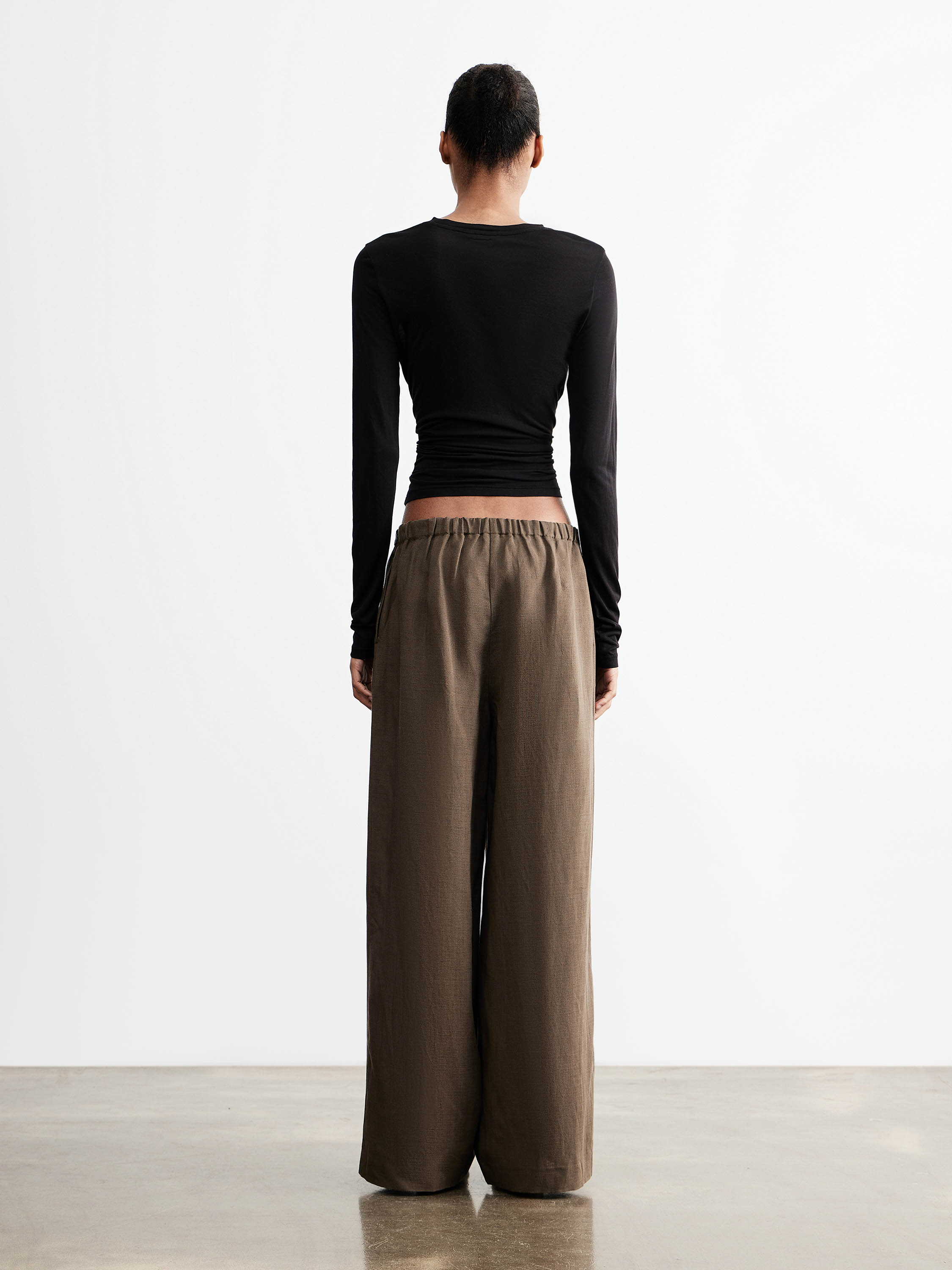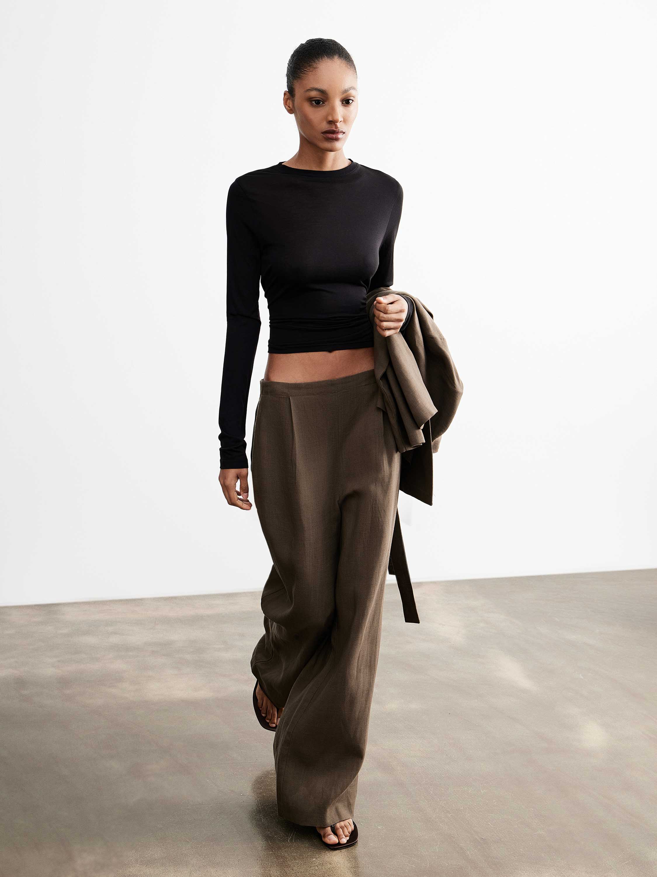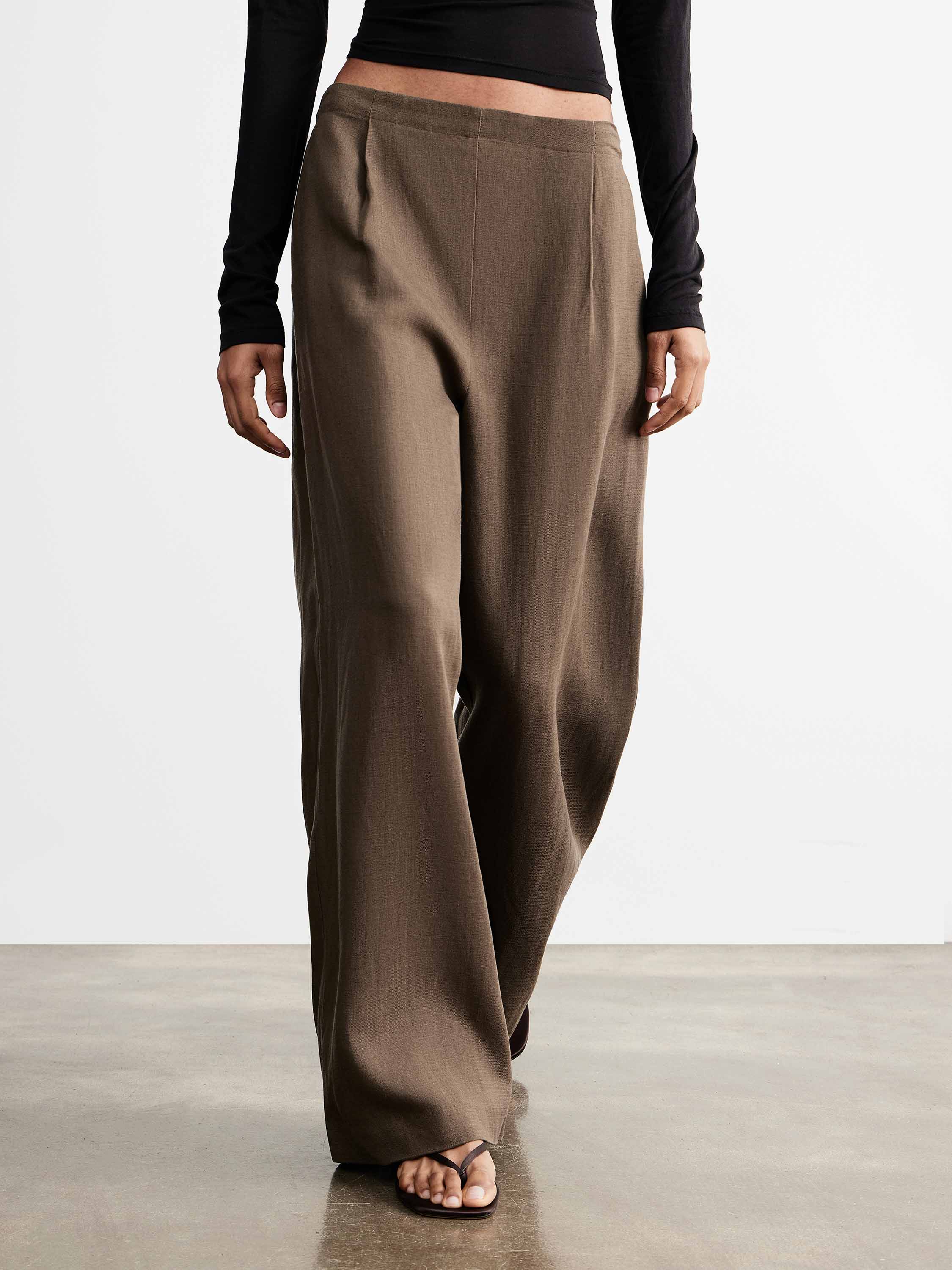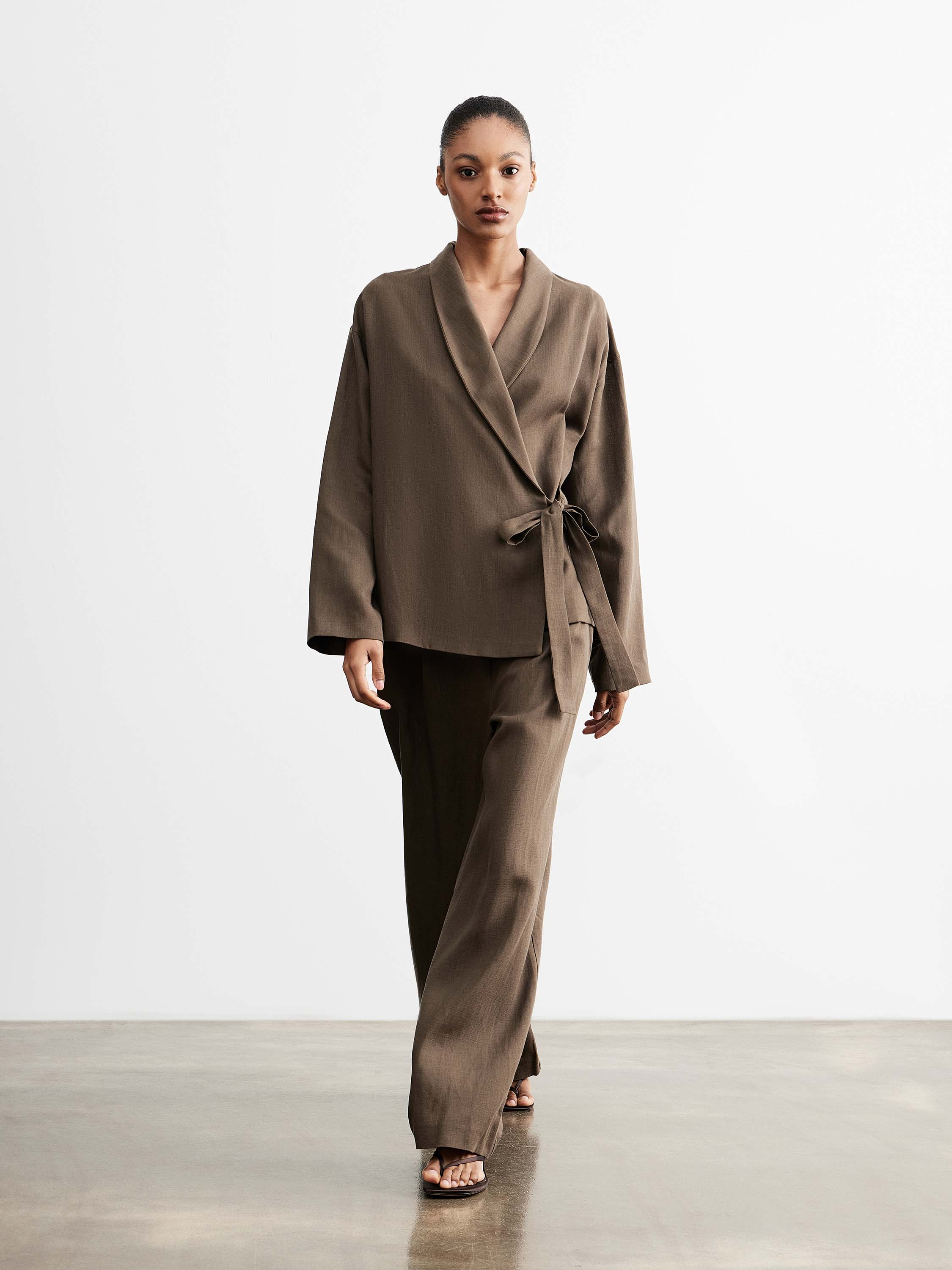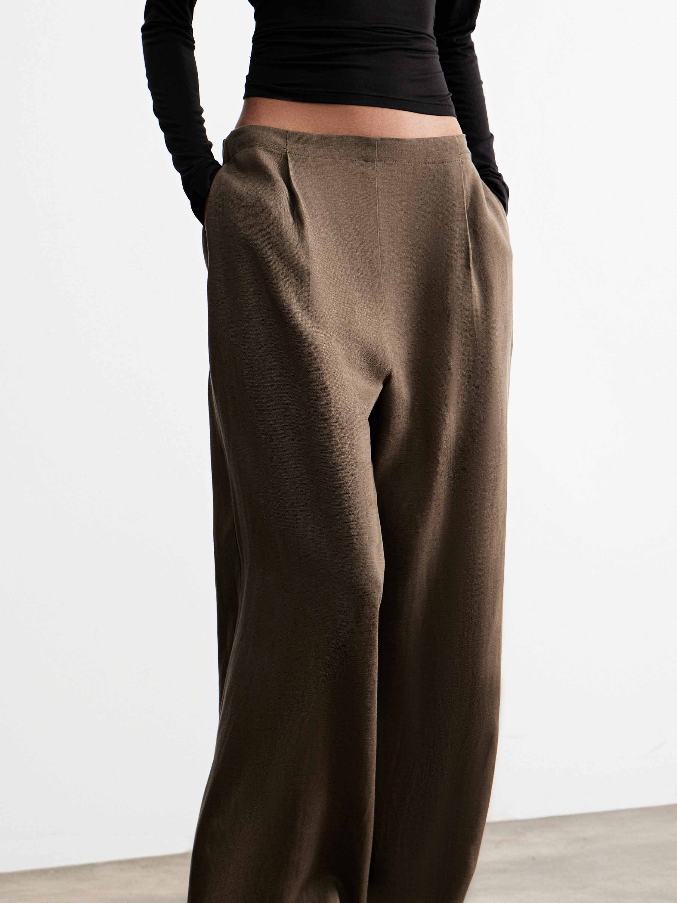 Брюки прямого кроя со средней посадкой, расположенной чуть выше линии бедер, формируют вытянутый силуэт без лишнего объема. Свободная линия по бедру и мягкое расширение книзу выравнивают пропорции и обеспечивают комфорт в движении. Линия пояса минималистичная, без шлевок, подчеркивает чистоту конструкции; боковые карманы встроены в шов и не утяжеляют форму. Смесовое полотно на основе тенсела с добавлением льна отличается гладкой поверхностью и мягкой пластикой; тенсел — волокно из древесной целлюлозы, которое делает материал более мягким, дышащим и устойчивым к сминанию, лен добавляет воздухопроницаемость и естественную фактуру. Модель дополнена хлопковой подкладкой. Глубокий коричневый оттенок вписывается в теплую и нейтральную палитру. Брюки сочетаются с рубашками, топами и тонким трикотажем, дополняются жакетами и легкими слоями.