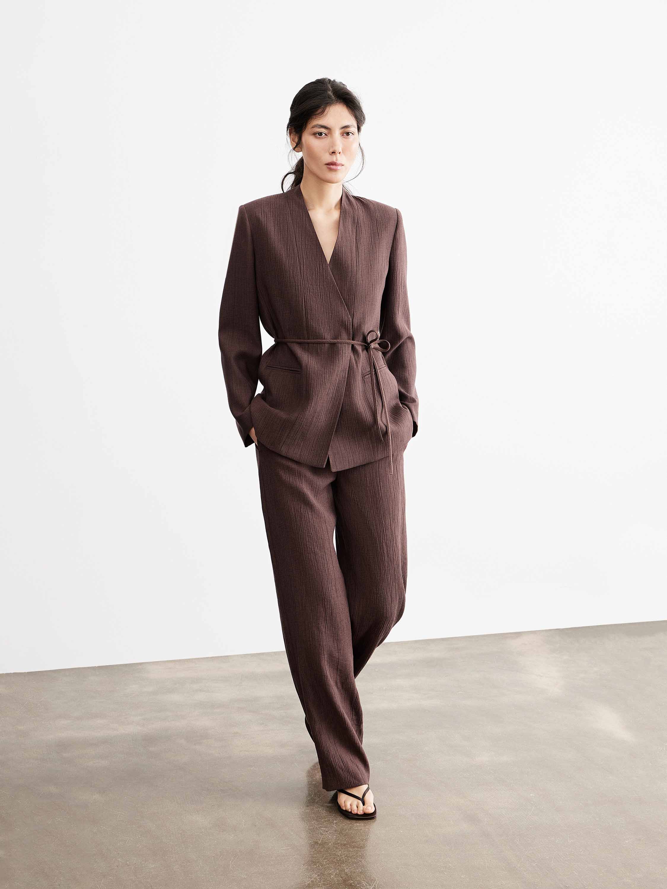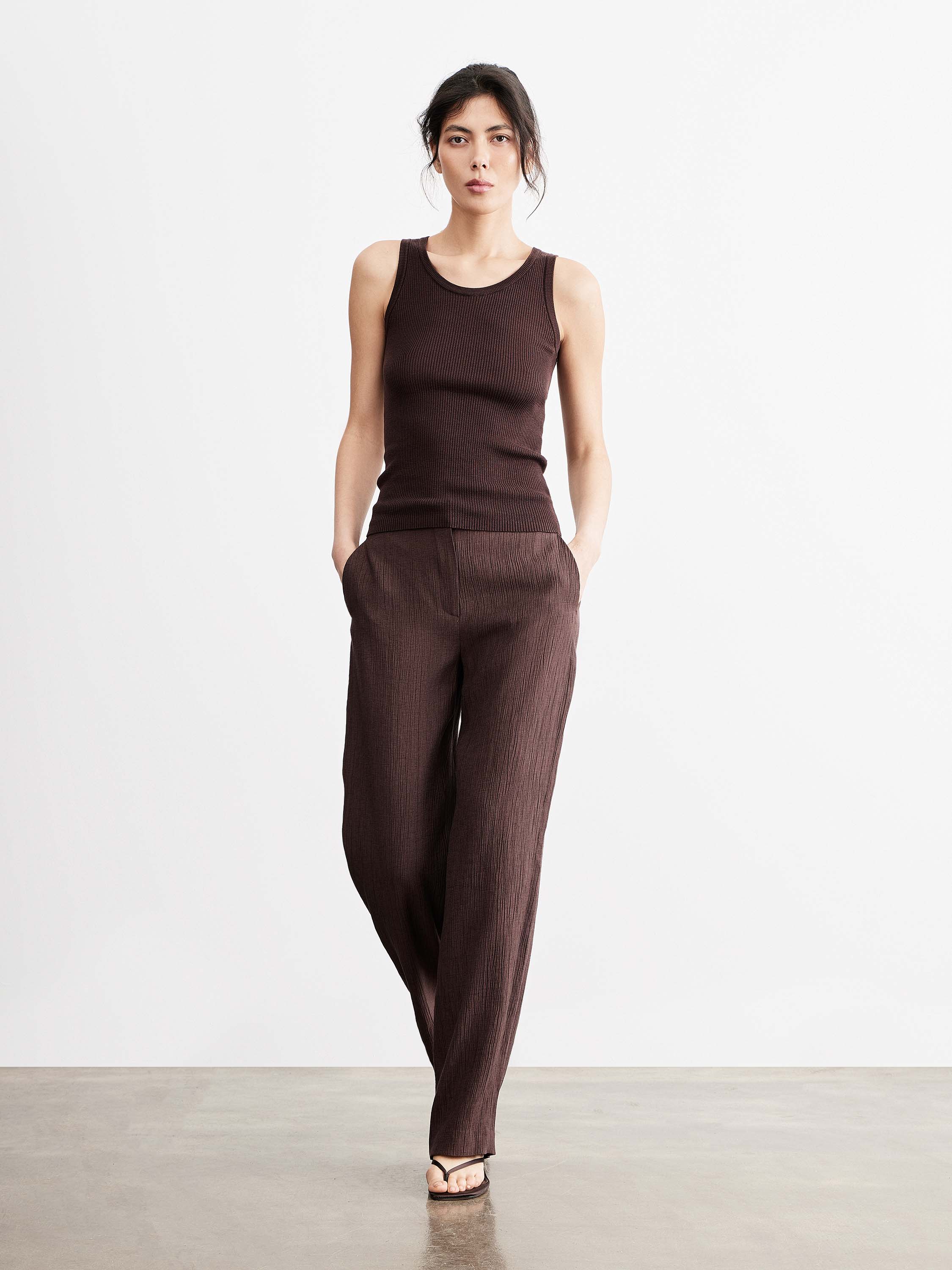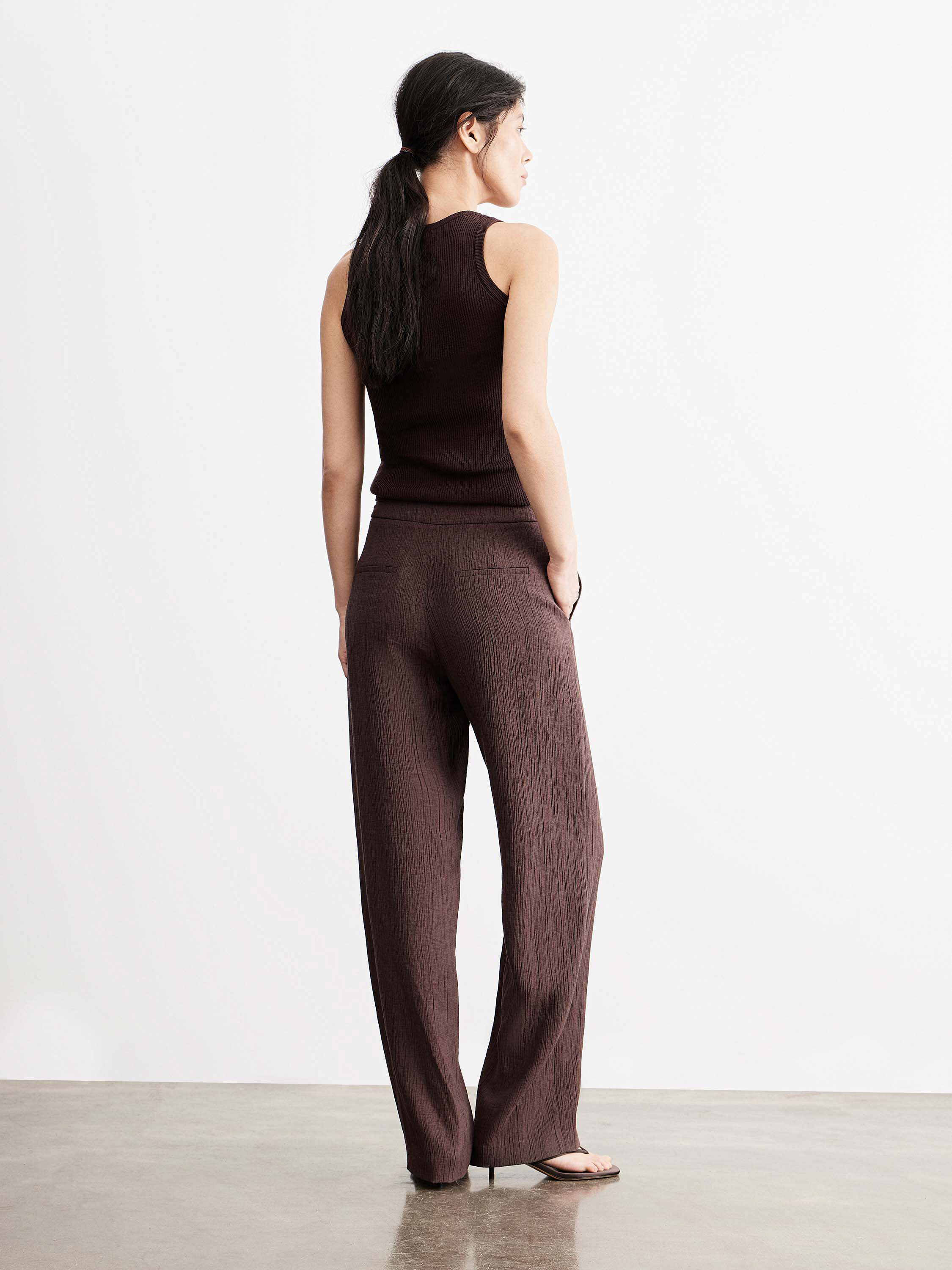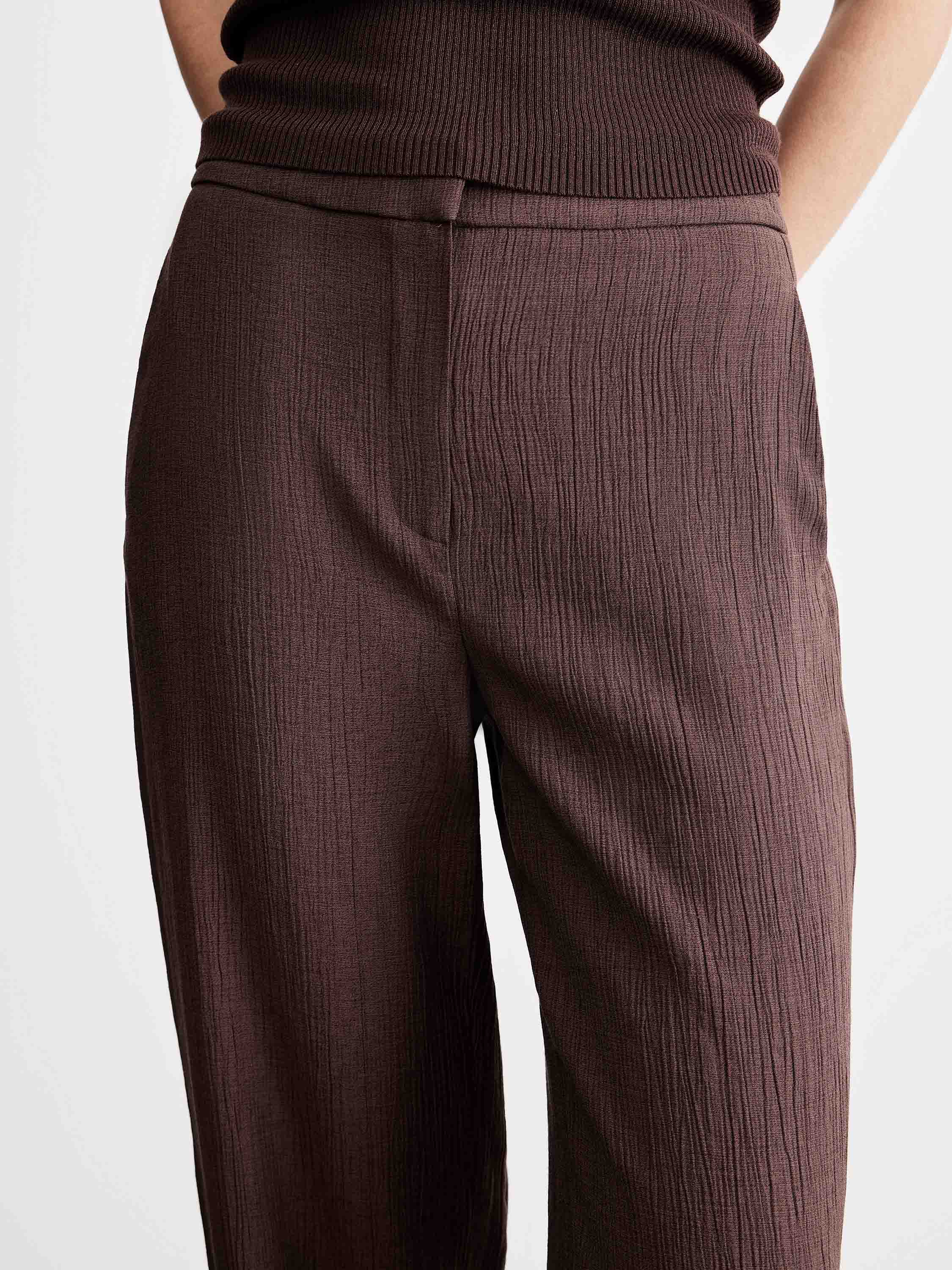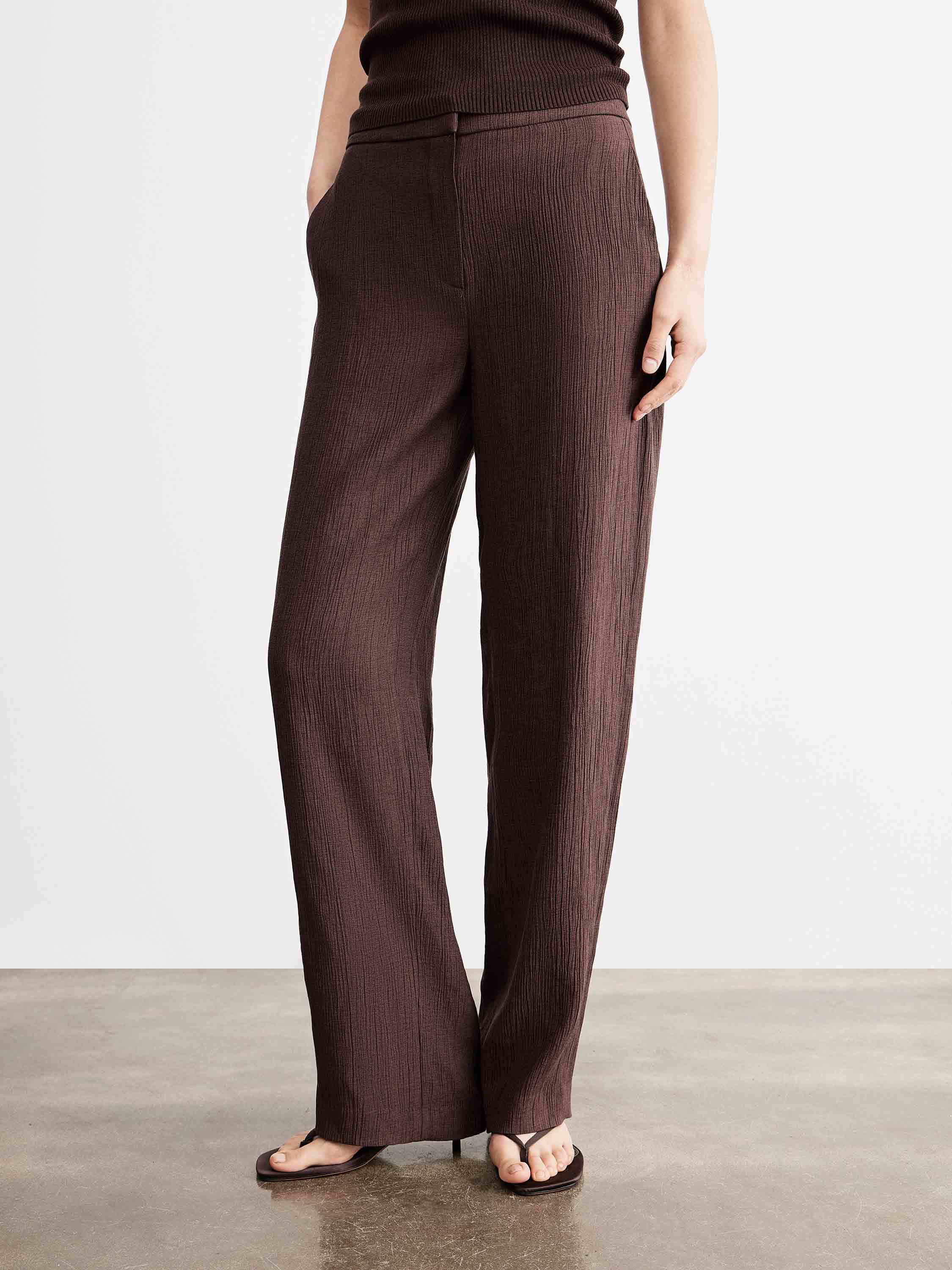 Брюки прямого кроя с умеренно свободной посадкой формируют вытянутый силуэт без лишнего объема. Минималистичная линия пояса без акцентных деталей сохраняет чистоту конструкции, боковые карманы встроены в шов и не утяжеляют форму. Легкое расширение книзу выравнивает пропорции и добавляет свободу движения. Смесовое полотно на основе вискозы с добавлением полиэстера и шерсти отличается мягкой пластикой и стабильной формой; вискоза делает поверхность более гладкой и комфортной, полиэстер повышает износостойкость и снижает сминаемость, шерсть добавляет плотность и аккуратный внешний вид. Легкая рельефная фактура визуально сглаживает складки и не требует идеальной глажки. Хлопковая подкладка делает посадку более мягкой и комфортной к телу. Глубокий темно-коричневый оттенок вписывается в сдержанную базовую палитру. Модель сочетается с рубашками, топами и тонким трикотажем, дополняется жакетами и легкими слоями.