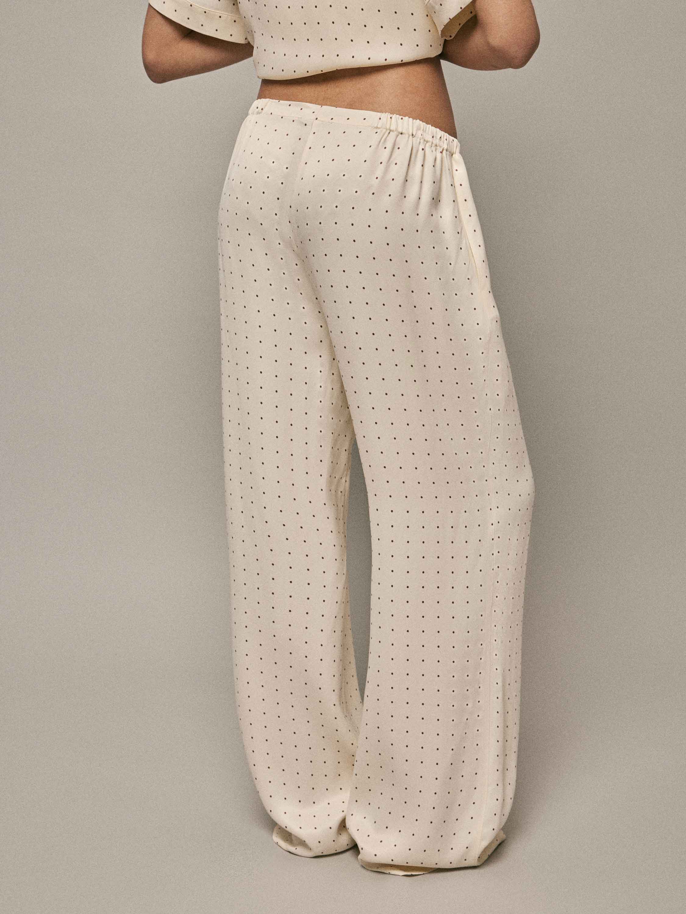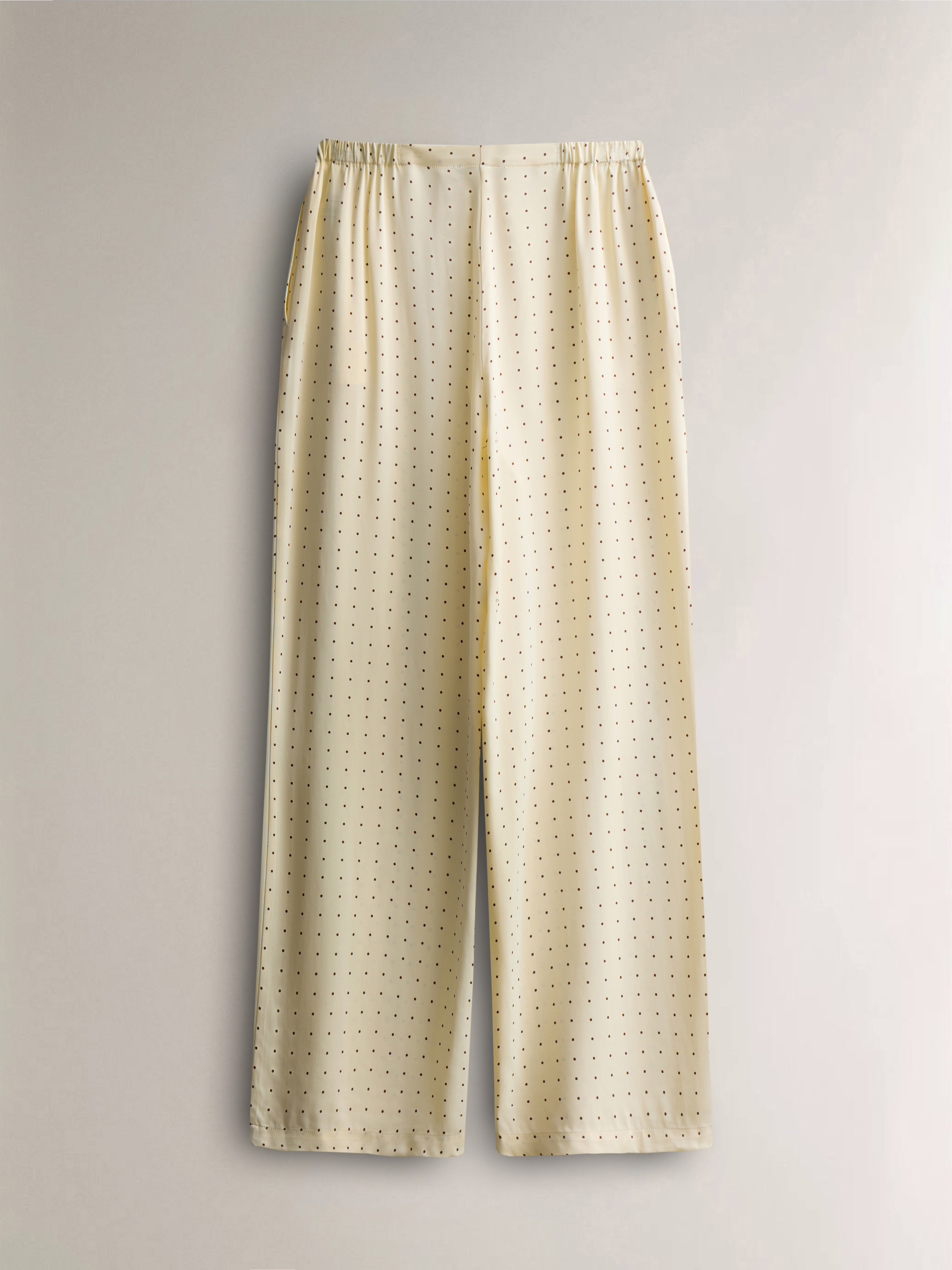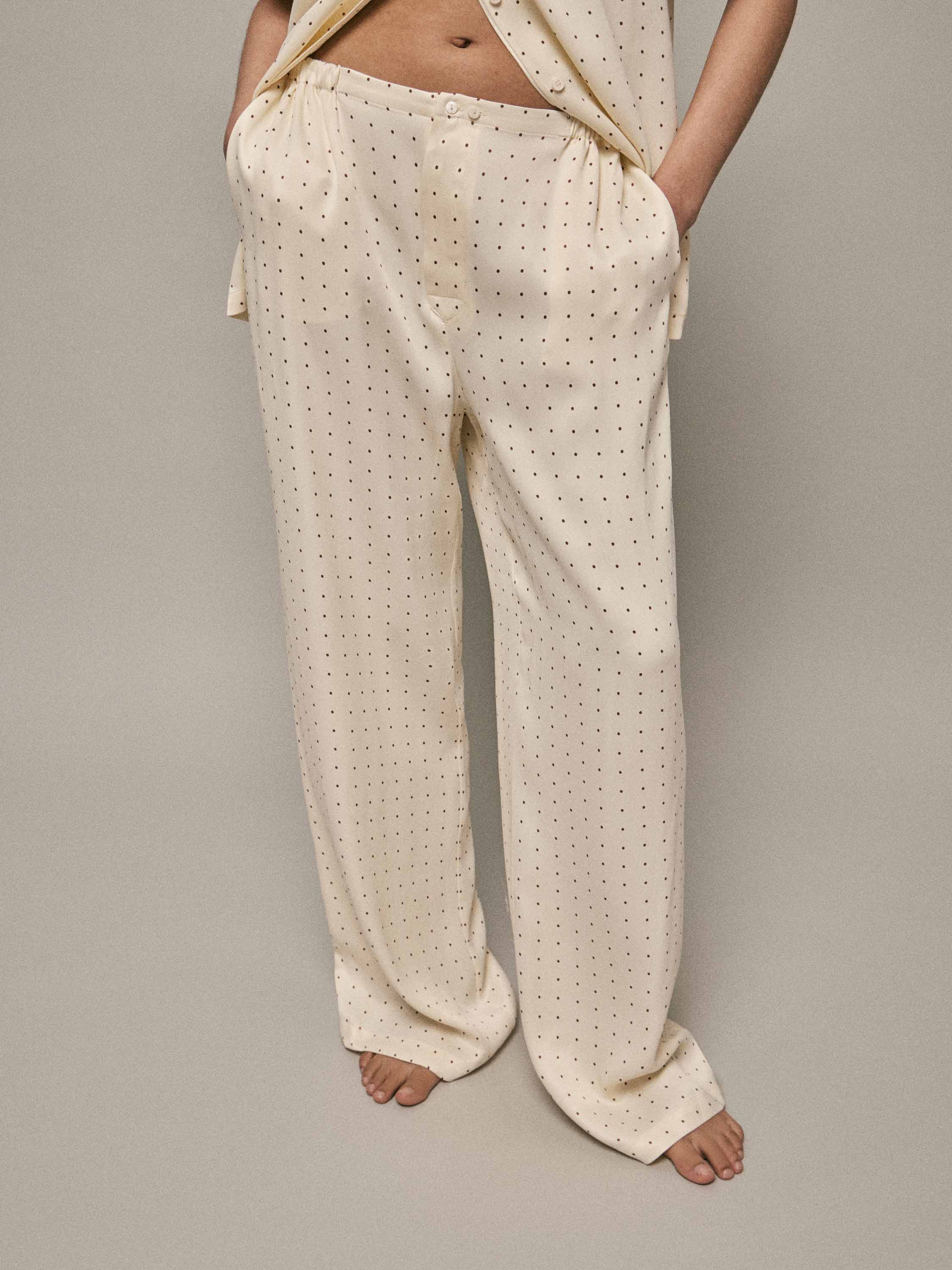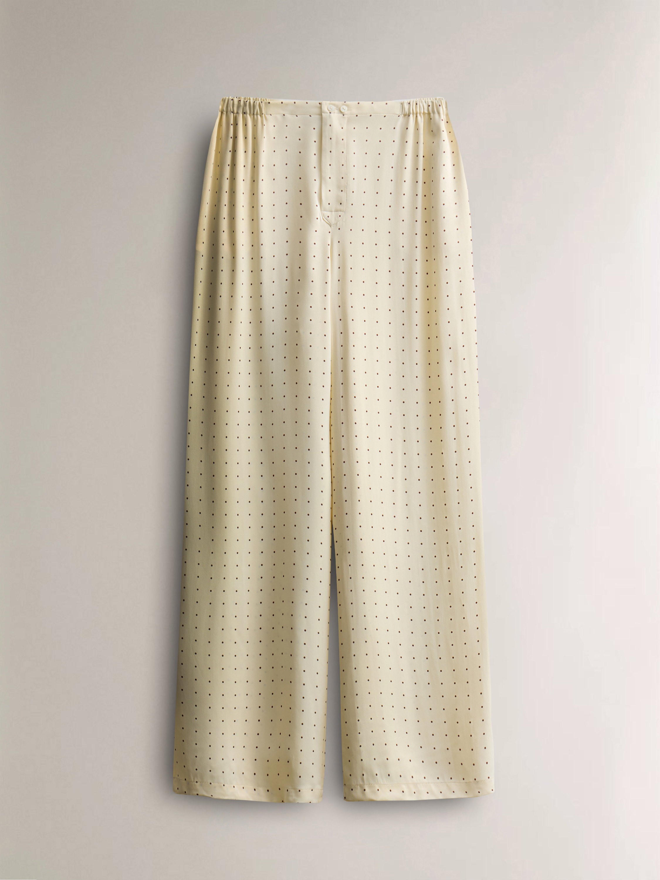 Брюки выполнены из района — легкого, текучего материала с гладкой, шелковистой поверхностью и мягким естественным блеском. Ткань свободно ложится, красиво драпируется и остается приятной при носке, создавая расслабленный, но аккуратный силуэт. Кремовый оттенок выглядит чисто и спокойно, подчеркивая нежную фактуру материала и деликатный характер модели. Мелкий равномерный рисунок добавляет визуальную глубину, не утяжеляя образ и сохраняя ощущение легкости. Крой прямой и свободный, с мягкой линией бедра и комфортной посадкой на талии. Эластичный пояс с застежкой обеспечивает удобство и аккуратный внешний вид, не нарушая общей пластики изделия. Брюки органично сочетаются с пижамной рубашкой из той же ткани и легко вписываются в домашний гардероб, где важны комфорт, тактильность и продуманная, ненавязчивая эстетика.