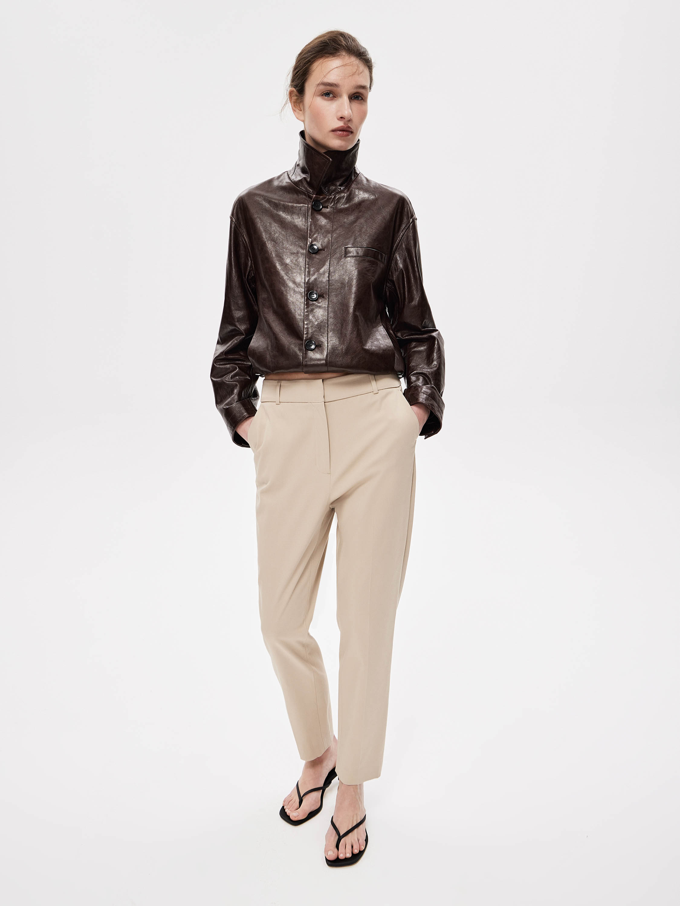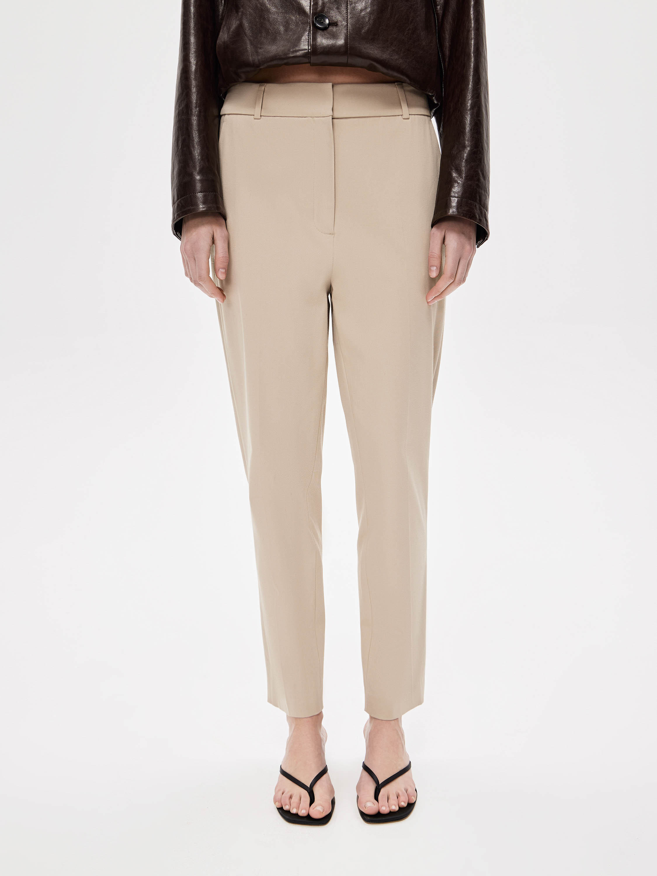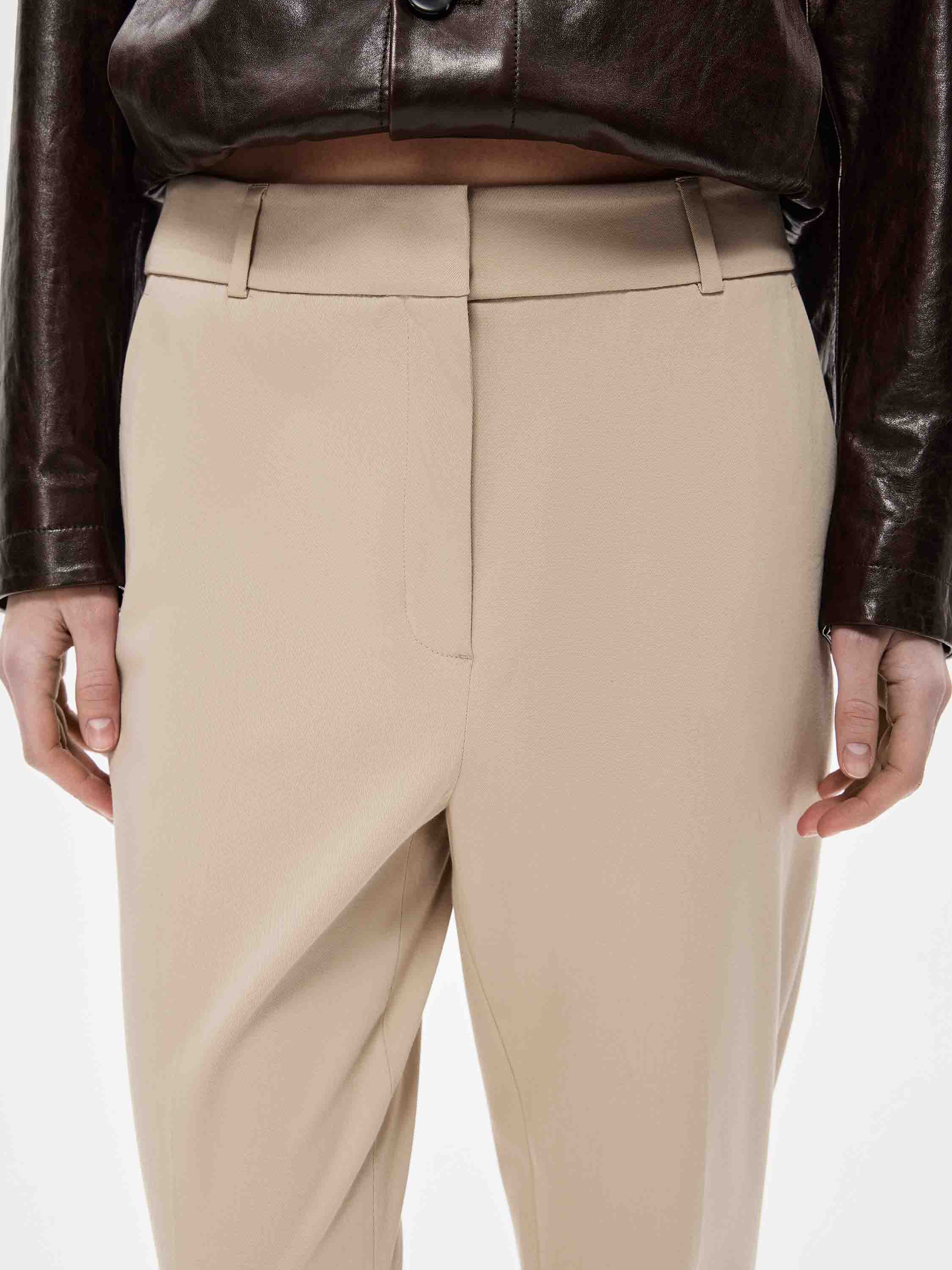 Брюки из хлопкового полотна с добавлением эластана. Плотный материал с ровной, матовой поверхностью хорошо держит форму и остается комфортным в носке. Посадка выстроена по талии, силуэт прямой, без излишнего объема, с чистой вертикалью линии ног. Спереди — аккуратные застроченные стрелки, которые структурируют силуэт и визуально вытягивают пропорции. По бокам предусмотрены прорезные карманы, выполненные деликатно и почти незаметно, без нарушения общей линии. Застежка скрыта, конструкция выглядит цельной и сдержанной. Оттенок — нейтральный, легко встраивается в базовый гардероб и сочетается как с костюмной группой, так и с более расслабленным верхом.