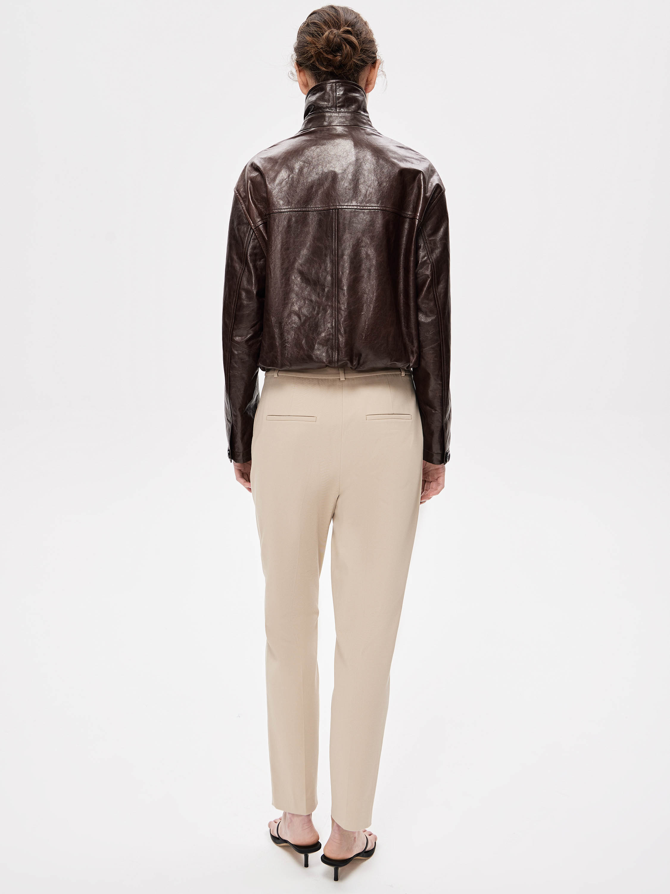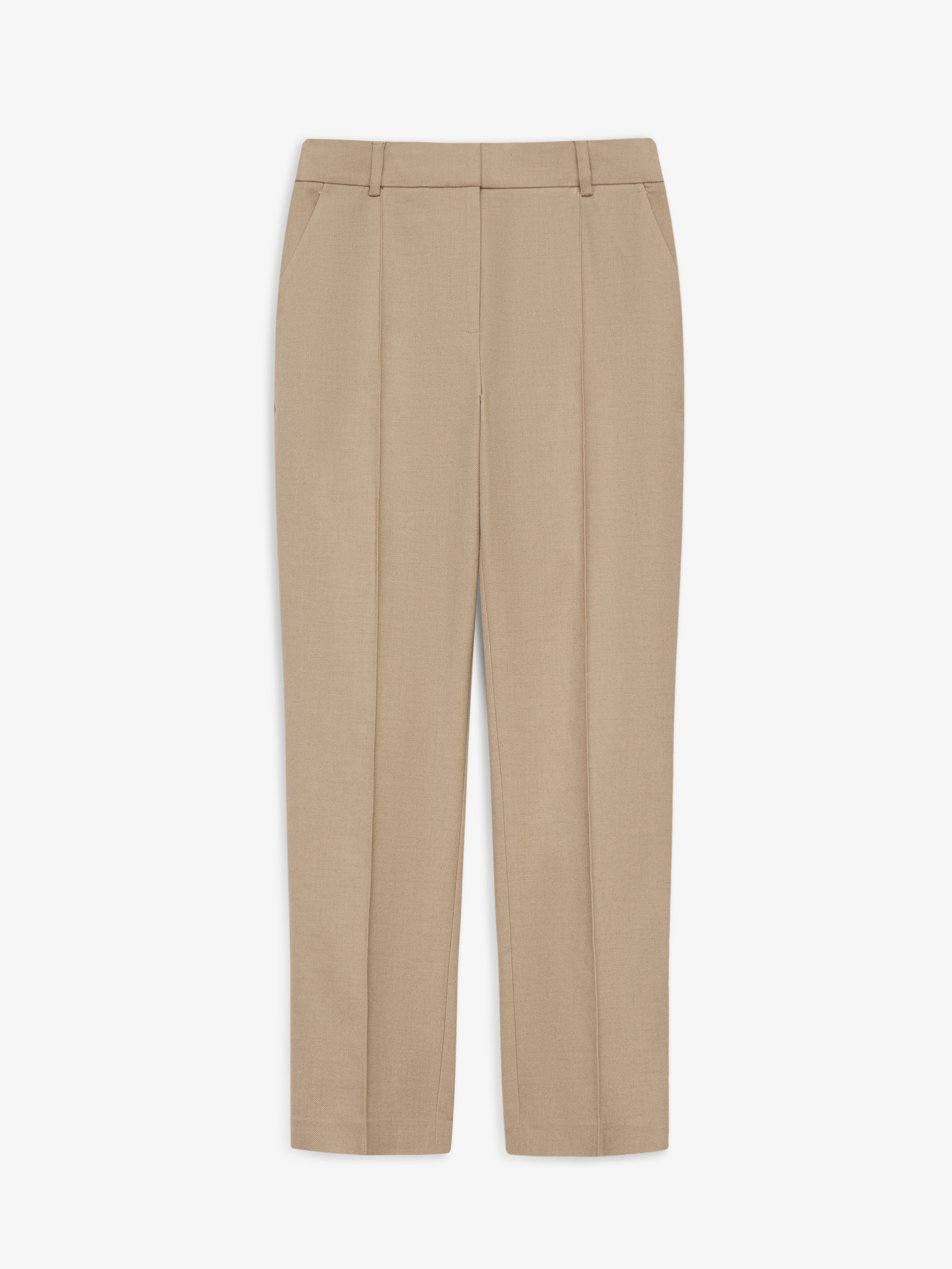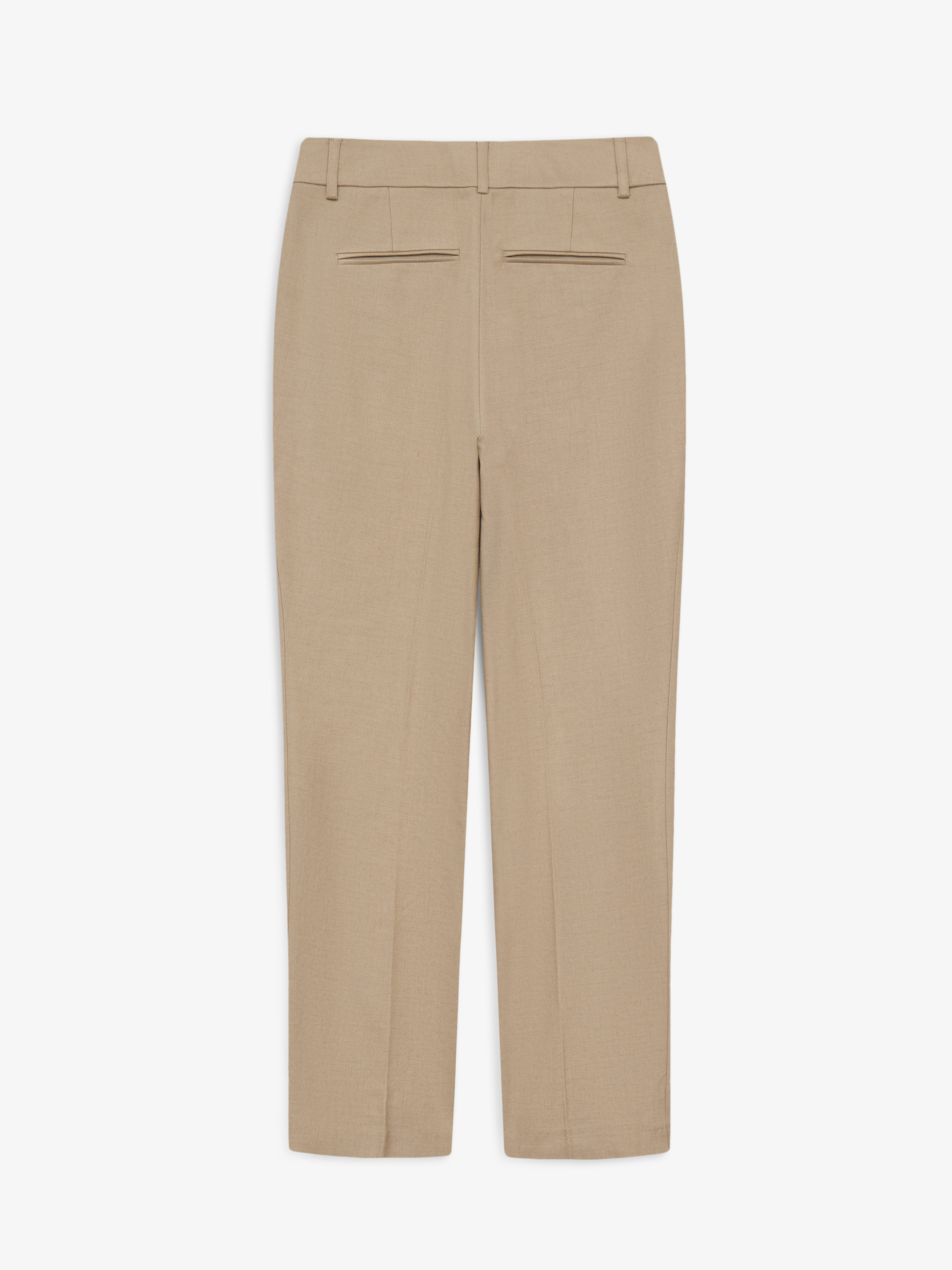 Брюки из хлопкового полотна с добавлением эластана. Плотный материал с ровной, матовой поверхностью хорошо держит форму и остается комфортным в носке. Посадка выстроена по талии, силуэт прямой, без излишнего объема, с чистой вертикалью линии ног. Спереди — аккуратные застроченные стрелки, которые структурируют силуэт и визуально вытягивают пропорции. По бокам предусмотрены прорезные карманы, выполненные деликатно и почти незаметно, без нарушения общей линии. Застежка скрыта, конструкция выглядит цельной и сдержанной. Оттенок — нейтральный, легко встраивается в базовый гардероб и сочетается как с костюмной группой, так и с более расслабленным верхом.