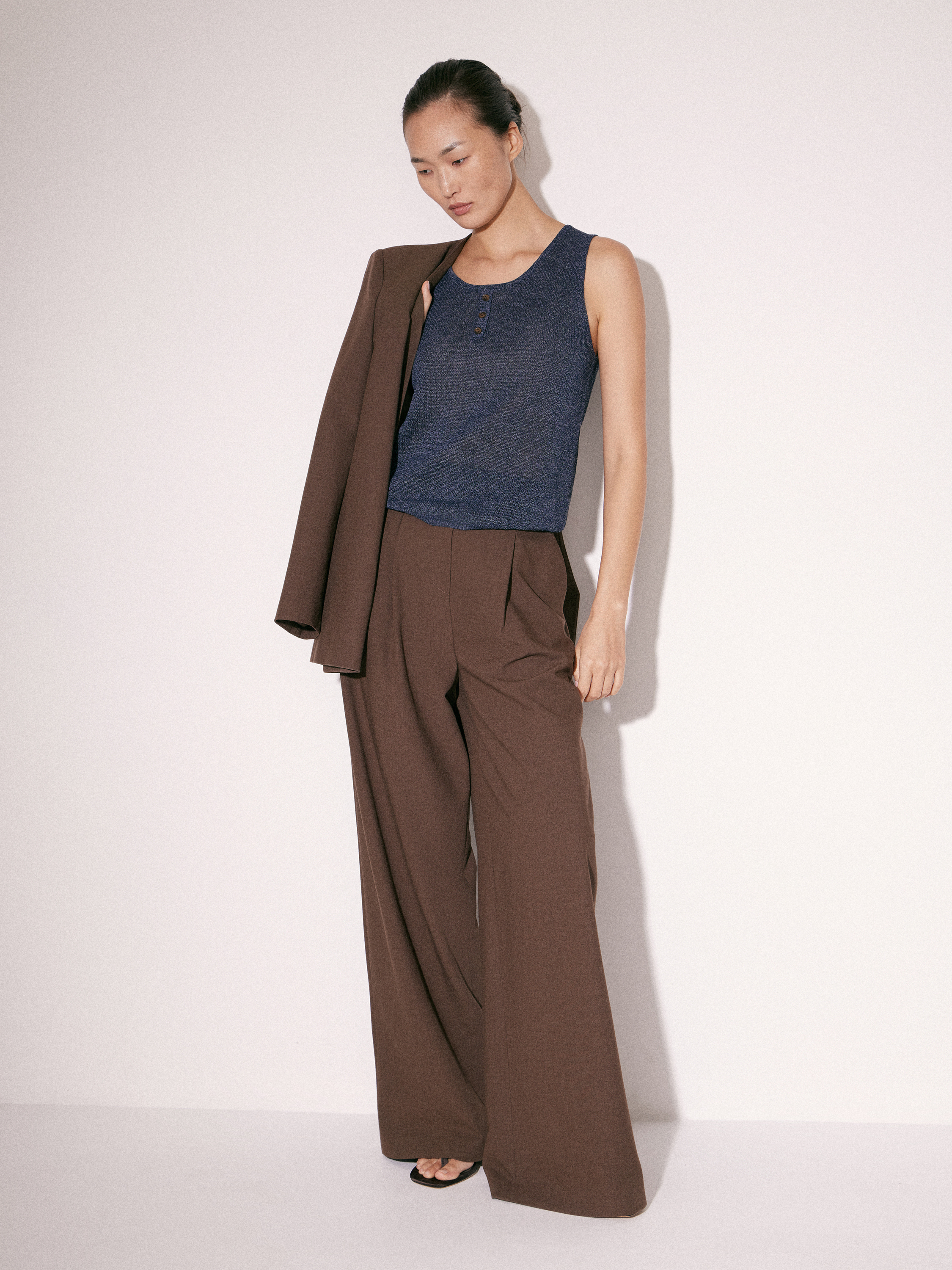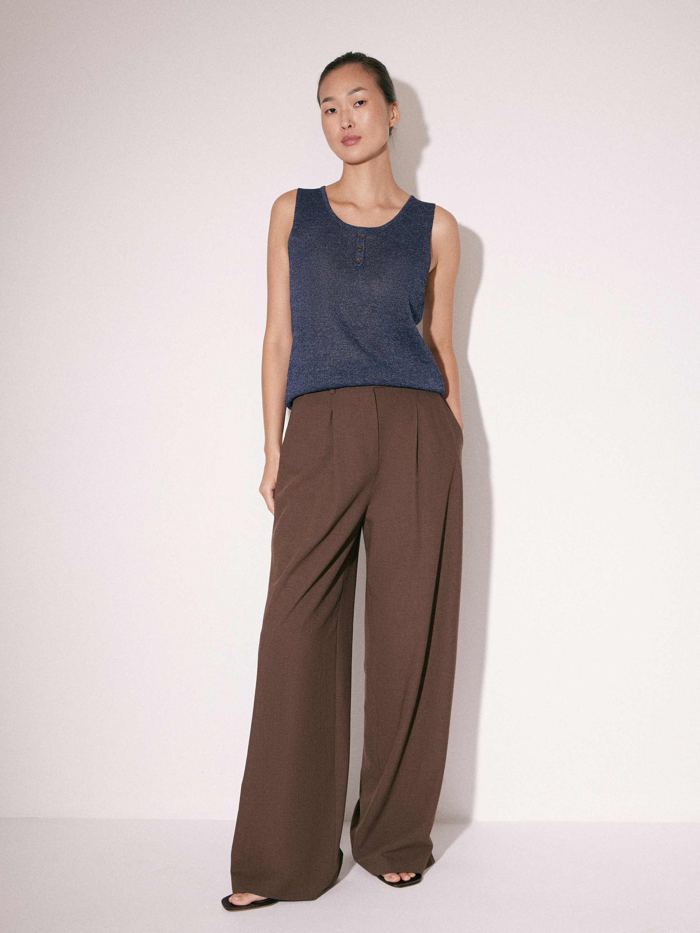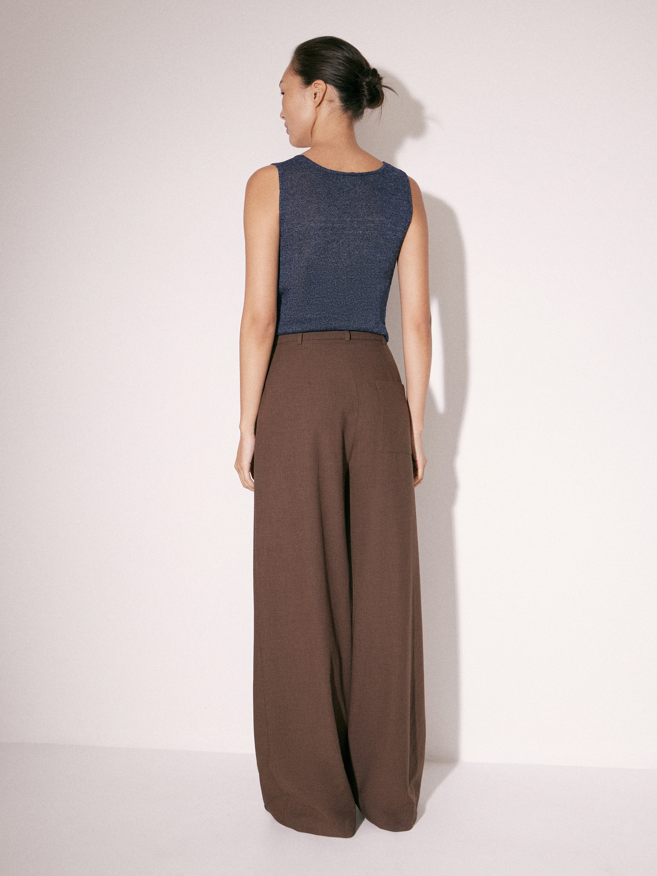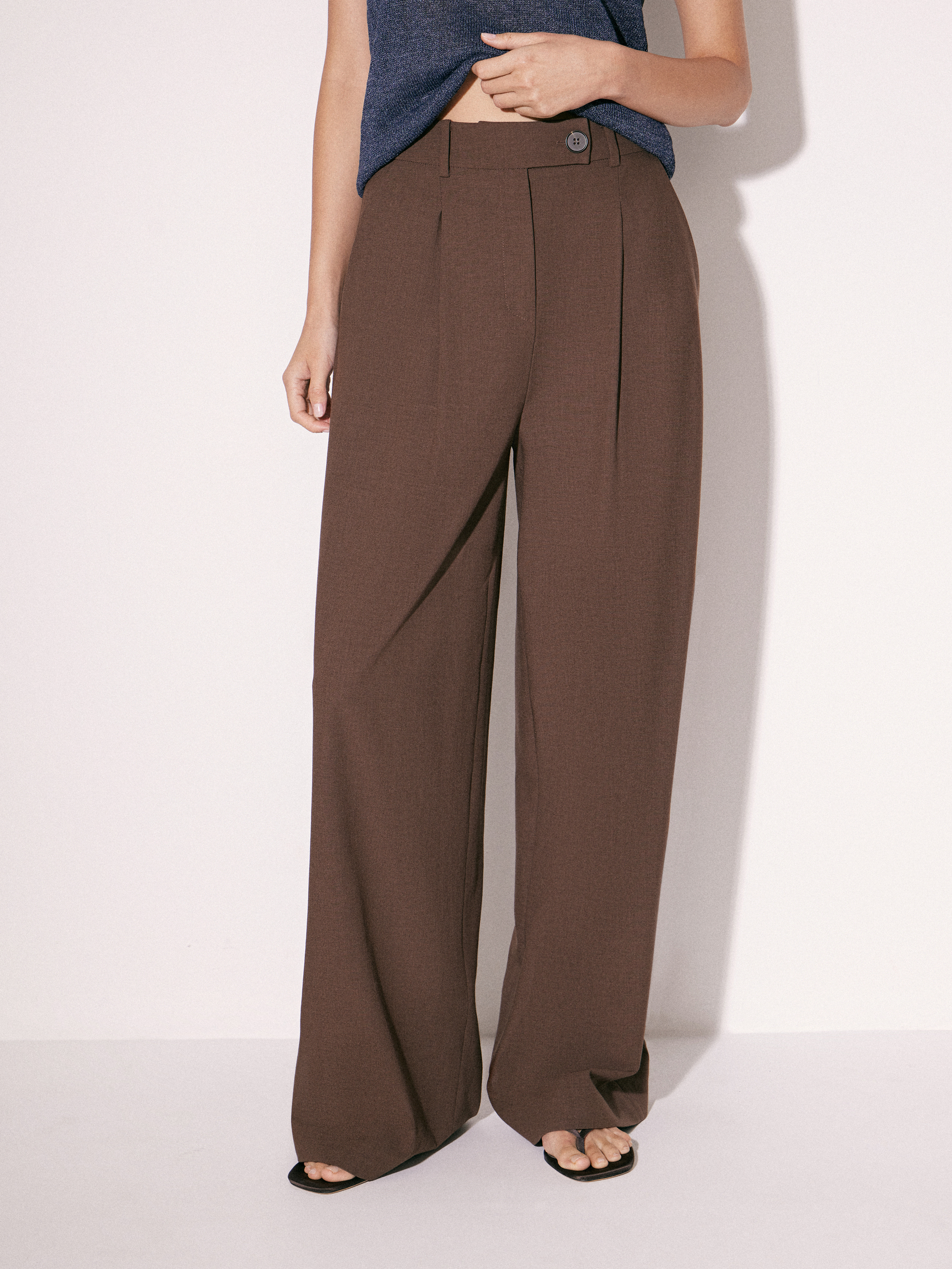 Брюки прямого силуэта выполнены из смесовой костюмной ткани с добавлением шерсти. Материал гладкий, достаточно плотный и пластичный, благодаря чему хорошо держит форму и формирует аккуратную линию силуэта. Небольшое количество эластана делает ткань более гибкой и комфортной в движении. Модель имеет классическую посадку на талии, аккуратный пояс со шлевками и застежку на молнию. Спереди заложены мягкие складки, которые добавляют объем в верхней части и обеспечивают более свободную посадку. Прямые брючины создают вытянутый силуэт, а глубокий коричневый оттенок делает модель универсальной и легко сочетаемой с базовыми элементами гардероба. Подкладка выполнена из хлопка.