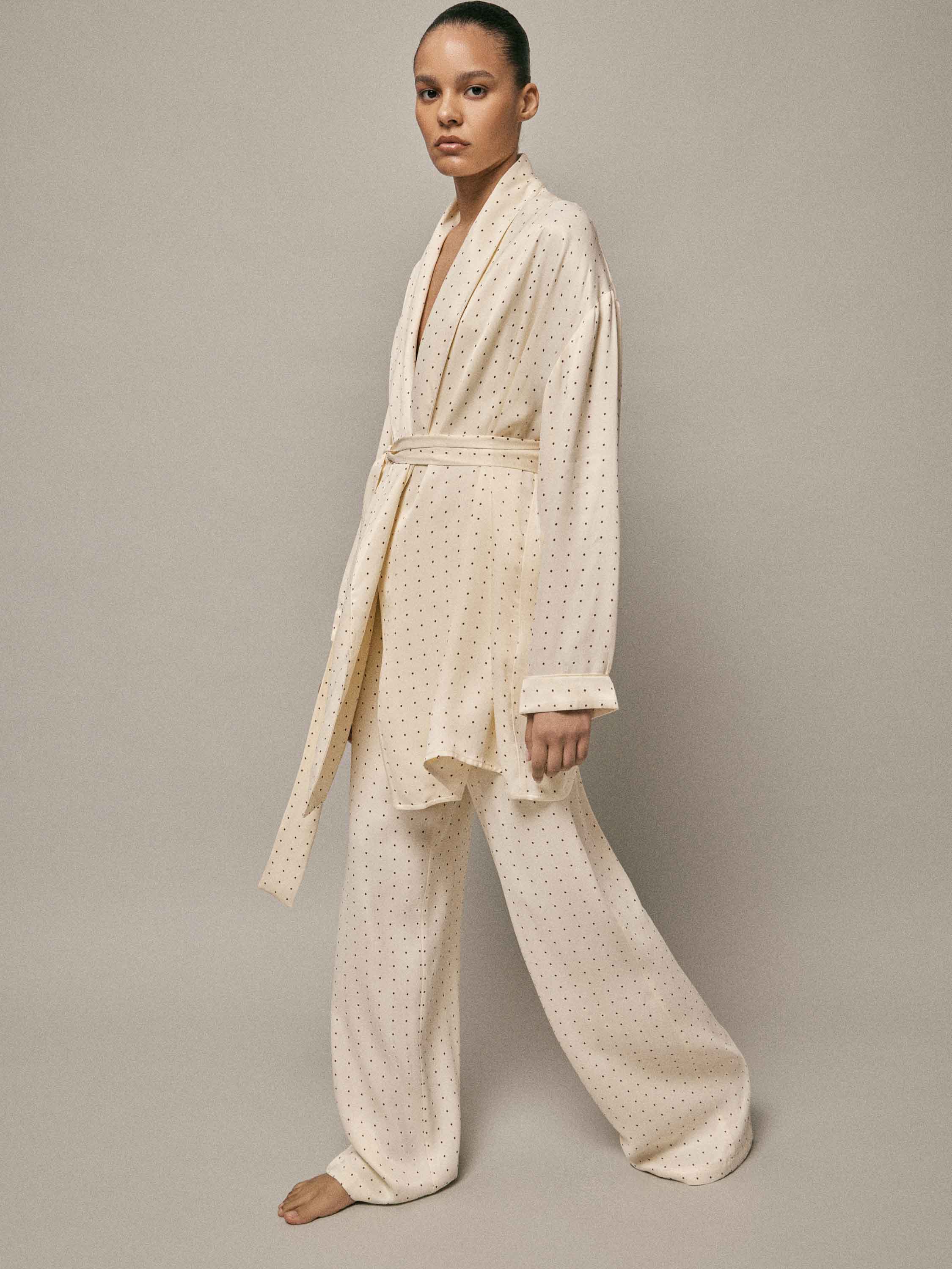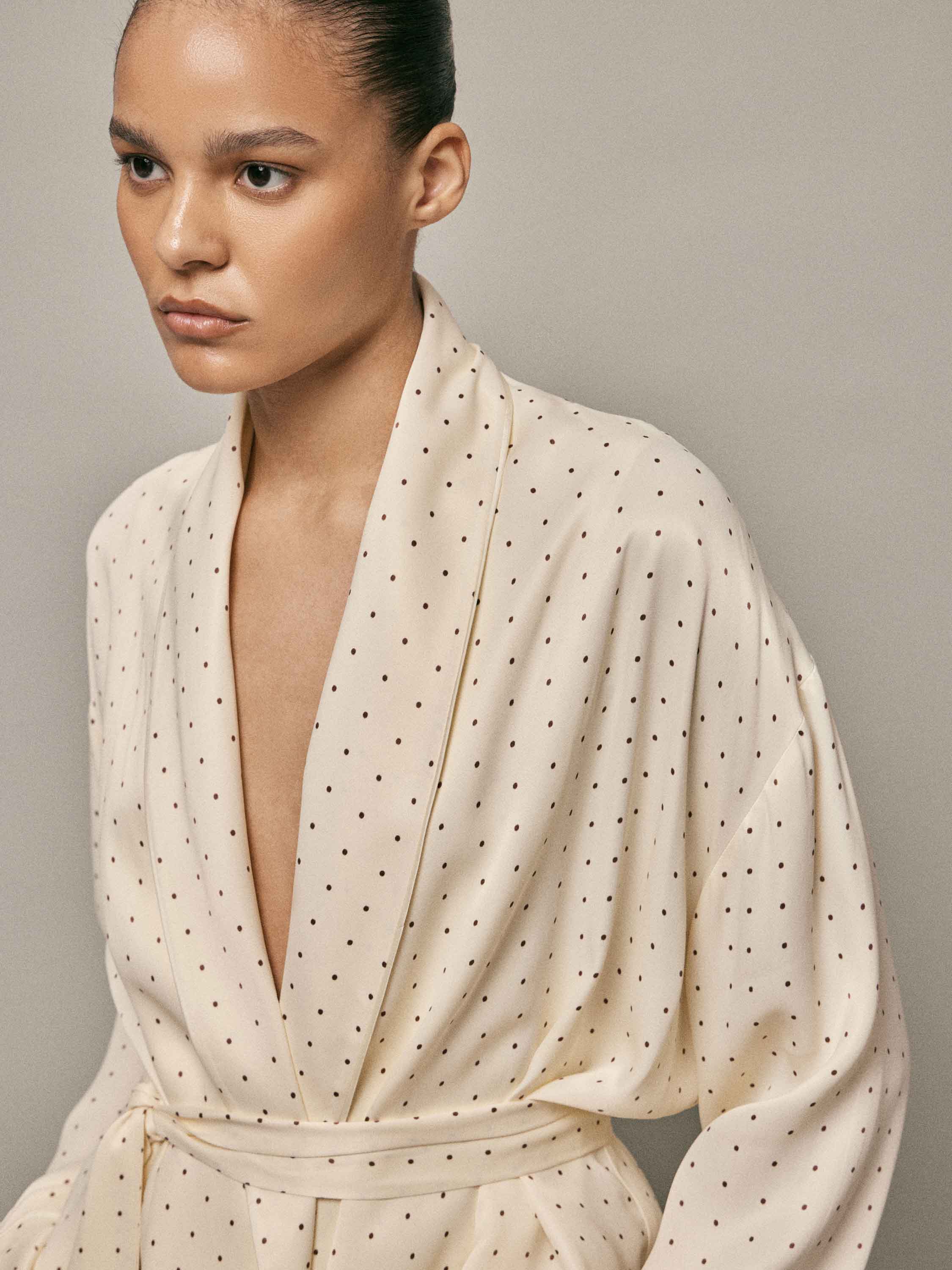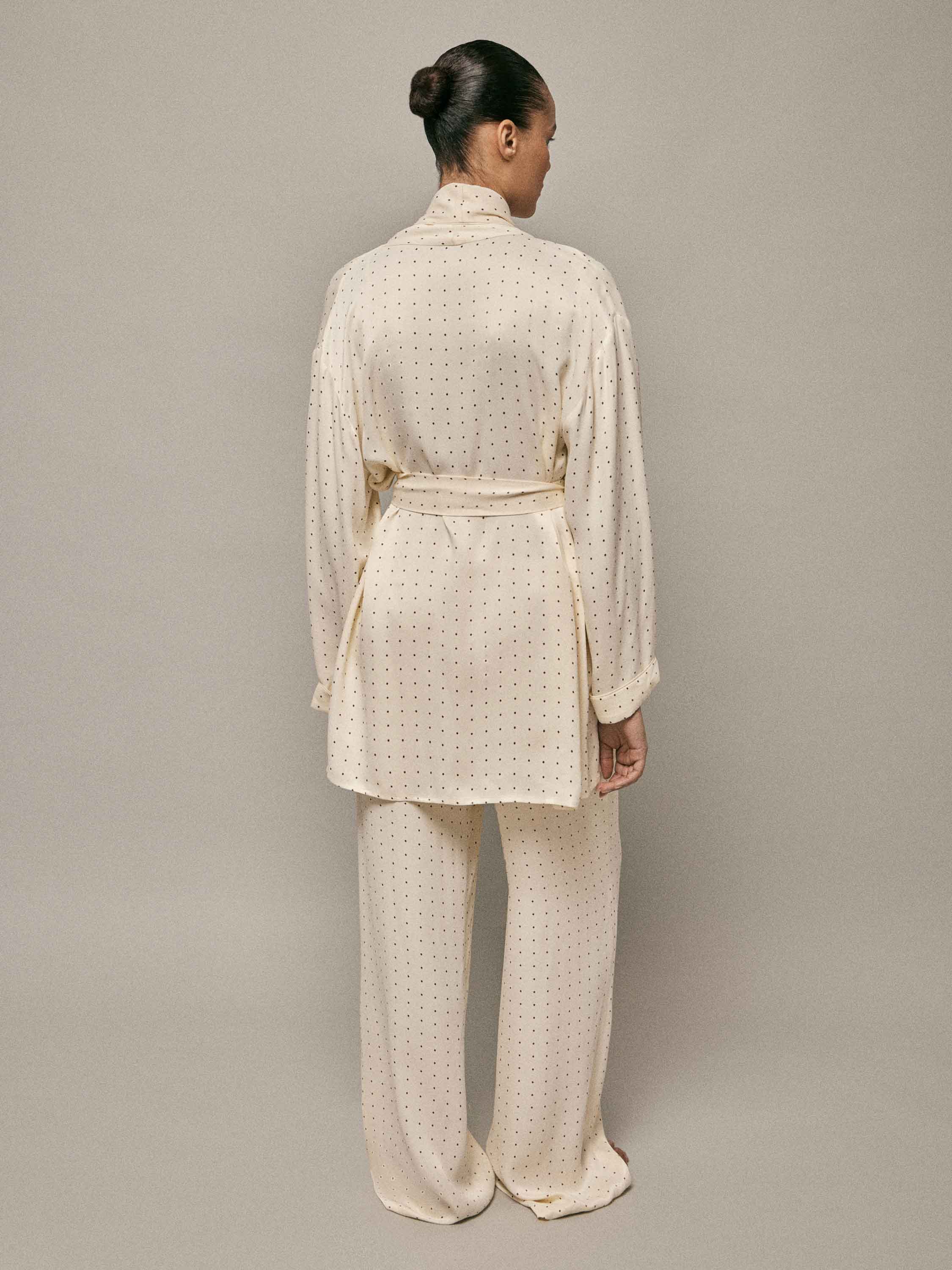 Туника выполнена из 100% района — легкого, текучего материала с гладкой, шелковистой поверхностью и мягким естественным блеском. Ткань свободно драпируется, плавно ложится по фигуре и комфортна при носке, создавая ощущение легкости и непринужденности. Кремовый оттенок подчеркивает деликатный характер модели, а мелкий точечный рисунок равномерно распределен по всей поверхности, добавляя визуальную глубину без избыточной декоративности. Крой свободный, с мягко оформленной линией плеча и запахом, который регулируется поясом и позволяет варьировать посадку. Длинные рукава с аккуратными манжетами продолжают общую стилистику модели. Туника может использоваться как домашний халат или как самостоятельный элемент расслабленного образа, сочетаясь с пижамными брюками и сохраняя баланс между комфортом и аккуратной подачей.