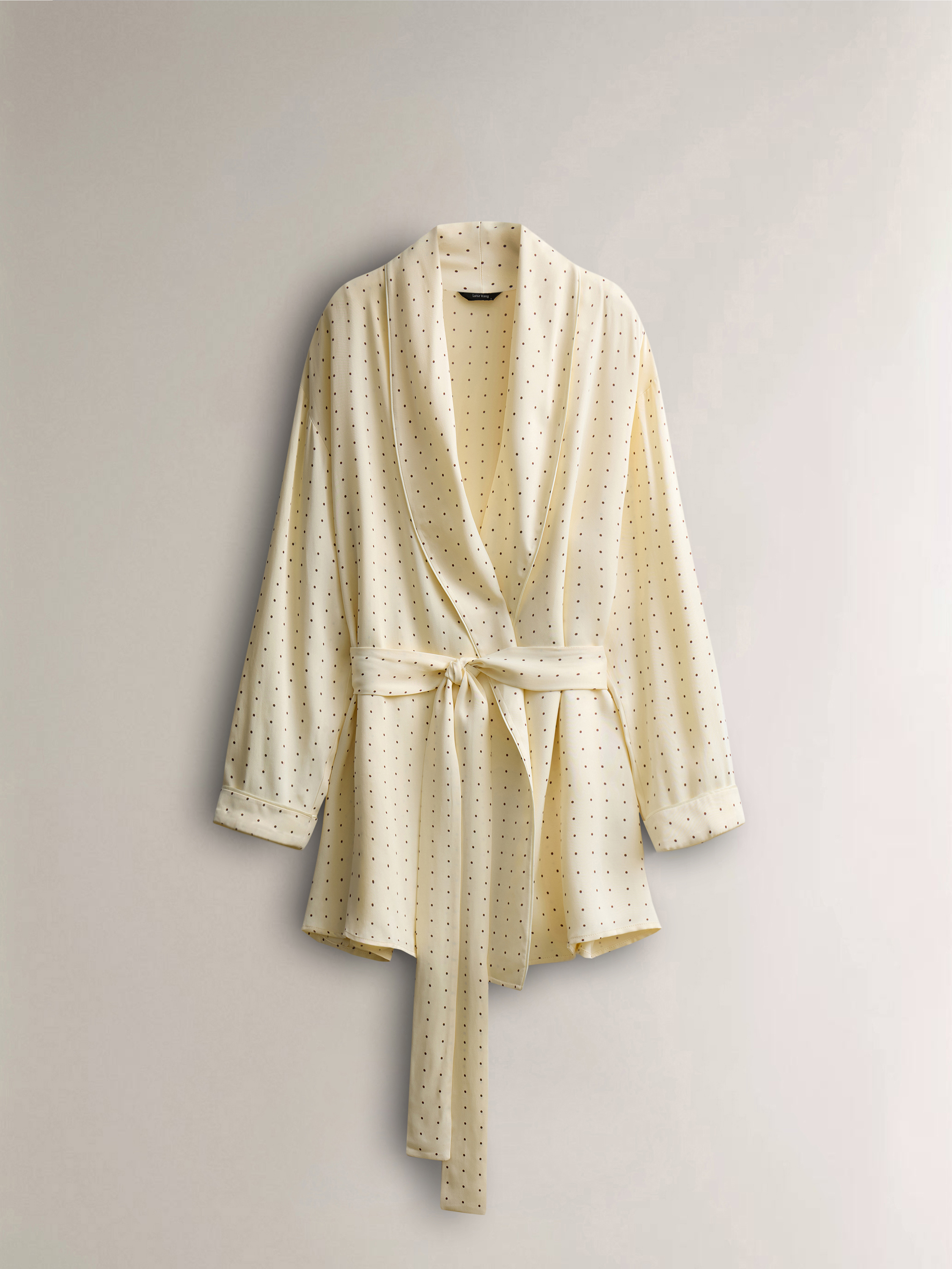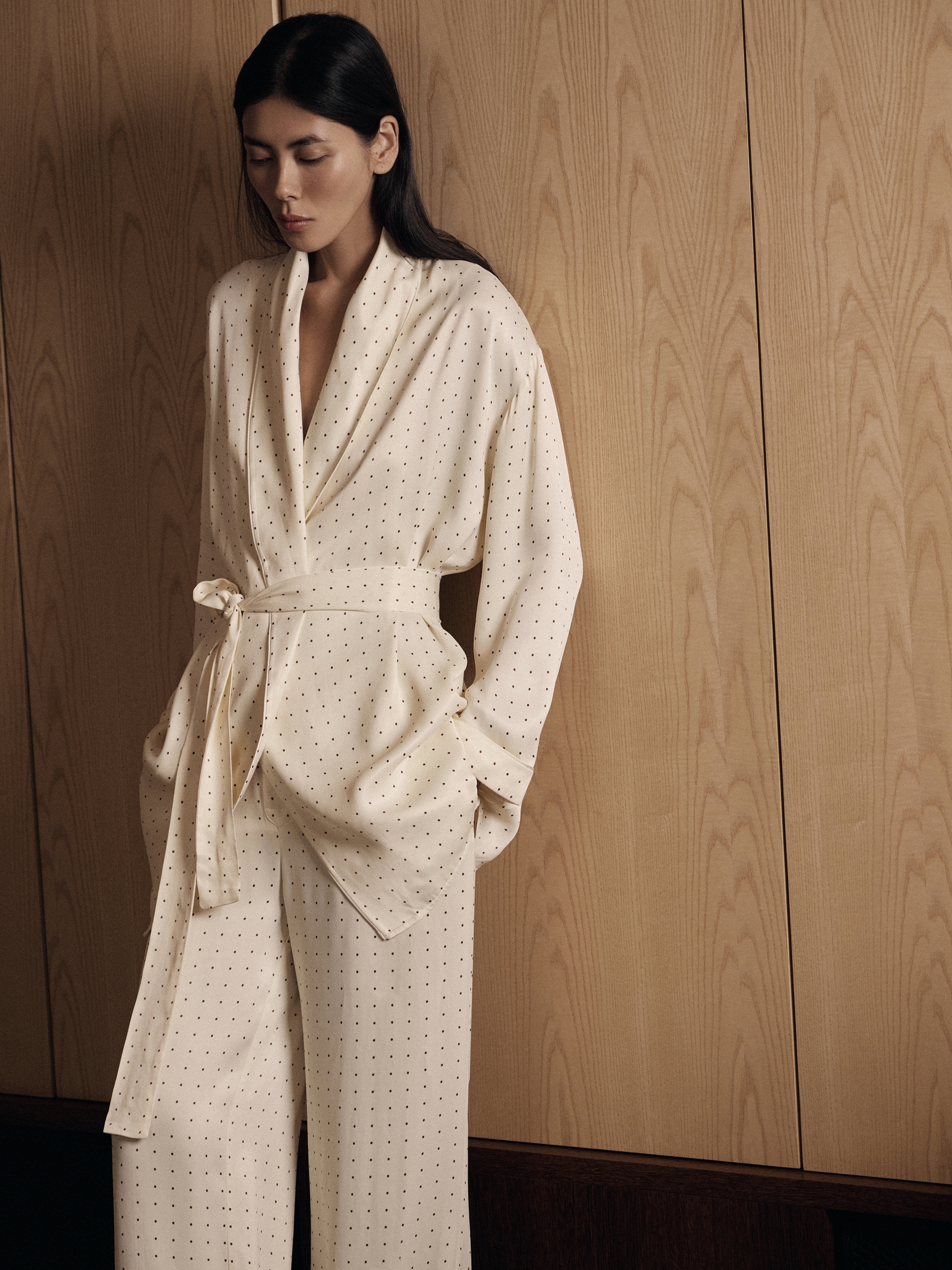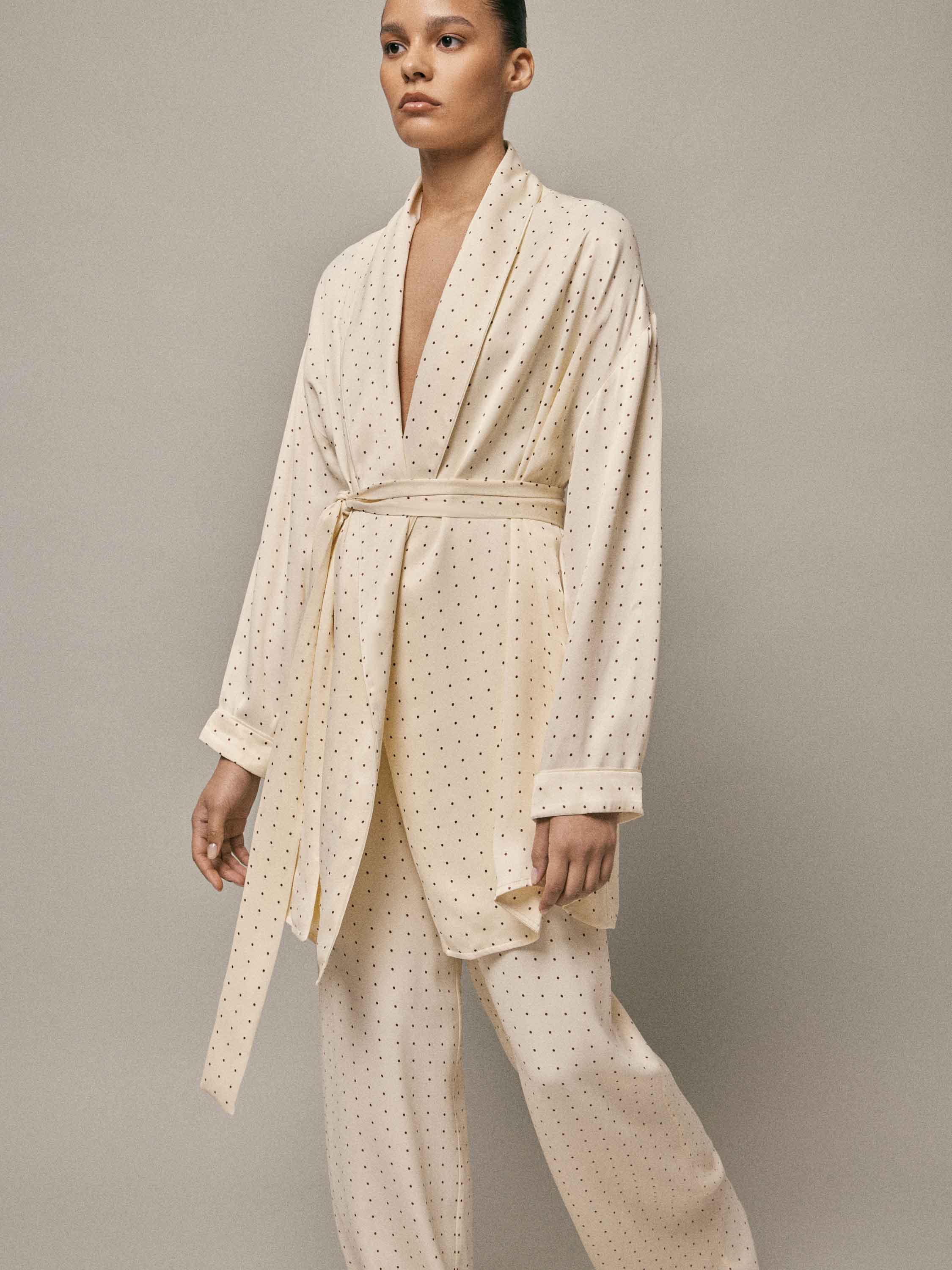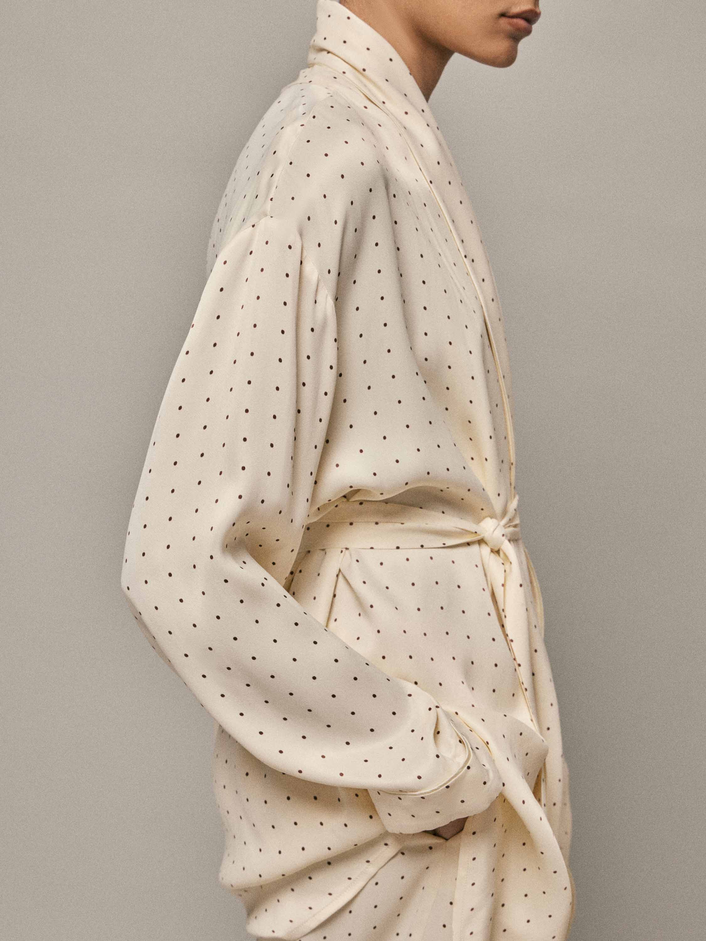 Туника выполнена из 100% района — легкого, текучего материала с гладкой, шелковистой поверхностью и мягким естественным блеском. Ткань свободно драпируется, плавно ложится по фигуре и комфортна при носке, создавая ощущение легкости и непринужденности. Кремовый оттенок подчеркивает деликатный характер модели, а мелкий точечный рисунок равномерно распределен по всей поверхности, добавляя визуальную глубину без избыточной декоративности. Крой свободный, с мягко оформленной линией плеча и запахом, который регулируется поясом и позволяет варьировать посадку. Длинные рукава с аккуратными манжетами продолжают общую стилистику модели. Туника может использоваться как домашний халат или как самостоятельный элемент расслабленного образа, сочетаясь с пижамными брюками и сохраняя баланс между комфортом и аккуратной подачей.