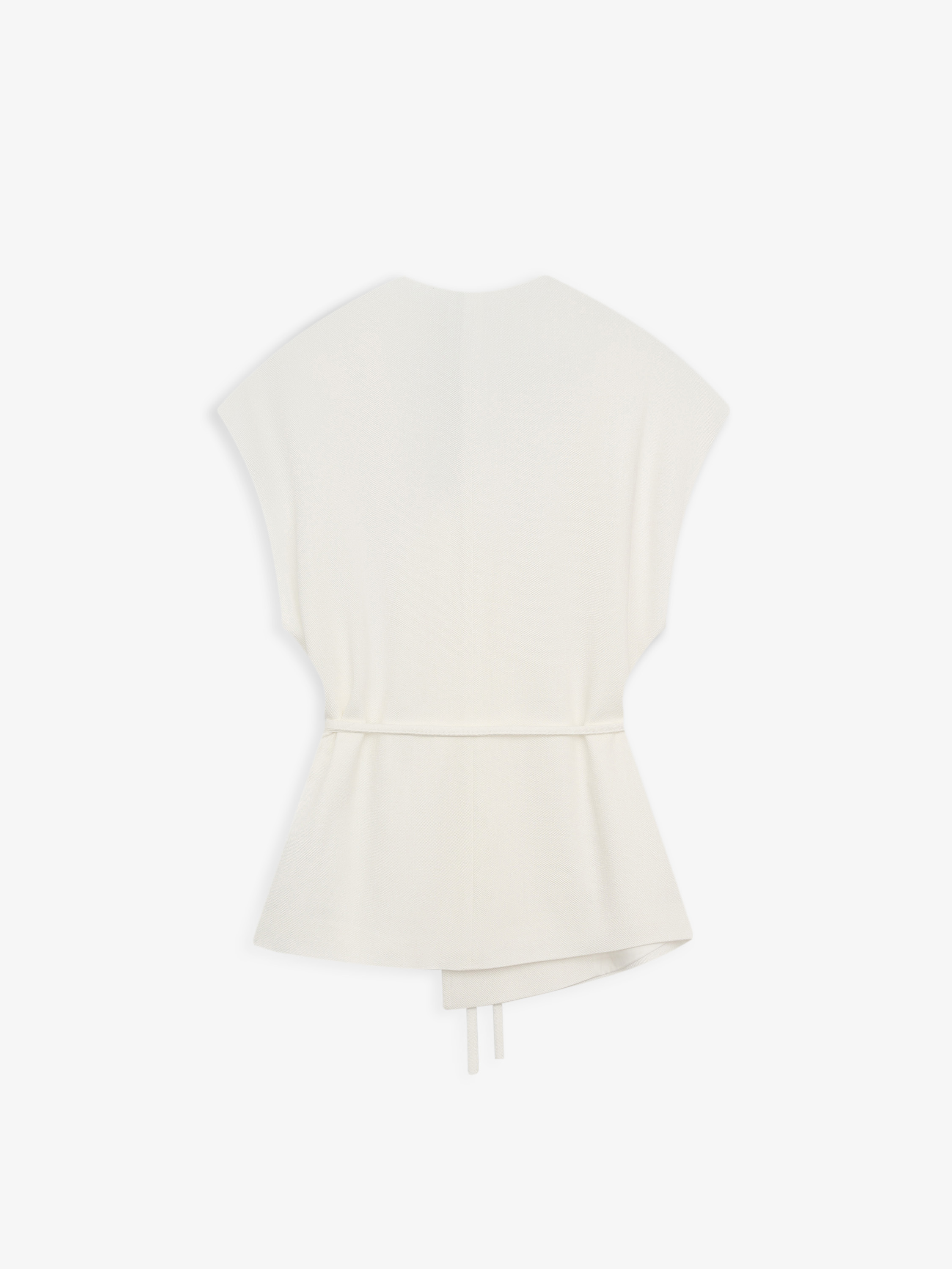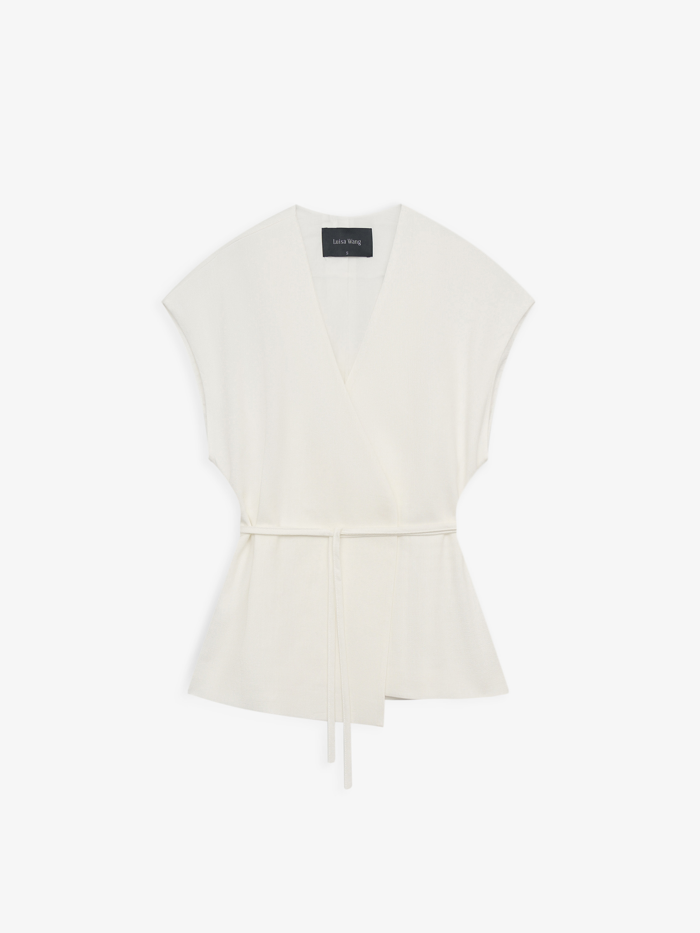 Жилет из смесового полотна на основе тенсела с добавлением полиэстера, с подкладкой из 100% хлопка. Материал с гладкой поверхностью, легкий, пластичный, комфортный в носке и хорошо пропускает воздух. Силуэт прямой, с мягкой линией плеча. Глубокий V-образный вырез формирует чистую вертикаль. По линии талии — тонкий пояс, позволяющий регулировать посадку и создавать более собранный силуэт. Нижний край слегка расширен. Жилет можно носить как самостоятельный элемент в теплое время года или использовать в многослойных образах.