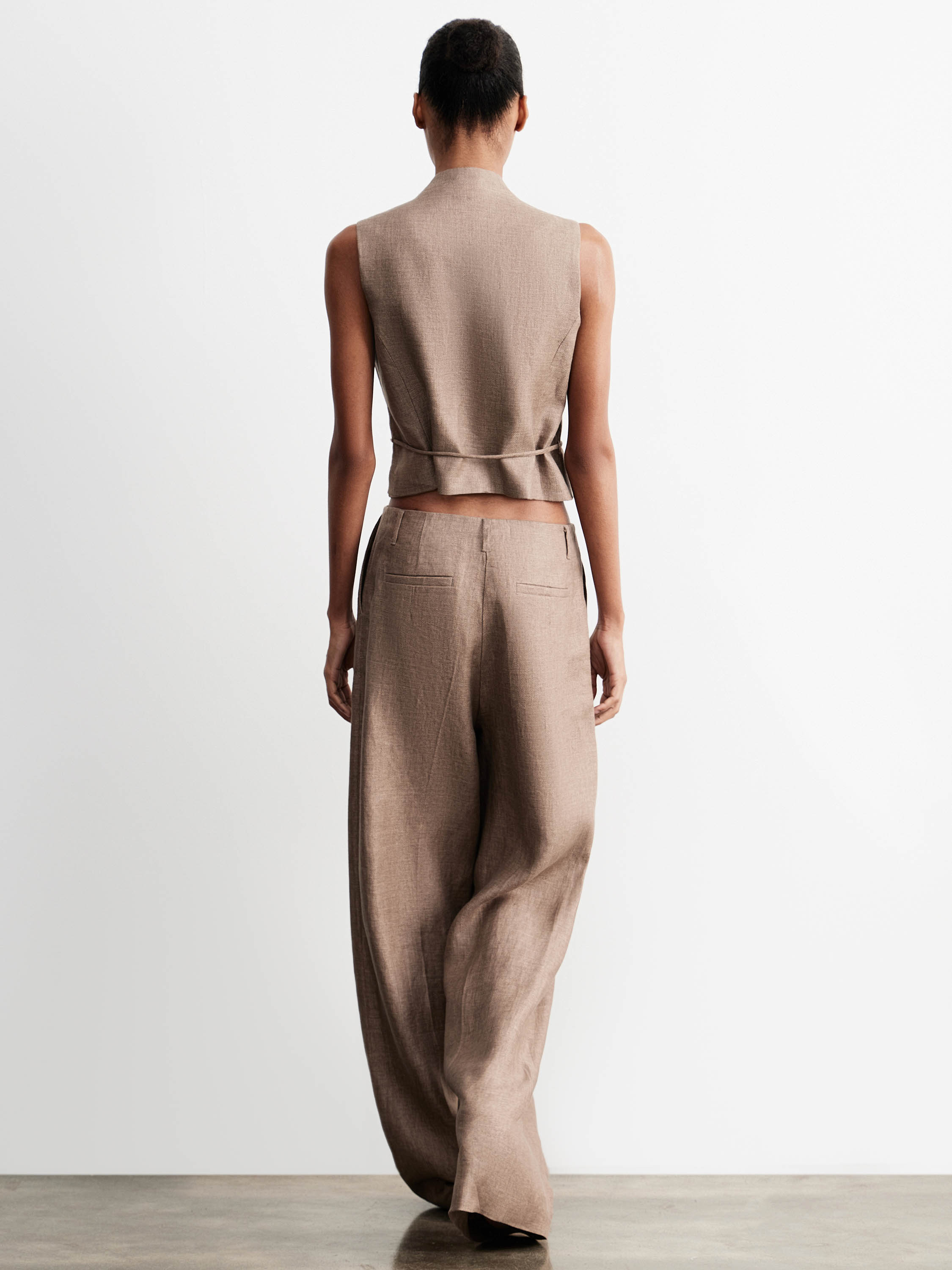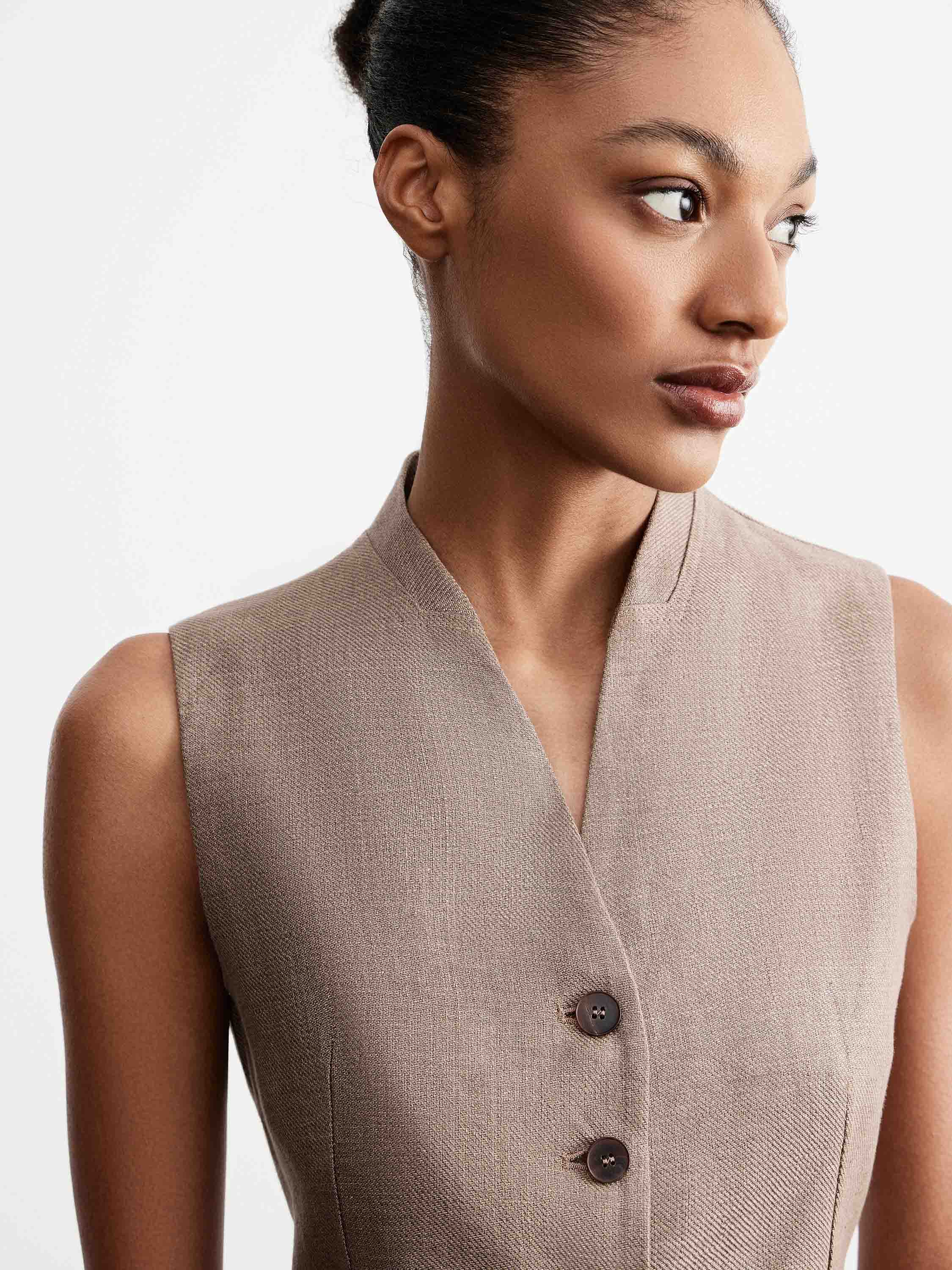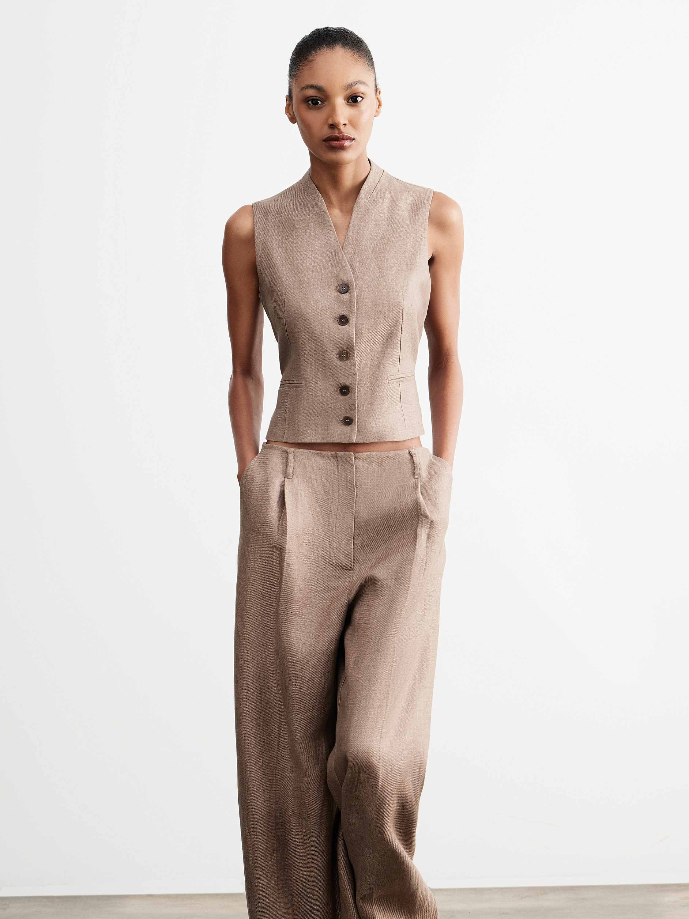 Жилет с четко сформированной линией плеча и приталенным силуэтом, выполненный изо льна с характерной матовой фактурой. Лен обеспечивает воздухопроницаемость, комфорт в тепле и естественную терморегуляцию, благодаря чему изделие подходит для длительного ношения. Модель с V-образным вырезом и застежкой на пуговицы формирует аккуратную линию груди, вертикальные рельефы подчеркивают посадку, а лаконичные карманы и выверенная длина до линии талии усиливают пропорции. Теплый бежевый оттенок делает жилет универсальным: он сочетается как с брюками из той же ткани, так и с базовыми топами или рубашками, формируя повседневные и более собранные комплекты.