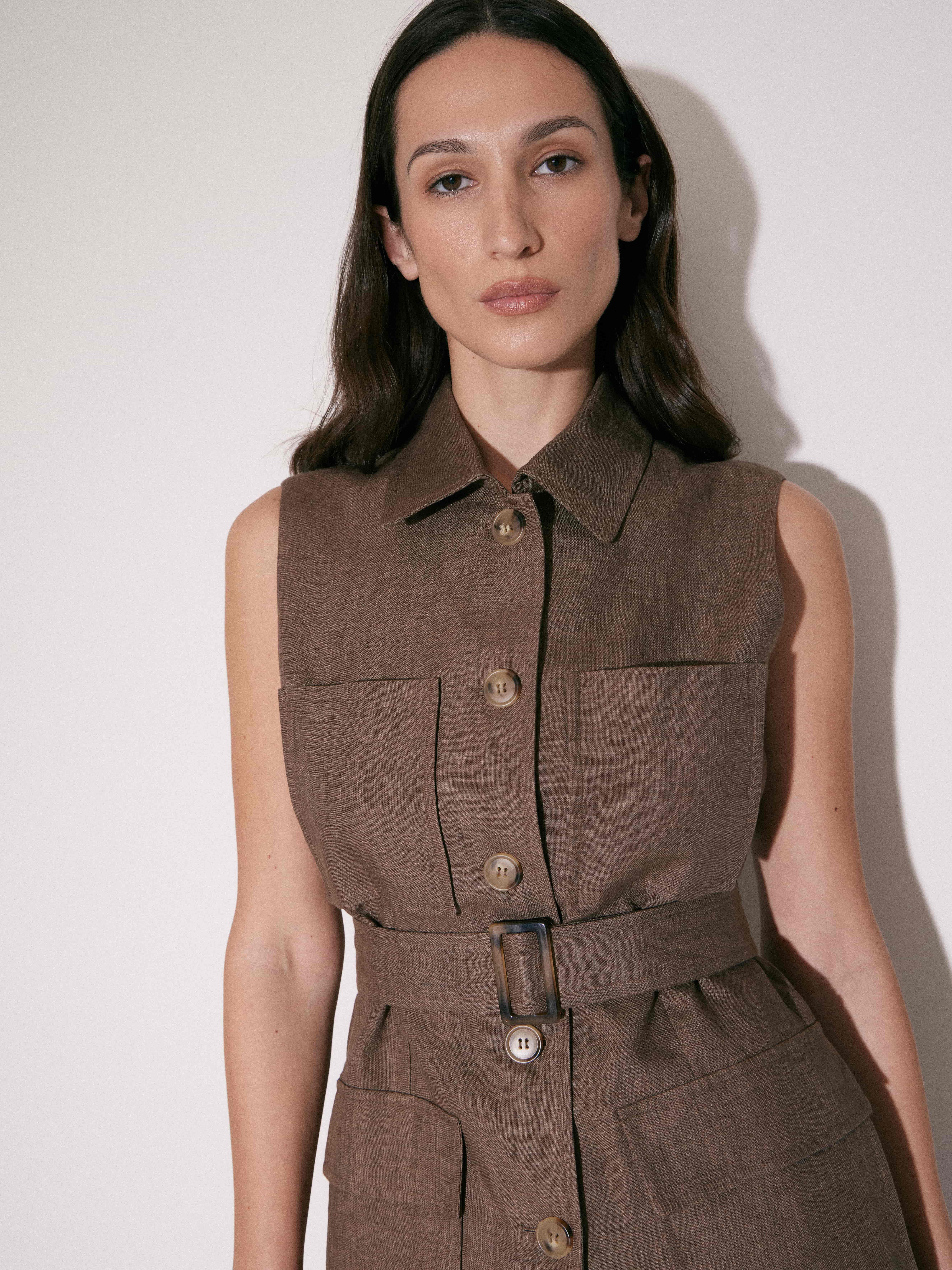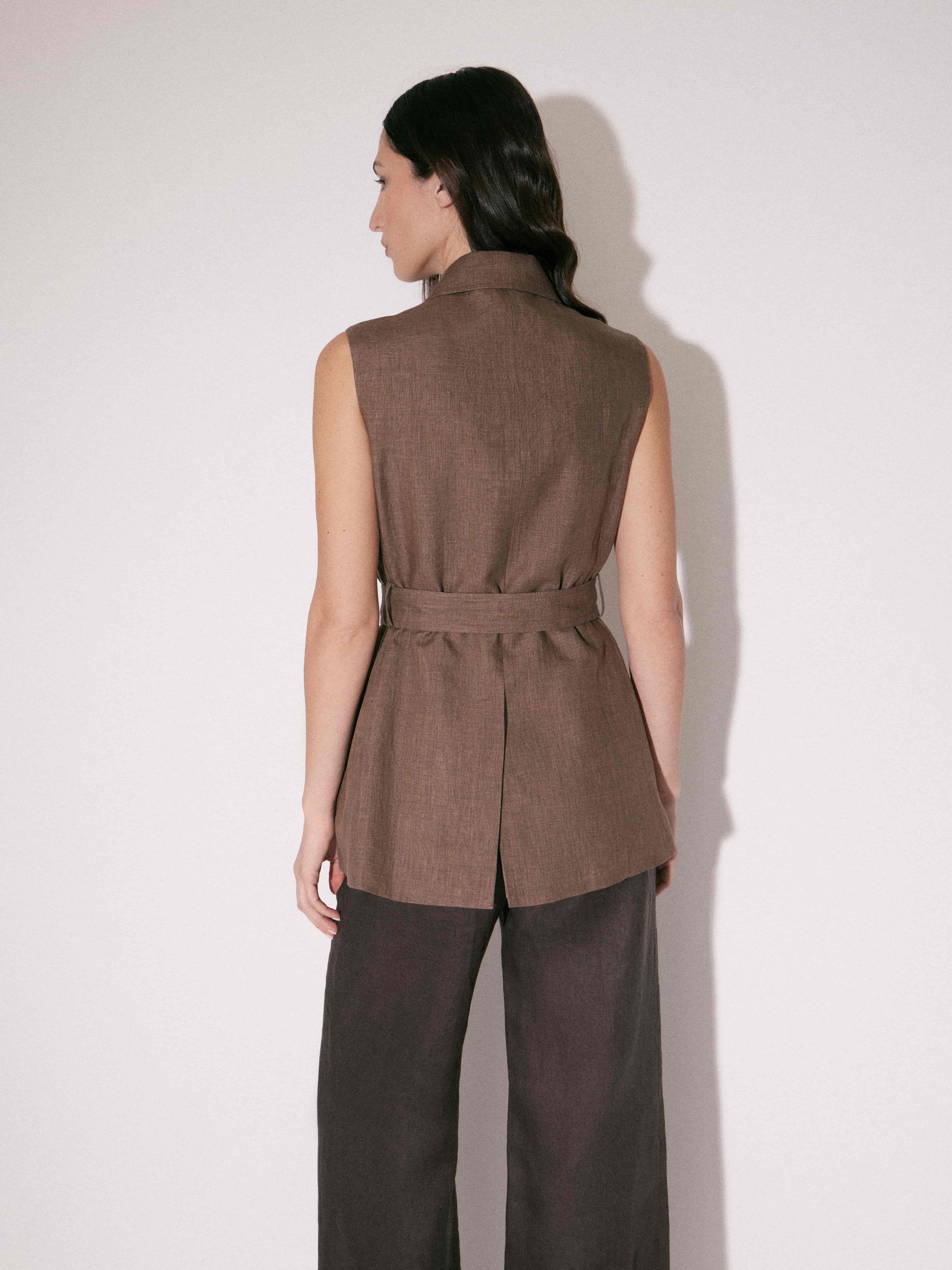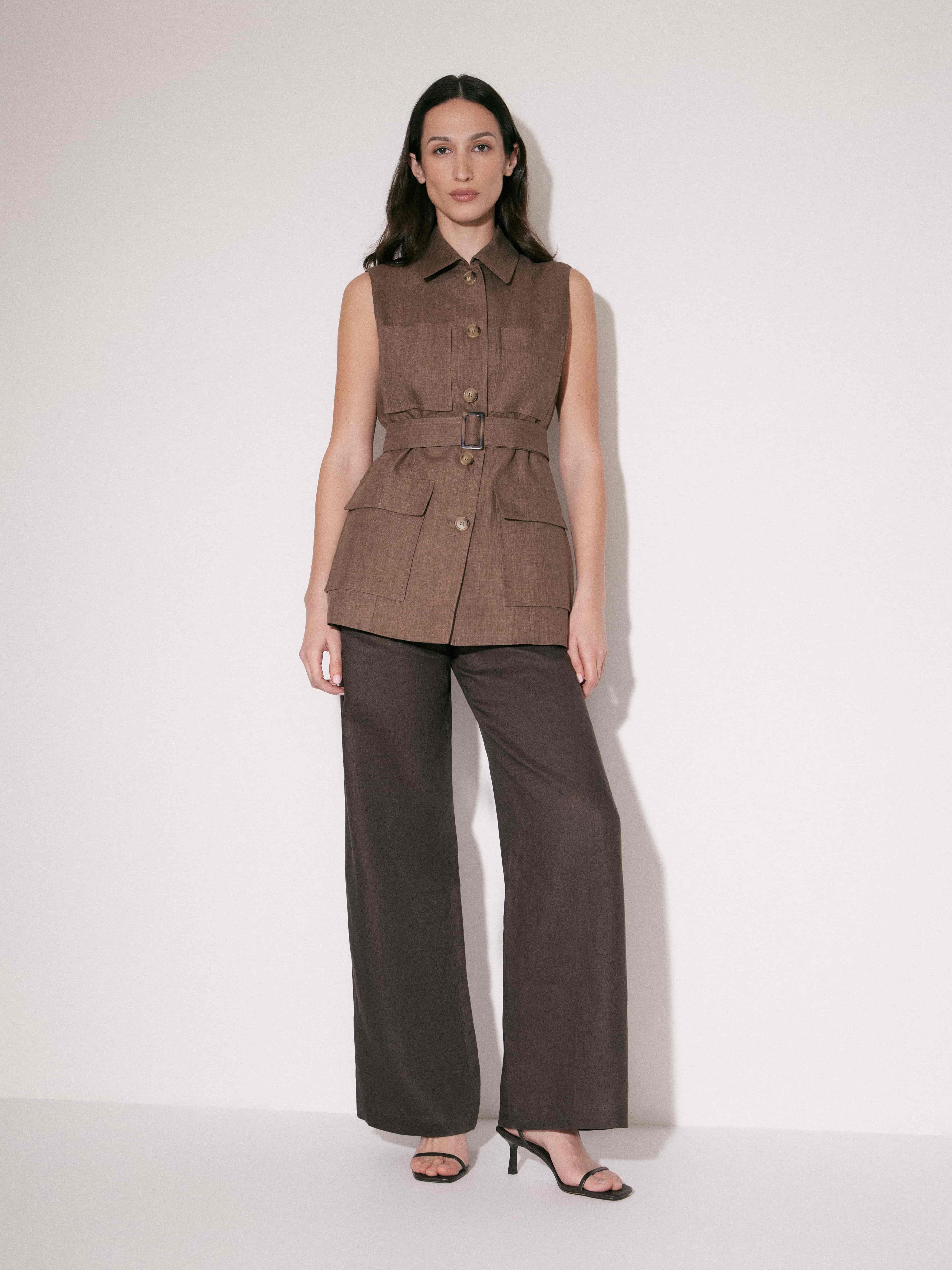 Жилет изо льна с выраженной фактурой и естественной воздухопроницаемостью, комфортный для теплого сезона. Силуэт приталенный, с акцентом на линию талии за счет пояса с пряжкой, который фиксирует посадку и формирует четкий контур. Конструкция выстроена по типу рубашечного кроя: отложной воротник, центральная застежка на пуговицы, аккуратные нагрудные вытачки. Внизу — накладные карманы с клапанами, добавляющие объема и функциональности. Линия плеч открытая. Оттенок — глубокий коричневый. Сочетается с брюками, юбками и шортами разных фактур, а также с базовыми топами и рубашками, позволяя варьировать степень многослойности.