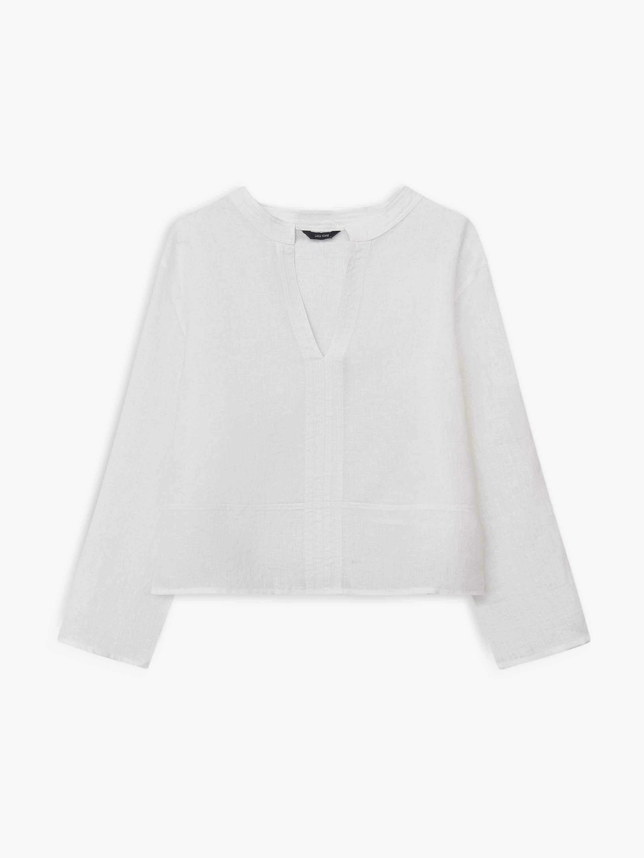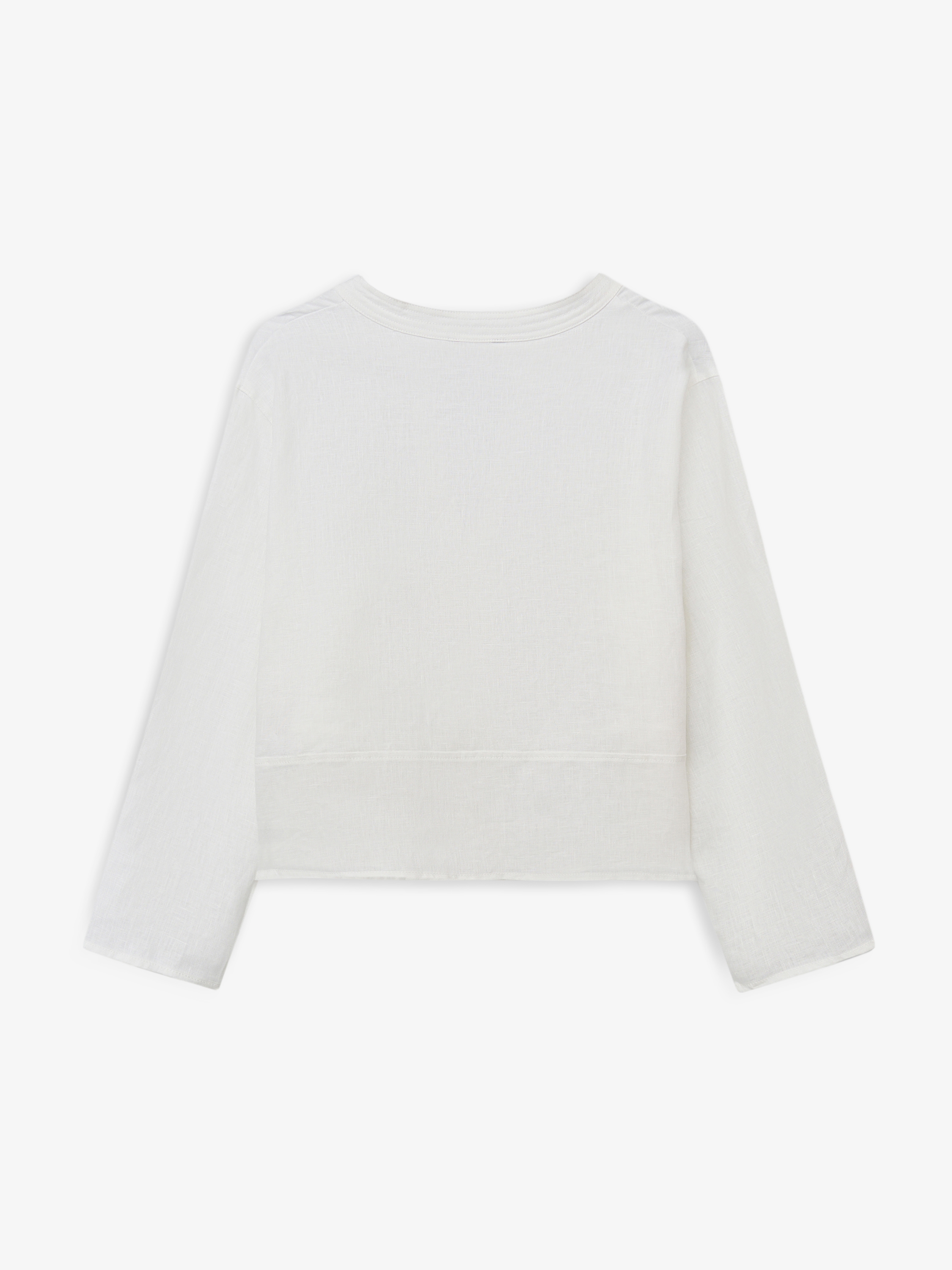 Блузка укороченного силуэта с мягкой линией плеча и свободной посадкой, без лишнего объема. Горловина оформлена округлым вырезом с V-образным разрезом, который визуально вытягивает линию шеи, рукава прямые, длиной до запястья, с аккуратной обработкой края. Низ дополнен горизонтальной линией кроя, формирующей четкую геометрию изделия. Выполнена изо льна — материала с характерной фактурой и матовой поверхностью: полотно хорошо пропускает воздух, быстро отводит влагу и сохраняет комфорт даже при высокой температуре. Светлый оттенок легко сочетается с базовыми и контрастными элементами гардероба, подходит для многослойных и самостоятельных комплектов.