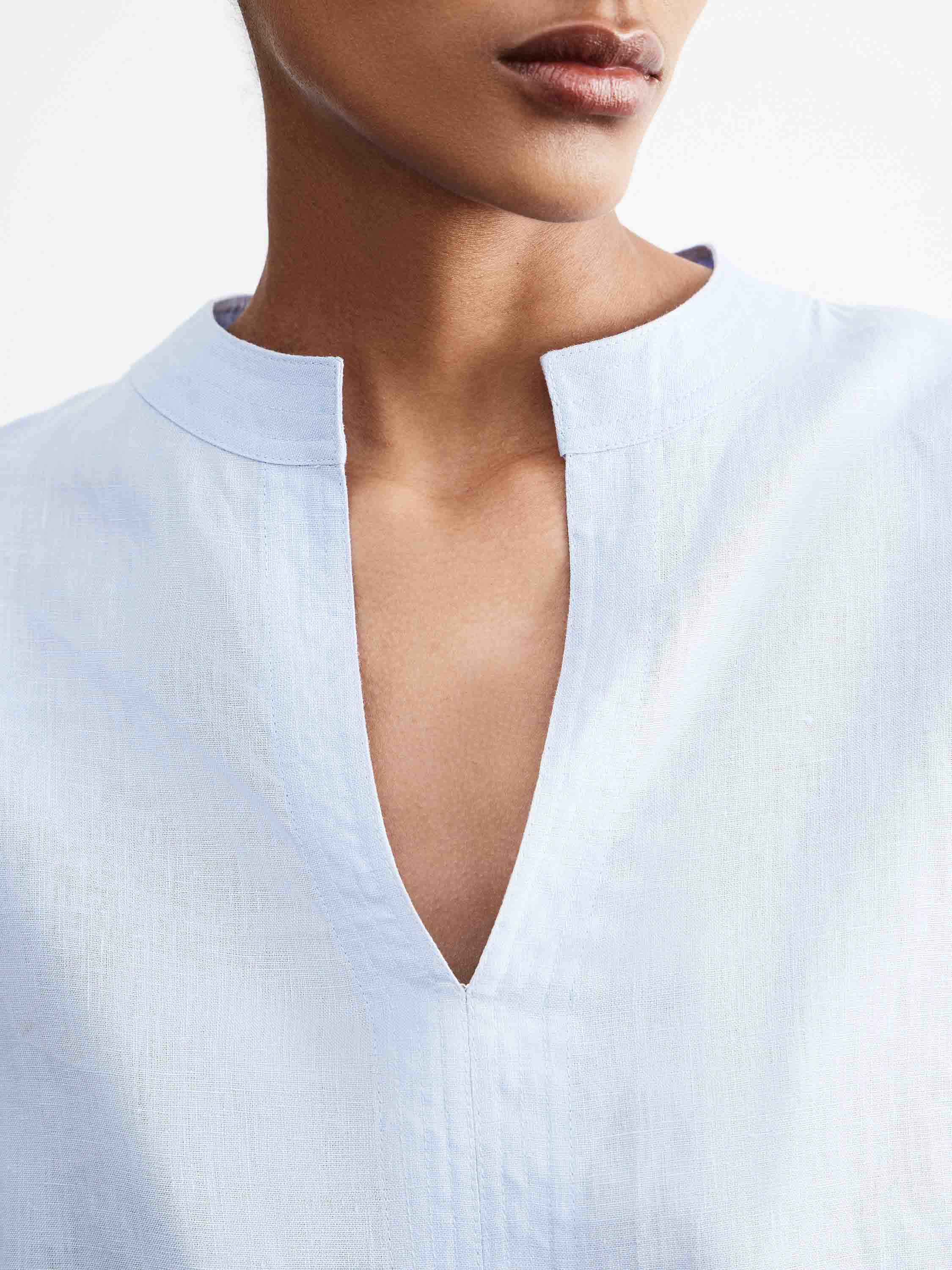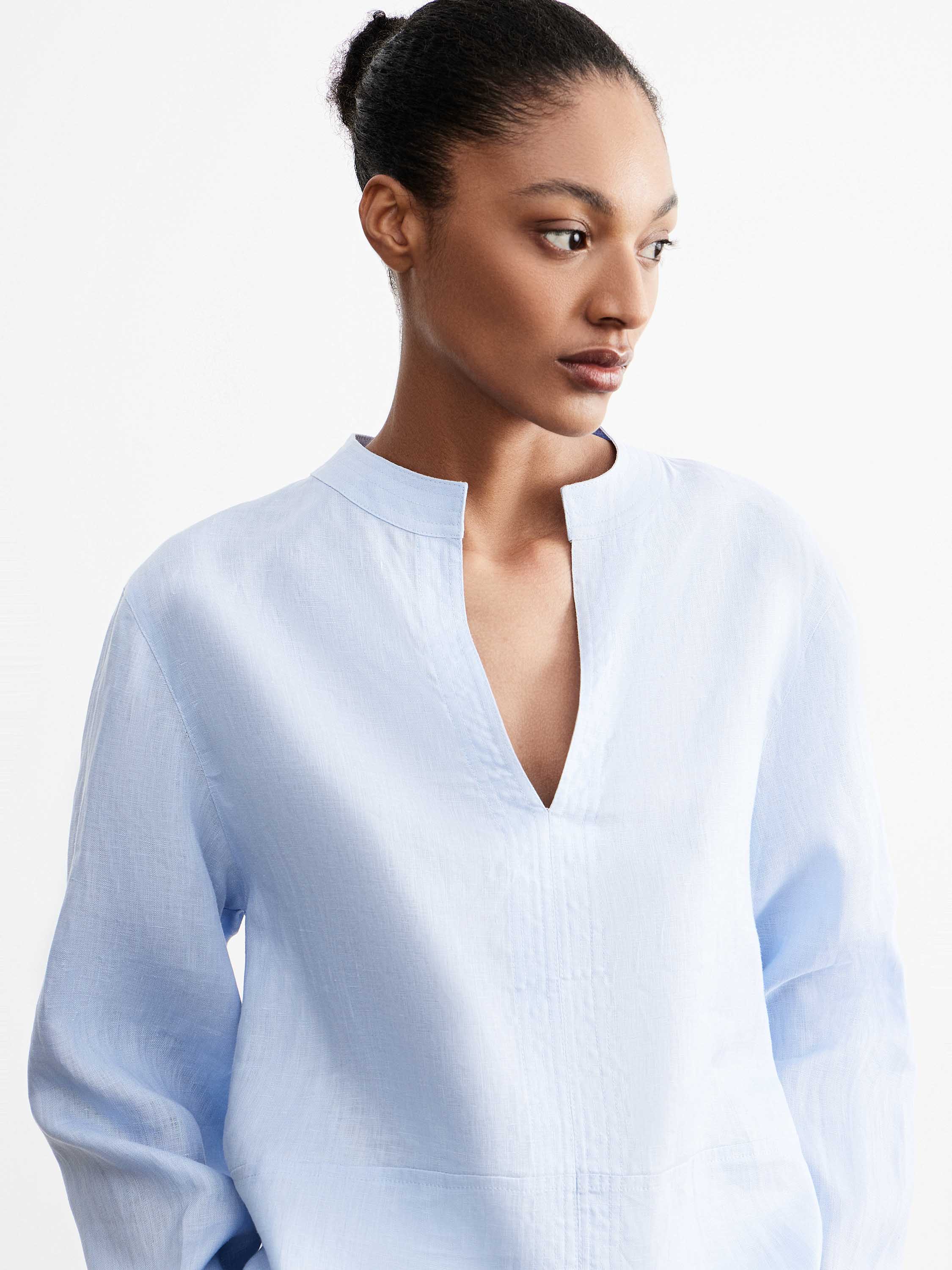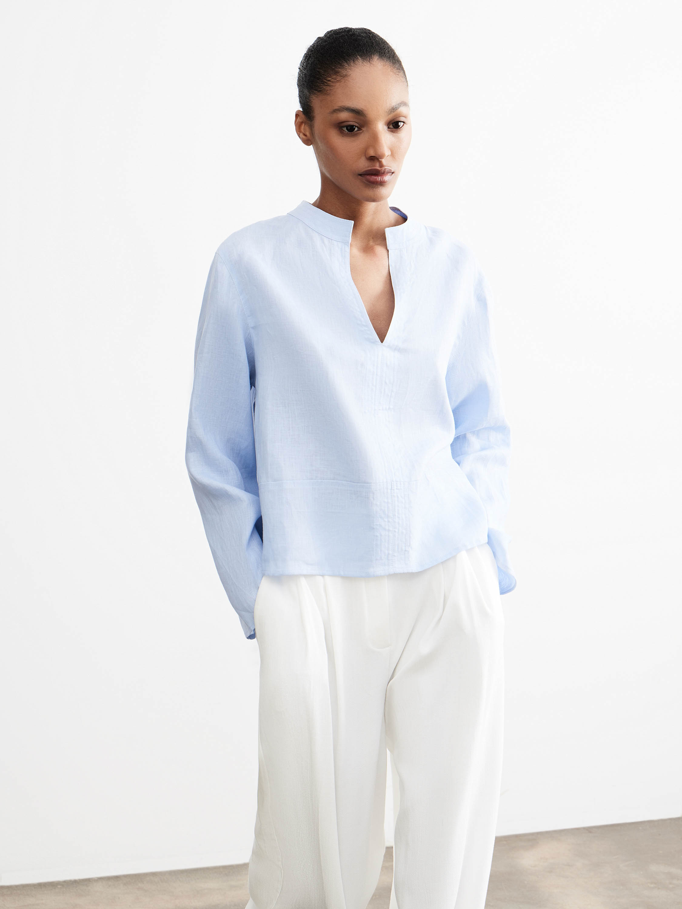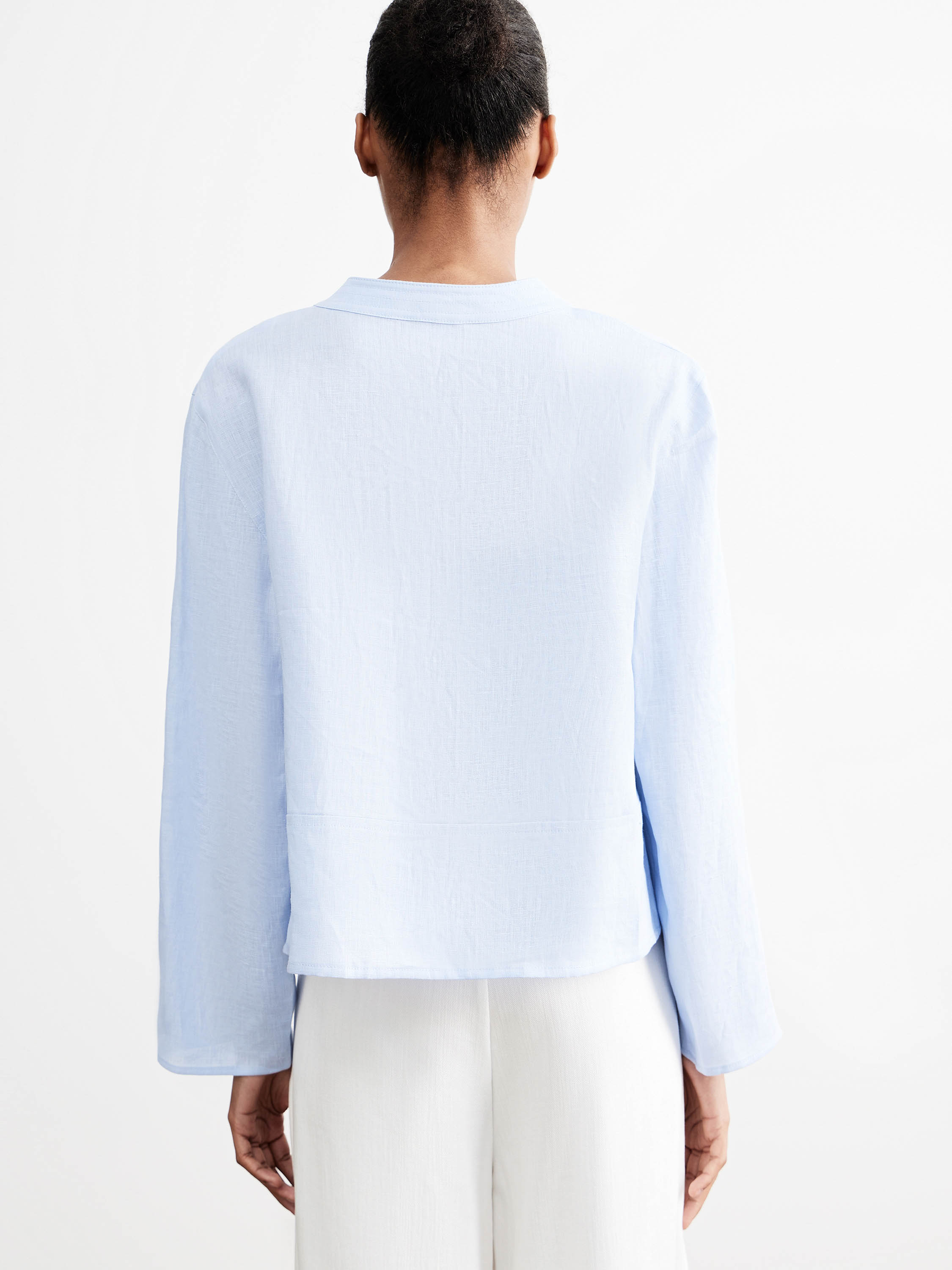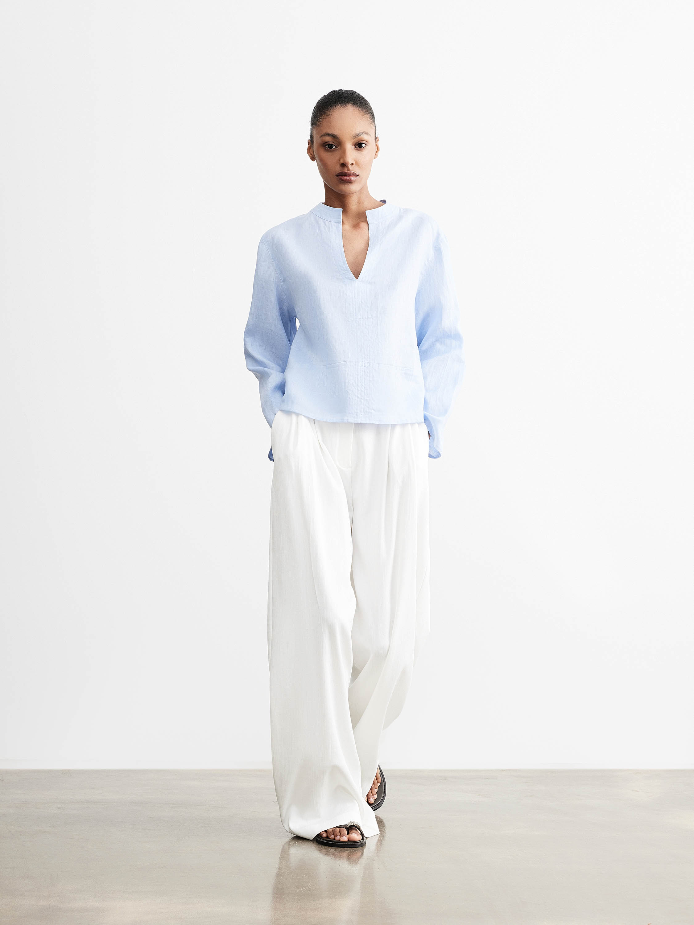Блузка укороченного силуэта с мягкой линией плеча и свободной посадкой, без лишнего объема. Горловина оформлена округлым вырезом с V-образным разрезом, который визуально вытягивает линию шеи, рукава прямые, длиной до запястья, с аккуратной обработкой края. Низ дополнен горизонтальной линией кроя, формирующей четкую геометрию изделия. Выполнена изо льна — материала с характерной фактурой и матовой поверхностью: полотно хорошо пропускает воздух, быстро отводит влагу и сохраняет комфорт даже при высокой температуре. Светлый оттенок легко сочетается с базовыми и контрастными элементами гардероба, подходит для многослойных и самостоятельных комплектов.