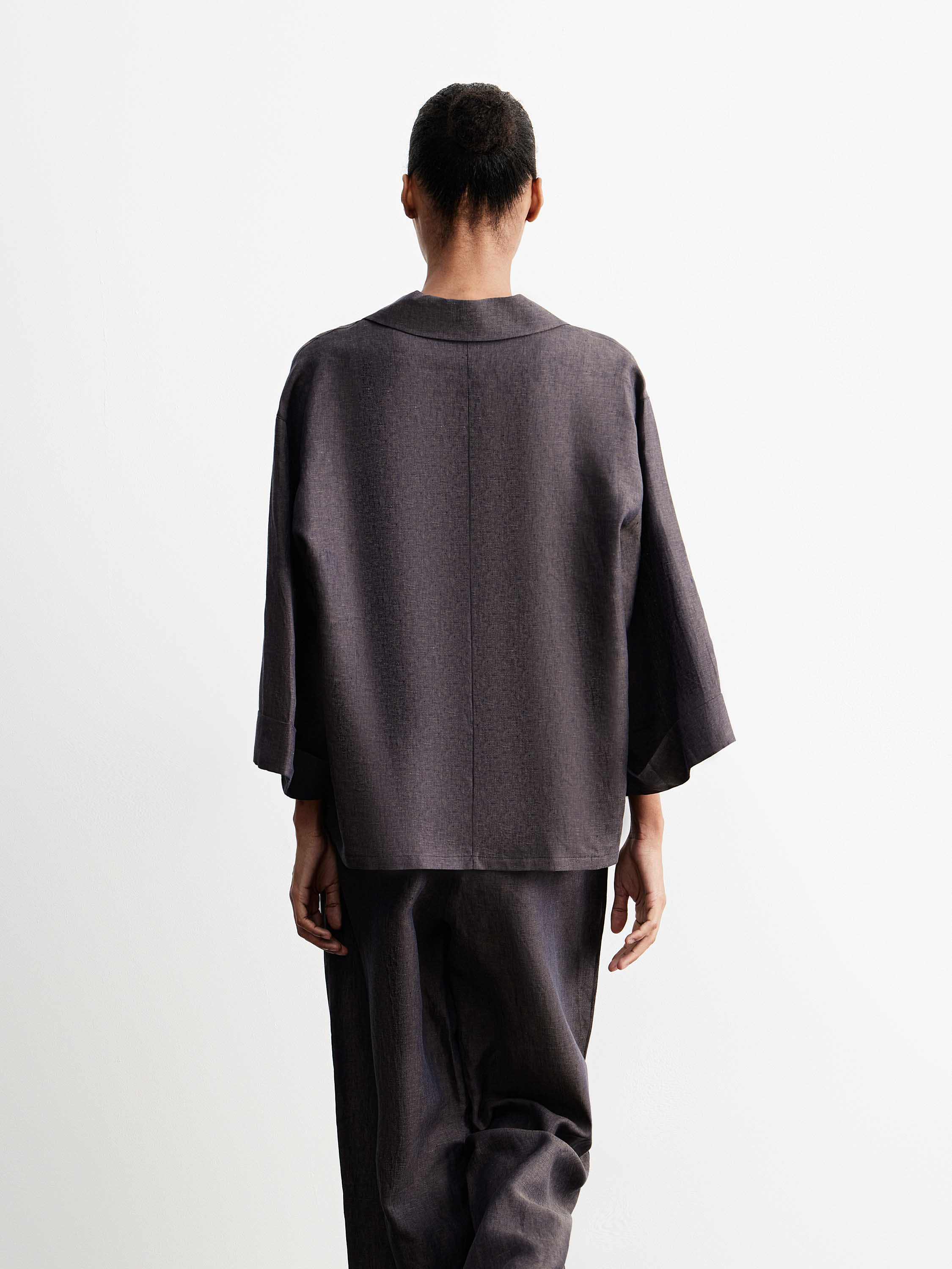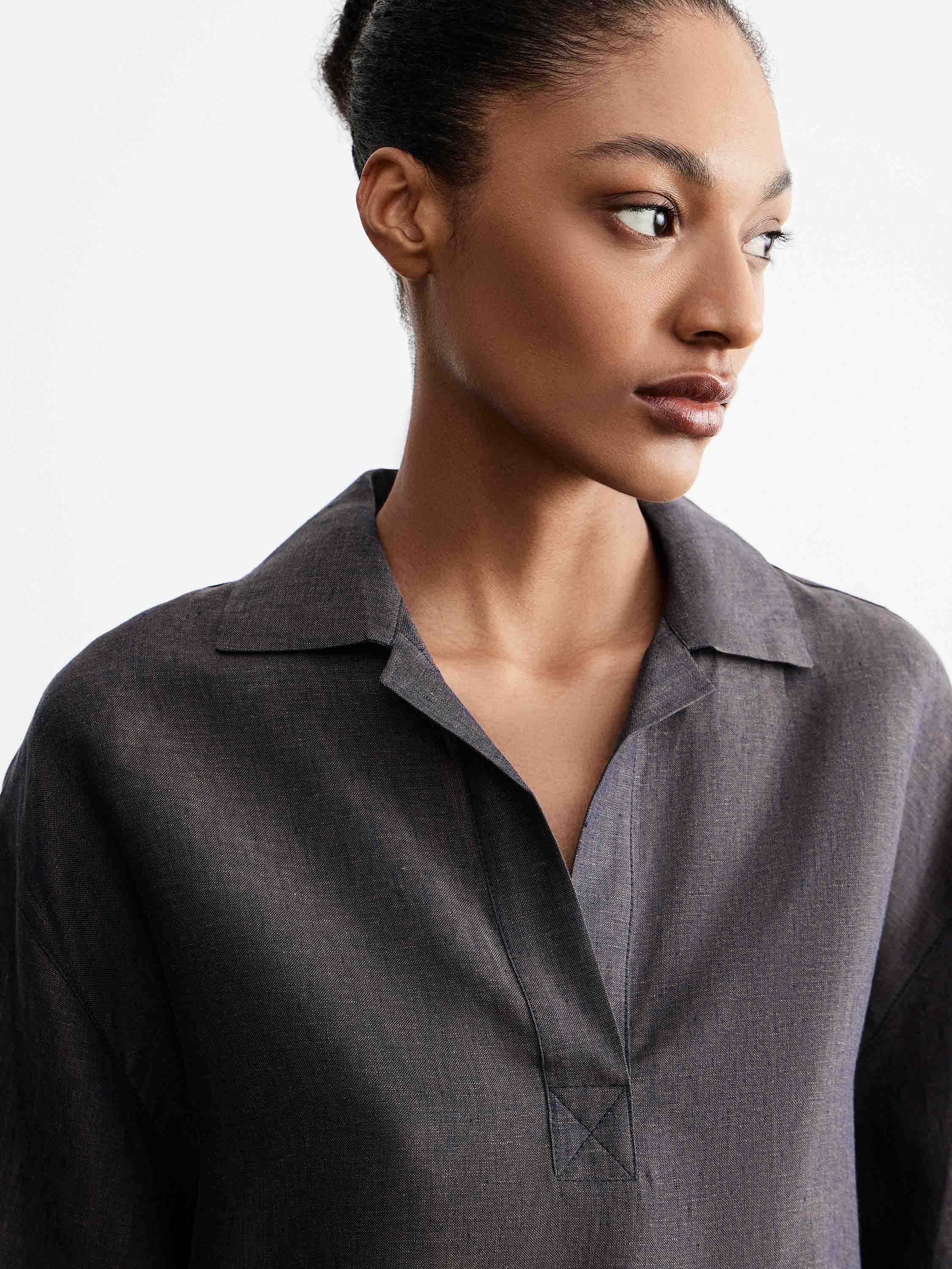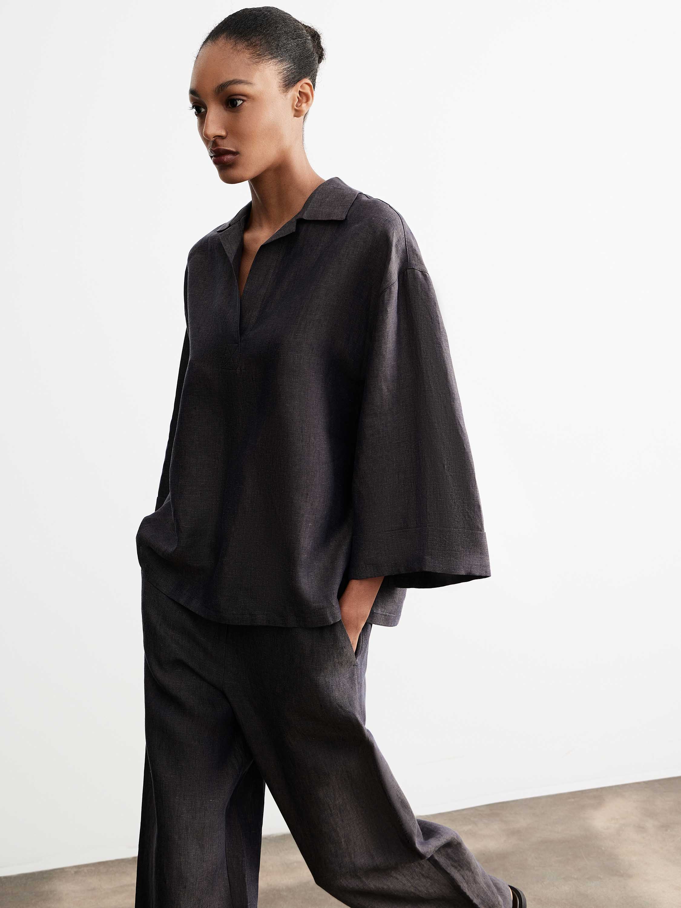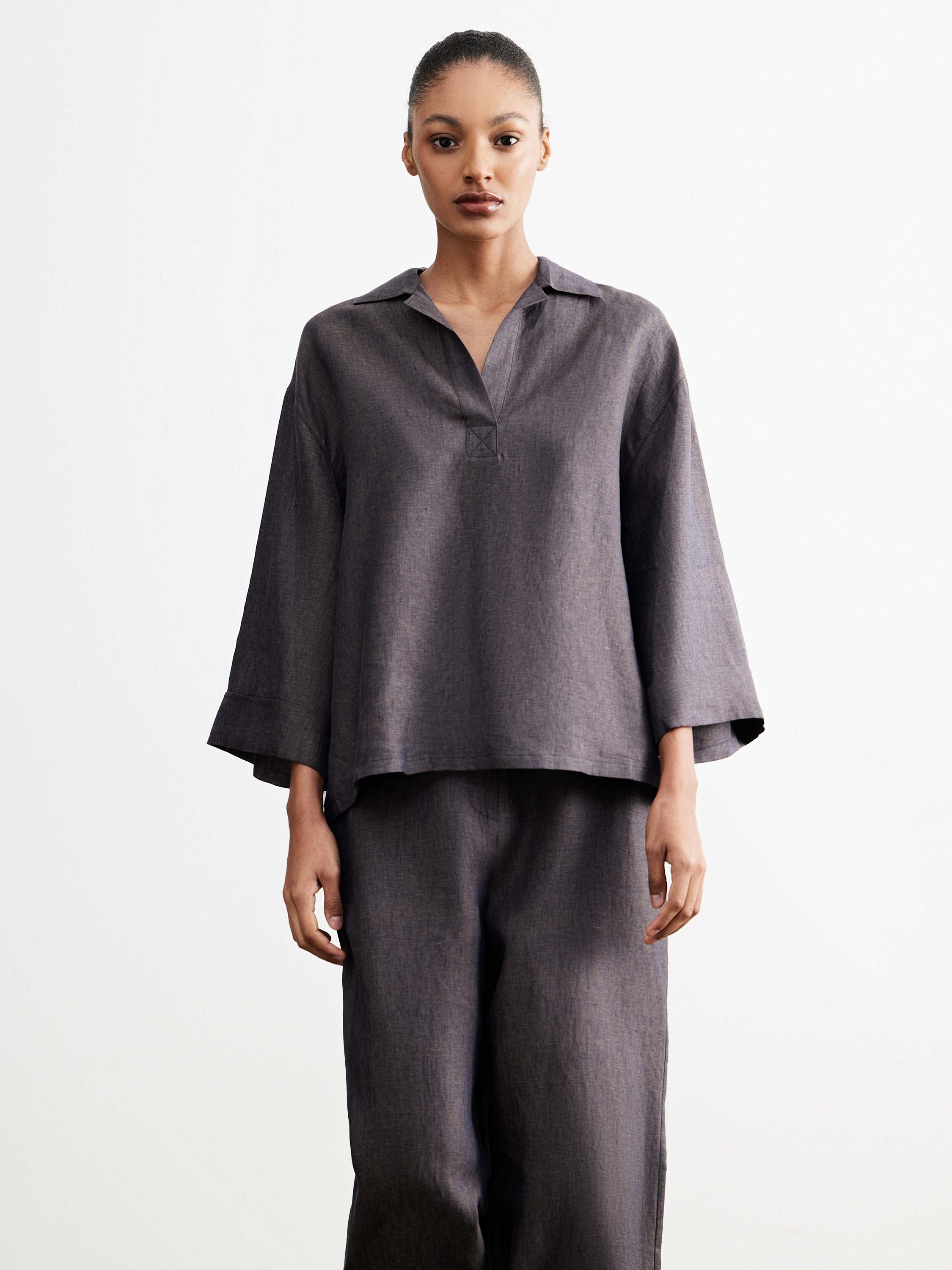 Блуза свободного силуэта с мягкой линией плеча и укороченной длиной, выполненная изо льна с характерной матовой фактурой. Лен обеспечивает воздухопроницаемость, комфорт в тепле и естественную терморегуляцию, благодаря чему изделие подходит для длительного ношения. Модель с открытым V-образным вырезом и отложным воротником формирует аккуратную линию декольте, а широкие рукава длиной до локтя создают сбалансированную пропорцию и свободу движения. Глубокий графитовый оттенок делает блузу универсальной: она сочетается как с брюками из той же ткани, так и с денимом или легкими юбками, формируя разные по настроению комплекты.