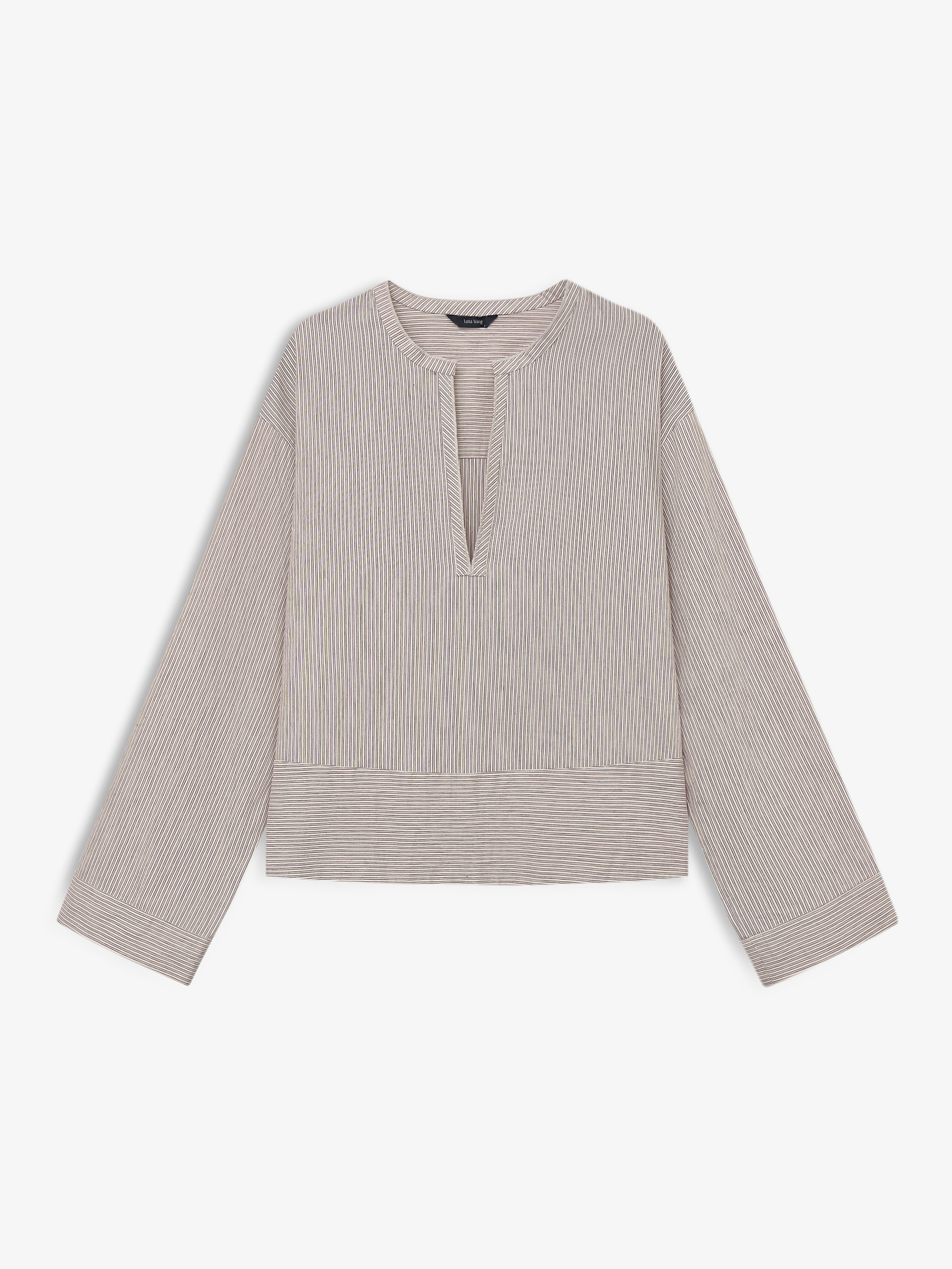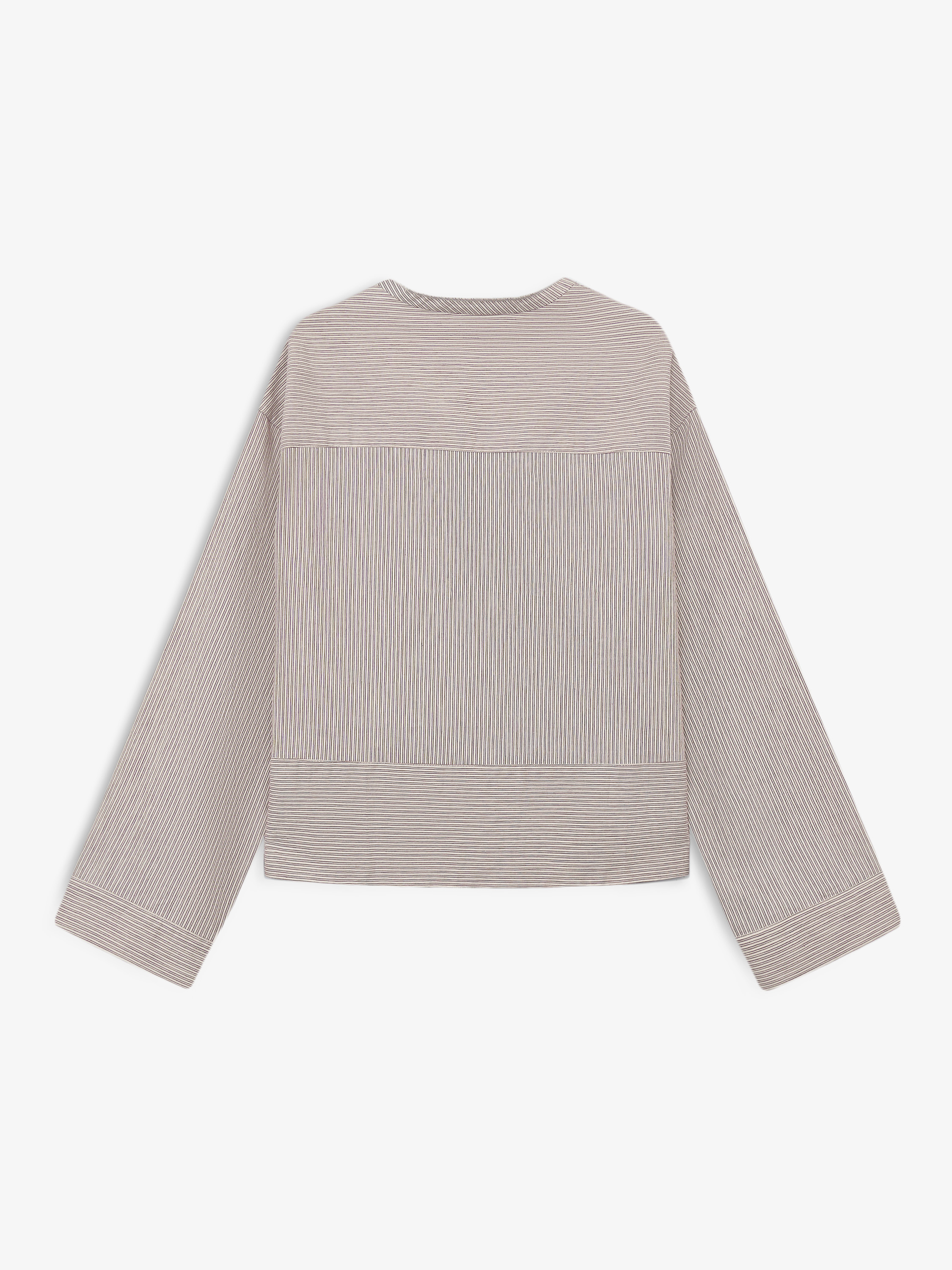 Топ свободного силуэта с мягкой посадкой и слегка спущенной линией плеча. Конструкция лаконичная: округлый вырез с узкой планкой и небольшим разрезом спереди формирует аккуратный акцент в зоне декольте. Рукава длинные, прямые, с расширенной линией низа, за счет чего силуэт выглядит более расслабленным. Нижний край оформлен широкой планкой, которая задает четкую геометрию и удерживает форму. Материал на основе района, с гладкой поверхностью и мягкой пластикой, комфортно прилегает к телу и хорошо драпируется. Светлый оттенок в мелкую полоску подчеркивает фактуру и делает модель универсальной для повседневных сочетаний.