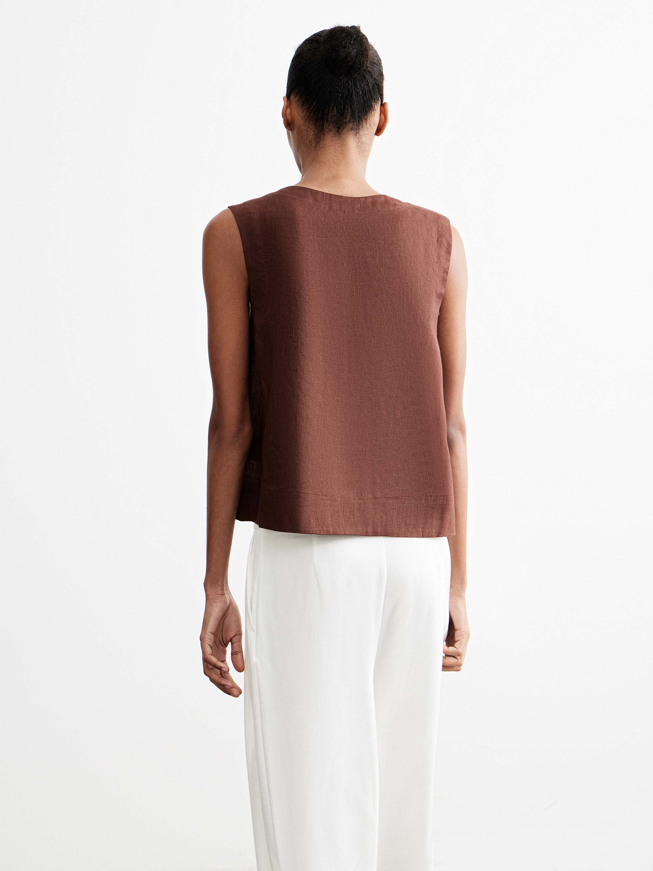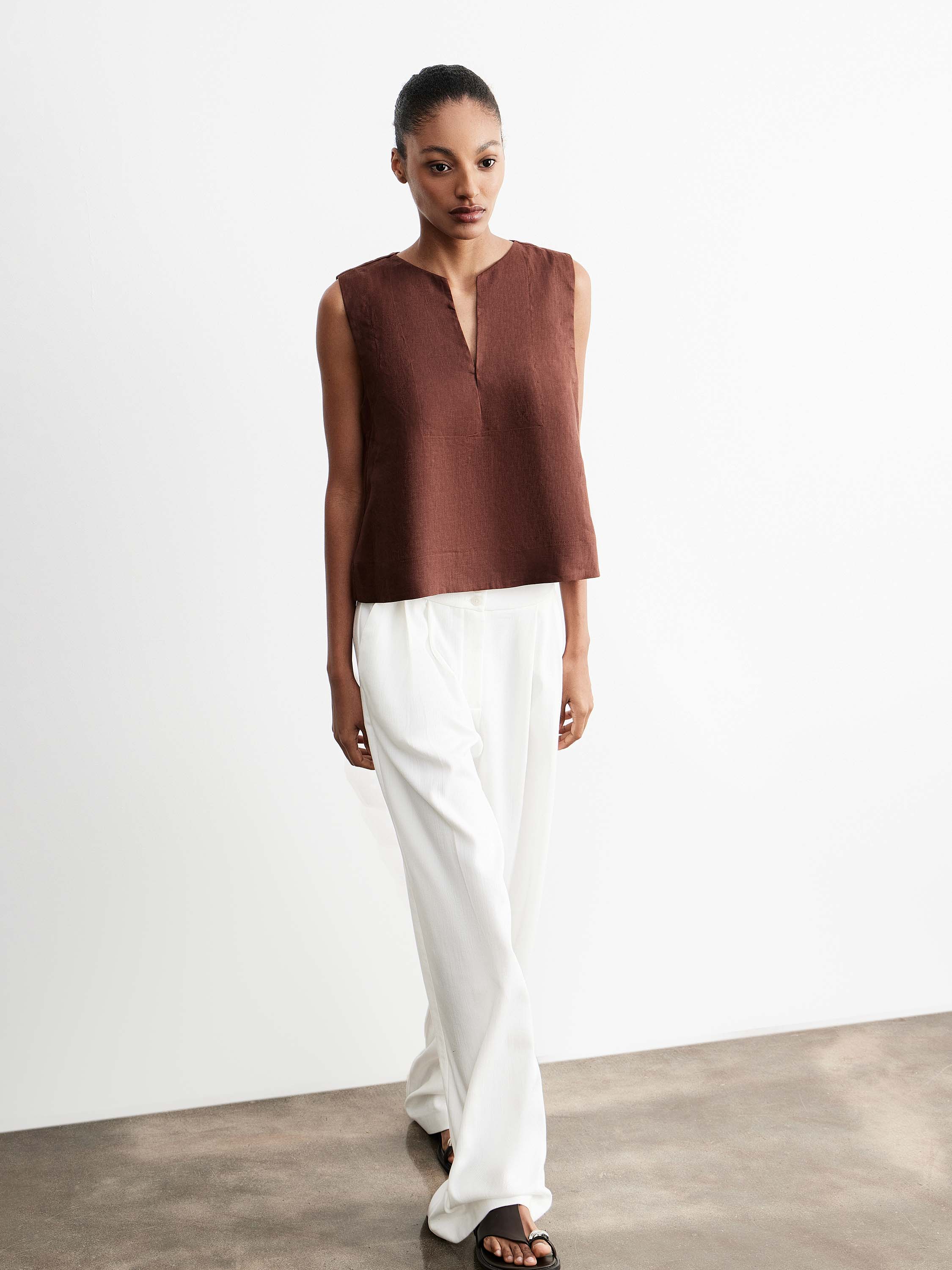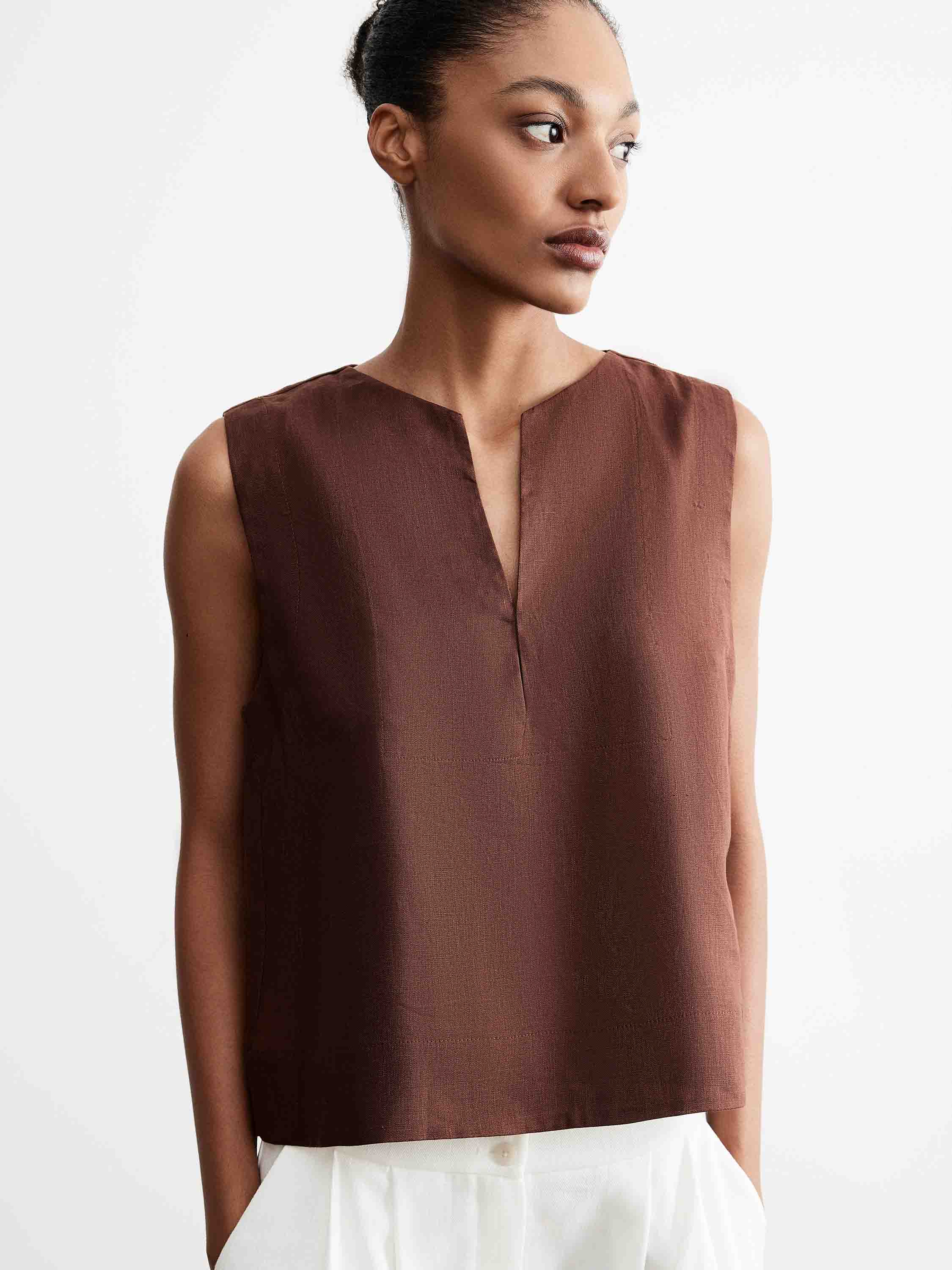 Блуза прямого силуэта с четкой линией плеча и лаконичной длиной, выполненная изо льна с характерной матовой фактурой. Лен обеспечивает воздухопроницаемость, комфорт в тепле и естественную терморегуляцию, благодаря чему изделие удобно в повседневной носке. Модель с аккуратным разрезом по горловине формирует сдержанную линию декольте, а чистая конструкция подчеркивает форму без лишних деталей. Глубокий шоколадный оттенок делает блузу универсальной: она сочетается как со светлыми брюками, так и с базовыми моделями, формируя разные по настроению комплекты.