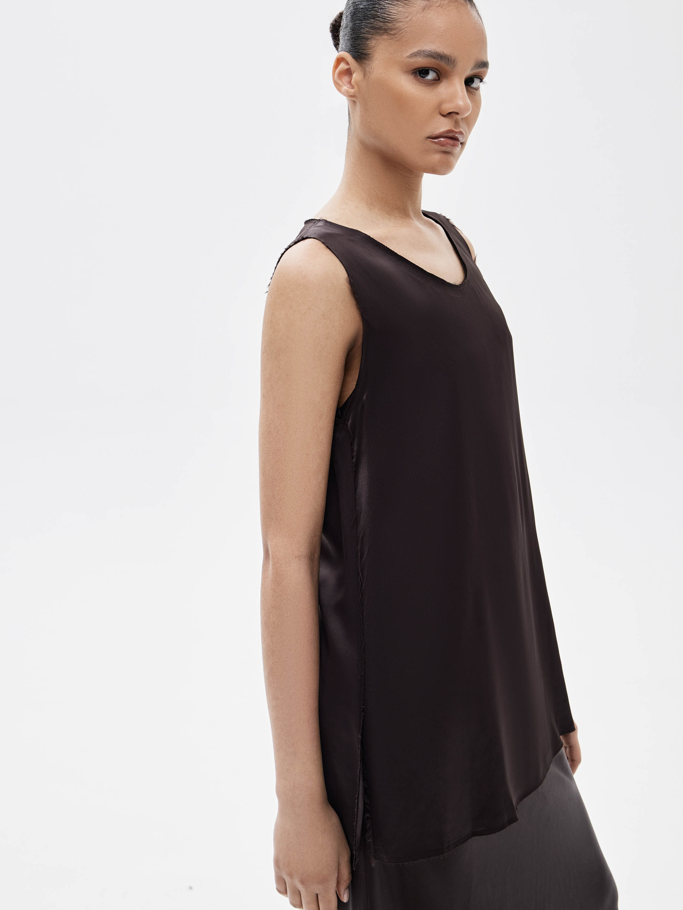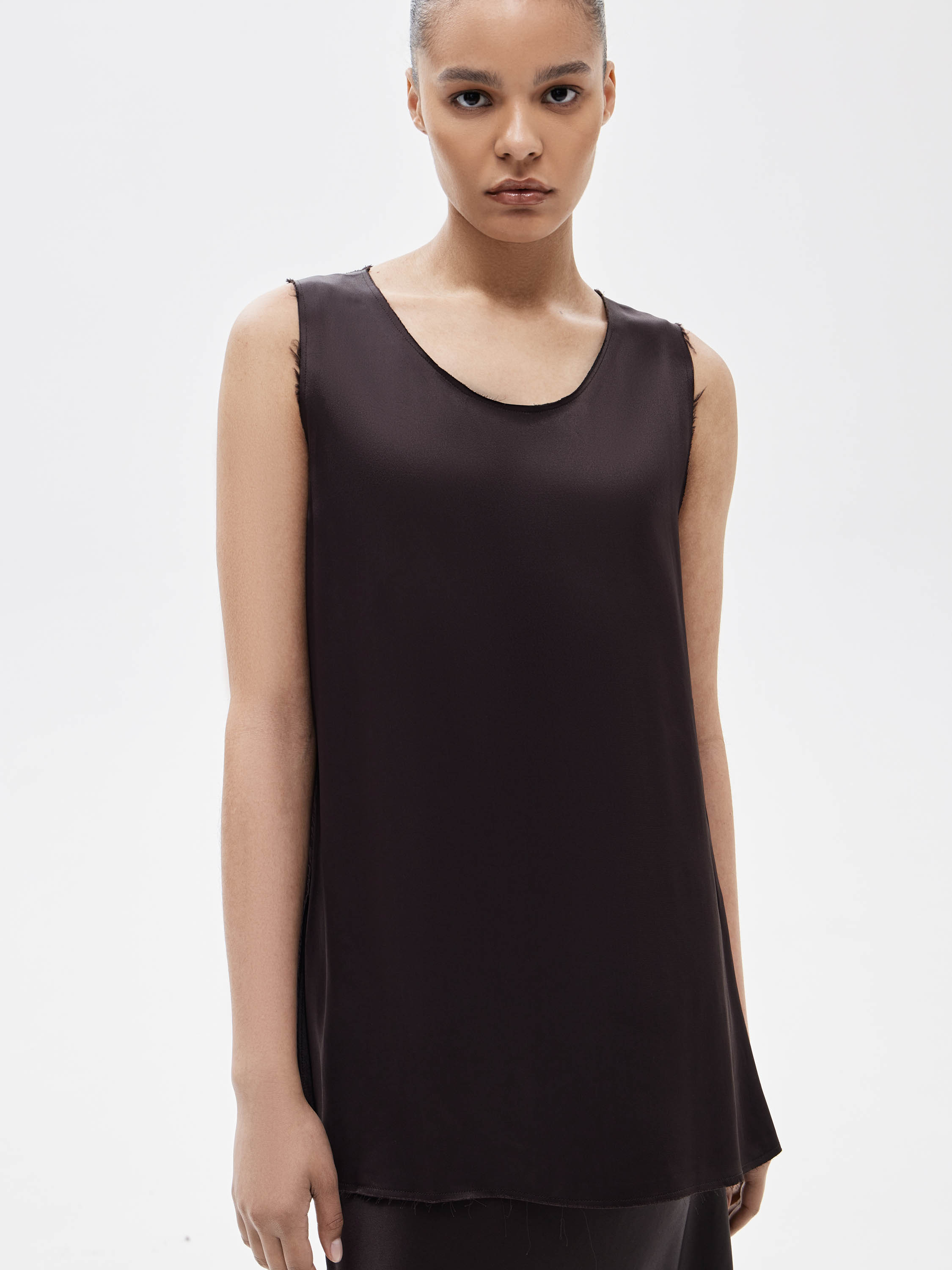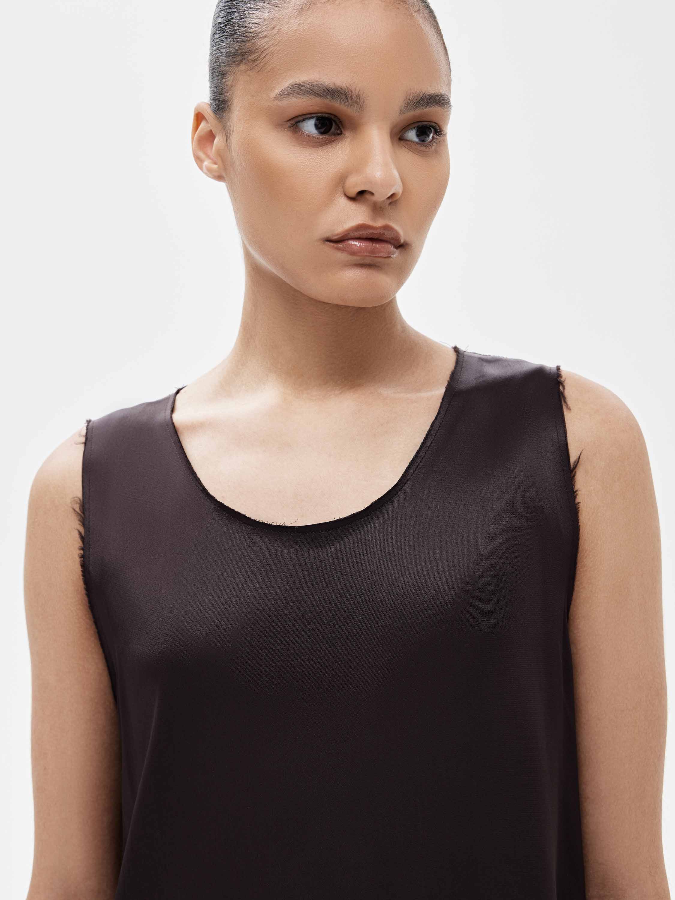 Блузка из 100% района с гладкой, текучей текстурой. Материал пластичный, красиво драпируется и комфортен в носке. Крой прямой, удлиненный, с открытой линией плеч и округлым вырезом. Края изделия и проймы выполнены с необработанной отделкой, что придает модели легкую неформальность и современное звучание. Блузка подходит для носки соло и для многослойных сочетаний с юбками и брюками.