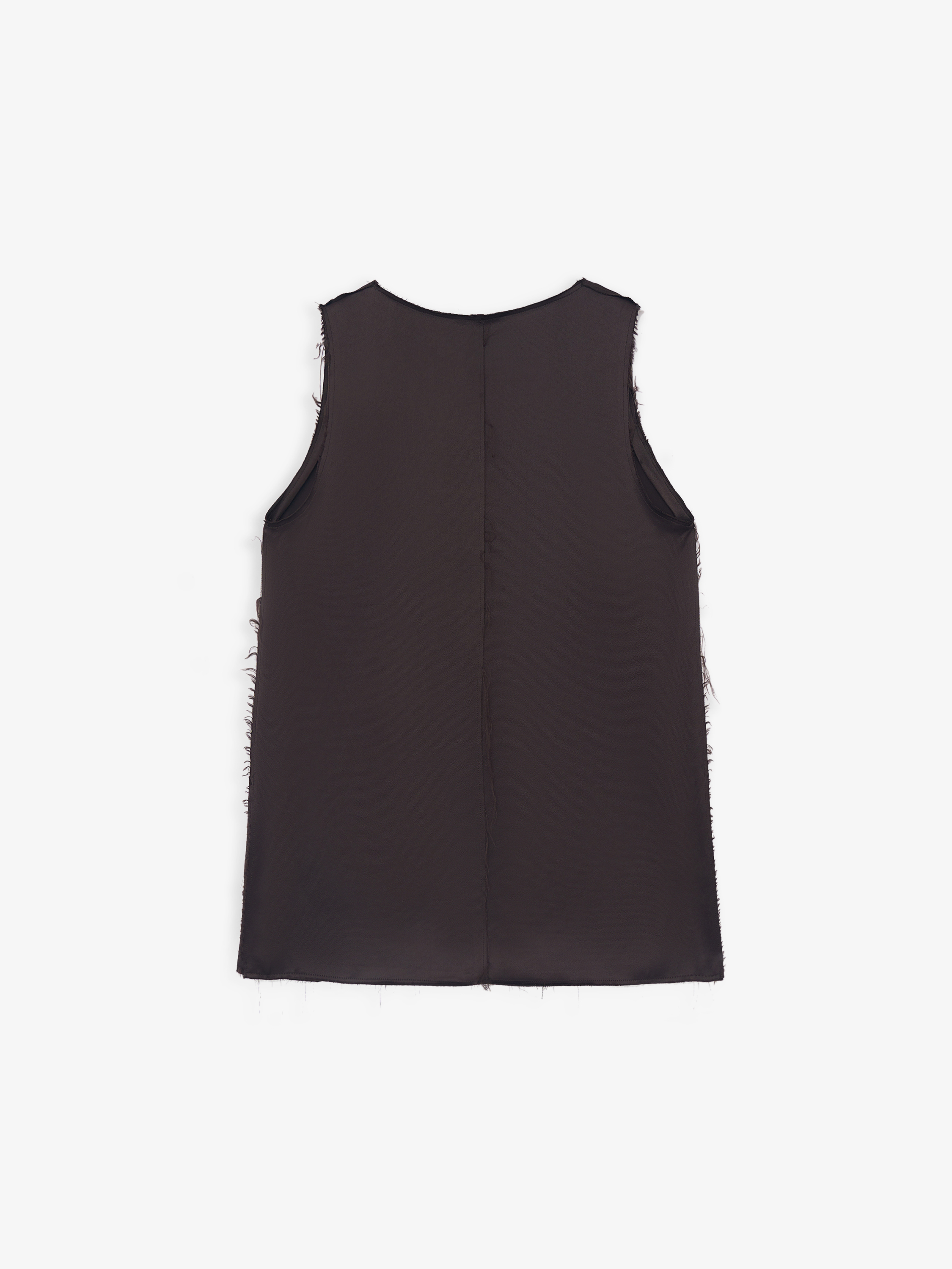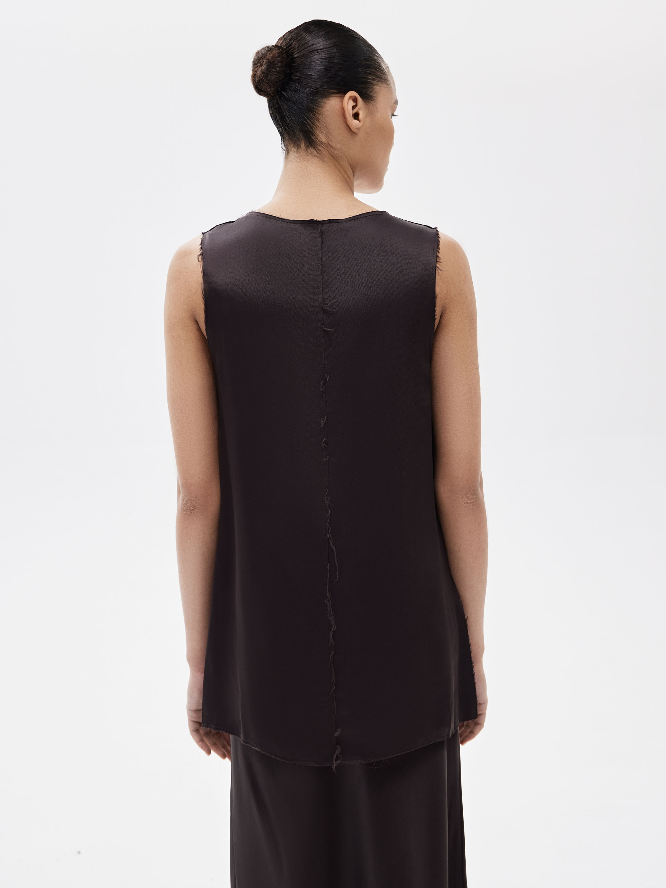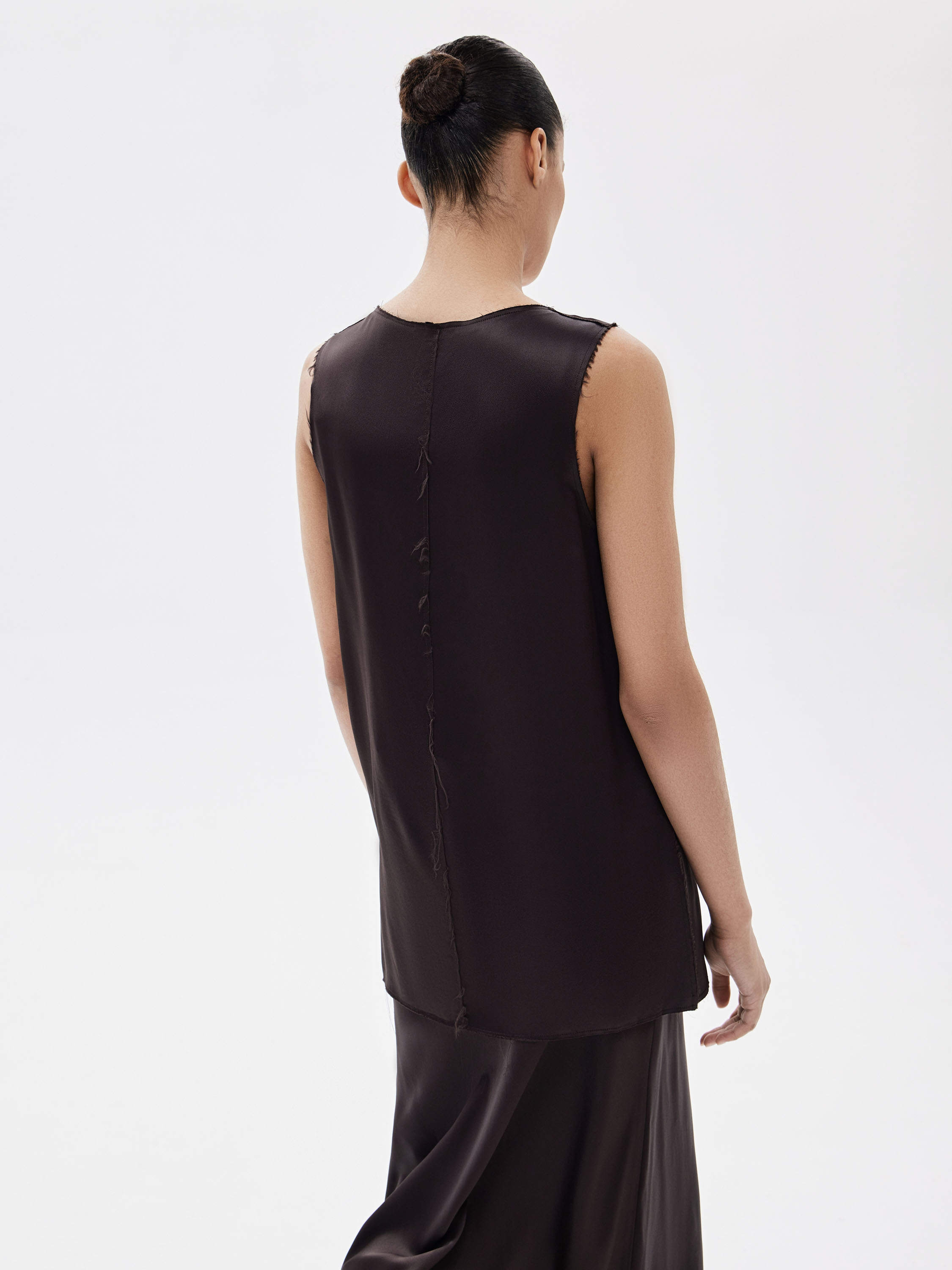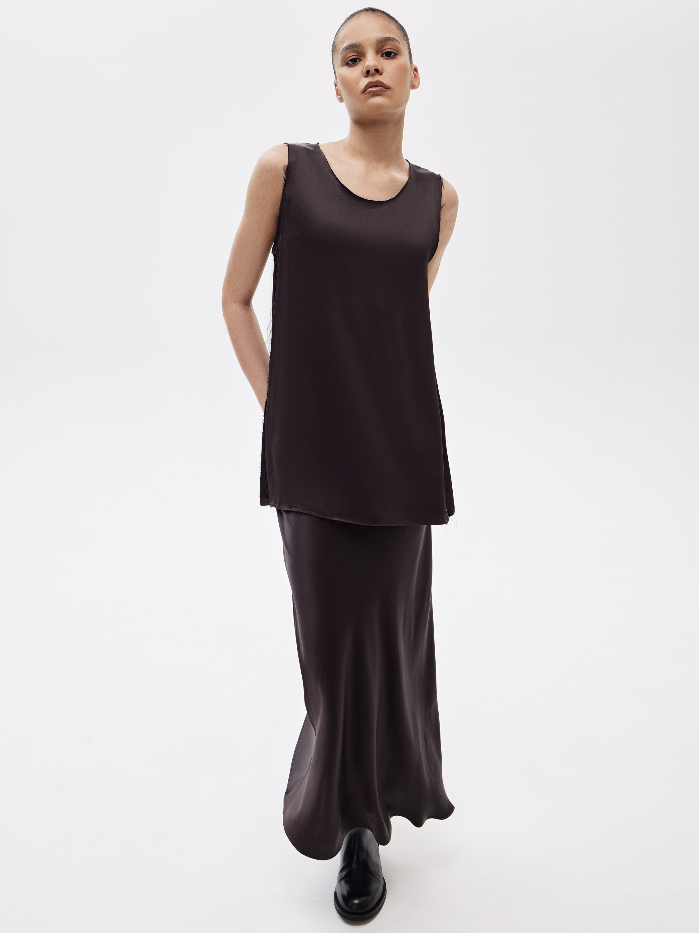 Блузка из 100% района с гладкой, текучей текстурой. Материал пластичный, красиво драпируется и комфортен в носке. Крой прямой, удлиненный, с открытой линией плеч и округлым вырезом. Края изделия и проймы выполнены с необработанной отделкой, что придает модели легкую неформальность и современное звучание. Блузка подходит для носки соло и для многослойных сочетаний с юбками и брюками.